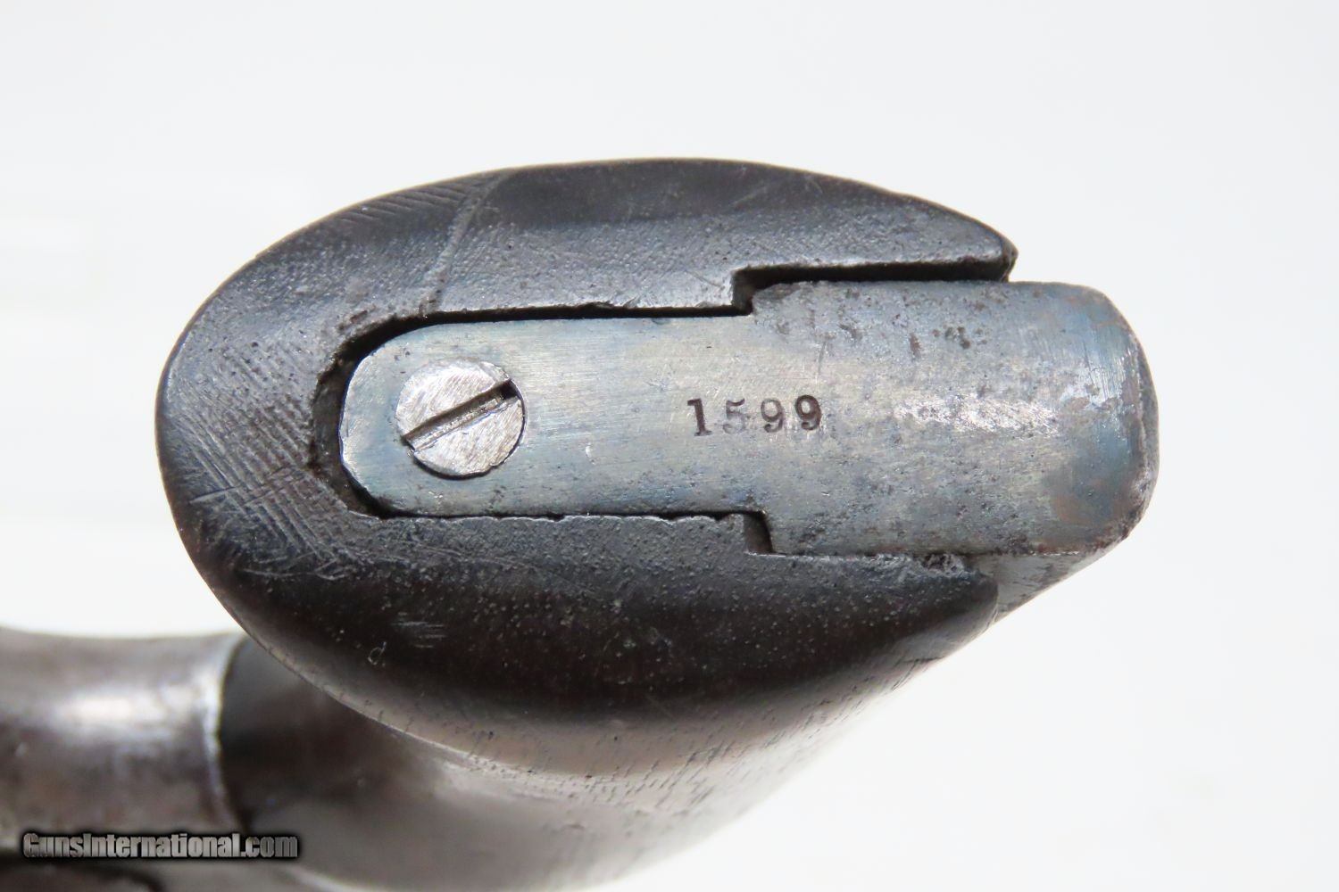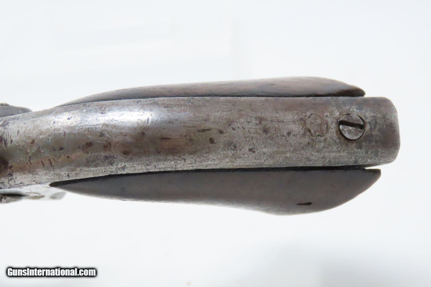 Description: Antique CIVIL WAR COLT M1855 “ROOT” Side-Hammer Percussion POCKET Revolver Start of CIVIL WAR Production Side-hammer Made in 1861 Here we present an antique Colt Model 1855 “Root” Side-hammer Pocket Revolver, made in 1861 in Hartford, Connecticut. This Samuel Colt design was named for his factory superintendent Elisha K. Root and is a telling example of Colt’s desire to innovate, which was probably the single biggest factor in his success. Though the Colt 1849 Pocket had been introduced only 6 years prior, the “Colonel” attempted to make an improved pocket revolver. The Root features Colt’s debut of the “creeping” style of loading lever which allowed for better mechanical advantage when loading the gun, Colt’s first solid frame, a hammer mounted on the right side for access to the cylinder axis pin, and a cylinder axis pin which was the point at which the hand turned the cylinder (versus on the cylinder itself). Many good ideas were tested in this design, and some would prove worthy to be used in the future. The small parts used in the Root Revolver’s mechanism proved quite fragile, however upscaling them into the 1855 series of Revolving Rifles and Shotguns seemed to help. Colt is even known to have experimented with the Root design on a Dragoon pistol, a precursor to the 1860 Army. Overall, about 44,000 Root Revolvers were made from 1855-1870, much fewer than the 1849 Pocket with 340,000 produced. Though not a primary military arm during the American Civil War, handguns were commonly privately purchased by soldiers for use on the battlefield. Whether legend or fact, it is interesting to note something commonly read about pocket revolvers of the day: that while they could be used for self-defense against the enemy, many soldiers kept them on their person to defend themselves against an unwanted amputation in the primitive field hospitals that were notorious, even in their day. This example has been around the block. Good bore. The grip sits firmly but is missing two chips near the backstrap. The action (hammer/trigger) functions (the cylinder does not index and free wheels). Own the original! This is a legitimate antique and not a reproduction. Barrel is 3-1/2 inches. Caliber: .31 Percussion Overall condition as seen in photos. Very Fast. Very Safe. FREE SHIPPING WORLDWIDE. Delivered directly to your door by express mail! Guaranteed AUTHENTIC & Includes CERTIFICATE OF AUTHENTICITY. ancestryguns $1485 #215242 SOLD Antique: Yes |