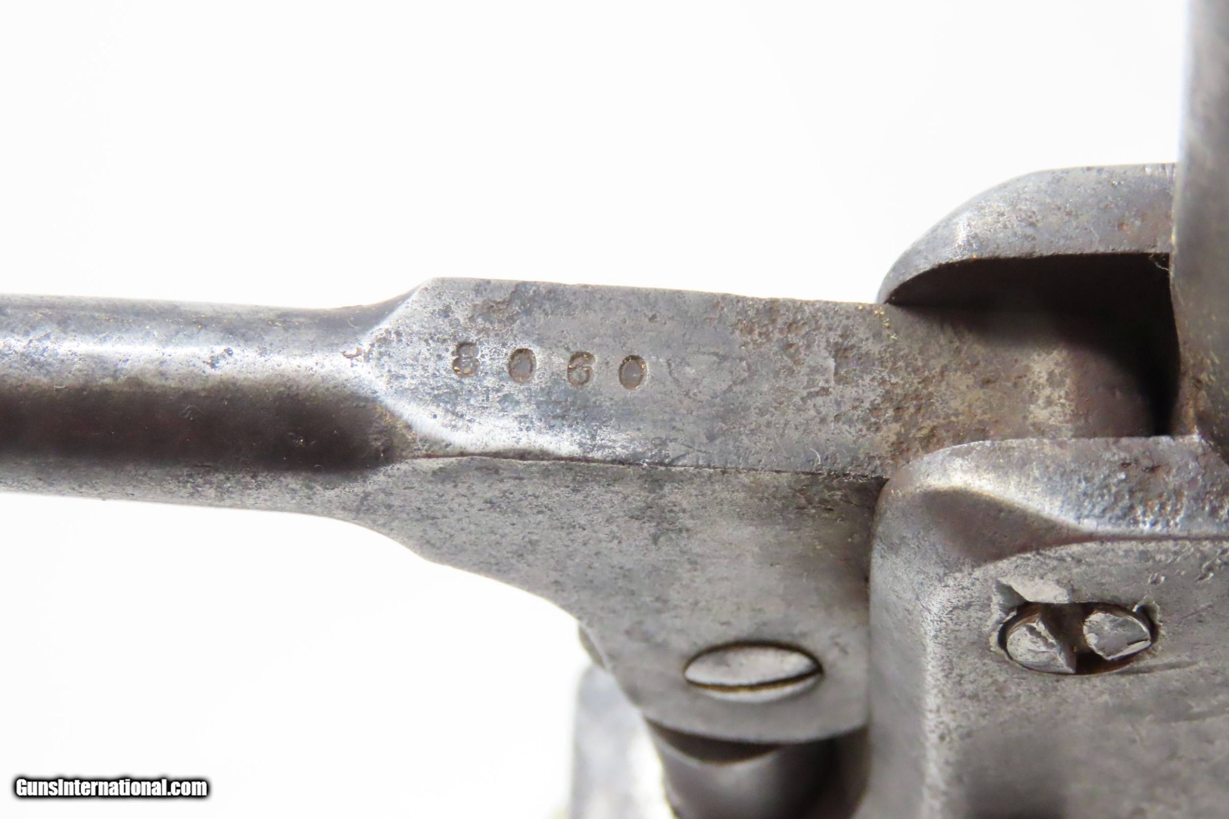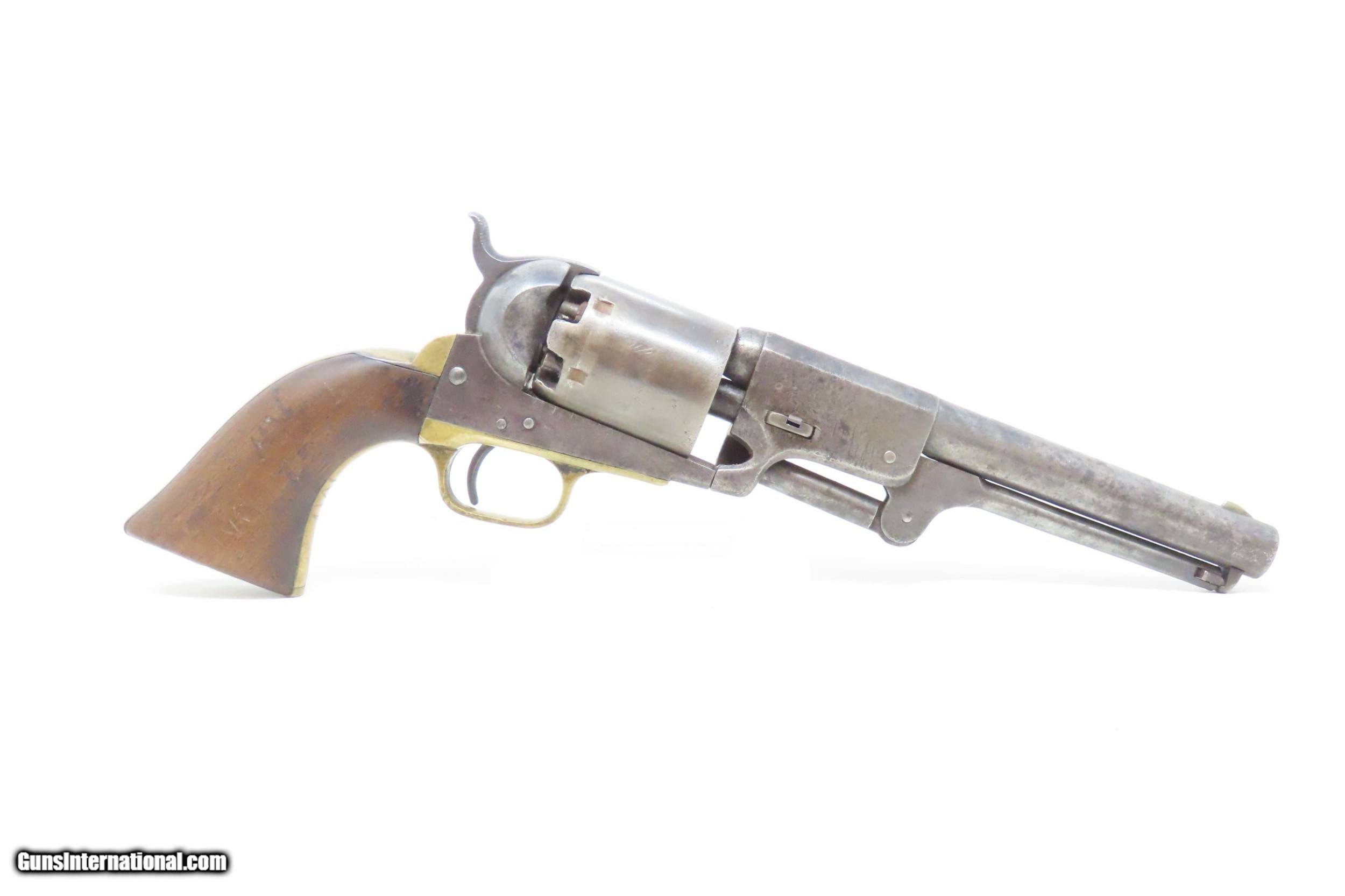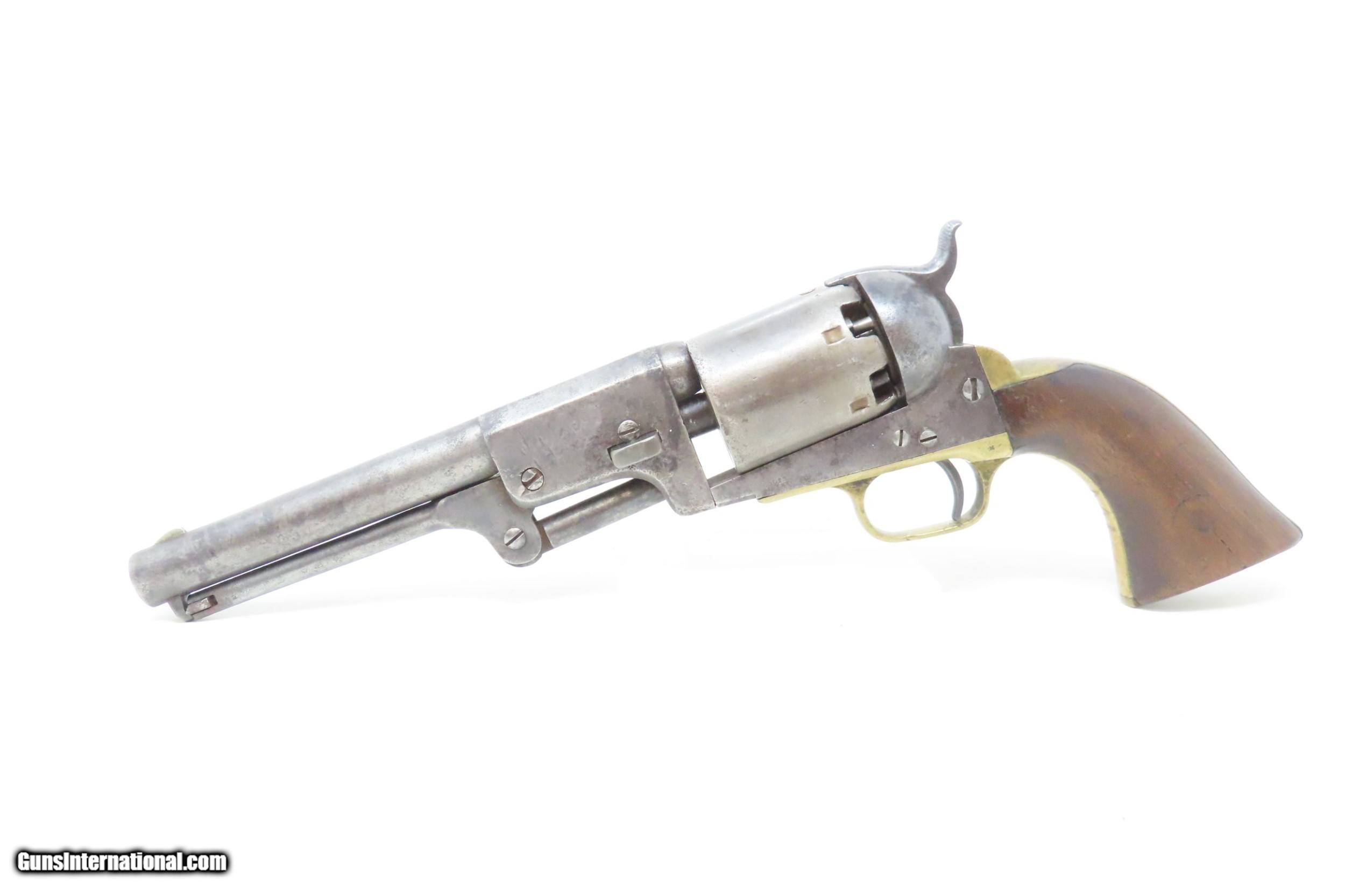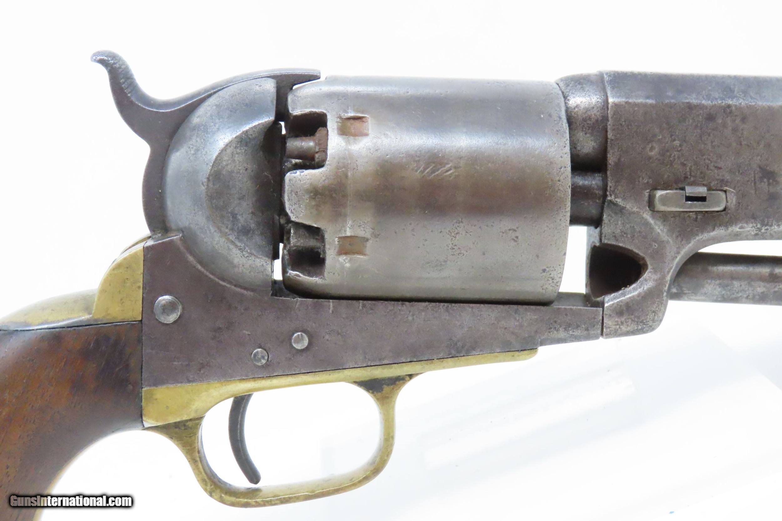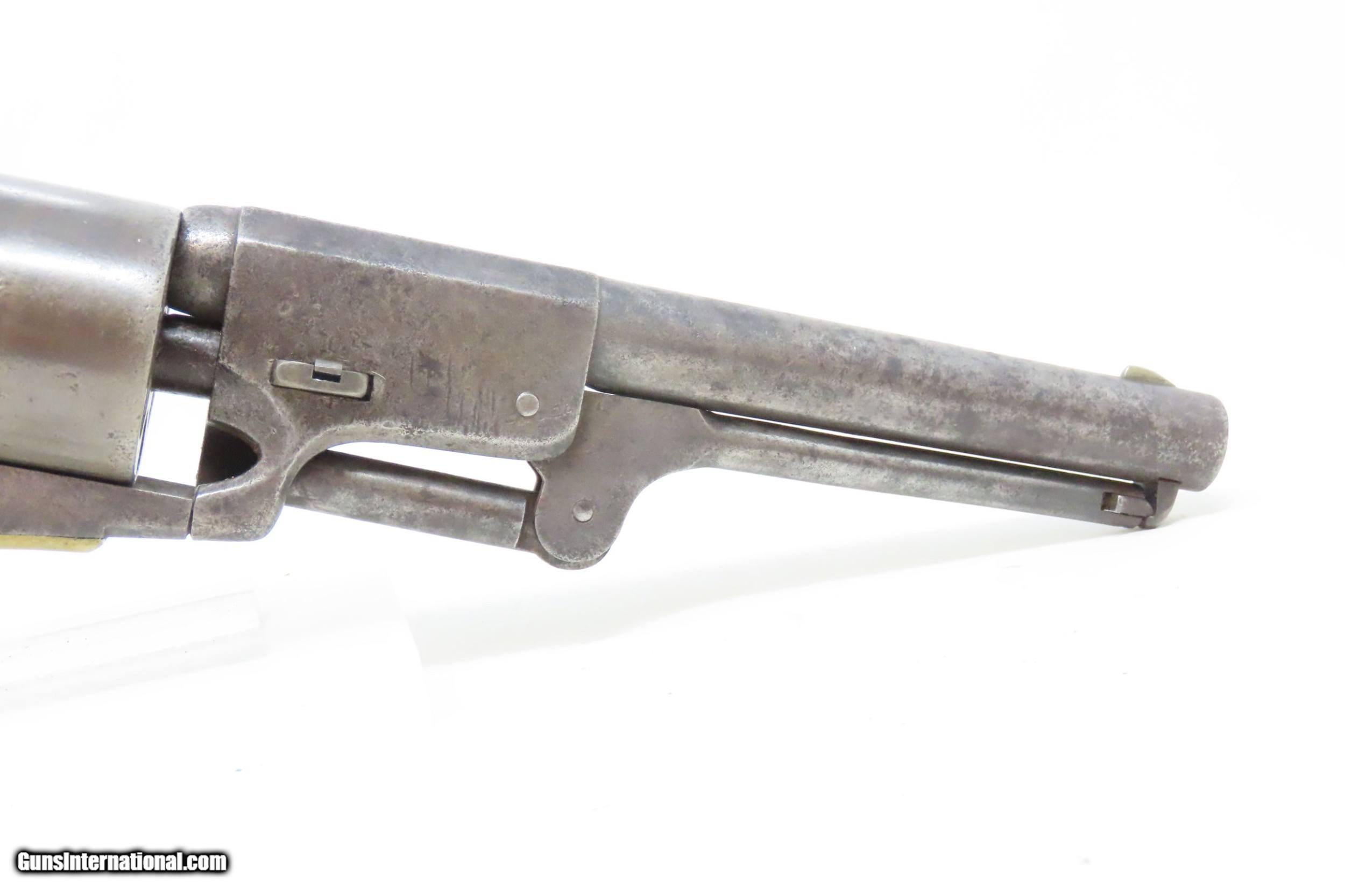 Description: Antique CIVIL WAR Era 3rd Model U.S. COLT DRAGOON .44 Cal. PERC. Revolver One of 10,500; 1855 mfg. with CASE and ACCESSORIES Here we present an antique U.S. Colt 3rd Model Dragoon Revolver, manufactured in 1859 in Hartford, Connecticut. Only 10,500 of this model were produced. The Third Model was first offered in 1851 and continued production through 1861, for a total of 10,500. The revolver is in .44 caliber, weighs 4 pounds and 2 ounces and has a part round and part octagonal barrel. The main difference between a Second and Third Model Dragoon is the change from a square-back trigger-guard to a rounded version. The barrel and cylinder were blued with casehardened frame, hammer and loading lever. The revolver was furnished with one-piece walnut grips which were varnished for the commercial market and oil-stained for the military contracts. Colt’s Dragoons experienced some of the harshest conditions the mid-19th century had to offer, and it is amazing that any survived, in any condition. This revolver was designed for use by horse-mounted rifleman, and it is so much pistol that you will want a horse to carry it for you because of its significant weight. This one would have seen use during the American Civil War. This is a great opportunity to add one of Samuel Colt’s most recognized inventions to your collection, a Civil War era Colt Dragoon! The overall condition is good. The action functions. The cylinder intermittently locks up. The bore is in good shape for its age. You can see in the bottom of the grip there was once a hole on either side of the frame that would have been equipped with a lanyard. The included accoutrements and case are in nice shape. Own the original! This is a legitimate antique and not a reproduction. Barrel is 7-1/2 inches. Caliber: .44 Percussion Overall condition as seen in photos. Very Fast. Very Safe. FREE SHIPPING WORLDWIDE. Delivered directly to your door by express mail! Guaranteed AUTHENTIC & Includes CERTIFICATE OF AUTHENTICITY. ancestryguns $7565 #217401 SOLD Antique: Yes |