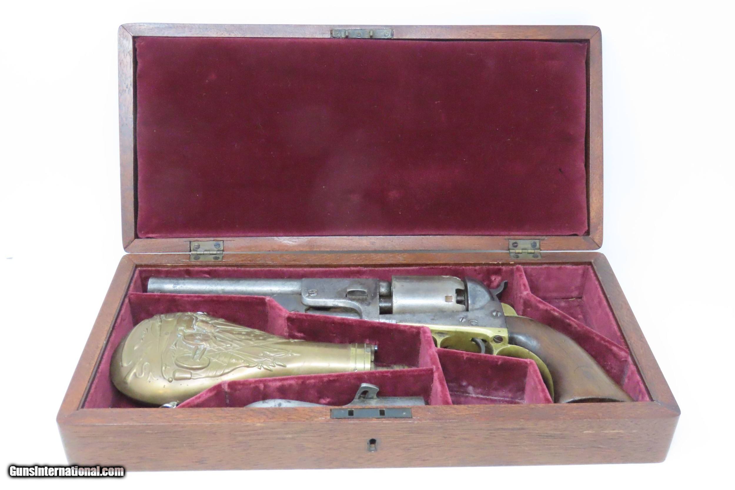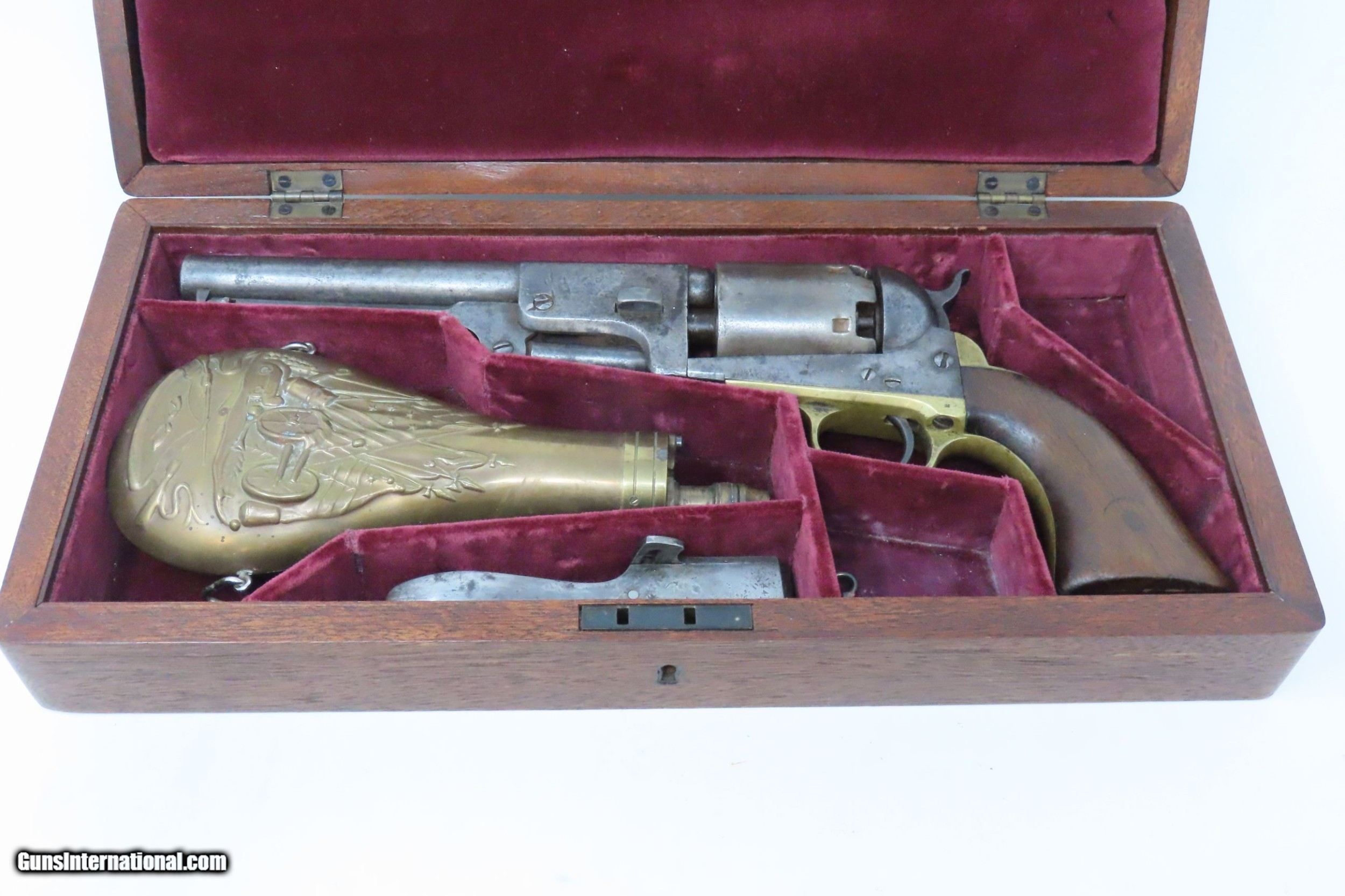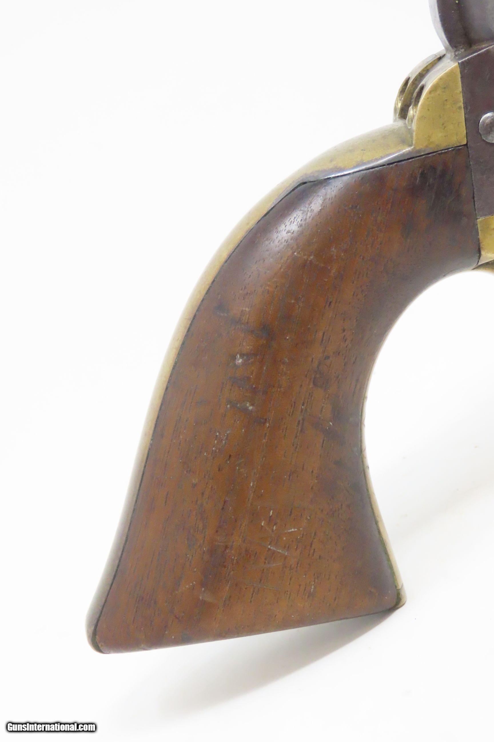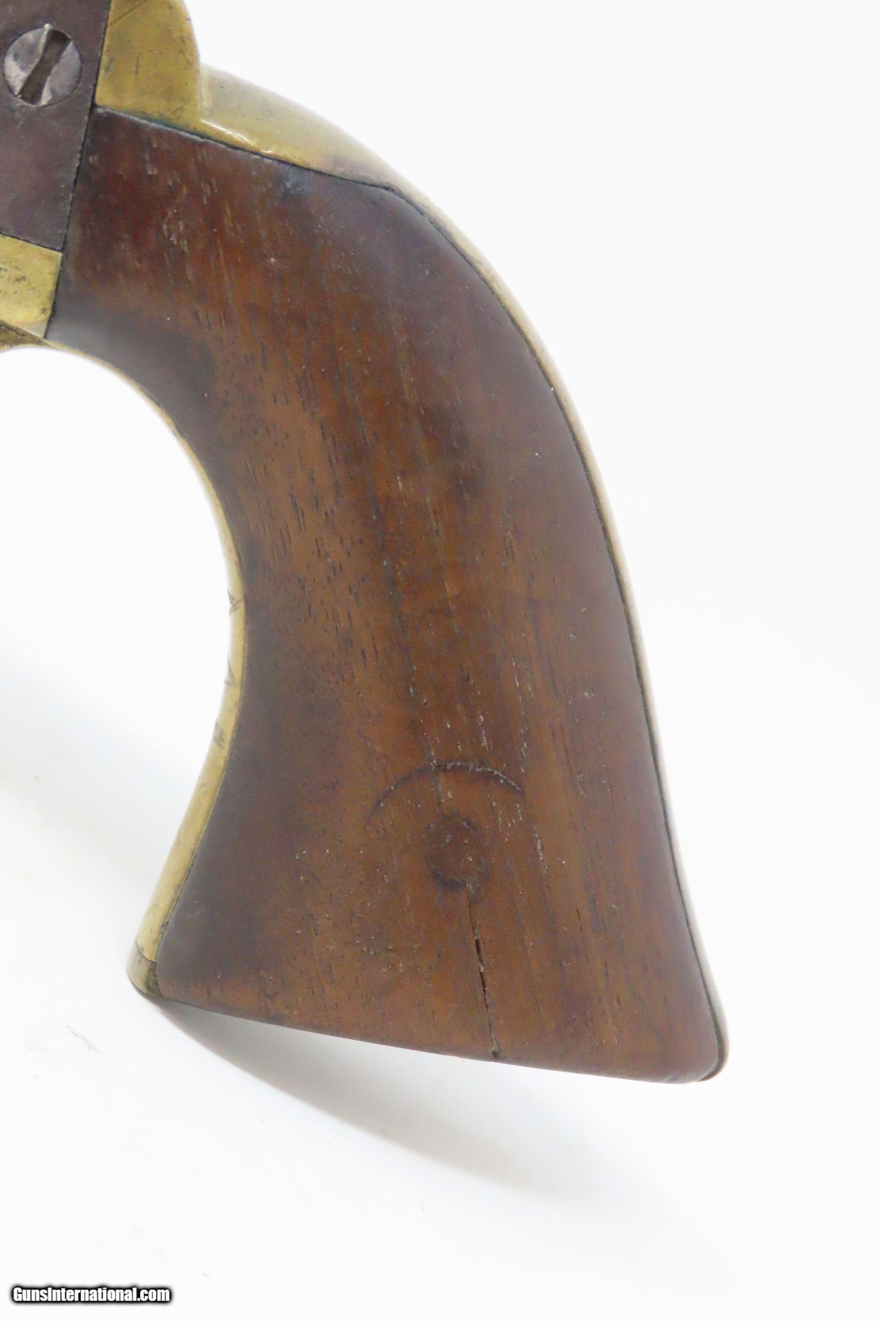 Description: Antique CIVIL WAR Era 3rd Model U.S. COLT DRAGOON .44 Cal. PERC. Revolver One of 10,500; 1855 mfg. with CASE and ACCESSORIES Here we present an antique U.S. Colt 3rd Model Dragoon Revolver, manufactured in 1859 in Hartford, Connecticut. Only 10,500 of this model were produced. The Third Model was first offered in 1851 and continued production through 1861, for a total of 10,500. The revolver is in .44 caliber, weighs 4 pounds and 2 ounces and has a part round and part octagonal barrel. The main difference between a Second and Third Model Dragoon is the change from a square-back trigger-guard to a rounded version. The barrel and cylinder were blued with casehardened frame, hammer and loading lever. The revolver was furnished with one-piece walnut grips which were varnished for the commercial market and oil-stained for the military contracts. Colt’s Dragoons experienced some of the harshest conditions the mid-19th century had to offer, and it is amazing that any survived, in any condition. This revolver was designed for use by horse-mounted rifleman, and it is so much pistol that you will want a horse to carry it for you because of its significant weight. This one would have seen use during the American Civil War. This is a great opportunity to add one of Samuel Colt’s most recognized inventions to your collection, a Civil War era Colt Dragoon! The overall condition is good. The action functions. The cylinder intermittently locks up. The bore is in good shape for its age. You can see in the bottom of the grip there was once a hole on either side of the frame that would have been equipped with a lanyard. The included accoutrements and case are in nice shape. Own the original! This is a legitimate antique and not a reproduction. Barrel is 7-1/2 inches. Caliber: .44 Percussion Overall condition as seen in photos. Very Fast. Very Safe. FREE SHIPPING WORLDWIDE. Delivered directly to your door by express mail! Guaranteed AUTHENTIC & Includes CERTIFICATE OF AUTHENTICITY. ancestryguns $7565 #217401 SOLD Antique: Yes |