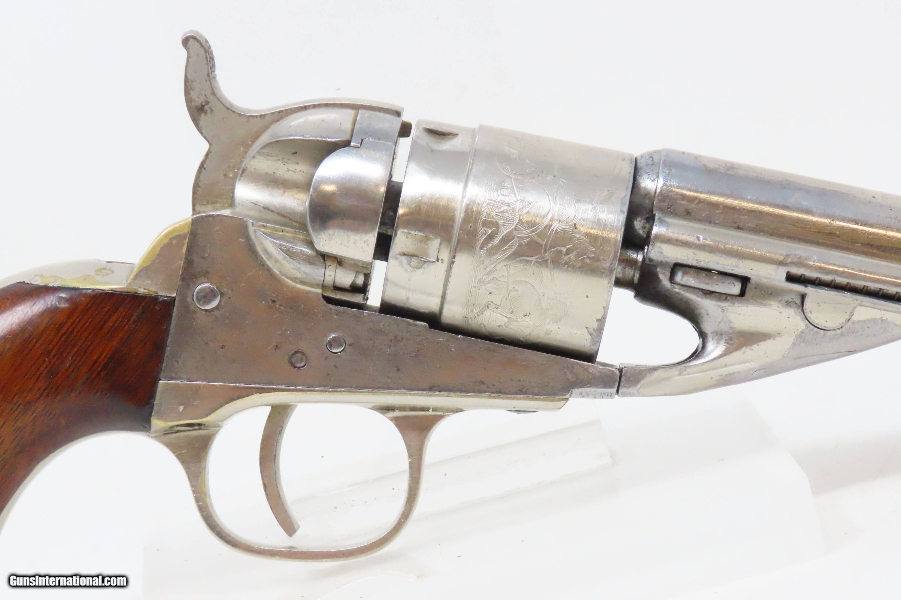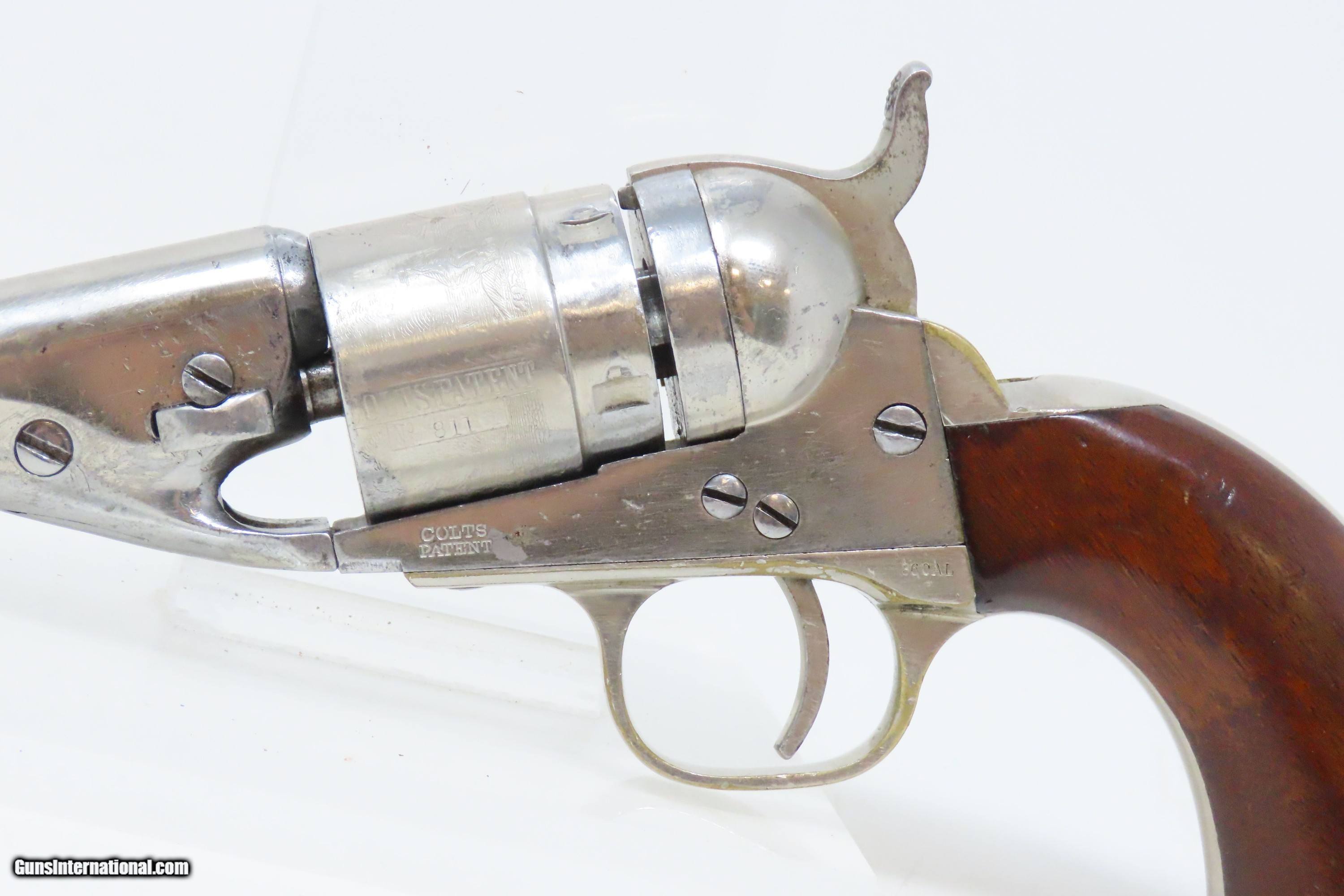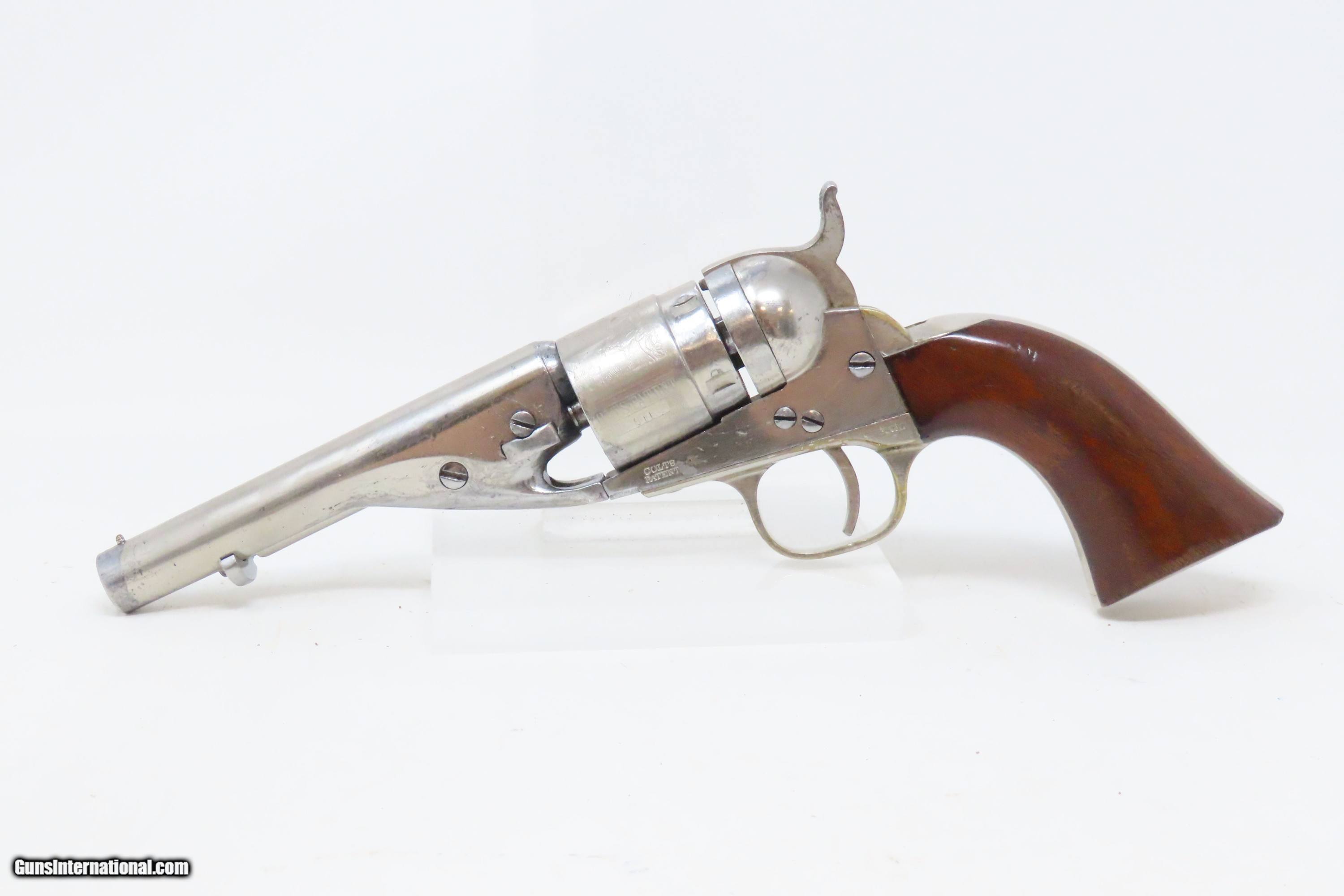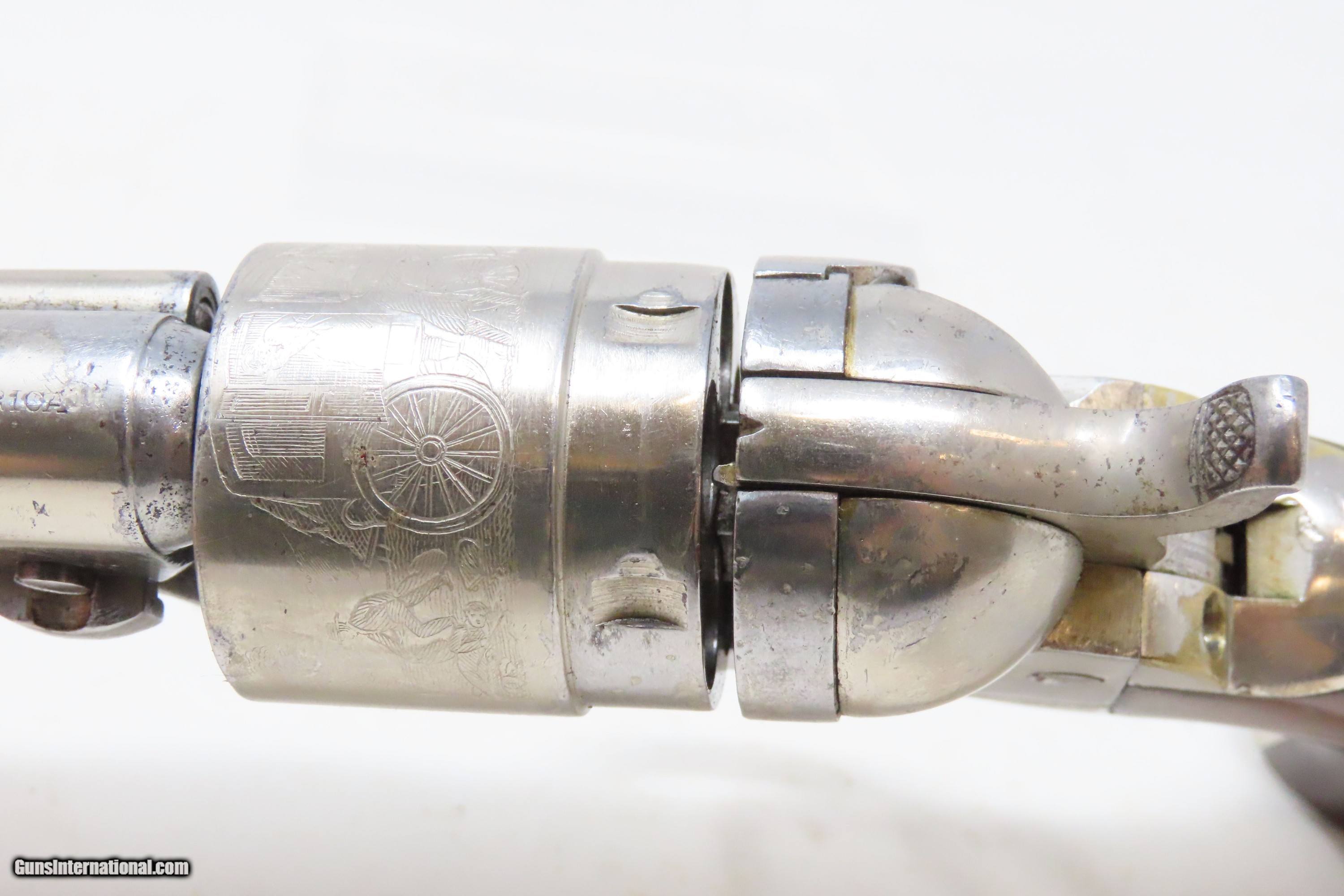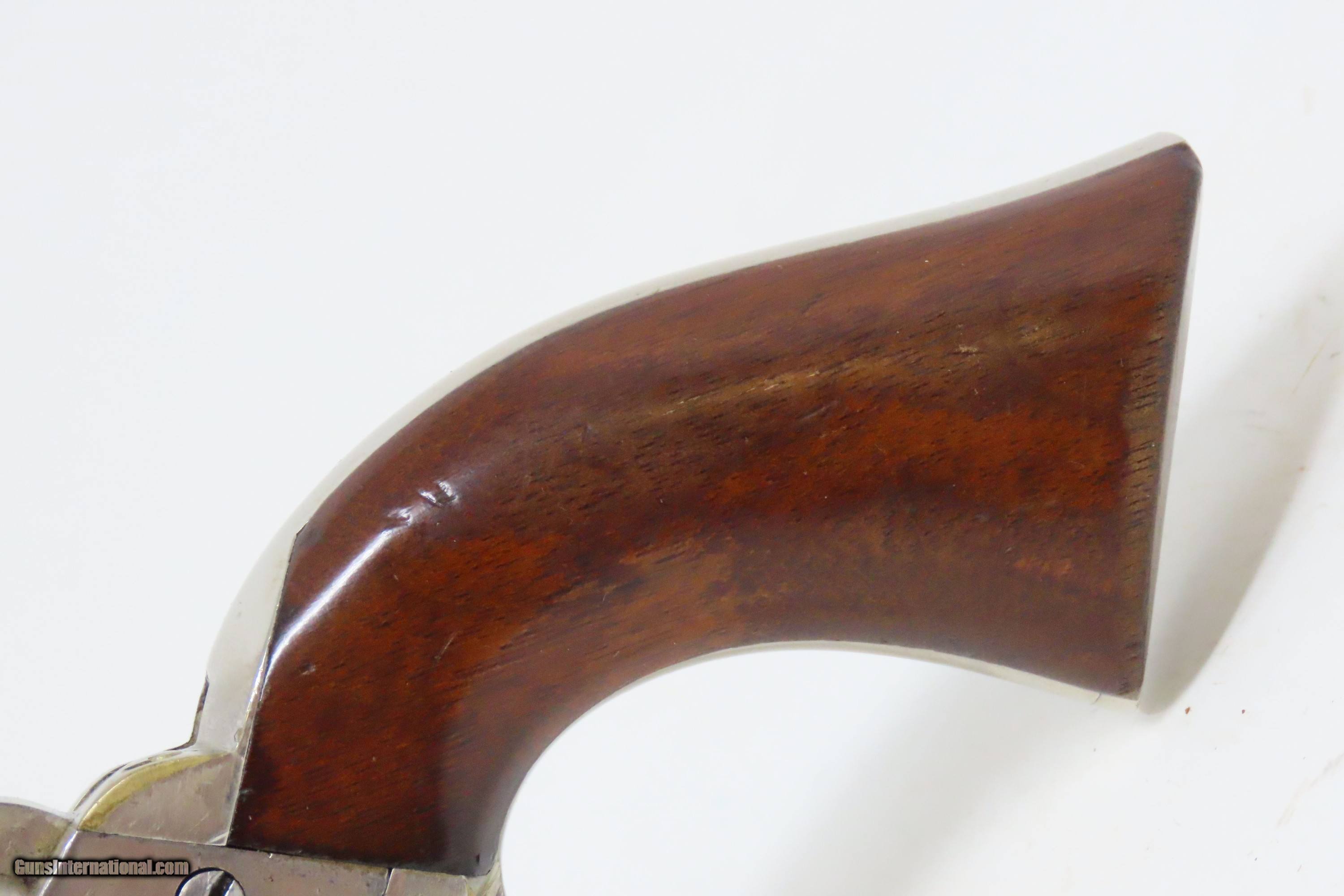 Description: Antique CIVIL WAR Era COLT Pocket NAVY .38 RF CONVERSION Revolver HOLSTER VERY NICE Originally Made in 1861 ROUND BARREL Here we present an antique Colt Model 1862 Pocket Navy Conversion Revolver that originally started out life as a .36 percussion, made in 1861 in Hartford, Connecticut, and converted to .38 Rimfire circa 1873-1880. These had a production run between 1861 and 1873 with reportedly 10,000 of these revolvers converted during those years and sold into the 1880s. The success of the original Colt Model 1851 Navy provided the foundation for the Model 1862 Pocket Navy percussion revolver. Unlike the larger Model 1851, the Model 1862 featured a five shot cylinder chambered in a .36 cap and ball. There were only 19,000 of the M1862 Pocket Navy of this type produced by Colt. A solid gun by Colt standards, its low availability has made it a rare item today. Sales were helped by use in the Civil War, as both sides utilized this revolver in the conflict. The Pocket Navy shared serial numbering with the Model 1862 Police revolver, leading the latter to contain high serial numbers despite their actual production numbers. One of the most aesthetically pleasing aspects of this revolver is its cylinder scene. Cylinder scenes during this period were common, especially for Colt, not only for their visual appeal, but because it made a revolver more difficult to forge. The scene on the 1862 Pocket Navy is that of a stagecoach robbery. The focal point is the stagecoach drawn by four horses. A woman in a dress is seen framed in the doorway of the side of the coach. The driver is standing alongside wielding his pistol against multiple assailants as the horses rear and struggle against their harnesses. Several of the bandits lay dying on the ground, one tries to control the horses, two are running away and one is in the process of falling dead after being shot. Not a bad way to show interested buyers what a pistol like this would be good for. The overall condition is near fine. Finished in nickel. Very nice stagecoach robbery cylinder scene. The action is excellent. The bore is bright with sharp rifling. The grip is solid. The Bianchi holster is in very nice condition. Own the original! This is a legitimate antique and not a reproduction. Barrel is 4-1/2 inches. Caliber: .38 Rimfire Overall condition as seen in photos. Very Fast. Very Safe. FREE SHIPPING WORLDWIDE. Delivered directly to your door by express mail! Guaranteed AUTHENTIC & Includes CERTIFICATE OF AUTHENTICITY. ancestryguns $1800 #233152 SOLD Antique: Yes |