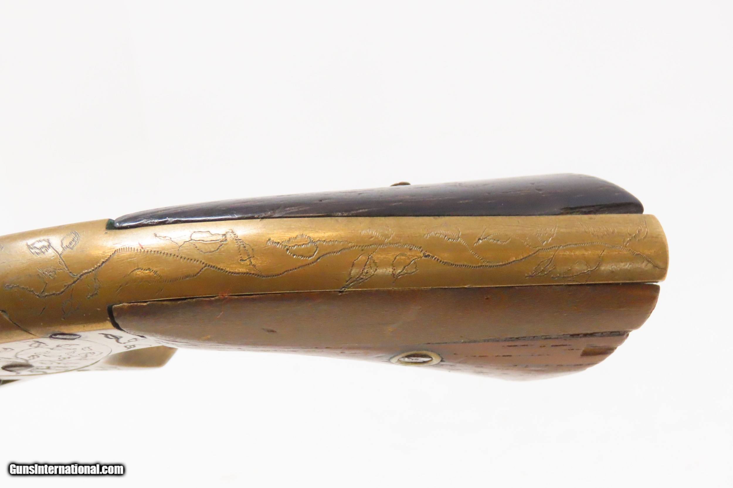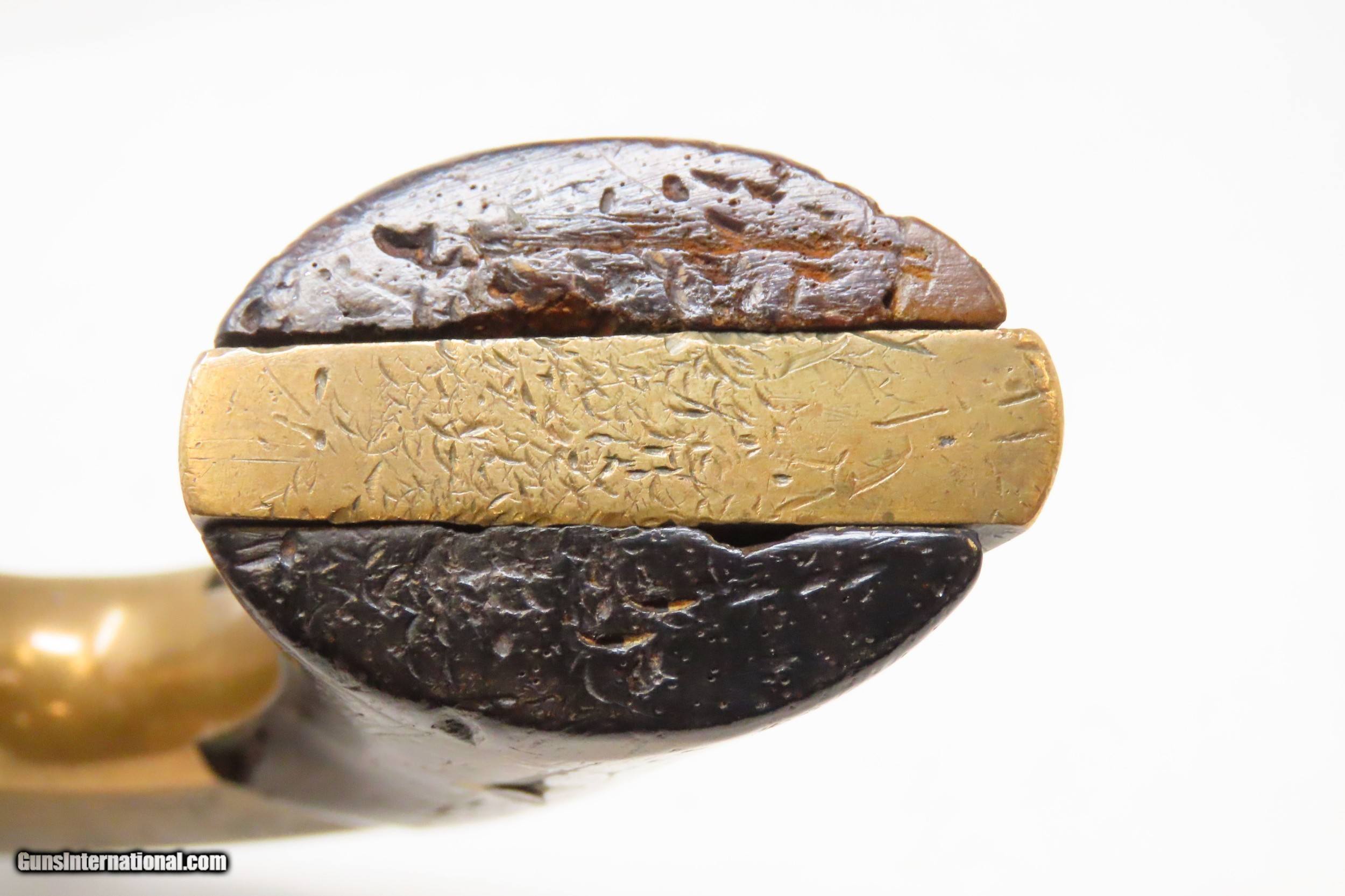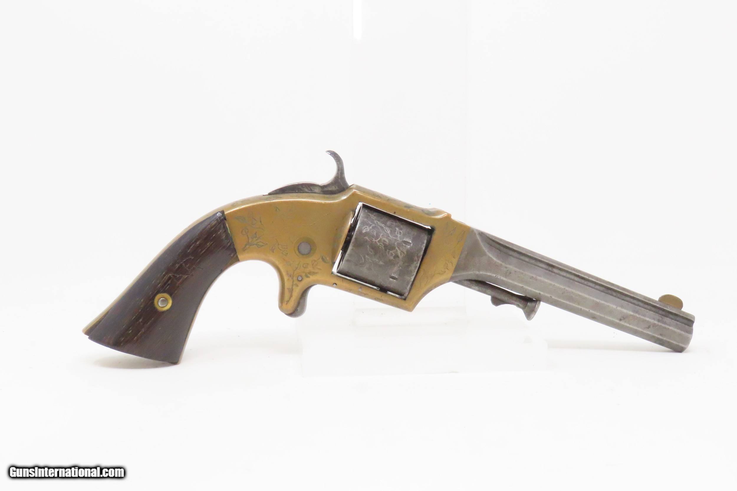 Description: Antique CIVIL WAR Era E. A. PRESCOTT .32 Cal. Rimfire BELT Model Revolver ENGRAVED Revolver Made During the American Civil War Here we present an antique Engraved E. A. Prescott Belt Revolver, made circa 1861-63, in Worcester, Massachusetts. This scarce Civil War revolver is estimated to be one of only three hundred that were made of each of the two styles (Belt and Pocket) made by Prescott. Although similar in appearance to the early Smith & Wesson revolvers, this revolver was manufactured with a solid frame. They were available in .22 or .32 caliber, with the .22 calibers having a 3” barrel while the .32 calibers had a 5.75” barrel. The markings on both the Pocket and the Belt revolvers were the same. It was wartime and the United States stood divided. During a period of rapid industrial innovation, the firearms industry was one of the hottest. The war drove a huge market and many different makers, designs and patents appeared in a very short amount of time. Some of Colt’s most coveted patents expired in 1857, opening opportunities for other gun makers. The frame is all brass with a contoured side plate and the cylinder is a six shot with locking notches at the rear. The latch for the arbor is on the front of the frame. It has a serial number, or possibly a batch number of “91” on the bottom of the frame. The overall condition is good. The action functions, although the cylinder does not lock up. This example has a very good bore for its age, and it remains semi-bright. The frame and cylinder are crudely hand engraved with floral designs. The left griphas had a repair and “AR” is marked on the left. Barrel address marks have been polished away. Own the original! This is a legitimate antique and not a reproduction. Barrel is 5 inches. Caliber: .32 Rimfire Overall condition as seen in photos. Very Fast. Very Safe. FREE SHIPPING WORLDWIDE. Delivered directly to your door by express mail! Guaranteed AUTHENTIC & Includes CERTIFICATE OF AUTHENTICITY. ancestryguns $1850 #228498 SOLD Antique: Yes |