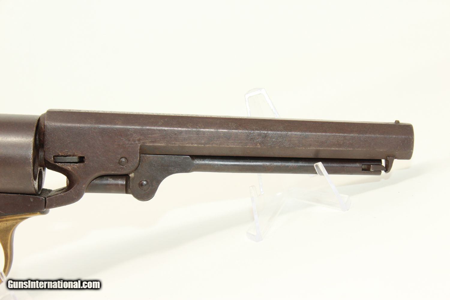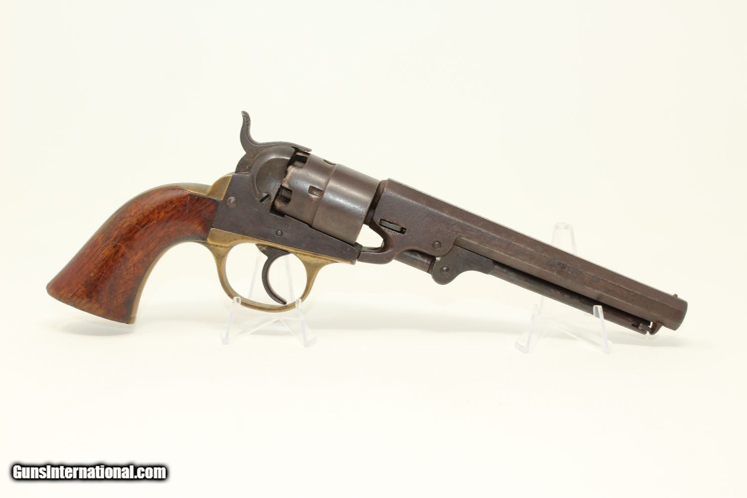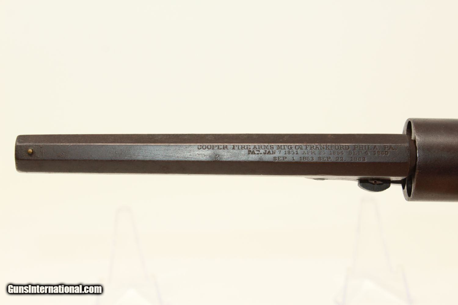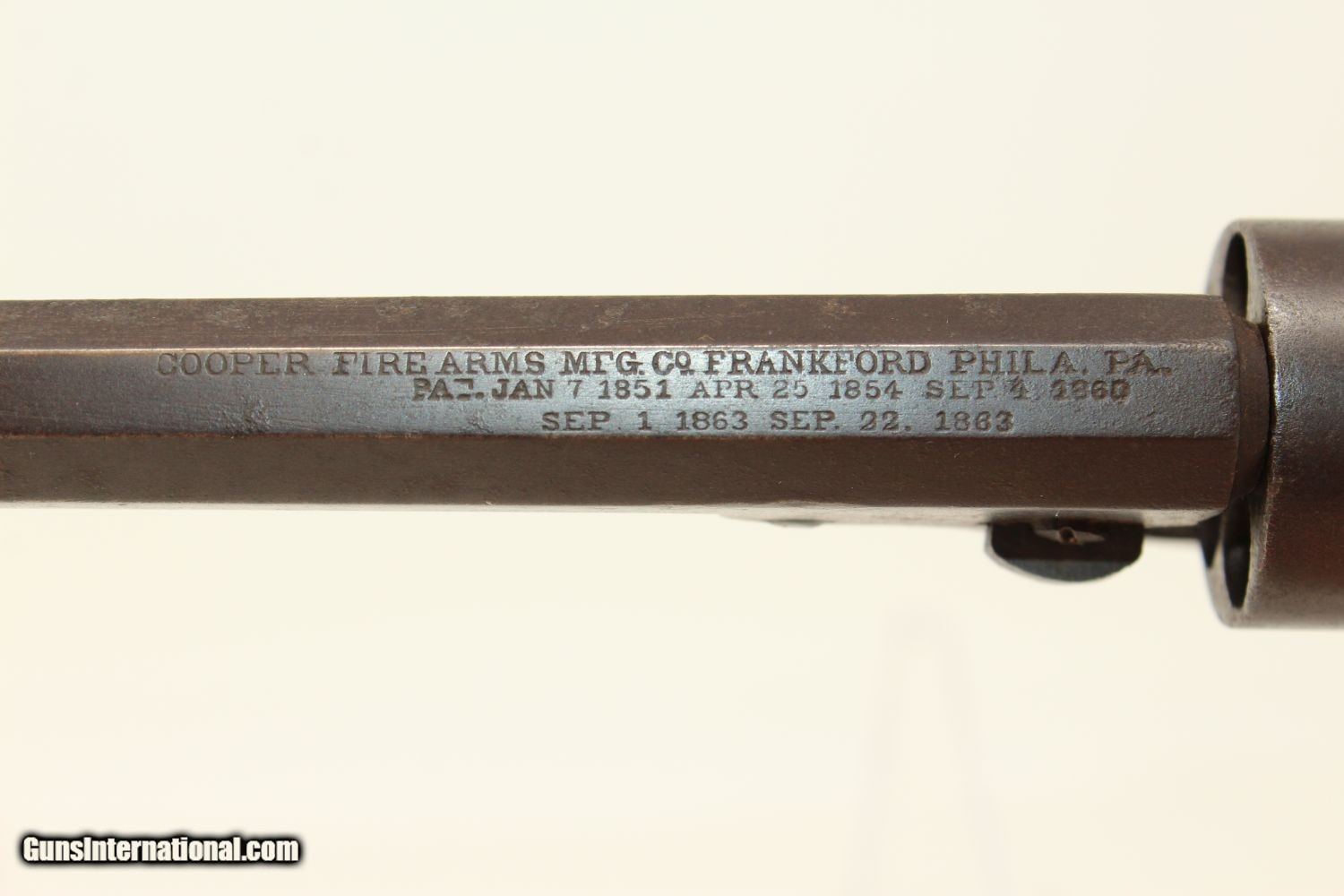 Description: Antique J. M. COOPER Double Action NAVY Revolver Early Double Action Colt 1849-like Percussion Revolver Here we present an antique J.M. Cooper Double Action Navy Revolver, made circa 1864 in Philadelphia, Pennsylvania. During a time of rapid innovation in firearms technology and an insatiable market due to rapid expansion and the American Civil War, dozens of makers seized their opportunity to put their ideas on the market. The J.M. Cooper Double Action Revolver took the concept of the Colt 1849 Pocket Model and improved it by giving it a double action firing mechanism, resulting in their own “Pocket” model. This is an example of a slightly larger, .36 caliber revolver, probably inspired to try to obtain Naval contracts. Only about 15,000 of these Navy Models were made from 1864 to 1869. The overall condition is very good. The iron parts have a dark gray patina. The markings are clear. The numbers match with the exception of the barrel wedge. The walnut grips bear the original varnish and are in great shape. The bore is dark and dusty with strong rifling. The mechanism is only functional in double action. Here is a great example of a double action alternative to Colts and S&Ws of the period! Own the original! This is a legitimate antique and not a reproduction. Barrel is 6 inches. Caliber: .36 Percussion Overall condition as seen in photos. Very Fast. Very Safe. FREE SHIPPING WORLDWIDE. Delivered directly to your door by express mail! Guaranteed AUTHENTIC & Includes CERTIFICATE OF AUTHENTICITY. ancestryguns $1350 #190636 SOLD Antique: Yes |