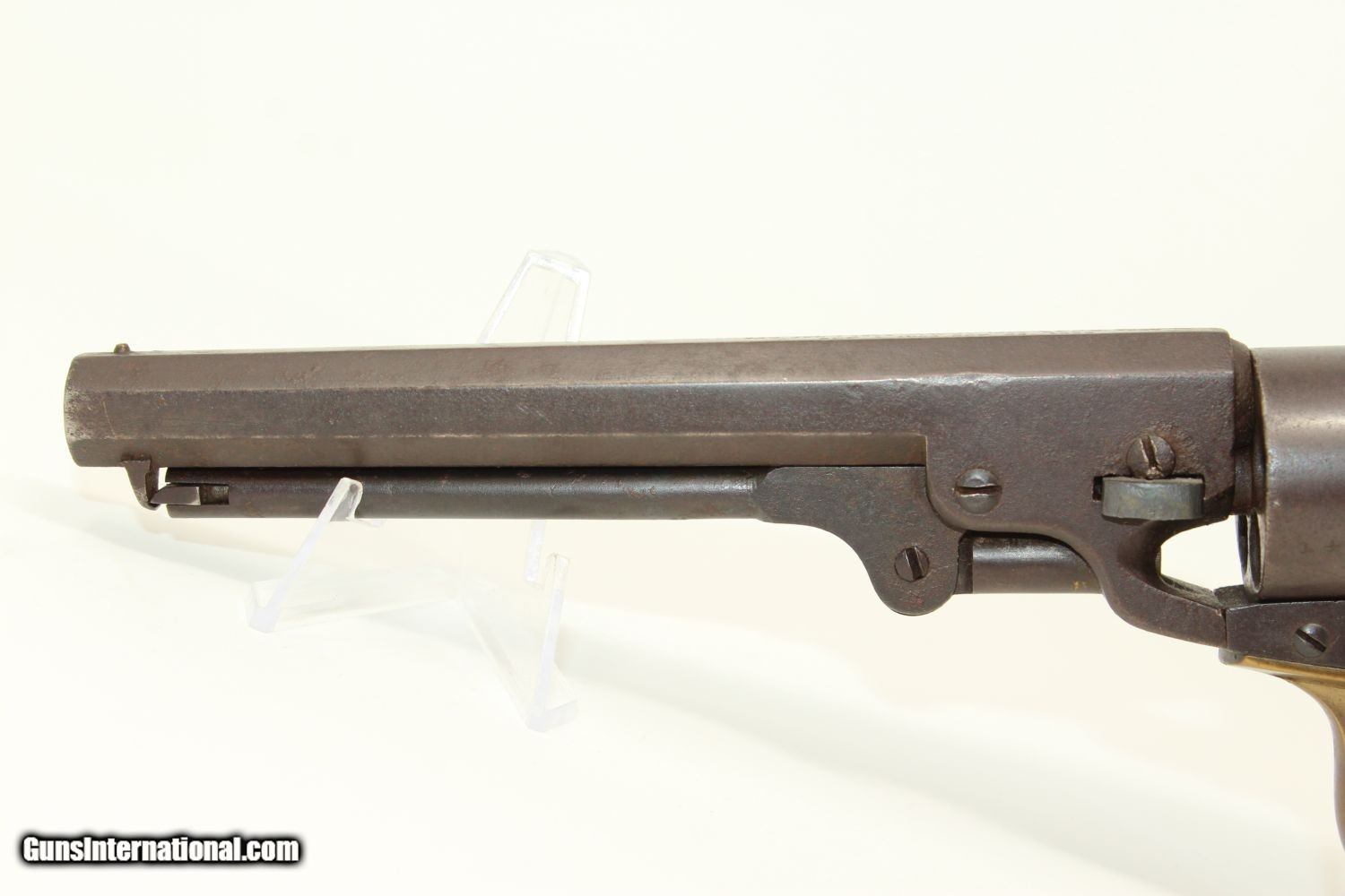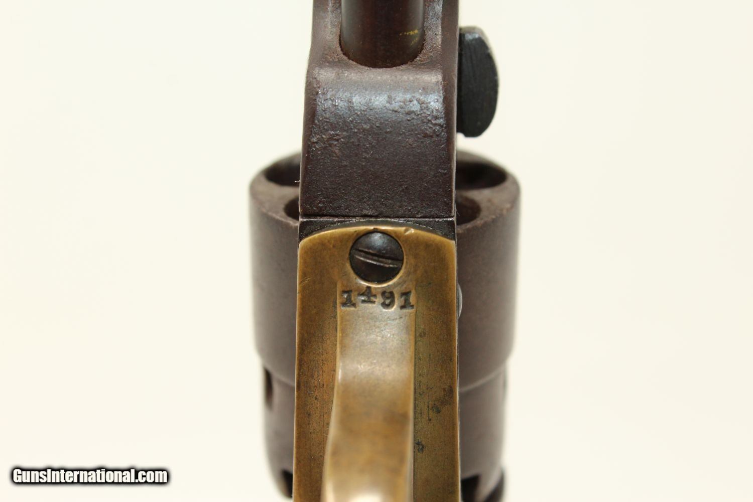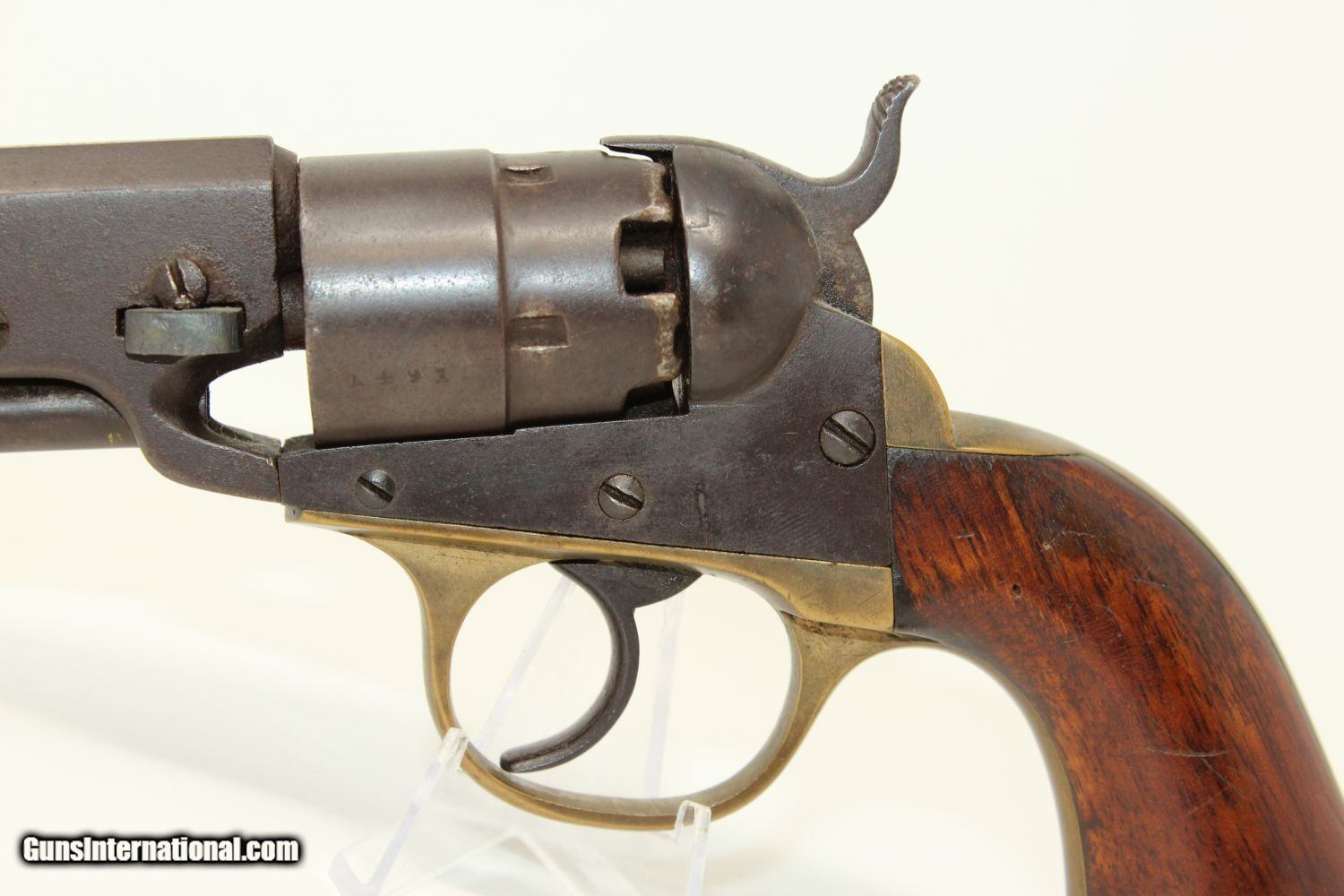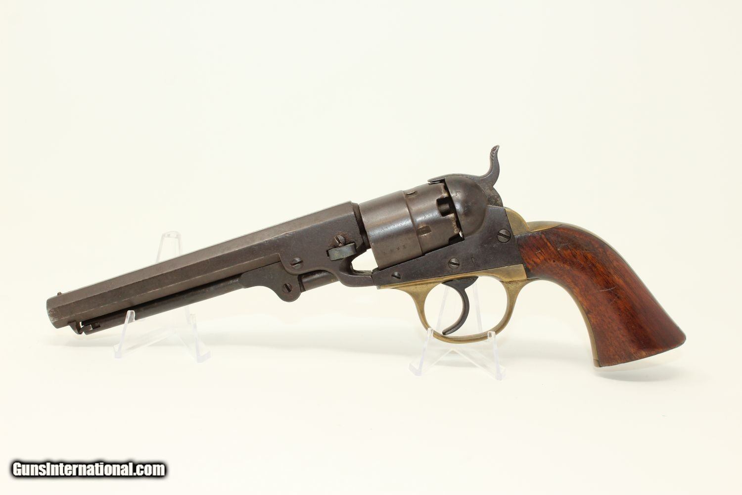 Description: Antique J. M. COOPER Double Action NAVY Revolver Early Double Action Colt 1849-like Percussion Revolver Here we present an antique J.M. Cooper Double Action Navy Revolver, made circa 1864 in Philadelphia, Pennsylvania. During a time of rapid innovation in firearms technology and an insatiable market due to rapid expansion and the American Civil War, dozens of makers seized their opportunity to put their ideas on the market. The J.M. Cooper Double Action Revolver took the concept of the Colt 1849 Pocket Model and improved it by giving it a double action firing mechanism, resulting in their own “Pocket” model. This is an example of a slightly larger, .36 caliber revolver, probably inspired to try to obtain Naval contracts. Only about 15,000 of these Navy Models were made from 1864 to 1869. The overall condition is very good. The iron parts have a dark gray patina. The markings are clear. The numbers match with the exception of the barrel wedge. The walnut grips bear the original varnish and are in great shape. The bore is dark and dusty with strong rifling. The mechanism is only functional in double action. Here is a great example of a double action alternative to Colts and S&Ws of the period! Own the original! This is a legitimate antique and not a reproduction. Barrel is 6 inches. Caliber: .36 Percussion Overall condition as seen in photos. Very Fast. Very Safe. FREE SHIPPING WORLDWIDE. Delivered directly to your door by express mail! Guaranteed AUTHENTIC & Includes CERTIFICATE OF AUTHENTICITY. ancestryguns $1350 #190636 SOLD Antique: Yes |