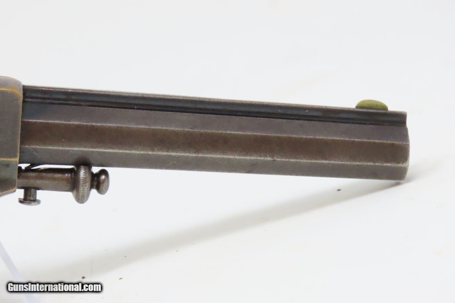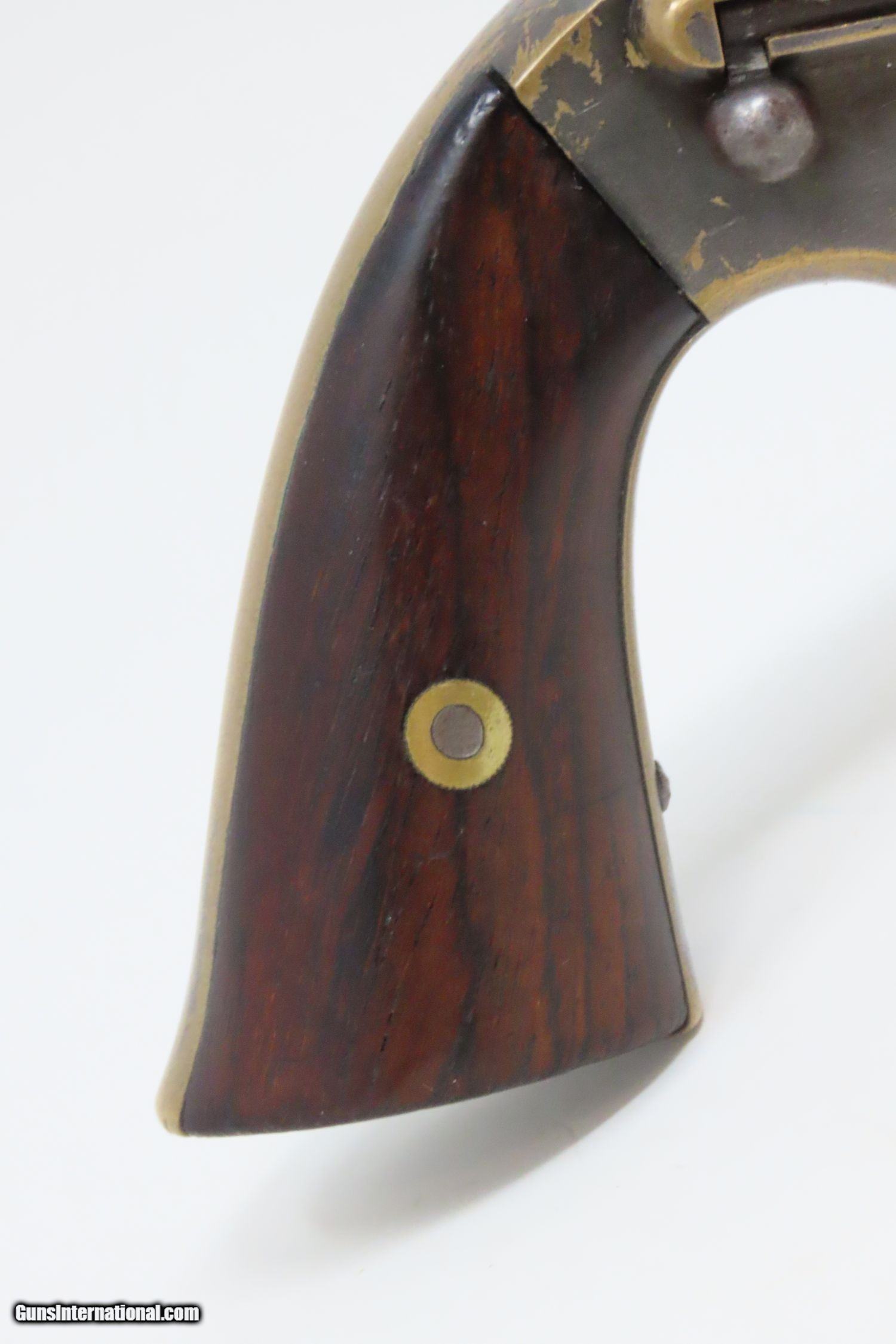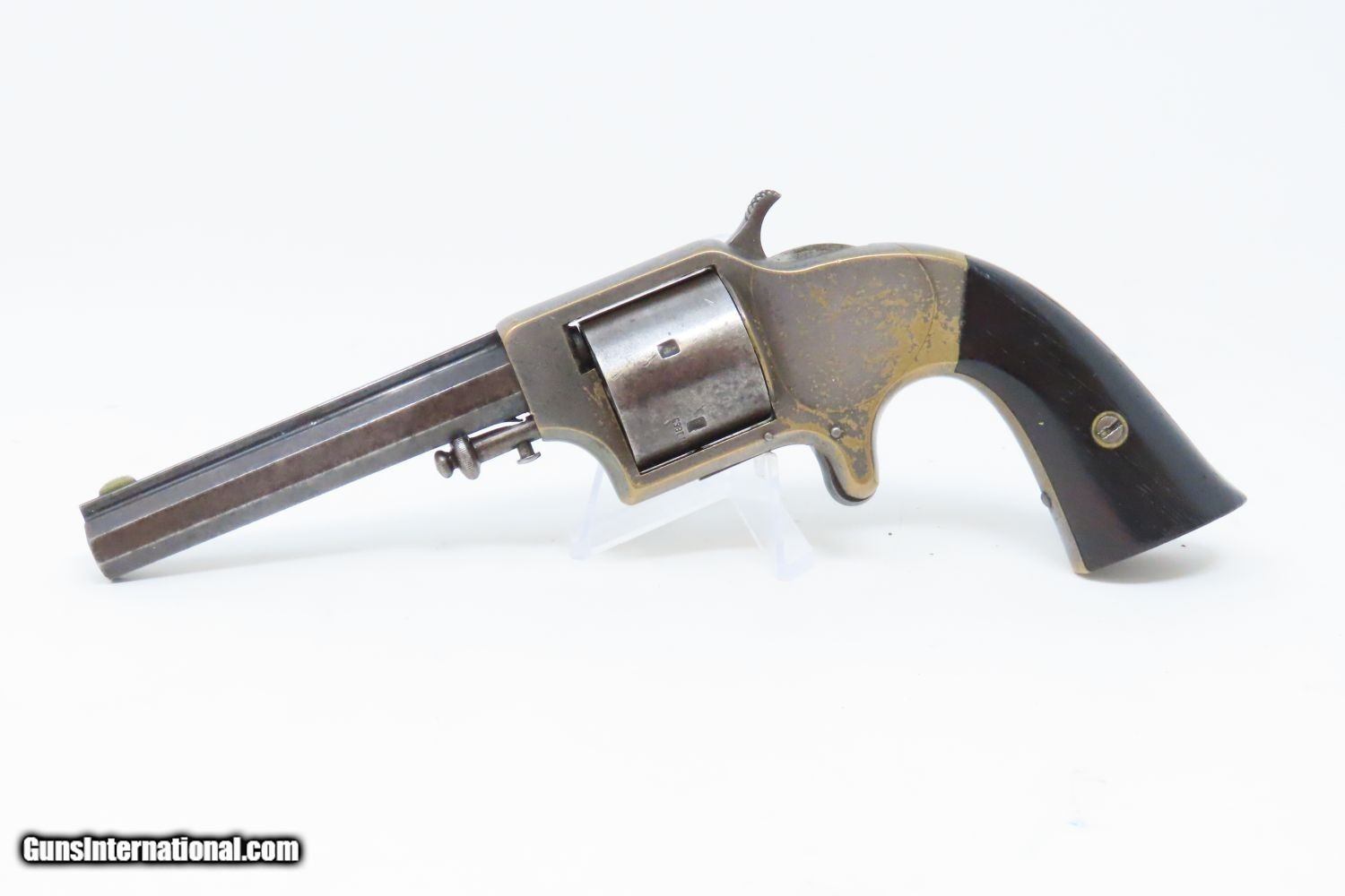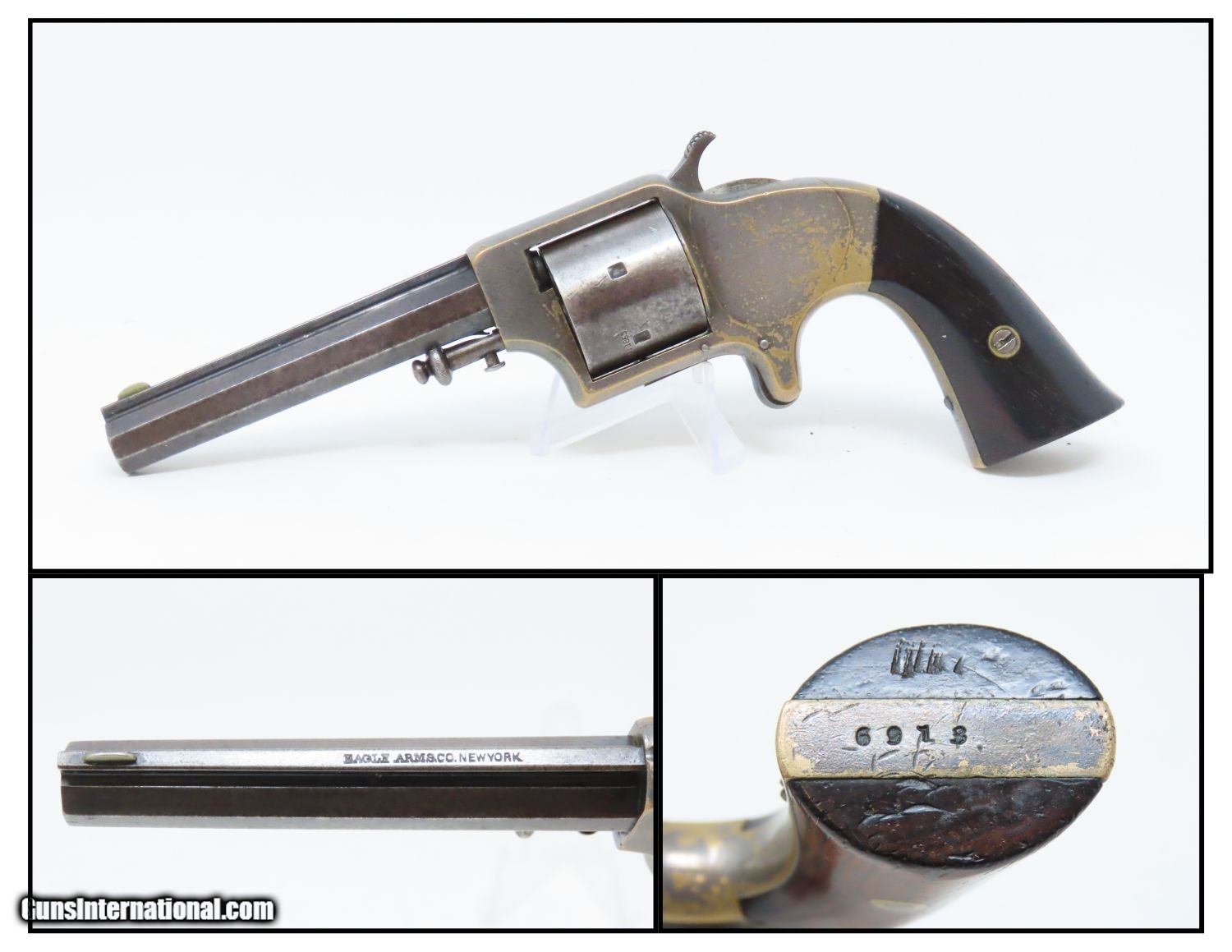 Description: Antique MERWIN & BRAY Front Loading EAGLE ARMS CO. SPUR TRIGGER Revolver .30 Caliber CUP-FIRE (TEAT-FIRE) SIDEARM of Soldiers, Officers Here we present an antique Eagle Arms Company Front Loading Pocket Revolver, made circa 1864 in New York, New York. The legendary firearms agents Merwin & Bray of New York City financed the manufacture of this revolver, and they were also produced by Plant’s Manufacturing Company, the two being identical but for the markings. Only 20,000 were made of all types. This was one of the few relatively successful designs that made it around the Smith & Wesson owned Rollin White Patent for the bored through cylinder, which was held and vigorously defended until about 1869. This was done by keeping a “lip” at the back of each cylinder chamber, so that the cylinder was not completely bored through and was loaded from the front versus the back of the cylinder. This is why the ejector is located behind the cylinder. The ammunition was unique to this gun in that the bullet’s tip sat flush or below the neck of the cartridge and then neck was flush with the leading edge of the chamber. The back of the cartridge had a distinct cup-shape in which the primer was located. This cartridge was designed by Willard C. Ellis and John H. White, and they were granted the patent in July of 1859. This represents the pocket version of the design. There were belt-sized “Army” versions available as well. Though not a primary military arm during the American Civil War, handguns were commonly privately purchased by soldiers for use on the battlefield. Whether legend or fact, it is interesting to note something commonly read about pocket revolvers of the day: that while they could be used for self-defense against the enemy, many soldiers kept them on their person to defend themselves against an unwanted amputation in the primitive field hospitals that were notorious, even in their day. The overall condition is near fine. Lots of original silver finish remains on the brass frame with blued barrel. The action is strong with the exception that the trigger return spring is anemic, requiring pushing the trigger forward for the hammer to stay in the cocked position. The bore is mostly bright, with nice rifling. Both grips are firm with expected handling wear. This is a neat little pocket revolver from the 1860s! Own the original! This is a legitimate antique and not a reproduction. Barrel is 3-1/2 inches. Caliber: .30 cup primed (teat-fire) cartridge Overall condition as seen in photos. Very Fast. Very Safe. FREE SHIPPING WORLDWIDE. Delivered directly to your door by express mail! Guaranteed AUTHENTIC & Includes CERTIFICATE OF AUTHENTICITY. ancestryguns $1285 #201546 SOLD Antique: Yes |