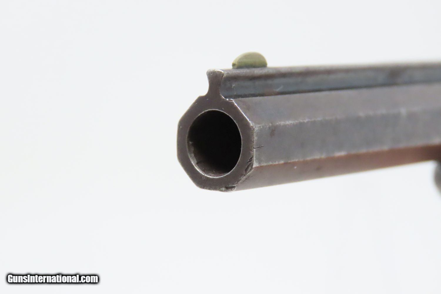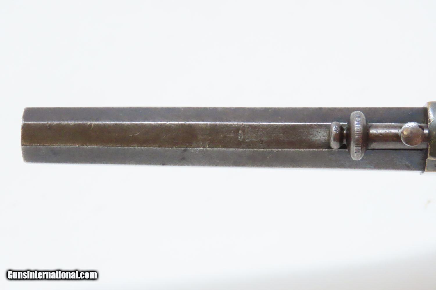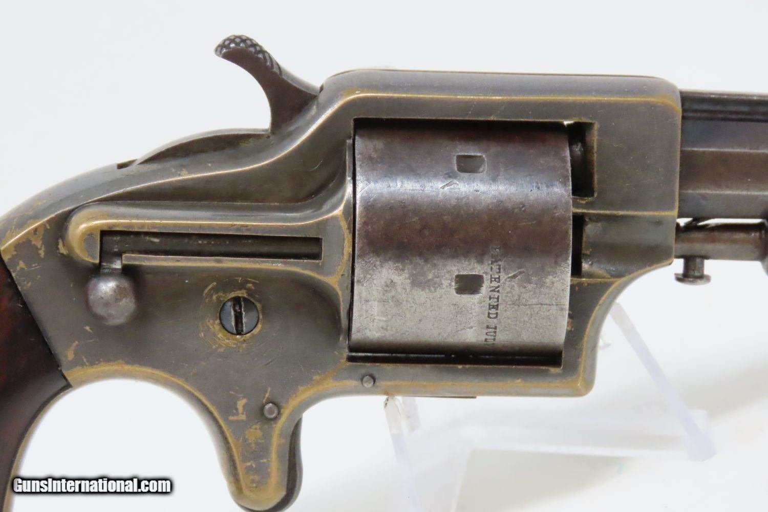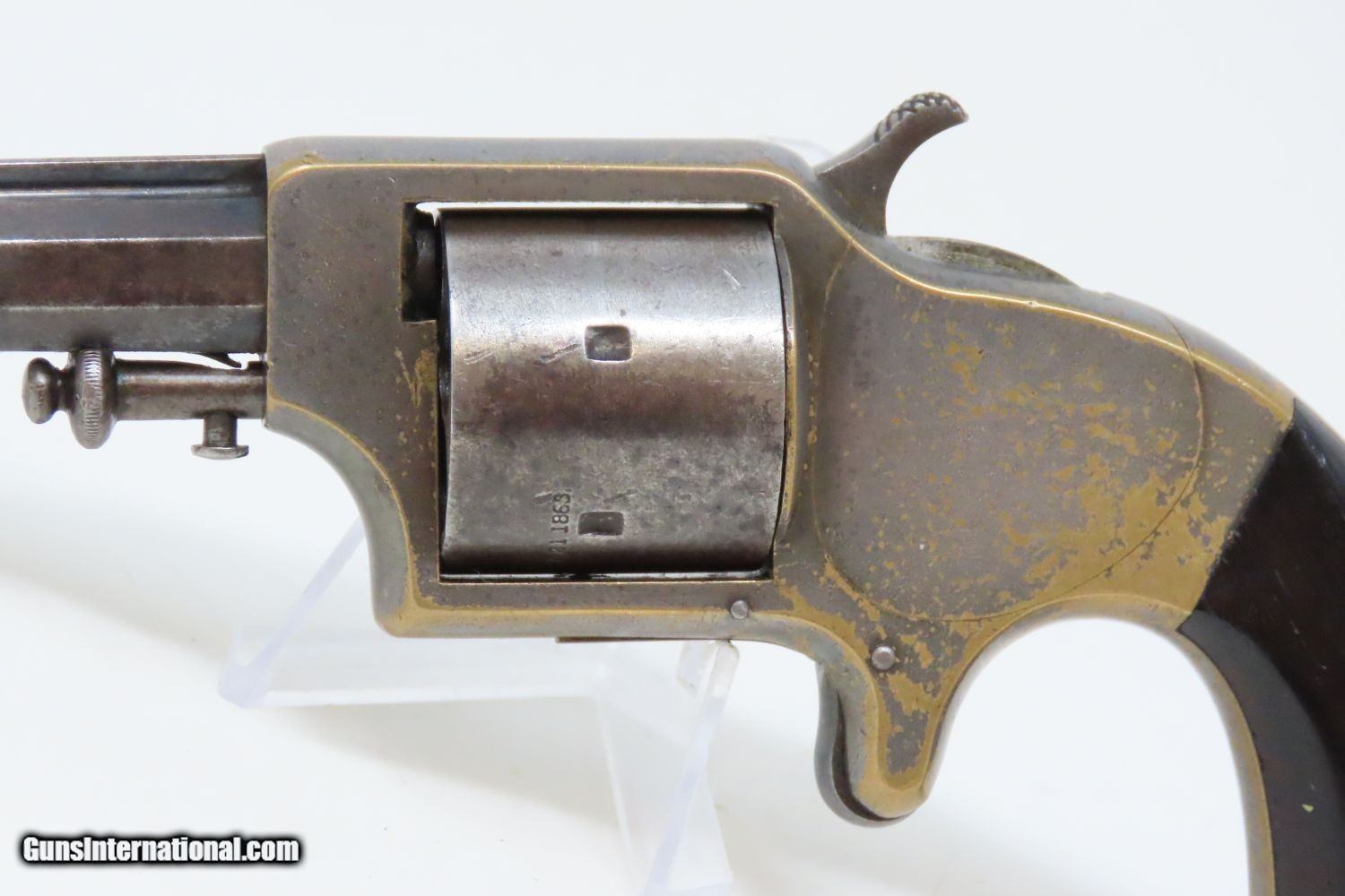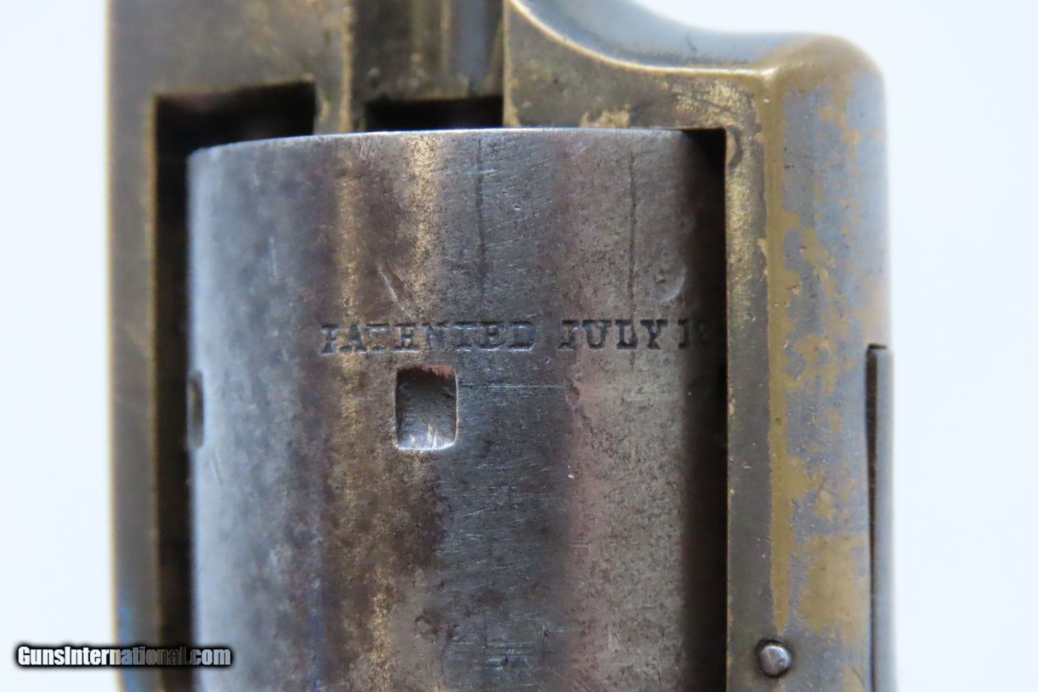 Description: Antique MERWIN & BRAY Front Loading EAGLE ARMS CO. SPUR TRIGGER Revolver .30 Caliber CUP-FIRE (TEAT-FIRE) SIDEARM of Soldiers, Officers Here we present an antique Eagle Arms Company Front Loading Pocket Revolver, made circa 1864 in New York, New York. The legendary firearms agents Merwin & Bray of New York City financed the manufacture of this revolver, and they were also produced by Plant’s Manufacturing Company, the two being identical but for the markings. Only 20,000 were made of all types. This was one of the few relatively successful designs that made it around the Smith & Wesson owned Rollin White Patent for the bored through cylinder, which was held and vigorously defended until about 1869. This was done by keeping a “lip” at the back of each cylinder chamber, so that the cylinder was not completely bored through and was loaded from the front versus the back of the cylinder. This is why the ejector is located behind the cylinder. The ammunition was unique to this gun in that the bullet’s tip sat flush or below the neck of the cartridge and then neck was flush with the leading edge of the chamber. The back of the cartridge had a distinct cup-shape in which the primer was located. This cartridge was designed by Willard C. Ellis and John H. White, and they were granted the patent in July of 1859. This represents the pocket version of the design. There were belt-sized “Army” versions available as well. Though not a primary military arm during the American Civil War, handguns were commonly privately purchased by soldiers for use on the battlefield. Whether legend or fact, it is interesting to note something commonly read about pocket revolvers of the day: that while they could be used for self-defense against the enemy, many soldiers kept them on their person to defend themselves against an unwanted amputation in the primitive field hospitals that were notorious, even in their day. The overall condition is near fine. Lots of original silver finish remains on the brass frame with blued barrel. The action is strong with the exception that the trigger return spring is anemic, requiring pushing the trigger forward for the hammer to stay in the cocked position. The bore is mostly bright, with nice rifling. Both grips are firm with expected handling wear. This is a neat little pocket revolver from the 1860s! Own the original! This is a legitimate antique and not a reproduction. Barrel is 3-1/2 inches. Caliber: .30 cup primed (teat-fire) cartridge Overall condition as seen in photos. Very Fast. Very Safe. FREE SHIPPING WORLDWIDE. Delivered directly to your door by express mail! Guaranteed AUTHENTIC & Includes CERTIFICATE OF AUTHENTICITY. ancestryguns $1285 #201546 SOLD Antique: Yes |