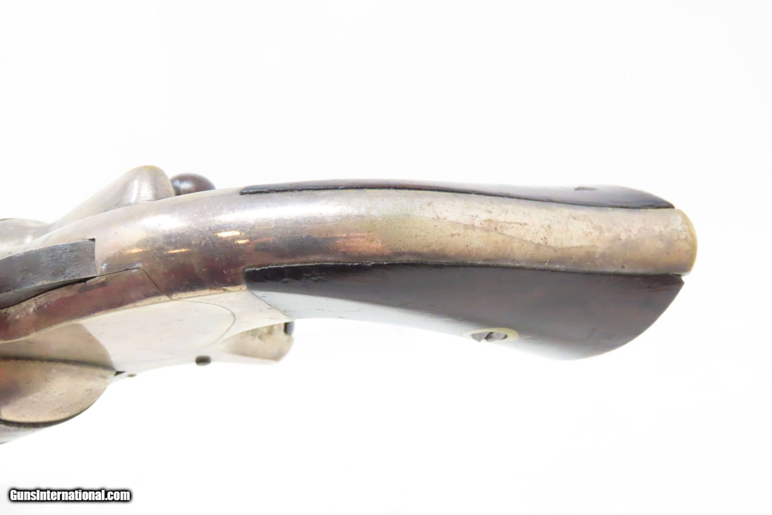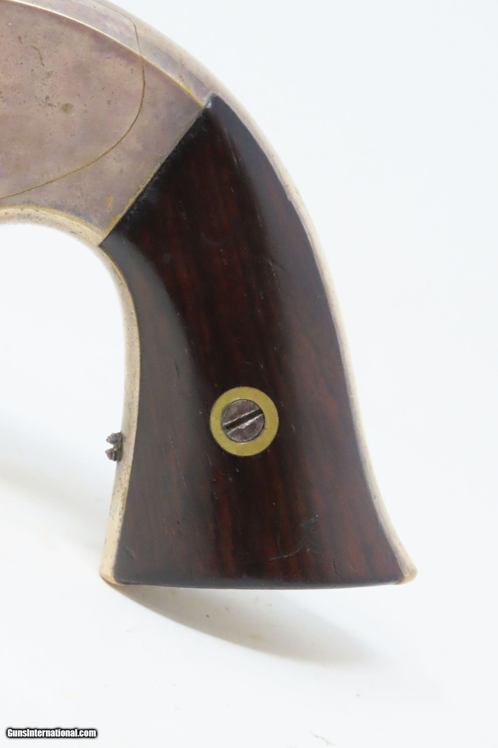 Description: Antique MERWIN & BRAY Front Loading PLANT MFG. CO. .42 CUP FIRE Revolver CIVIL WAR Era Revolver Here we present an antique Merwin & Bray Front Loading Plant Manufacturing Company Pocket Model Revolver, made circa 1865 in New Haven, Connecticut. Makers of revolvers during the American Civil War had three choices: 1) they could take their chances violating the Smith & Wesson owned Rollin White Patent for the concept of a “bored through cylinder” to accept metallic cartridges, 2) they could continue to make percussion guns with all of their disadvantages, or 3) they could invent their own concept that was both an improvement over percussion guns and circumvented the Rollin White Patent. The latter option is what Plant’s chose. Plant’s Mfg. Co. was financed and represented by the famed firearms agents Merwin & Bray, hence their name on the barrel. Their revolver featured a “cup-primed” and front-loading concept, which was among the best attempts to get around S&W’s 12-1/2 year stronghold on cartridge revolvers. They found relative success with the public rather than with the military. The overall condition is very good. Original finish/patina. The brass frame still bears much of the silver finish. The action (hammer/trigger) is strong. The cylinder does not always index properly. The bore is good for age: dim with good rifling. The rosewood grips are smooth and solid. A unique solution to a problem, resulting in a unique firearm! Own the original! This is a legitimate antique and not a reproduction. Barrel is 5-1/4 inches. Caliber: .42 Cup-Fire Overall condition as seen in photos. Very Fast. Very Safe. FREE SHIPPING WORLDWIDE. Delivered directly to your door by express mail! Guaranteed AUTHENTIC & Includes CERTIFICATE OF AUTHENTICITY. ancestryguns $1945 #217755 SOLD Antique: Yes |