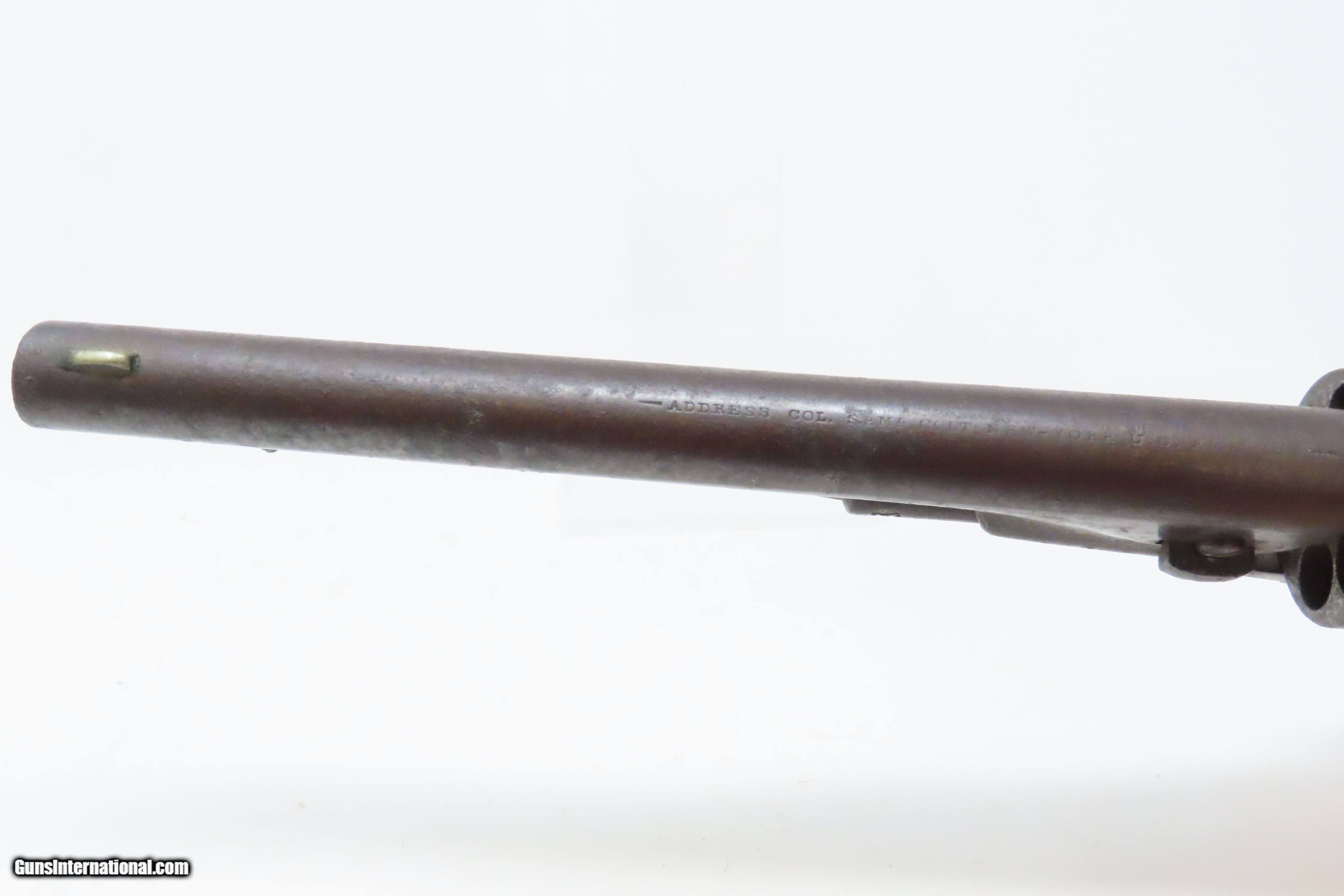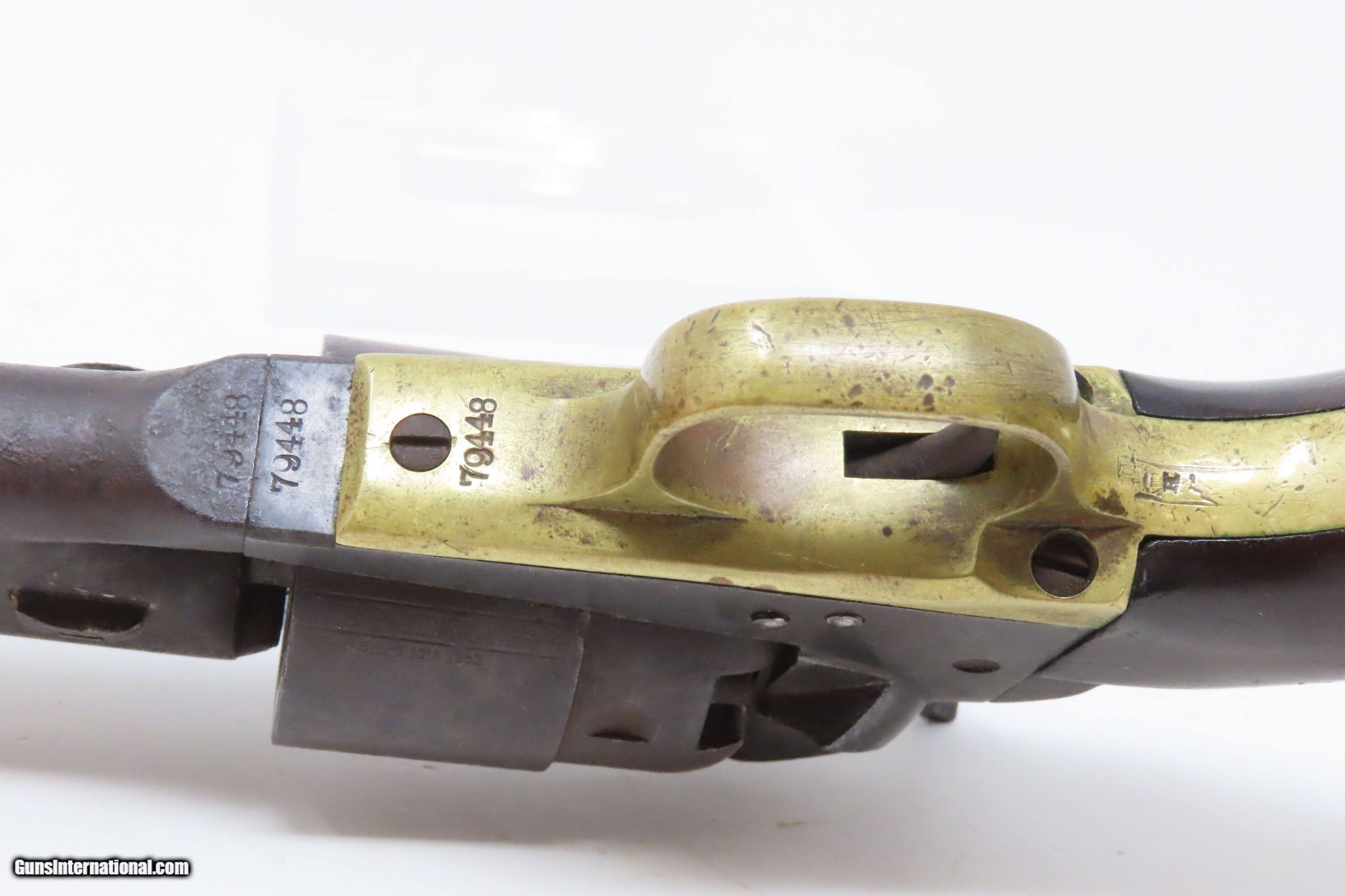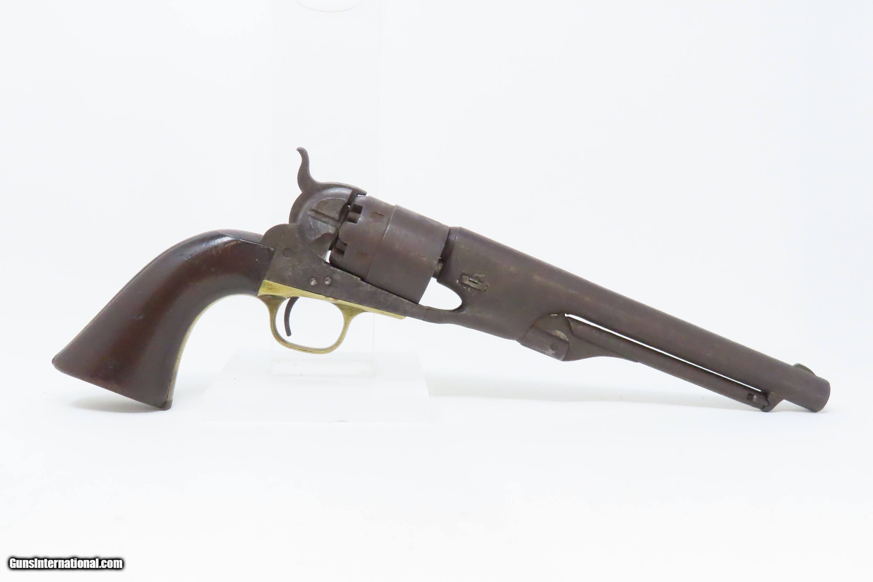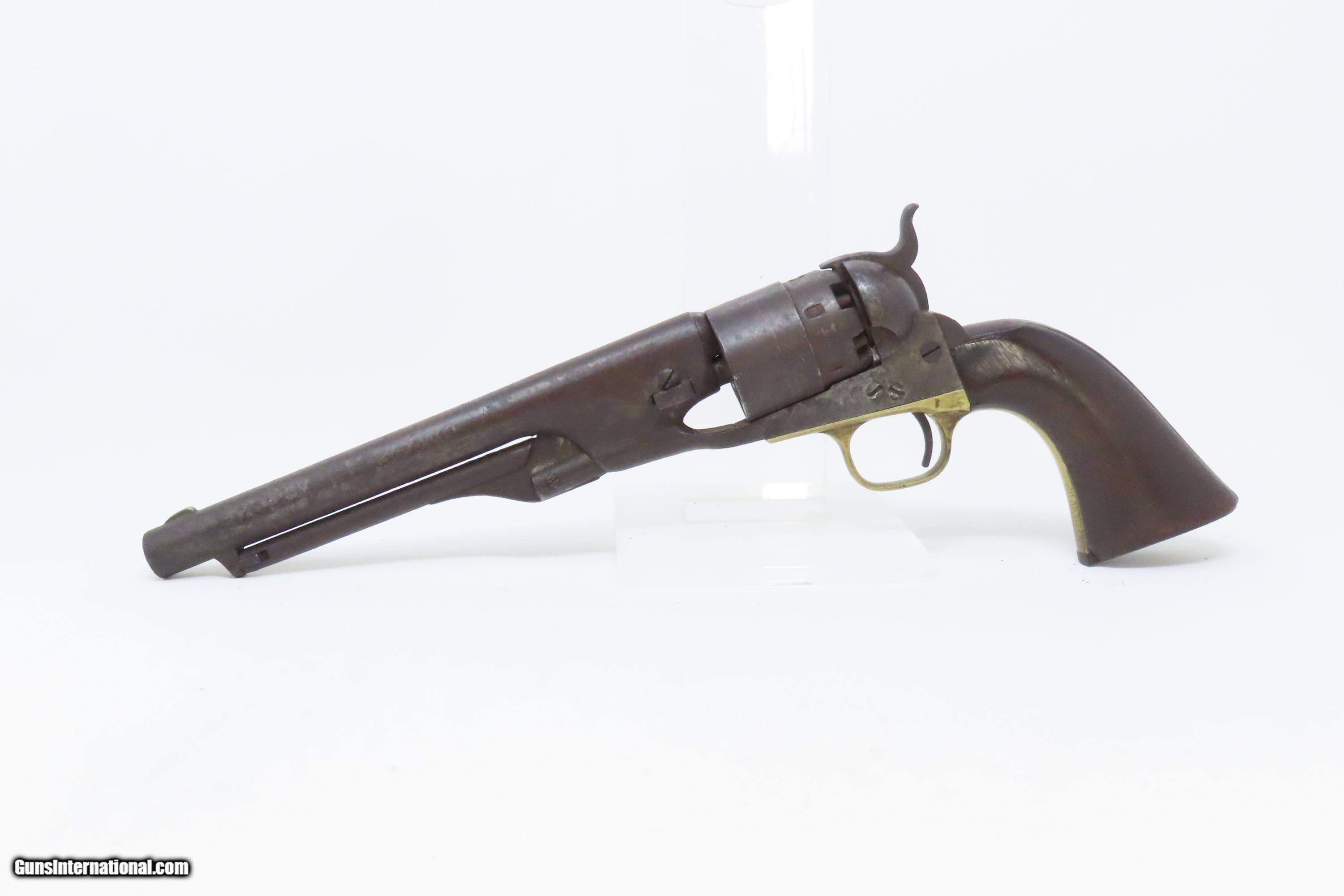 Description: Antique Mid-CIVIL WAR COLT U.S. Model 1860 ARMY .44 Cal Percussion REVOLVER U.S. INSPECTED Revolver used into the WILD WEST Here we present an antique Colt U.S. Model 1860 Army Percussion Revolver, made in 1862 in Hartford, Connecticut. The 1860 Army was the single most used pistol of the American Civil War. Over 200,000 were made from 1860 to 1873, and 156,000 of those were made by the end of the war in 1865. These were excellent sidearms for officers, cavalry, infantry, and artillery troops. The 1860 Army was Samuel Colt’s finest achievement to that point, having finally developed a large caliber revolver that weighed about 2 lbs. 10 oz. to the famous Dragoon’s 4 lbs. 4 oz., and was adopted en masse by the U.S. government with huge contracts. The revolver was well balanced in hand and had a long enough barrel to be effective when utilized as a carbine with the attachable shoulder stock. This revolver represented unprecedented firepower from a handgun in the field at the time and was especially suited to Cavalry. The Confederacy, lacking in manufacturing capabilities though they were, managed to produce limited numbers of copies, and battlefield pickups of the 1860 Army were highly coveted. The 1860 Army went on to serve the U.S. military even after the Civil War and into the Indian Wars, until production of Colt’s 1873 Single Action Army created new waves in the revolver market, and again achieved great success in the military and commercial markets. The overall condition is good+. Dark, untouched patina throughout. The action is excellent with solid lockup. The cylinder scene is still visible. The bore is in good shape and untouched like the exterior with very strong rifling. The grip is solid and shows a faint cartouche on the left and a stronger cartouche on the right. Numbers match throughout. A nice original piece! Own the original! This is a legitimate antique and not a reproduction. Barrel is 8 inches. Caliber: .44 Percussion Overall condition as seen in photos. Very Fast. Very Safe. FREE SHIPPING WORLDWIDE. Delivered directly to your door by express mail! Guaranteed AUTHENTIC & Includes CERTIFICATE OF AUTHENTICITY. ancestryguns $2900 #227843 SOLD Antique: Yes |