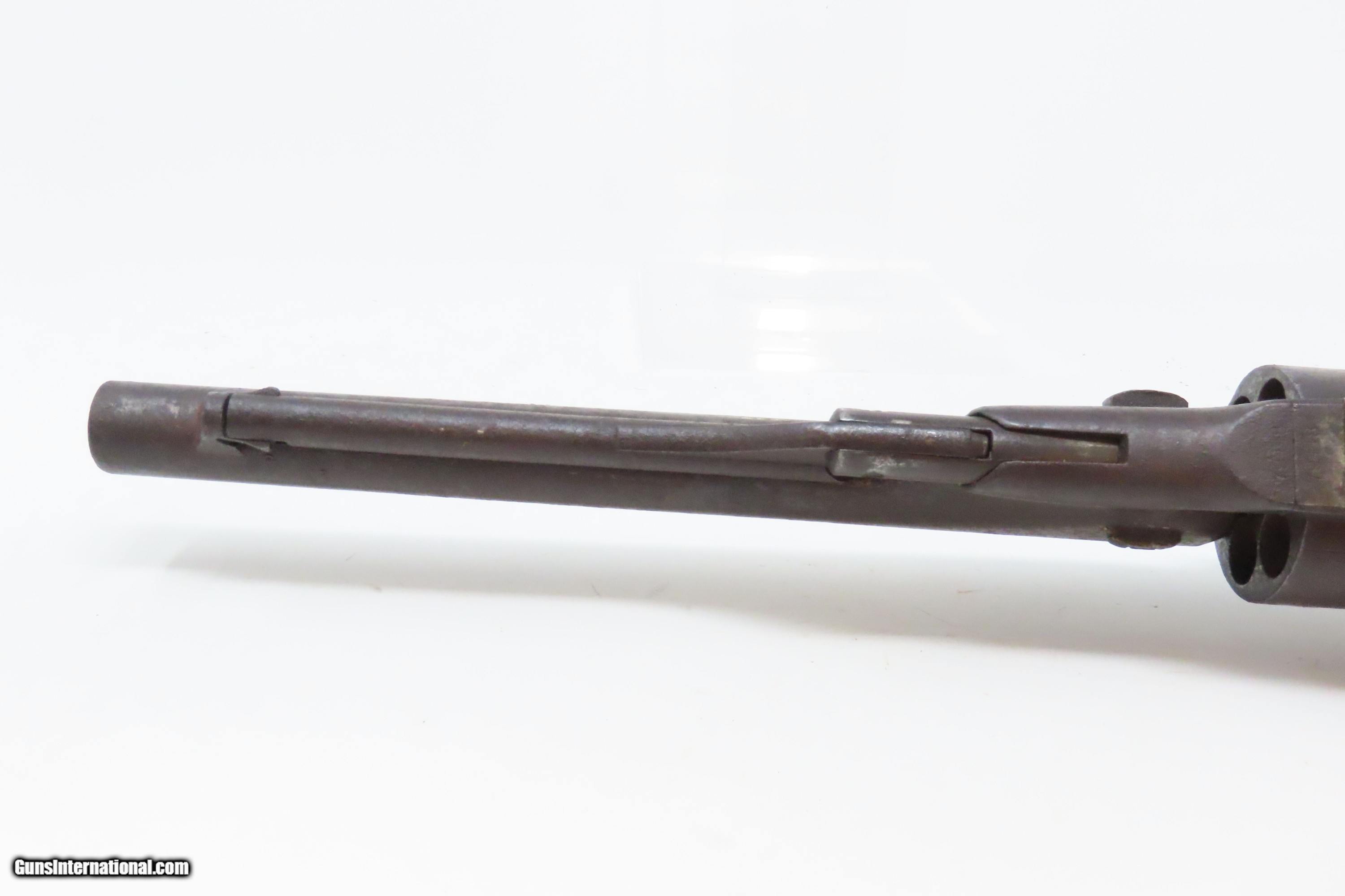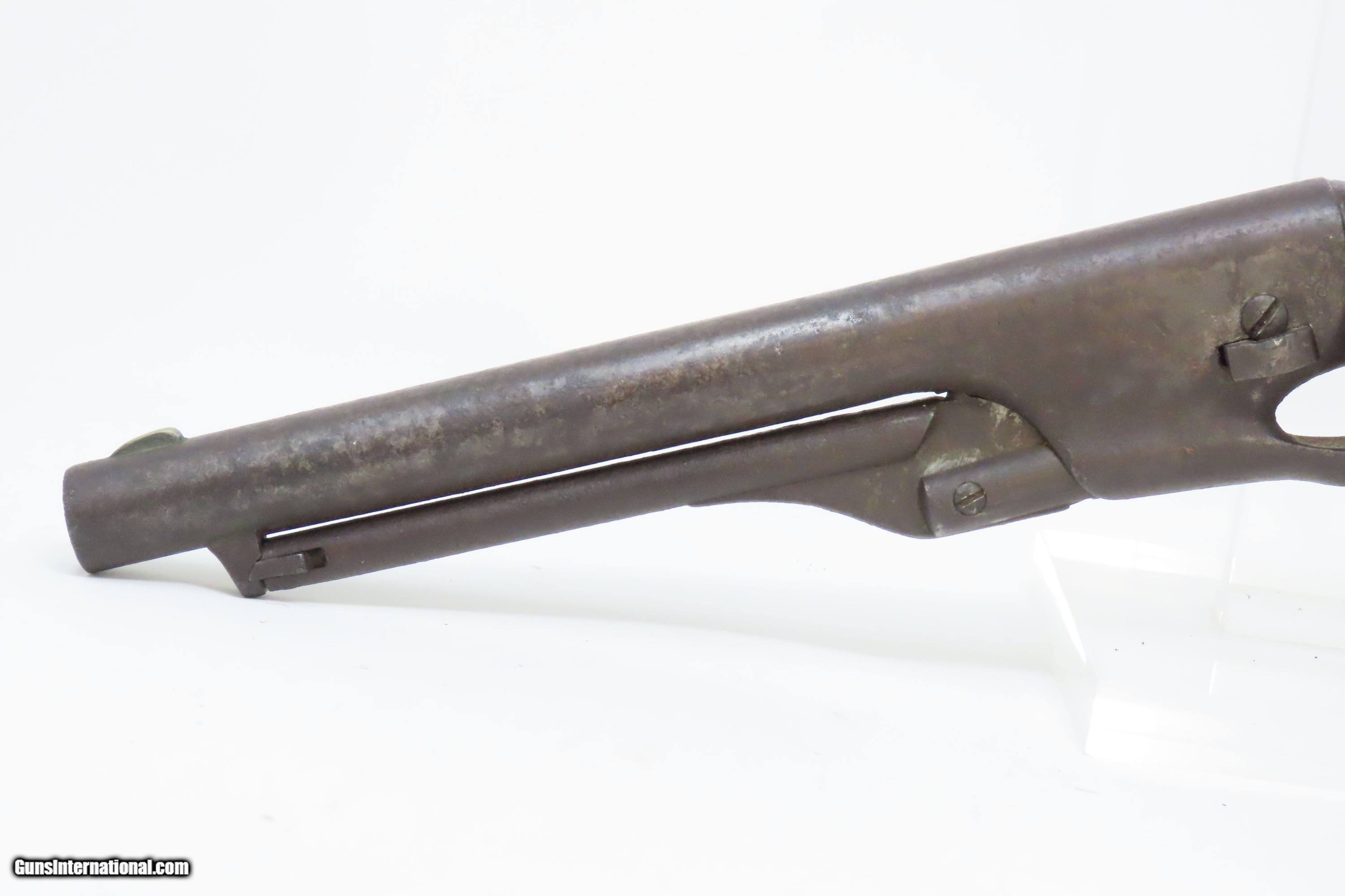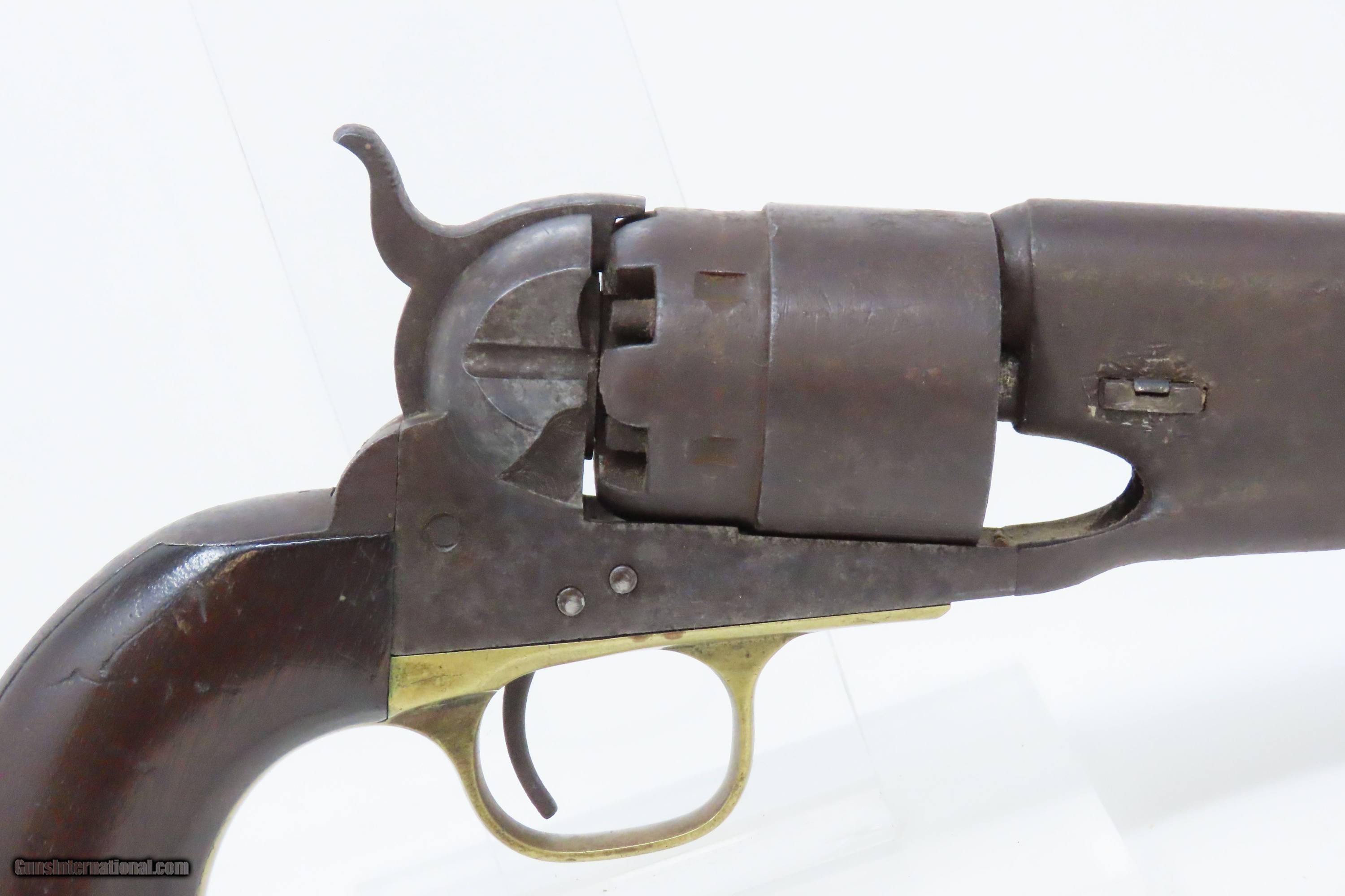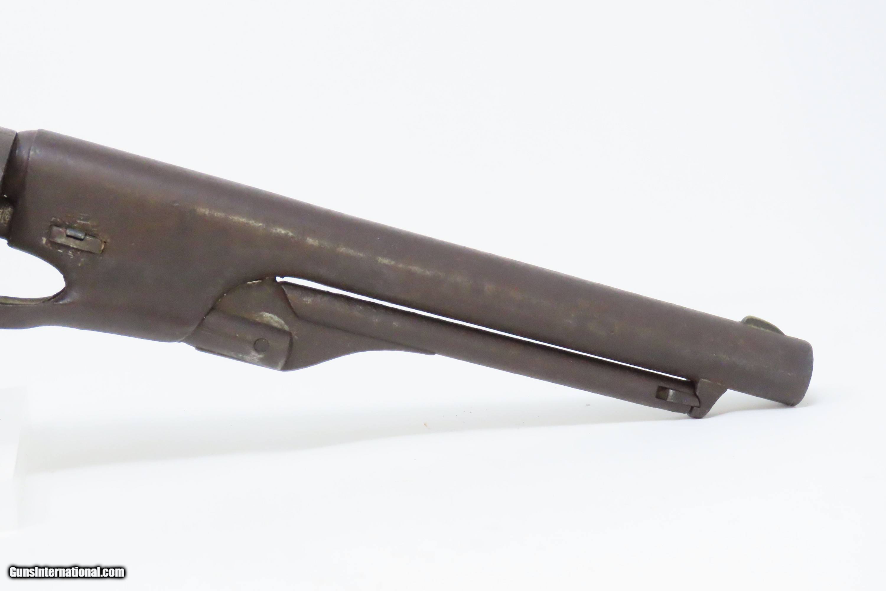 Description: Antique Mid-CIVIL WAR COLT U.S. Model 1860 ARMY .44 Cal Percussion REVOLVER U.S. INSPECTED Revolver used into the WILD WEST Here we present an antique Colt U.S. Model 1860 Army Percussion Revolver, made in 1862 in Hartford, Connecticut. The 1860 Army was the single most used pistol of the American Civil War. Over 200,000 were made from 1860 to 1873, and 156,000 of those were made by the end of the war in 1865. These were excellent sidearms for officers, cavalry, infantry, and artillery troops. The 1860 Army was Samuel Colt’s finest achievement to that point, having finally developed a large caliber revolver that weighed about 2 lbs. 10 oz. to the famous Dragoon’s 4 lbs. 4 oz., and was adopted en masse by the U.S. government with huge contracts. The revolver was well balanced in hand and had a long enough barrel to be effective when utilized as a carbine with the attachable shoulder stock. This revolver represented unprecedented firepower from a handgun in the field at the time and was especially suited to Cavalry. The Confederacy, lacking in manufacturing capabilities though they were, managed to produce limited numbers of copies, and battlefield pickups of the 1860 Army were highly coveted. The 1860 Army went on to serve the U.S. military even after the Civil War and into the Indian Wars, until production of Colt’s 1873 Single Action Army created new waves in the revolver market, and again achieved great success in the military and commercial markets. The overall condition is good+. Dark, untouched patina throughout. The action is excellent with solid lockup. The cylinder scene is still visible. The bore is in good shape and untouched like the exterior with very strong rifling. The grip is solid and shows a faint cartouche on the left and a stronger cartouche on the right. Numbers match throughout. A nice original piece! Own the original! This is a legitimate antique and not a reproduction. Barrel is 8 inches. Caliber: .44 Percussion Overall condition as seen in photos. Very Fast. Very Safe. FREE SHIPPING WORLDWIDE. Delivered directly to your door by express mail! Guaranteed AUTHENTIC & Includes CERTIFICATE OF AUTHENTICITY. ancestryguns $2900 #227843 SOLD Antique: Yes |