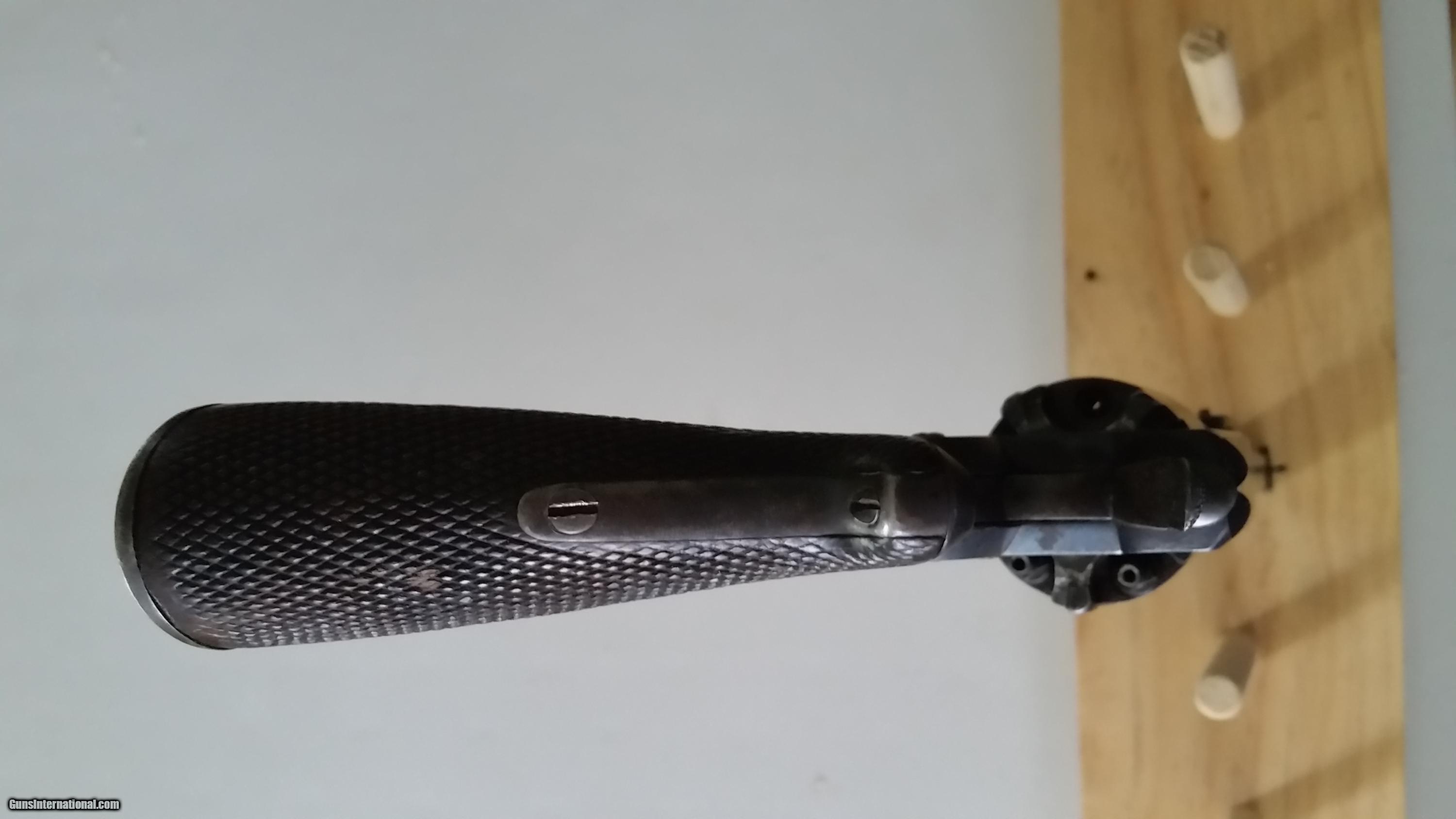 Description: Beaumont Adams 1856 patent .44 caliber double-action, five shot percussion civil war revolverwith a 6 inch barrel serial number 208## . This revolver was the first handgun to be classified as double-action, however you cannot cock the hammer back in the normal sense. You can fire the pistol by pulling the trigger which will advance the cylinder and fire the pistol or by thumbing back and releasing the hammer. These were made by Deane , Adams and Deane located in London England. The pistol is in excellent condition with original case hardening/bluing visible over the entire revolver. Very slight wear visible and sharp corners. The frame and barrel are one piece with the rifling sharp and distinct, with some spots, which might be slight pitting or metal loss, I do not own a bore scope. The grip is a of one piece walnut, with checkering pattern sharp and showing no indication of wear other than a couple of slight dings. One of the original nipples is broken off and missing, with no damage to the cylinder. There is evidence of a very small lip located on the fore part of the cylinder around the center axis of the cylinder which looks to be chipped off which allows slight fore and aft movement of the cylinder. There are three slight indentations on the backside of the loading lever pivot screw boss. Lastly there is a indentation on the hammer face, the result of a few too many dry fires. A few scratches in some of the nipple recesses and some bluing loss on the barrel where the loading lever rubs when in use. 6 The revolver appears to be unfired and is a somewhat of an enigma. The only markings on the pistol are a small stamping which has the name Adams arcing over the date 1856 and the word patent arcing under the date. The right side of the frame has the wording Adams patent followed by the serial number. It is a matching numbers gun with the same serial number on the cylinder. The proofing mark is from Leige. Another oddity is a mysterious mark just below the lesige mark which looks like a crown over a Z. I cannot find a reference for this mark anywhere. Since the vast majority of these pistols went to the Confederacy and since this one is divoid of maker marks or identifying marks I would assume this one was also delivered to the Confederacy by the maker located in London England. Overall a very nice, desirable and rare Civil War percussion pistol. They don't come along like this very often.I would rate this revolver at no less than 90% and probably more acurately 95% Payment needs to run thru PayPal unless you want to pick it up or some other secure form of payment. I would love to take a personal check or money order but if you had been ripped off as many times as I have you would understand my reluctance. Shipping would be an additional $20 within CONUS. I do not ship internationally. SOLD Antique: Yes Manufacturer: Deane Adams Deane Model: 1856 Serial Number: 208## Caliber Info: .44 Condition: 95% Wood Condition: excelent Bore Condition: very good Barrels: 1 Barrel Type: hexagonal Action: double action Triggers: 1 Manufacture Date: 1856 Item Location: kentucky Proof:Black: yes |
