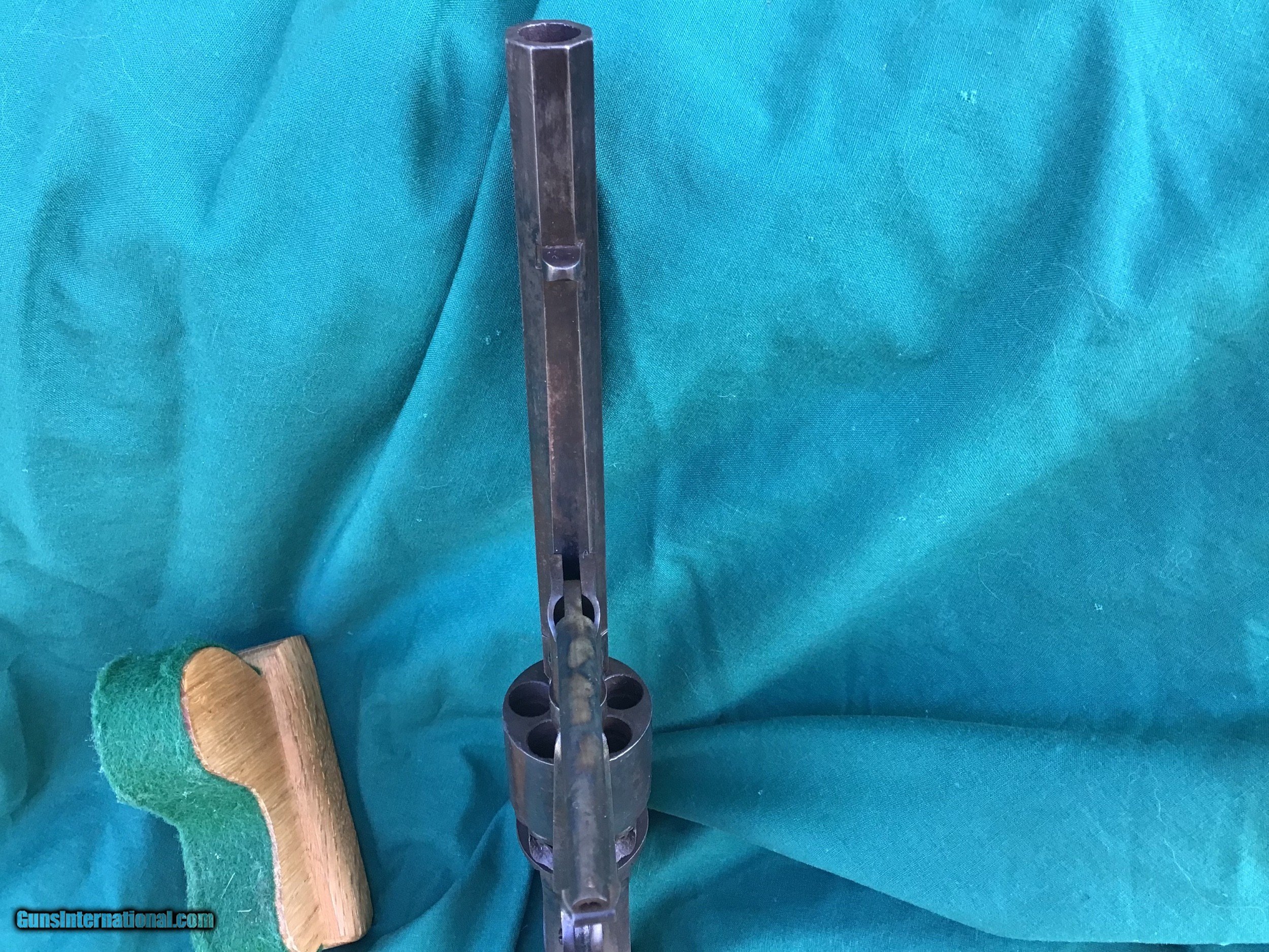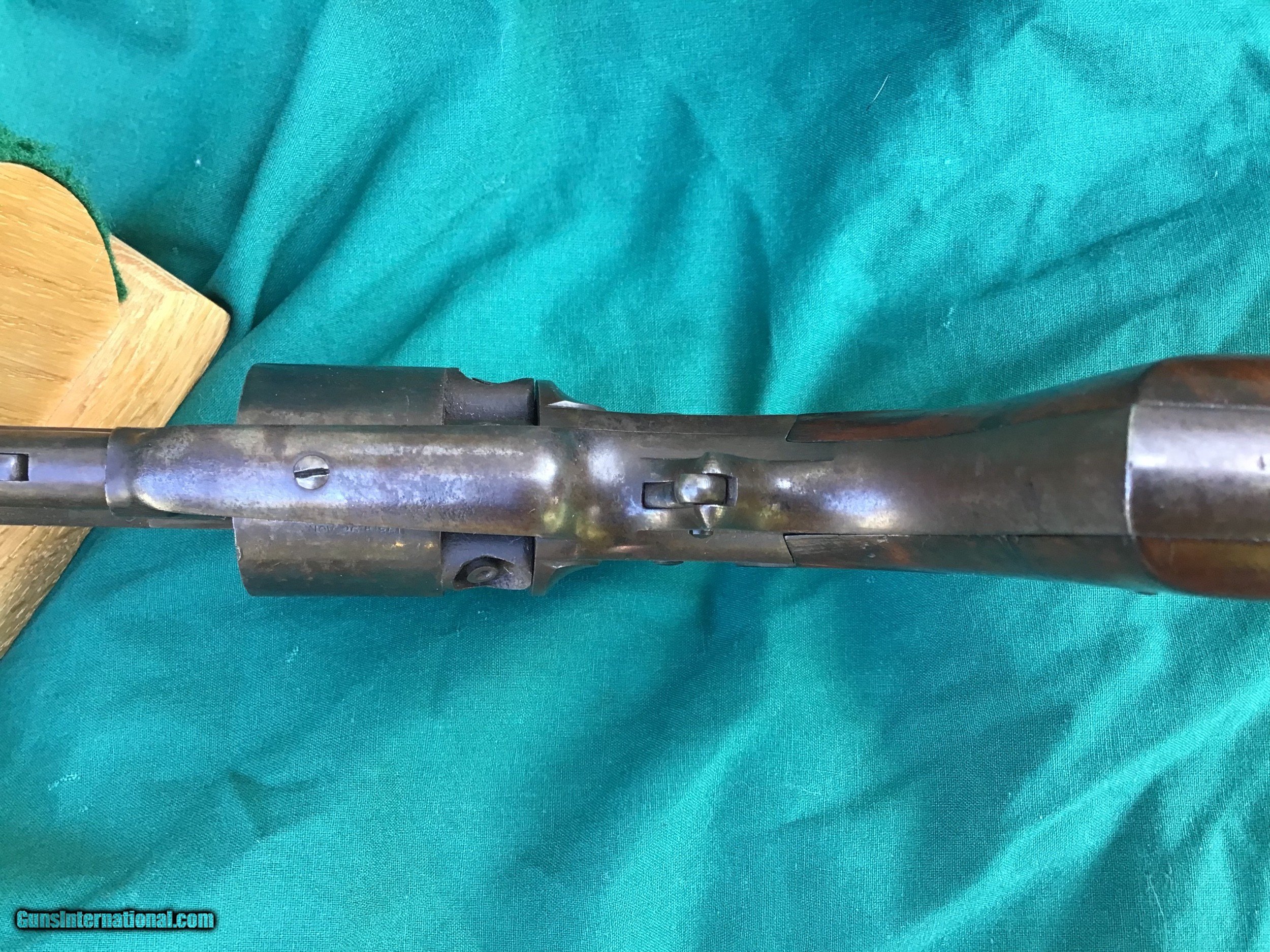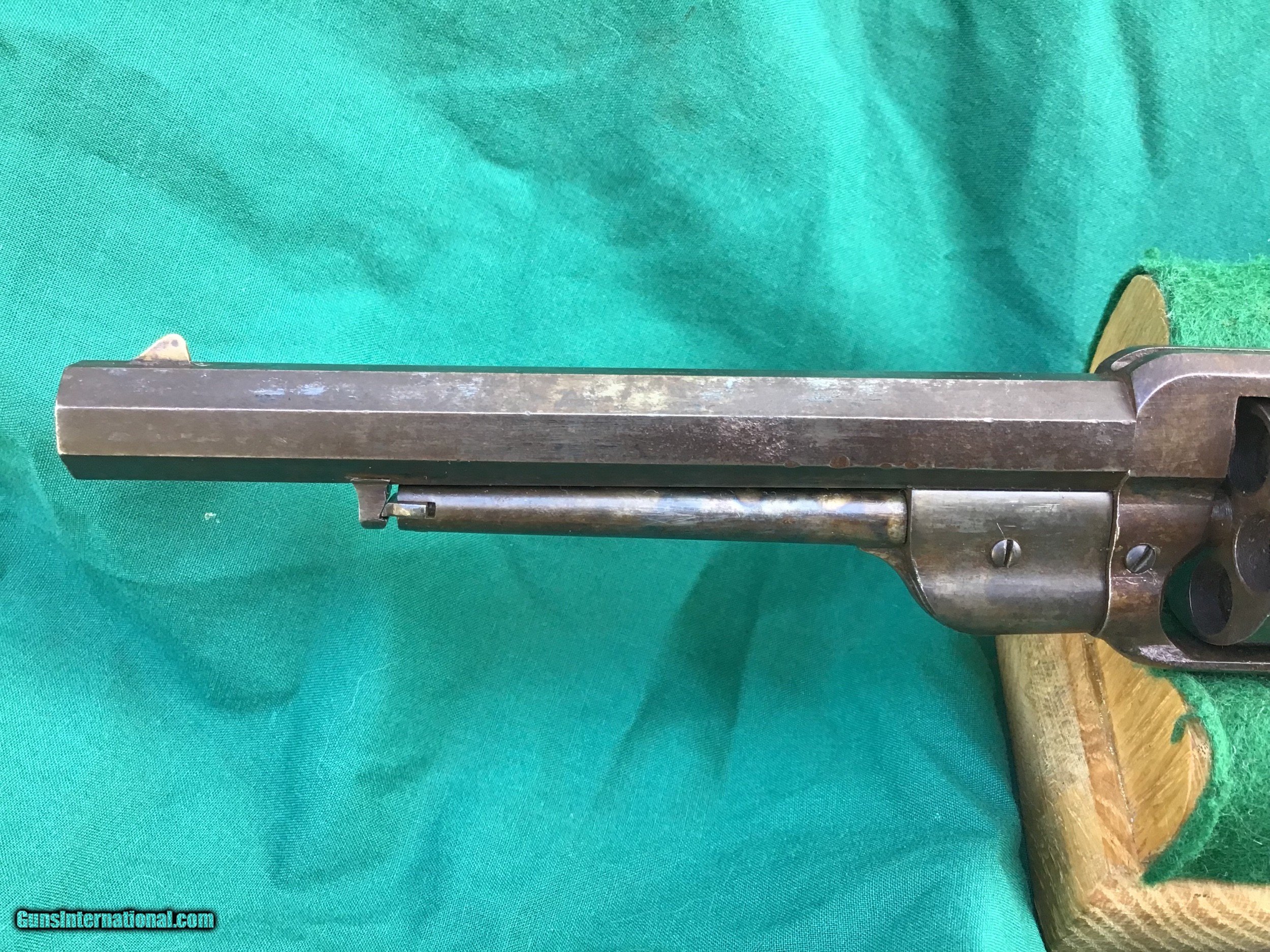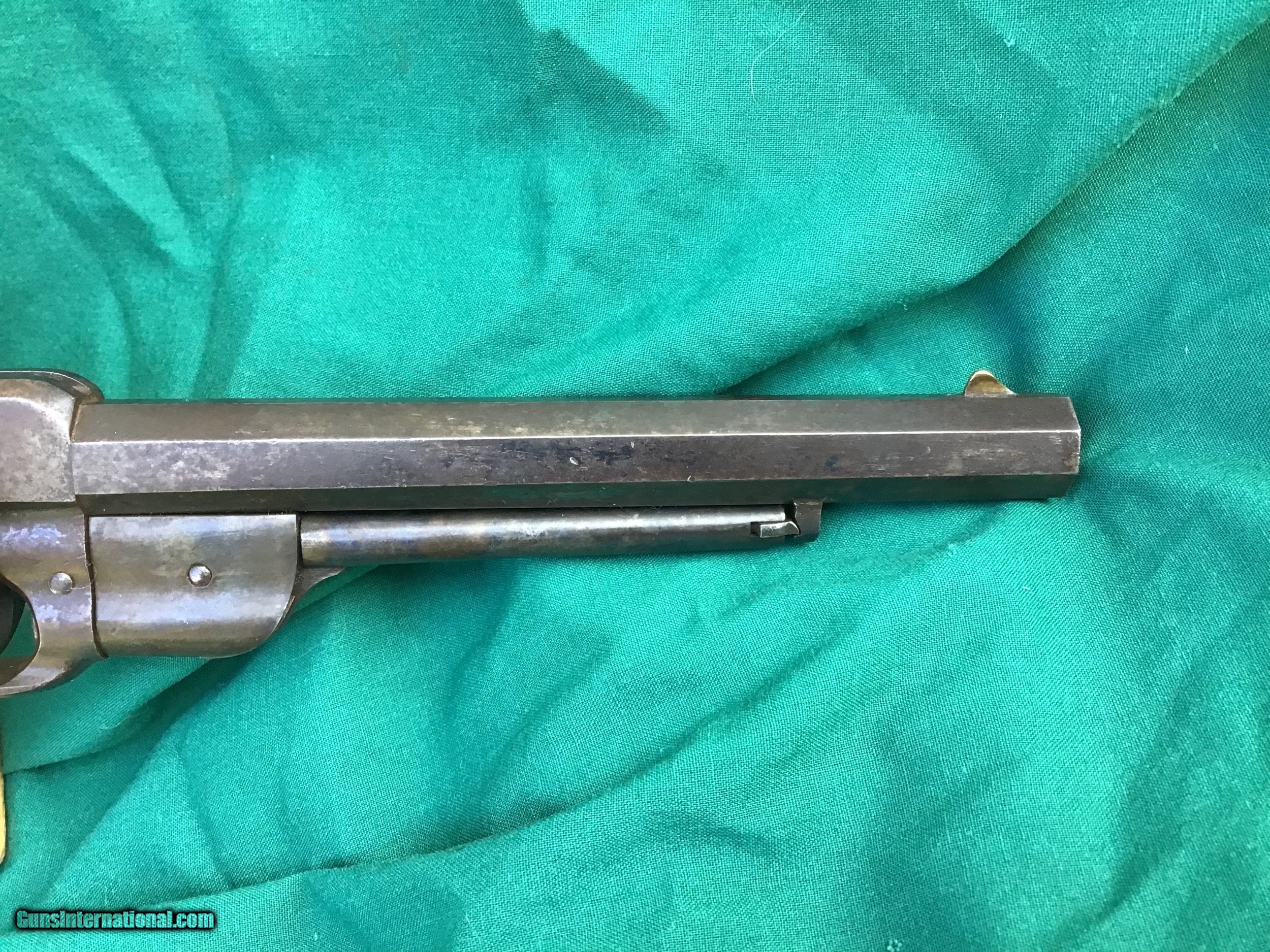 Description: Sale Pending. C.R. Alsop Navy Model Revolver. Manufactured in 1862-1863, only produced a total quantity of around 500. 36 caliber with 5 shot round cylinder. Revolver has the rare and desirable 5 1/2" octagon barrel. Serial number 401, present on frame and cylinder. Hammer and trigger mechanics work properly but the cylinder does not index. Grips are in very condition but right grip has a tiny crack (see pic). Frame has molted case colors with a very nice patina mixing in. Screws are in decent shape. Still some nice case colors present on loading lever. All markings are nice and crisp: barrel address, cylinder, left side of receiver, and serial numbers. Barrel and cylinder are still showing some nice original blue mixed in with patina. Revolver shows use but no abuse. Front sight bent slightly. This is a extremely rare and desirable Civil War Revolver that you almost never see for sale. Antique and can be shipped directly to your doorsteps. Please feel free to ask questions. SOLD Antique: Yes |