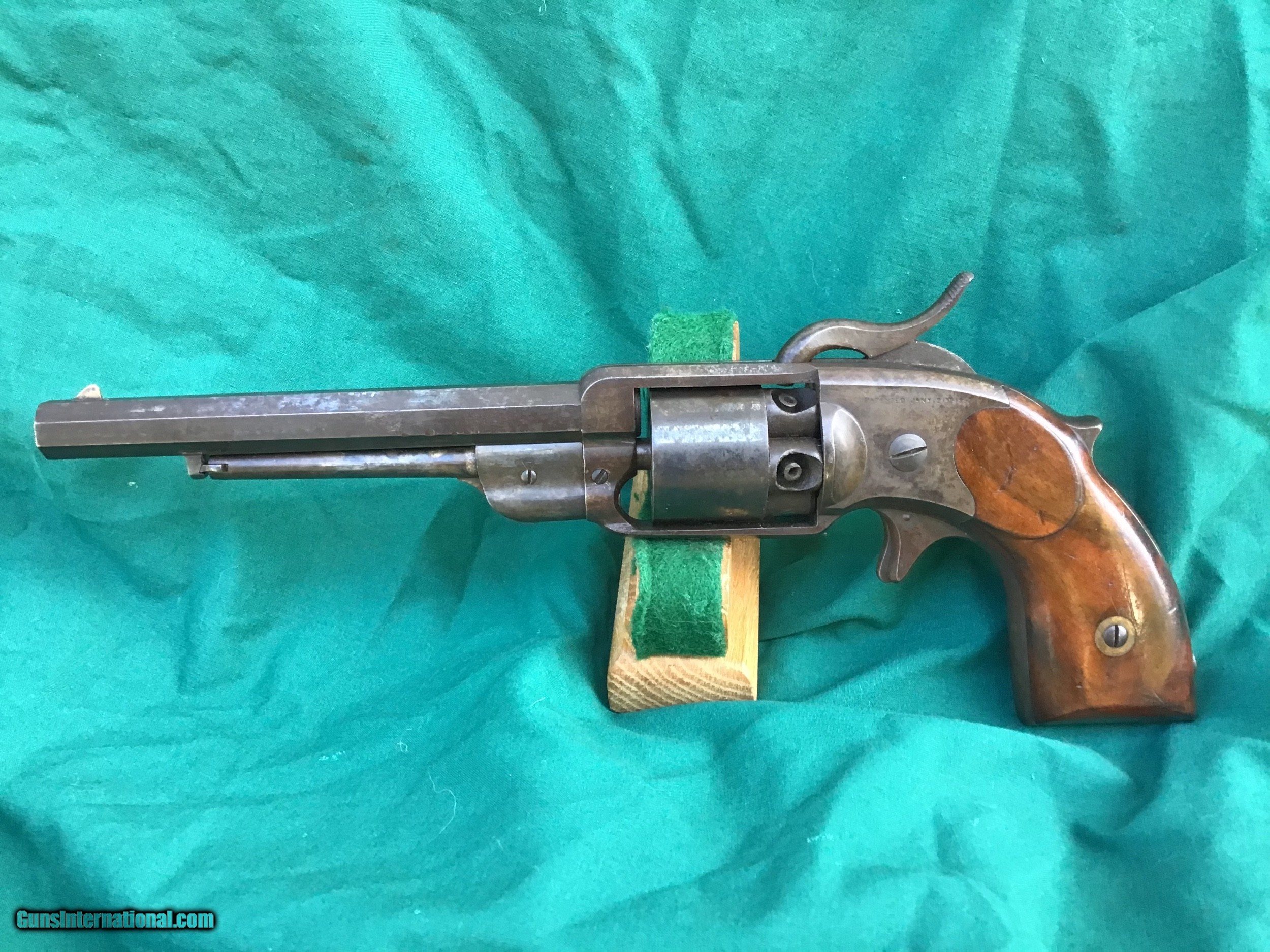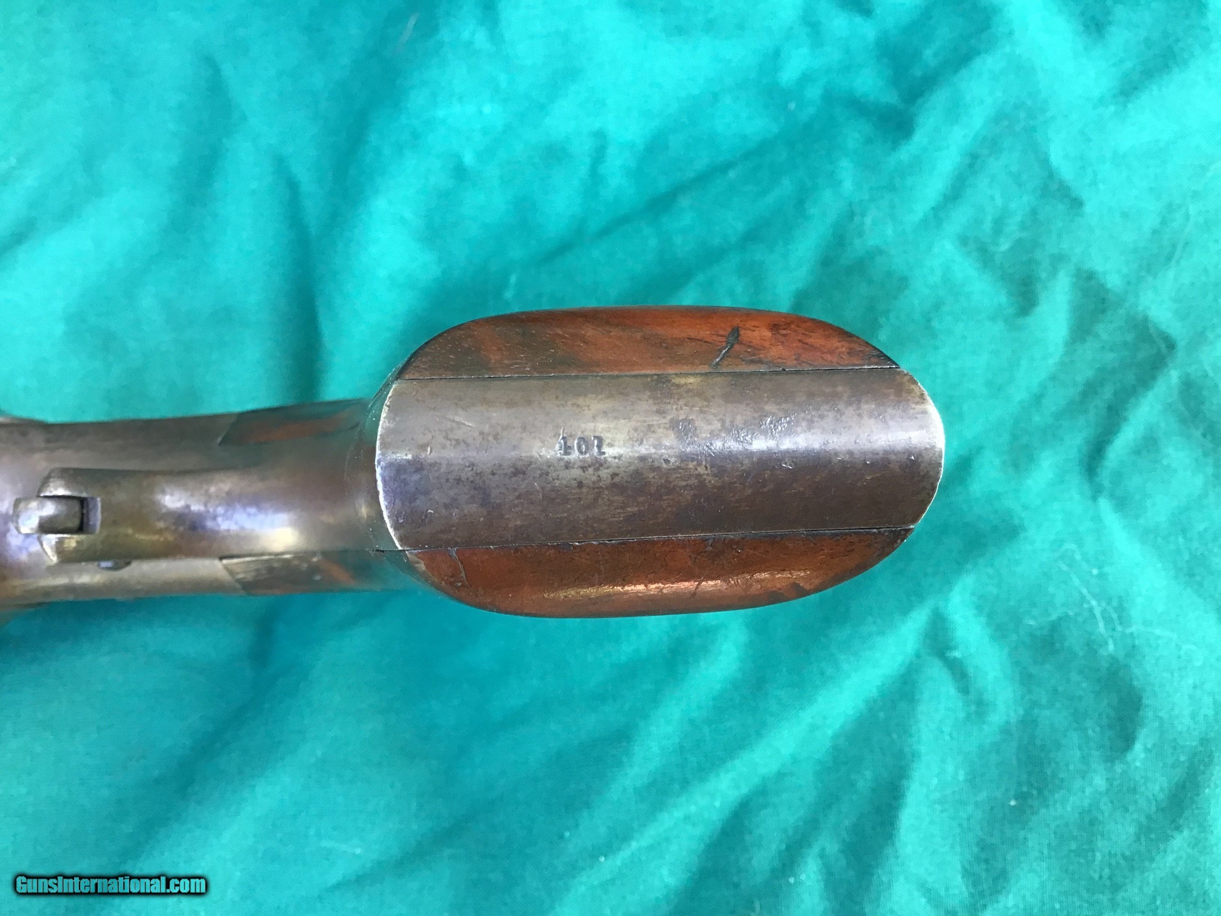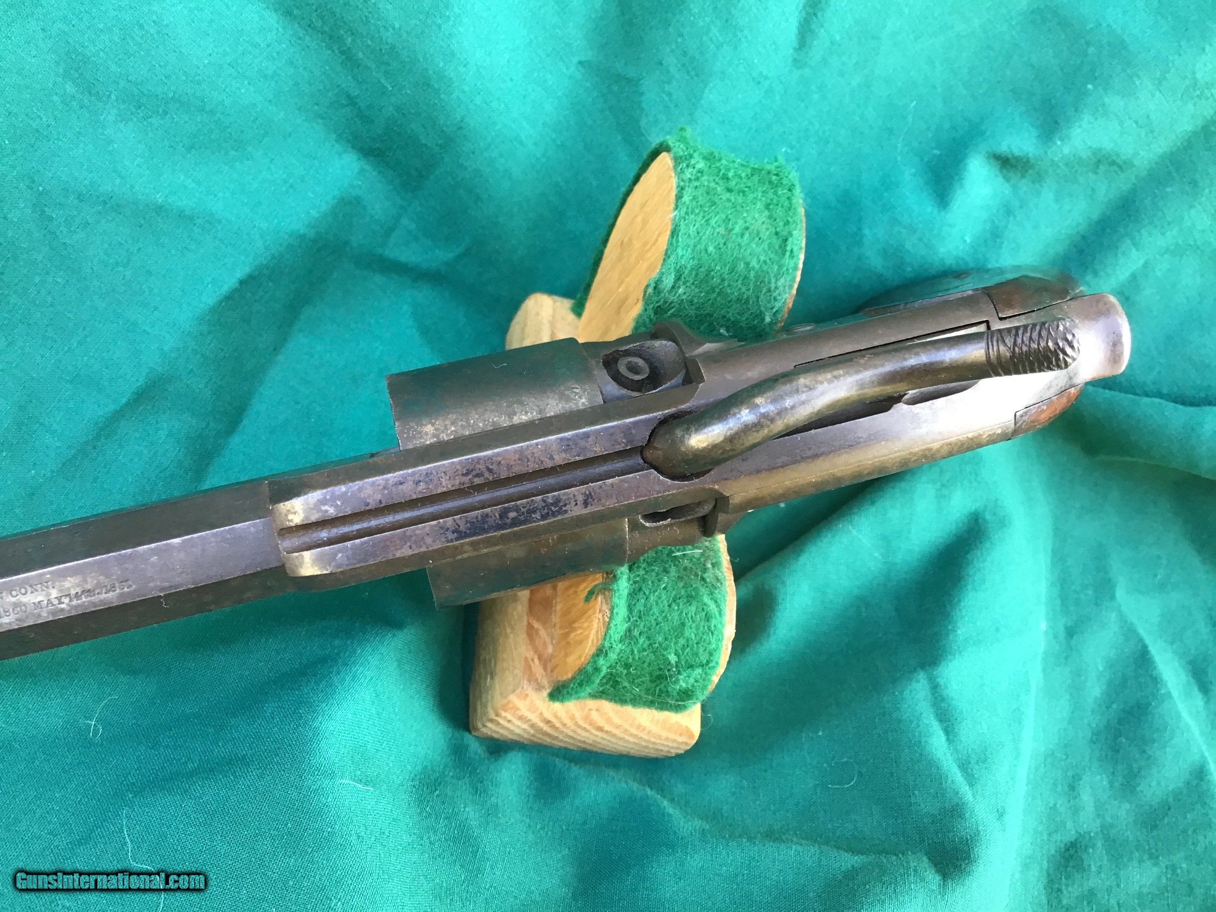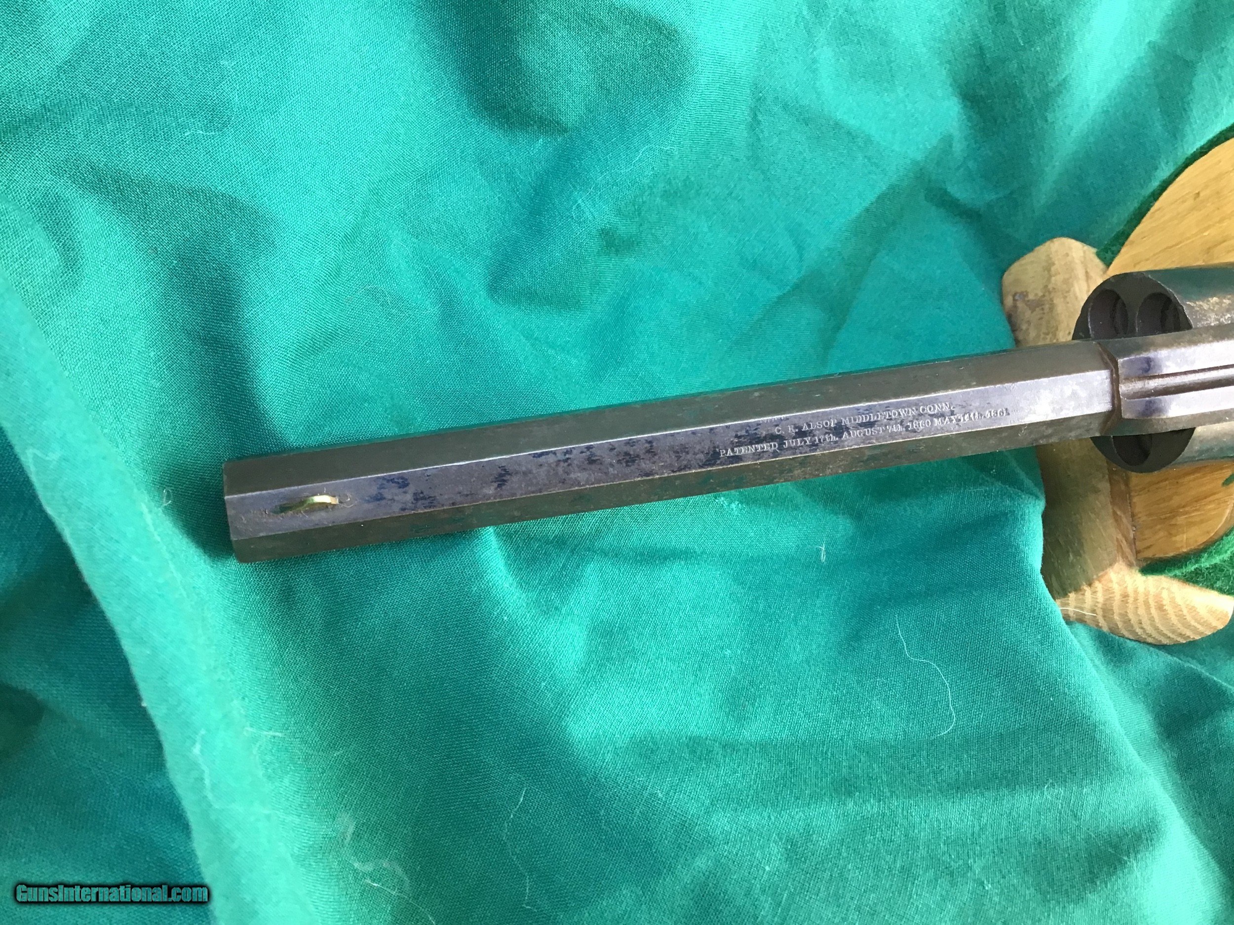 Description: Sale Pending. C.R. Alsop Navy Model Revolver. Manufactured in 1862-1863, only produced a total quantity of around 500. 36 caliber with 5 shot round cylinder. Revolver has the rare and desirable 5 1/2" octagon barrel. Serial number 401, present on frame and cylinder. Hammer and trigger mechanics work properly but the cylinder does not index. Grips are in very condition but right grip has a tiny crack (see pic). Frame has molted case colors with a very nice patina mixing in. Screws are in decent shape. Still some nice case colors present on loading lever. All markings are nice and crisp: barrel address, cylinder, left side of receiver, and serial numbers. Barrel and cylinder are still showing some nice original blue mixed in with patina. Revolver shows use but no abuse. Front sight bent slightly. This is a extremely rare and desirable Civil War Revolver that you almost never see for sale. Antique and can be shipped directly to your doorsteps. Please feel free to ask questions. SOLD Antique: Yes |