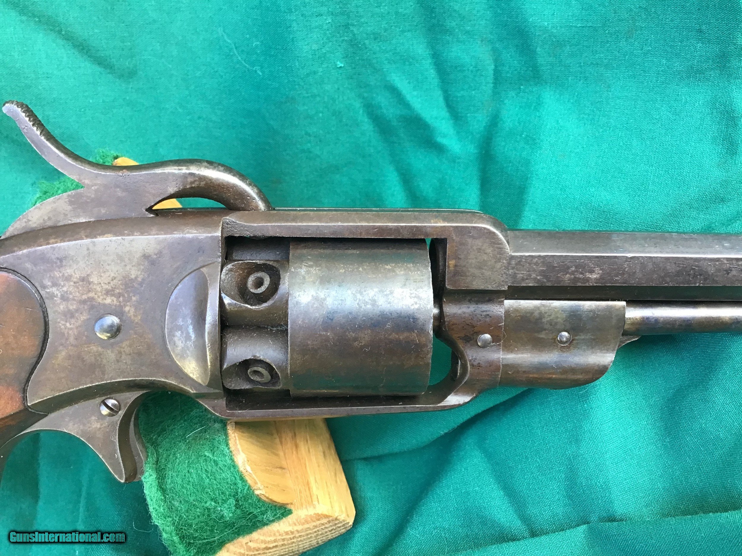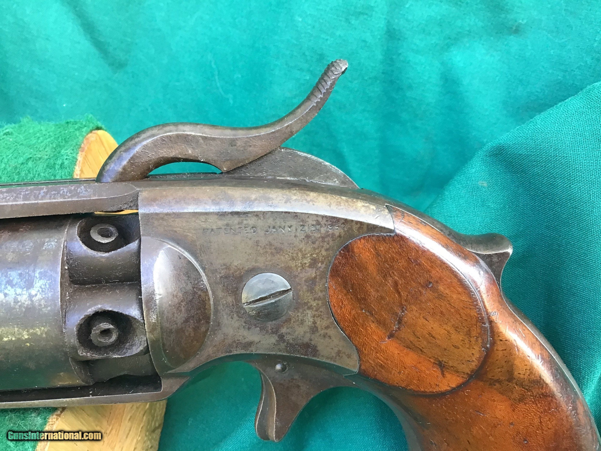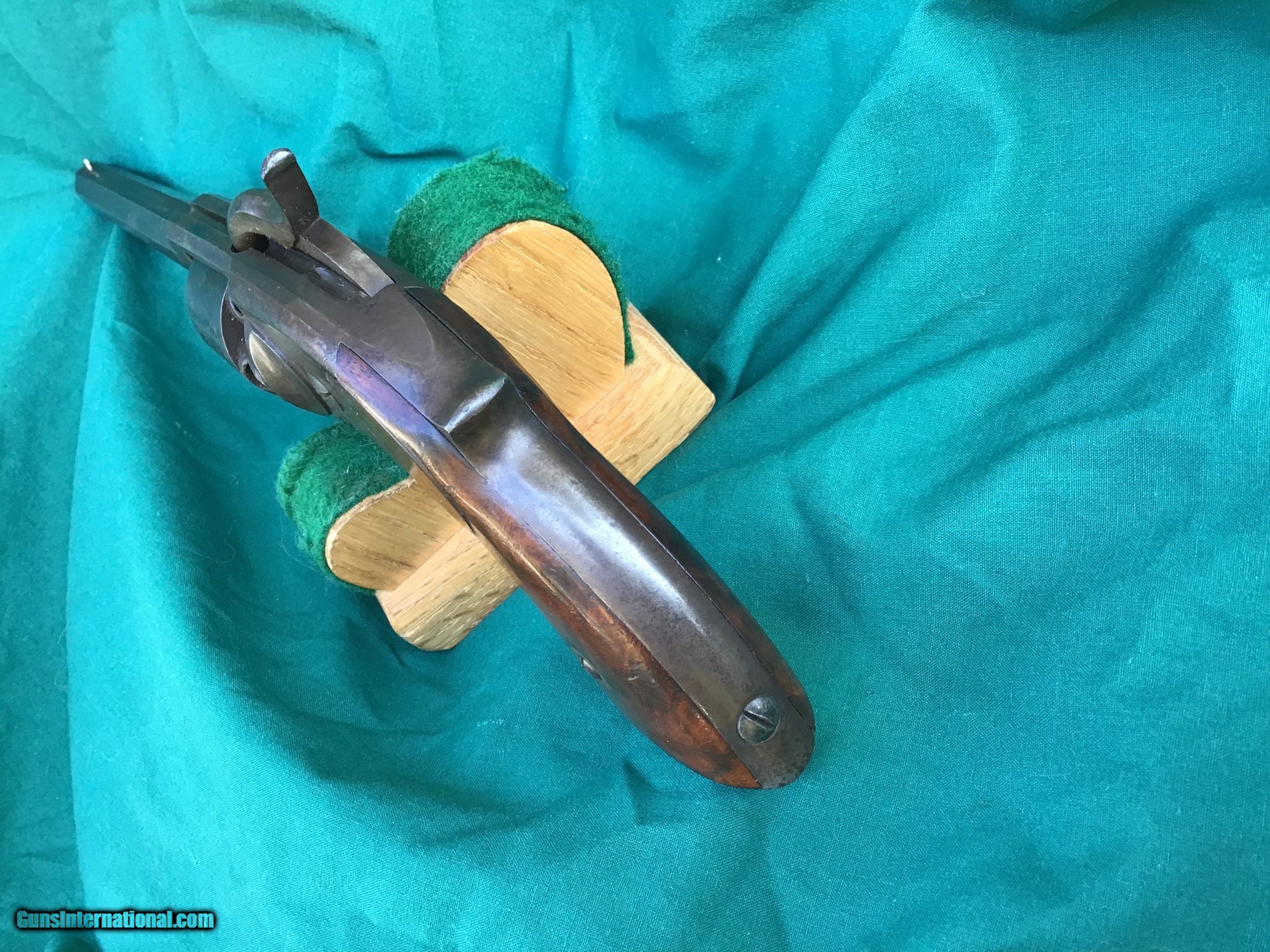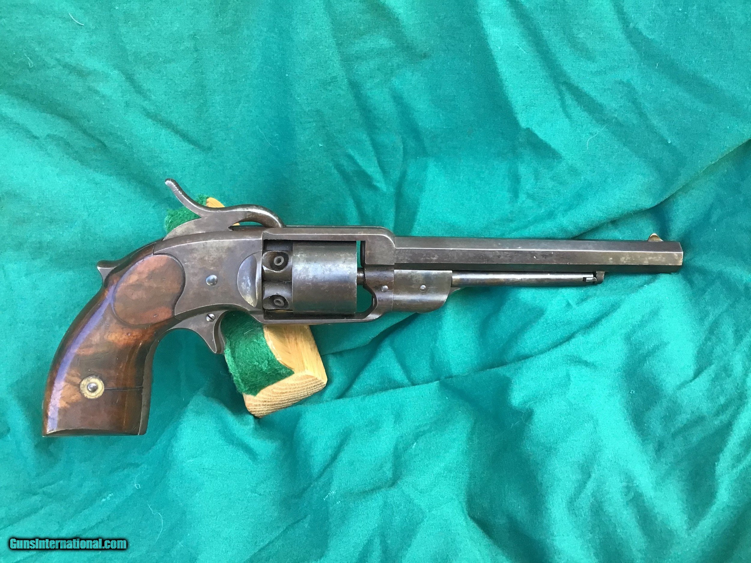 Description: Sale Pending. C.R. Alsop Navy Model Revolver. Manufactured in 1862-1863, only produced a total quantity of around 500. 36 caliber with 5 shot round cylinder. Revolver has the rare and desirable 5 1/2" octagon barrel. Serial number 401, present on frame and cylinder. Hammer and trigger mechanics work properly but the cylinder does not index. Grips are in very condition but right grip has a tiny crack (see pic). Frame has molted case colors with a very nice patina mixing in. Screws are in decent shape. Still some nice case colors present on loading lever. All markings are nice and crisp: barrel address, cylinder, left side of receiver, and serial numbers. Barrel and cylinder are still showing some nice original blue mixed in with patina. Revolver shows use but no abuse. Front sight bent slightly. This is a extremely rare and desirable Civil War Revolver that you almost never see for sale. Antique and can be shipped directly to your doorsteps. Please feel free to ask questions. SOLD Antique: Yes |