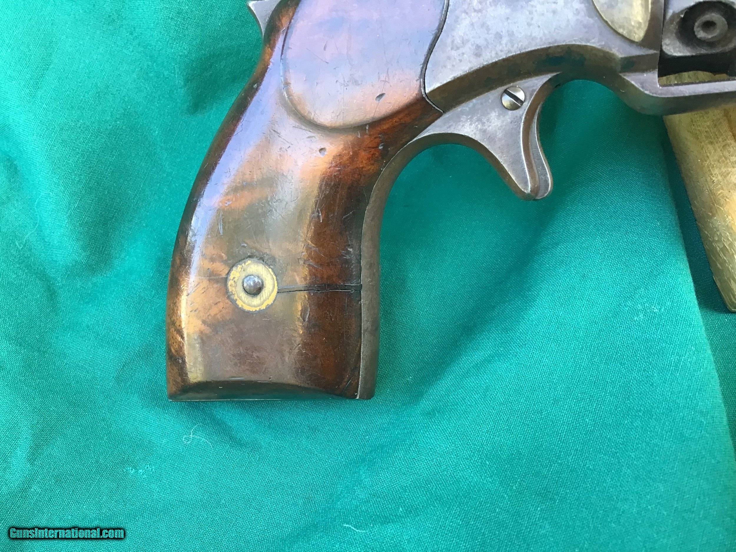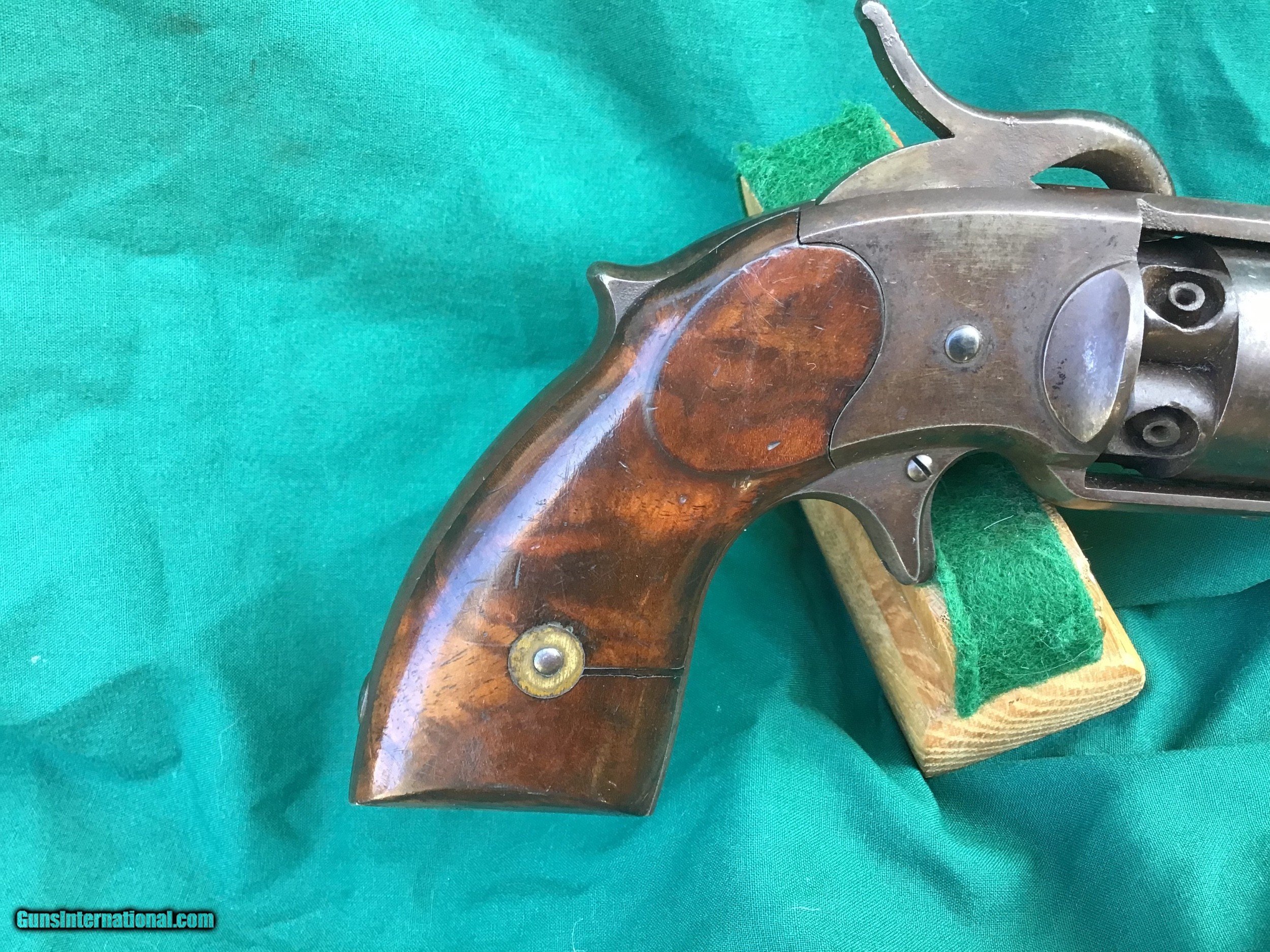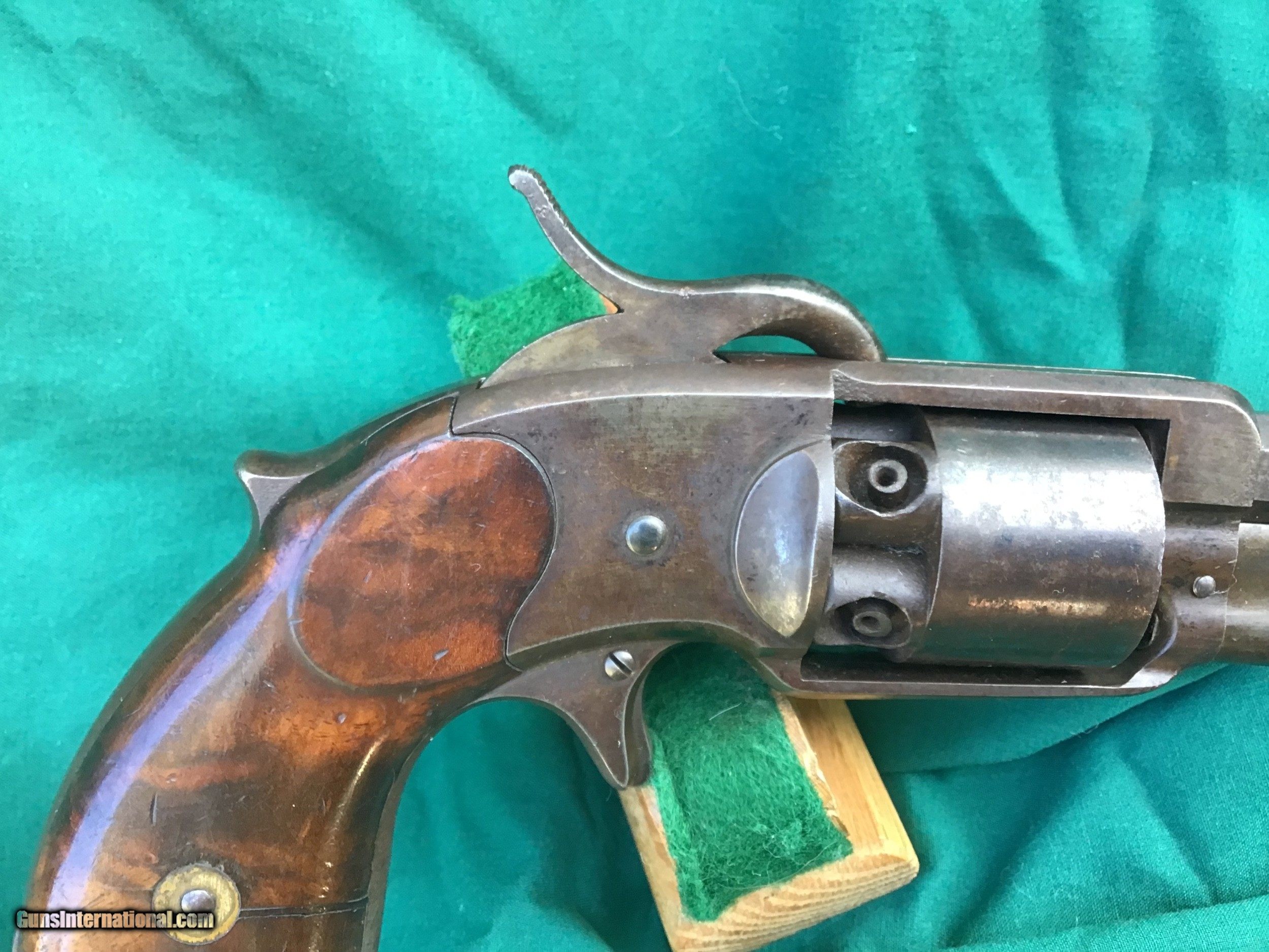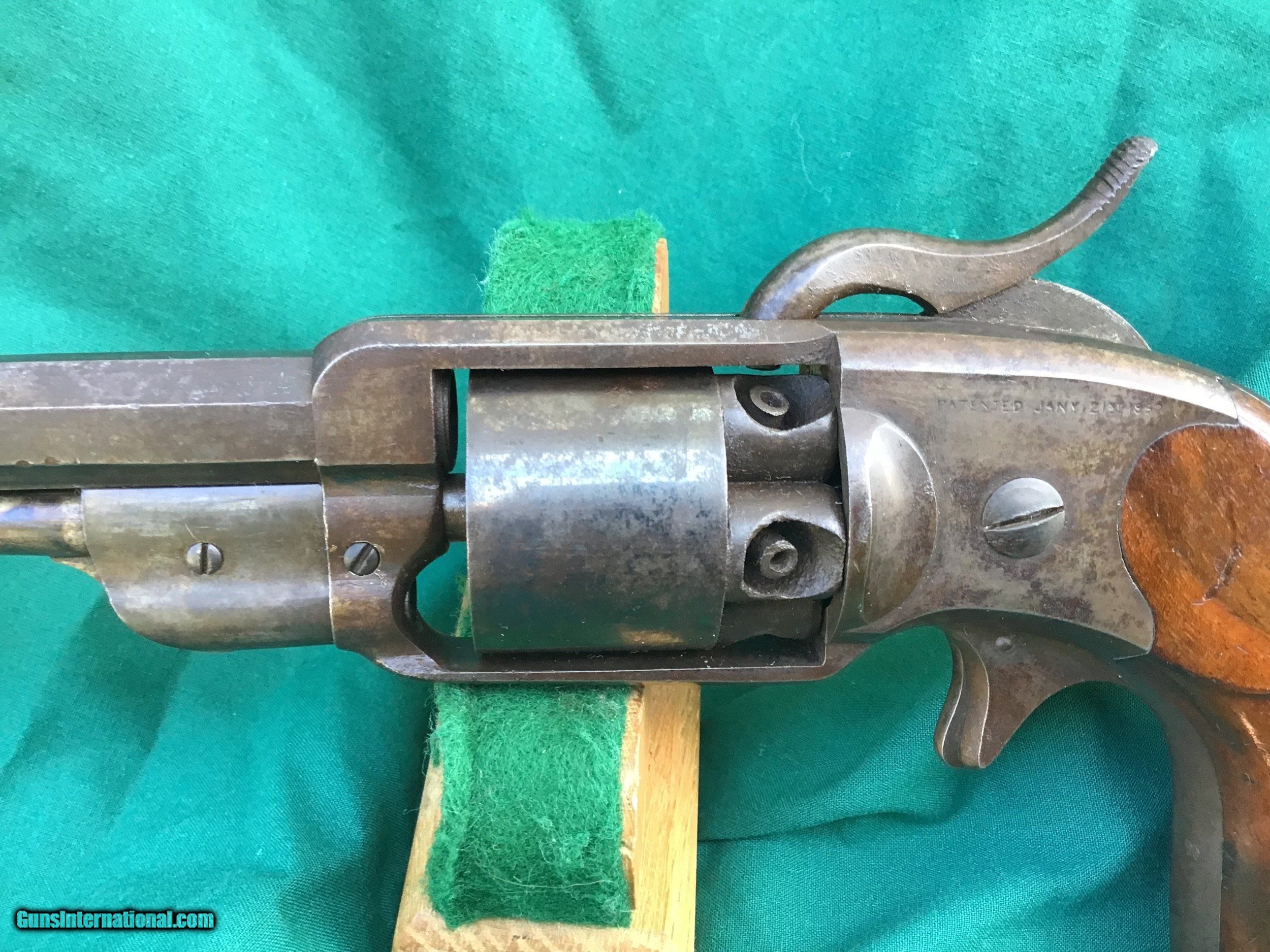Description: Sale Pending. C.R. Alsop Navy Model Revolver. Manufactured in 1862-1863, only produced a total quantity of around 500. 36 caliber with 5 shot round cylinder. Revolver has the rare and desirable 5 1/2" octagon barrel. Serial number 401, present on frame and cylinder. Hammer and trigger mechanics work properly but the cylinder does not index. Grips are in very condition but right grip has a tiny crack (see pic). Frame has molted case colors with a very nice patina mixing in. Screws are in decent shape. Still some nice case colors present on loading lever. All markings are nice and crisp: barrel address, cylinder, left side of receiver, and serial numbers. Barrel and cylinder are still showing some nice original blue mixed in with patina. Revolver shows use but no abuse. Front sight bent slightly. This is a extremely rare and desirable Civil War Revolver that you almost never see for sale. Antique and can be shipped directly to your doorsteps. Please feel free to ask questions. SOLD Antique: Yes |
