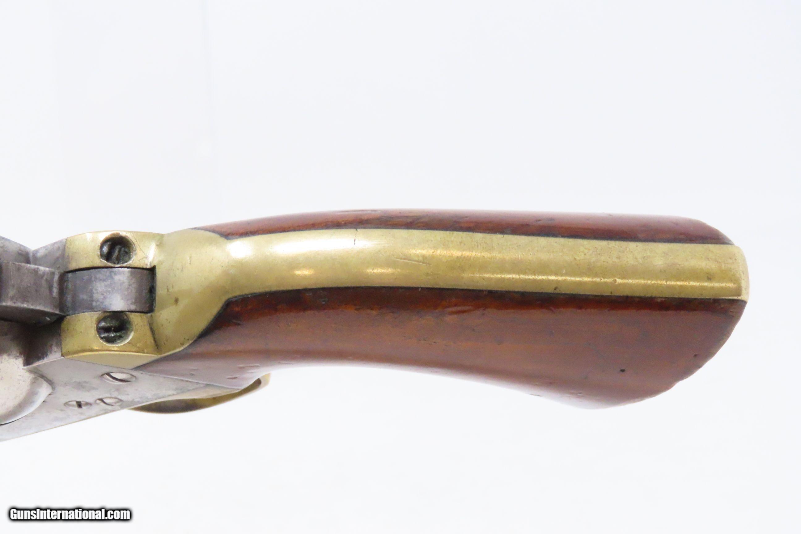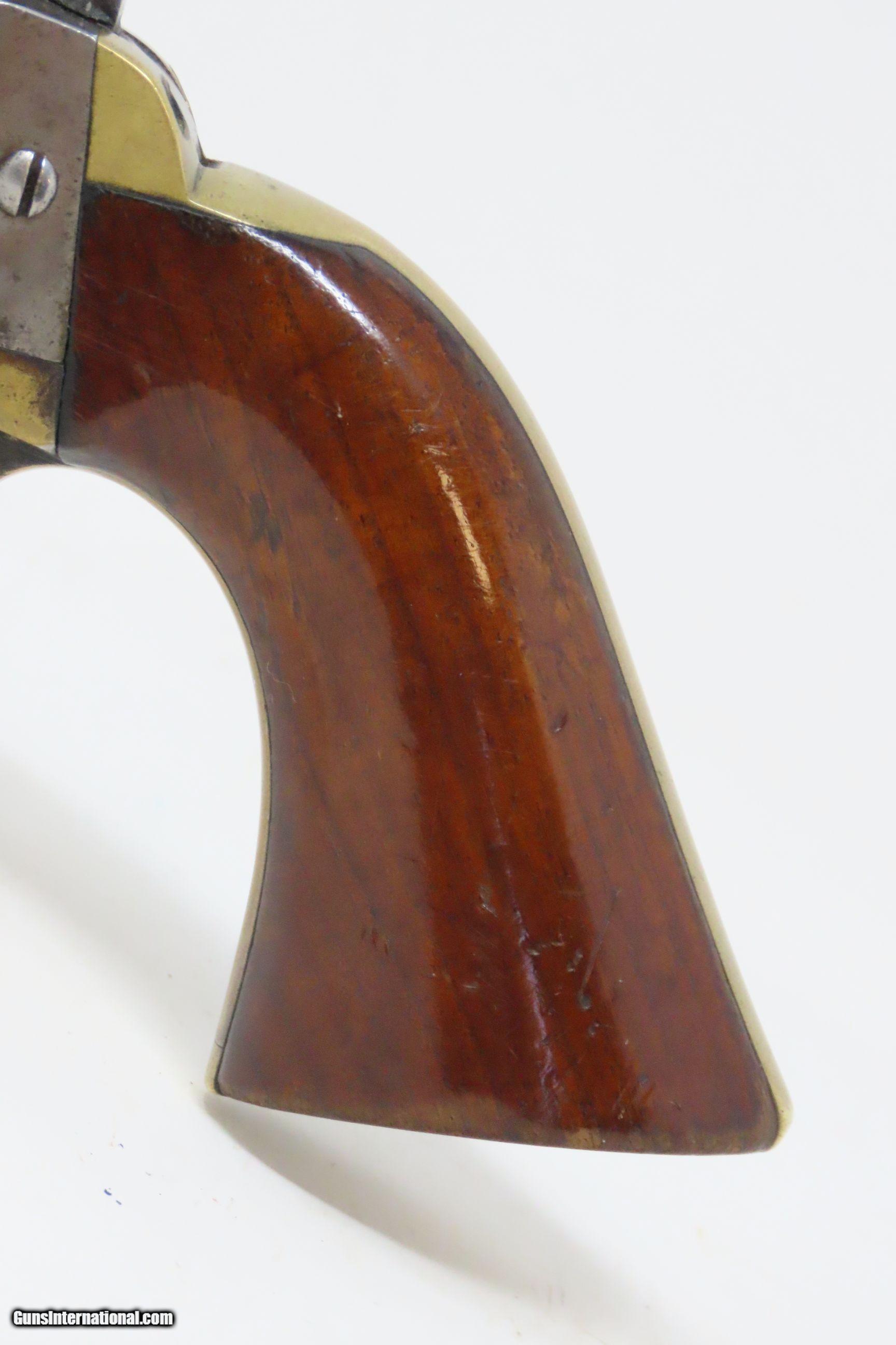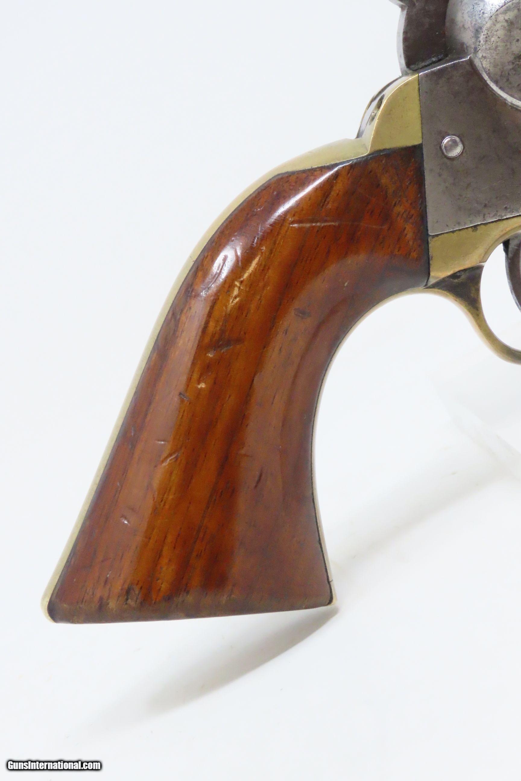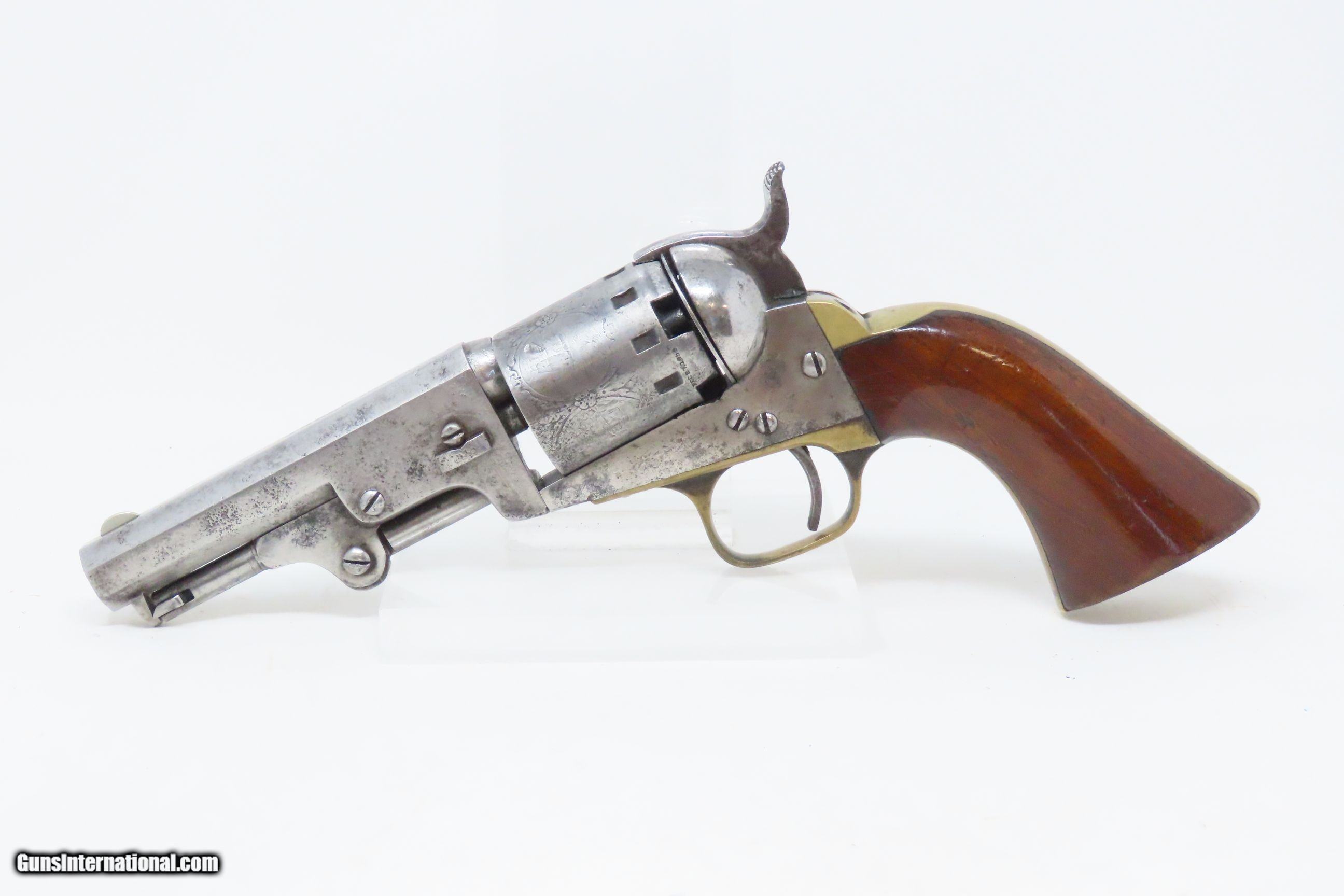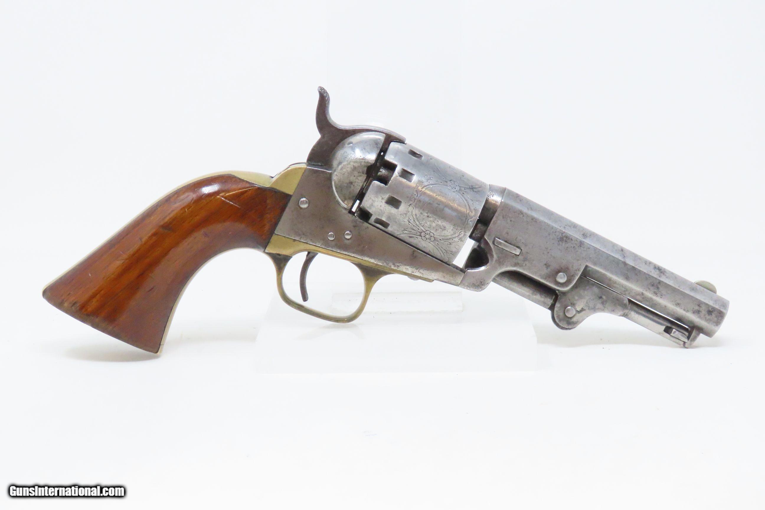 Description: c1861 MANHATTAN .36 NAVY Revolver Civil War Antique With Multi-Panel ENGRAVED CYLINDER SCENE Here we present an antique Manhattan Arms Third Series Navy Revolver, made circa late 1861 with the third series being produced between September 1861 to April 1864 in Newark, New Jersey. Serial numbers ranged between 14,500 and 45,200 in this series. Manhattan Fire Arms Co. was founded in 1856 specifically to capitalize on the soon to be expiring Colt patents in 1857. This strategy worked very well for the company and they began by making high quality and very close copies of both Colts and other popular pistols with expired patents. These revolvers greatly resemble the Colt Model 1849 Pocket and 1851 Navy revolvers. In fact, Manhattan’s copies of Colts were so close that Colt tried to kill their production with a lawsuit, even though their patent had expired. There were roughly 80,000 total revolvers made throughout the production run of Series One through Series Five. Series I through Series IV were all five-shot revolvers while the Series V (with its tapered loading lever) was of six-shot. All were, however, chambered for the .36 ball cartridge. Manhattan’s revolvers were very well received by the public. The company never received U.S. military contracts, except for a small delivery, most likely on the regimental level. Nevertheless, many Manhattan revolvers found themselves on smoky Civil War battlefields, purchased privately by officers and soldiers, and they were certainly in use at home. The war created a vast and unquenchable market for firearms of all types. The overall condition is very good. The action is excellent. The bore is in good condition: patinated with good rifling. The grips have their original finish and remain in good condition. Numbers match. Own the original! This is a legitimate antique and not a reproduction. Barrel is 4 inches. Caliber: .36 Percussion Overall condition as seen in photos. Very Fast. Very Safe. FREE SHIPPING WORLDWIDE. Delivered directly to your door by express mail! Guaranteed AUTHENTIC & Includes CERTIFICATE OF AUTHENTICITY. ancestryguns $1800 #230919 SOLD Antique: Yes |