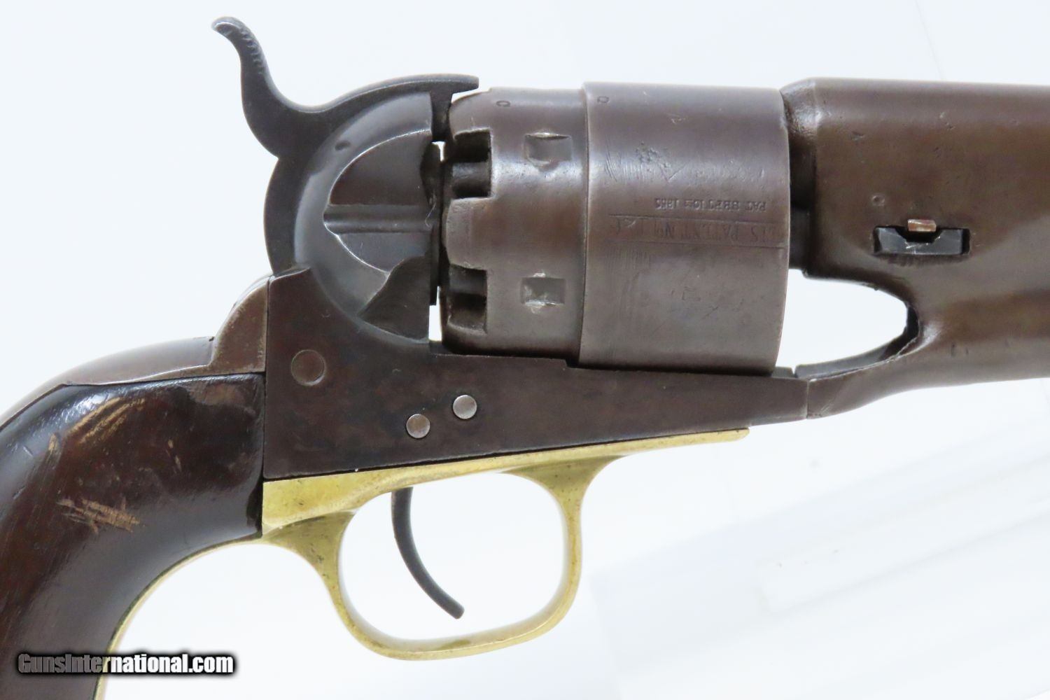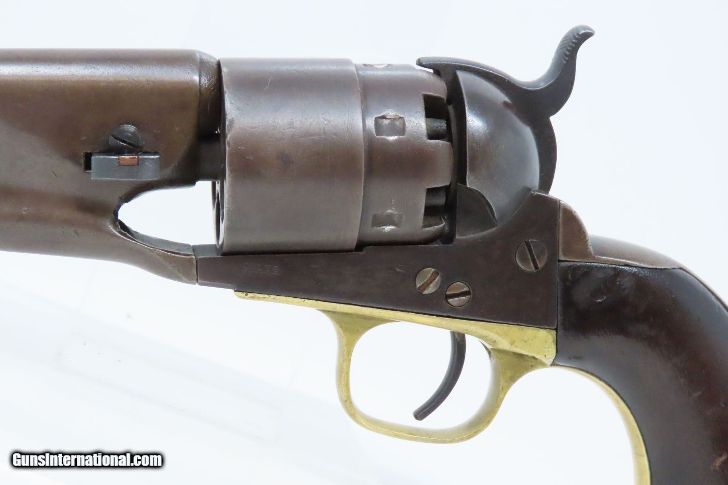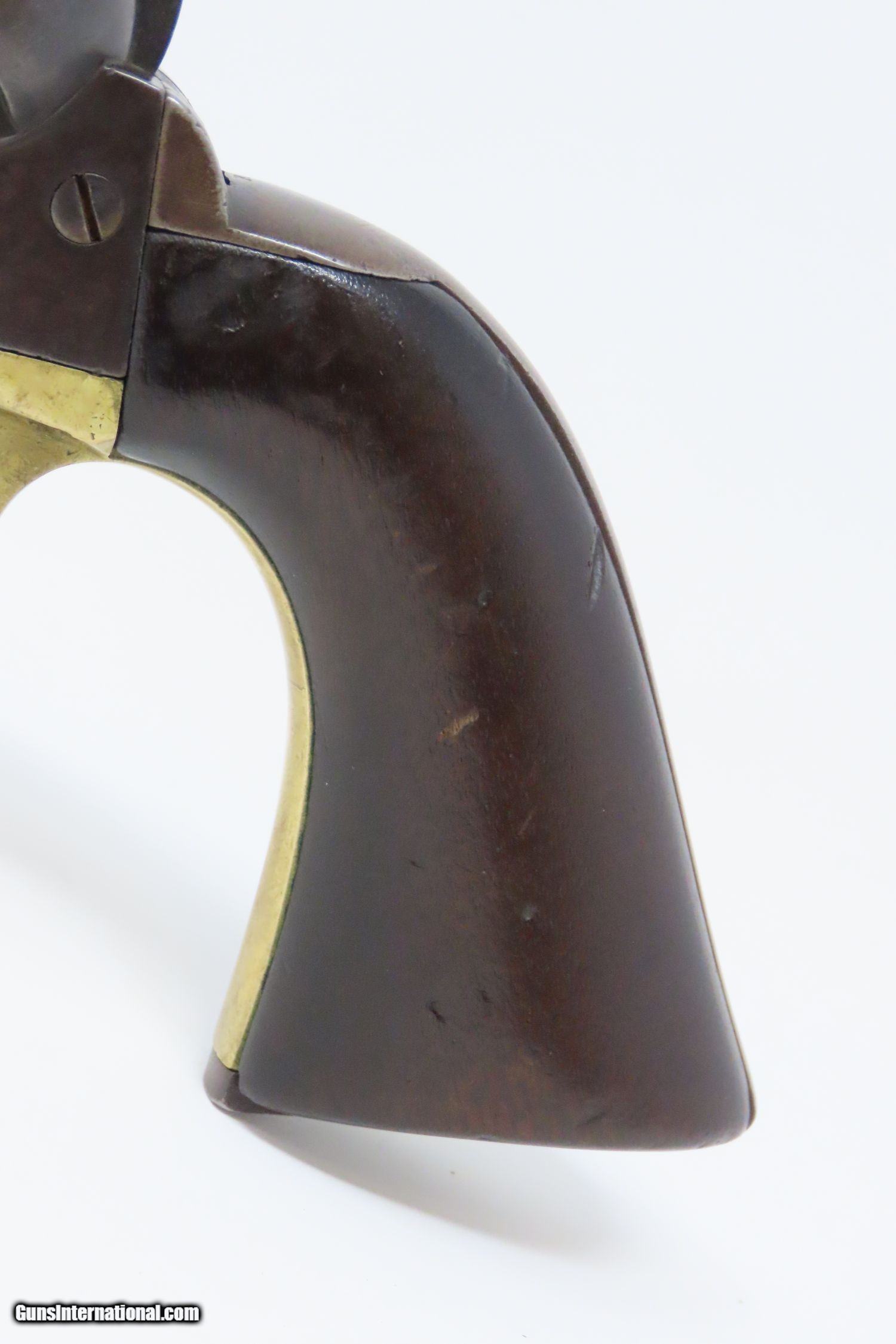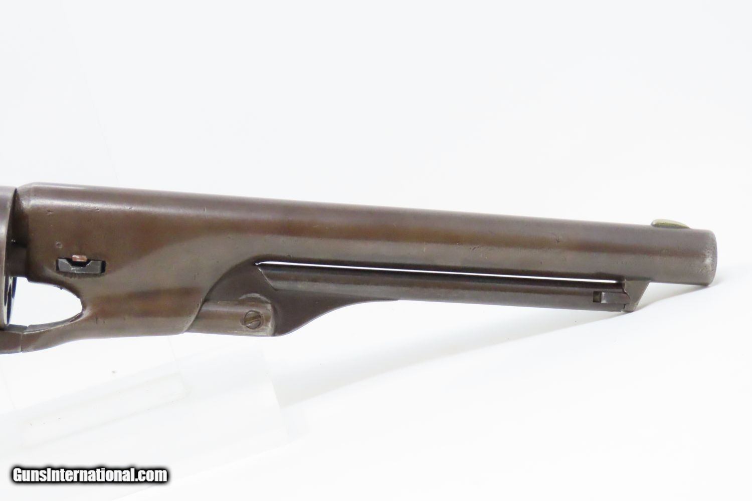 Description: c1862 CIVIL WAR Antique COLT Model 1860 ARMY 44 Caliber Percussion REVOLVER Iconic Union Cavalry & Officer Revolver! Here we present an antique Colt U.S. Model 1860 Army Percussion Revolver, made in 1862 in Hartford, Connecticut. The 1860 Army was the single most used pistol of the American Civil War. Over 200,000 were made from 1860 to 1873, and 156,000 of those were made by the end of the war in 1865. These were excellent sidearms for officers, cavalry, infantry, and artillery troops. The 1860 Army was Samuel Colt’s finest achievement to that point, having finally developed a large caliber revolver that weighed about 2 lbs. 10 oz. to the famous Dragoon’s 4 lbs. 4 oz., and was adopted en masse by the U.S. government with huge contracts. The revolver was well balanced in hand and had a long enough barrel to be effective when utilized as a carbine with the attachable shoulder stock. This revolver represented unprecedented firepower from a handgun in the field at the time and was especially suited to Cavalry. The Confederacy, lacking in manufacturing capabilities though they were, managed to produce limited numbers of copies, and battlefield pickups of the 1860 Army were highly coveted. The 1860 Army went on to serve the U.S. military even after the Civil War and into the Indian Wars, until production of Colt’s 1873 Single Action Army created new waves in the revolver market, and again achieved great success in the military and commercial markets. The overall condition is very good. This one wears a blue refinish. The action is strong and tight. Nice bore with good rifling. Numbers match. The wedge is a replacement. The walnut grip is in good shape and a bit of filler can be seen on either side of the grip strap where there used to be a lanyard loop that was added at some point. A really neat piece of Civil War and firearms history! Own the original! This is a legitimate antique and not a reproduction. Barrel is 8 inches. Caliber: .44 Percussion Overall condition as seen in photos. Very Fast. Very Safe. FREE SHIPPING WORLDWIDE. Delivered directly to your door by express mail! Guaranteed AUTHENTIC & Includes CERTIFICATE OF AUTHENTICITY. ancestryguns $2585 #210810 SOLD Antique: Yes |
