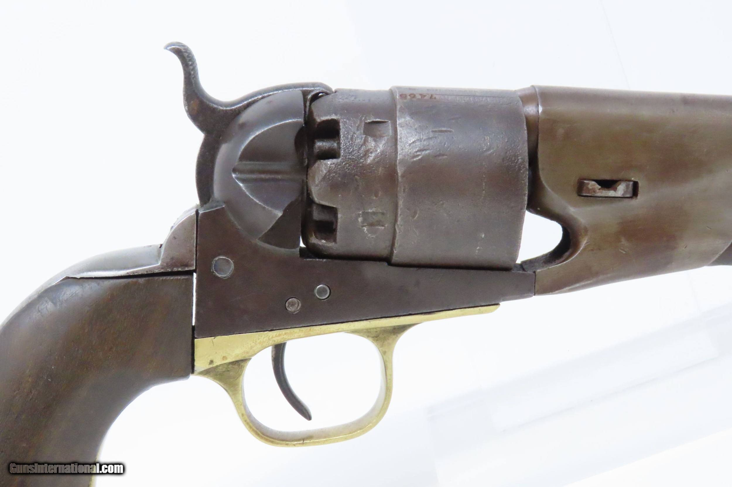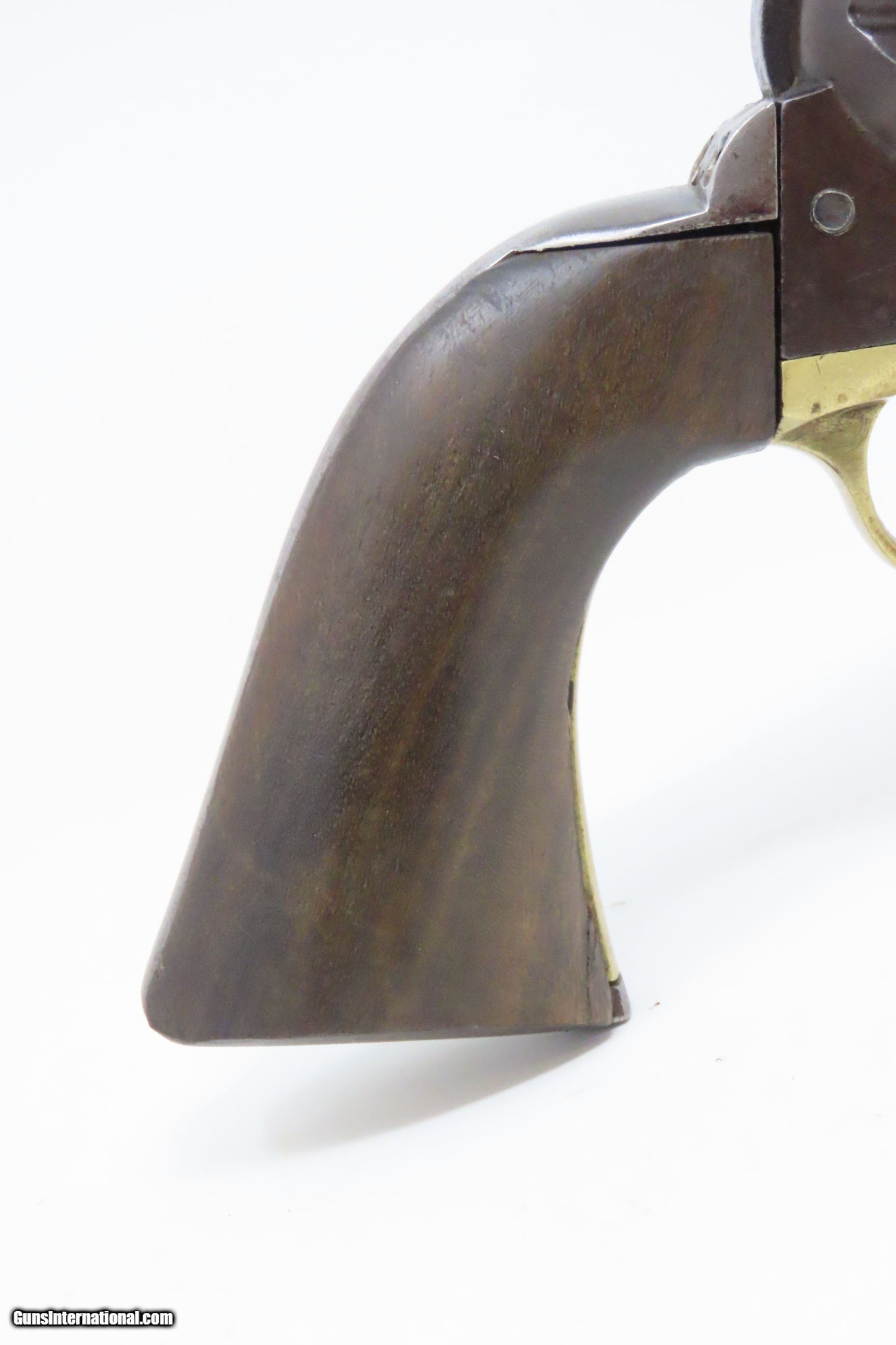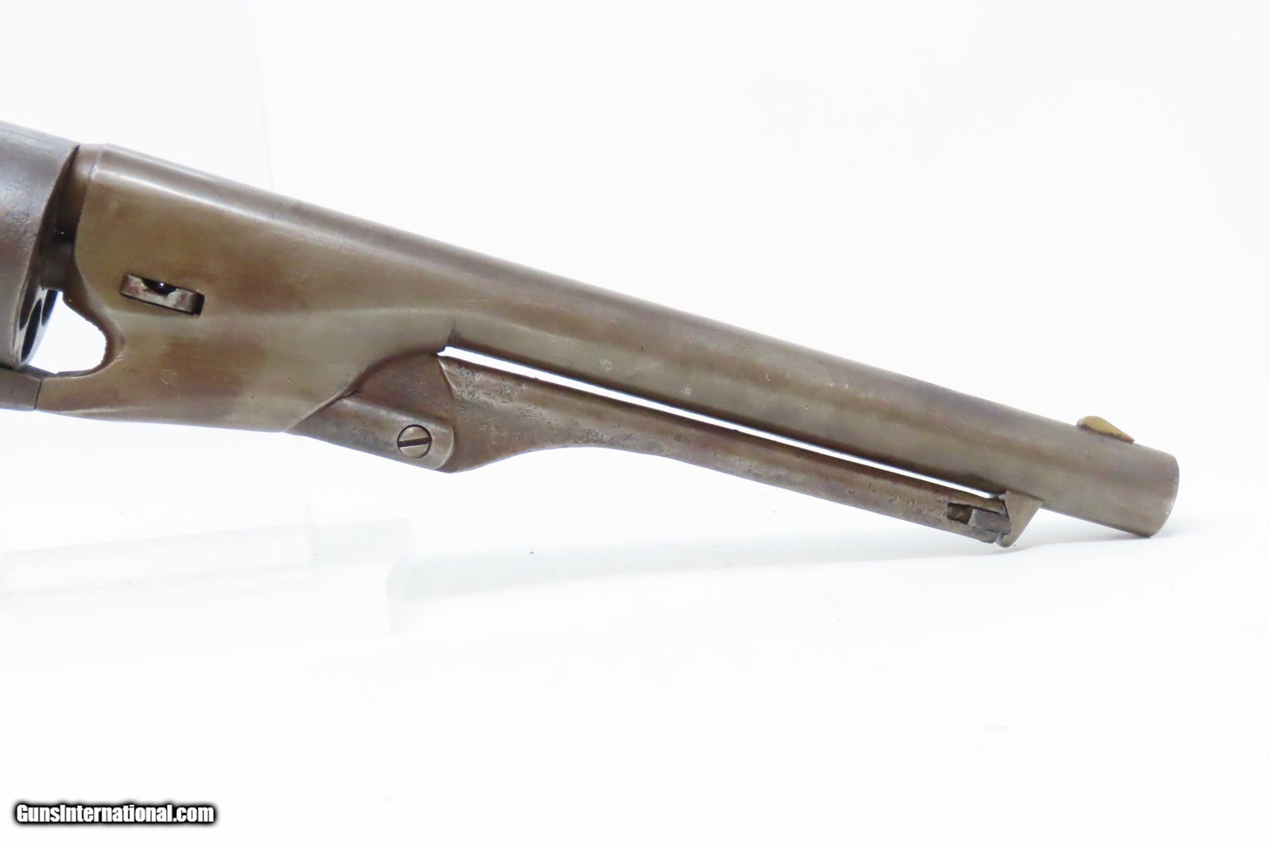 Description: c1863 CIVIL WAR COLT U.S. Model 1860 ARMY .44 Caliber Percussion REVOLVER Iconic Sidearm of the Union Cavalry Here we present an antique Colt U.S. Model 1860 Army Percussion Revolver, made in 1863 in Hartford, Connecticut. The 1860 Army was the single most used pistol of the American Civil War. Over 200,000 were made from 1860 to 1873, and 156,000 of those were made by the end of the war in 1865. These were excellent sidearms for officers, cavalry, infantry, and artillery troops. The 1860 Army was Samuel Colt’s finest achievement to that point, having finally developed a large caliber revolver that weighed about 2 lbs. 10 oz. to the famous Dragoon’s 4 lbs. 4 oz., and was adopted en masse by the U.S. government with huge contracts. The revolver was well balanced in hand and had a long enough barrel to be effective when utilized as a carbine with the attachable shoulder stock. This revolver represented unprecedented firepower from a handgun in the field at the time and was especially suited to Cavalry. The Confederacy, lacking in manufacturing capabilities though they were, managed to produce limited numbers of copies, and battlefield pickups of the 1860 Army were highly coveted. The 1860 Army went on to serve the U.S. military even after the Civil War and into the Indian Wars, until production of Colt’s 1873 Single Action Army created new waves in the revolver market, and again achieved great success in the military and commercial markets. Strong action. The barrel is a reproduction replacement. Bore is reflective with nice rifling. The rammer has very little range of motion. The numbers have been force-matched on the barrel and attempted on the cylinder (although the last two numbers were inverted). Grip is a solid replacement. Barrel is 8 inches. Caliber: .44 Percussion Overall condition as seen in photos. Very Fast. Very Safe. FREE SHIPPING WORLDWIDE. Delivered directly to your door by express mail! ancestryguns $1800 #217786 SOLD Antique: Yes |