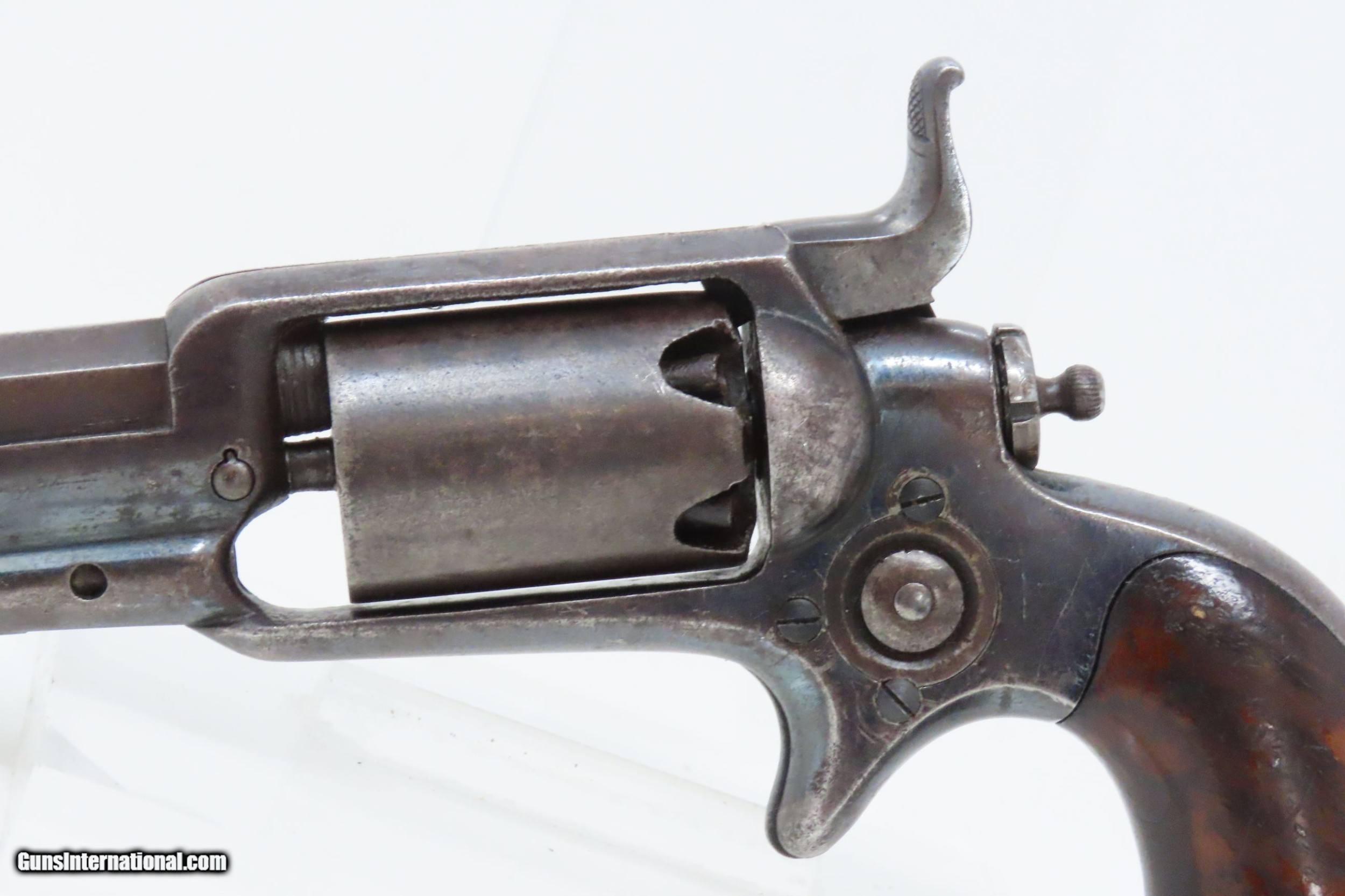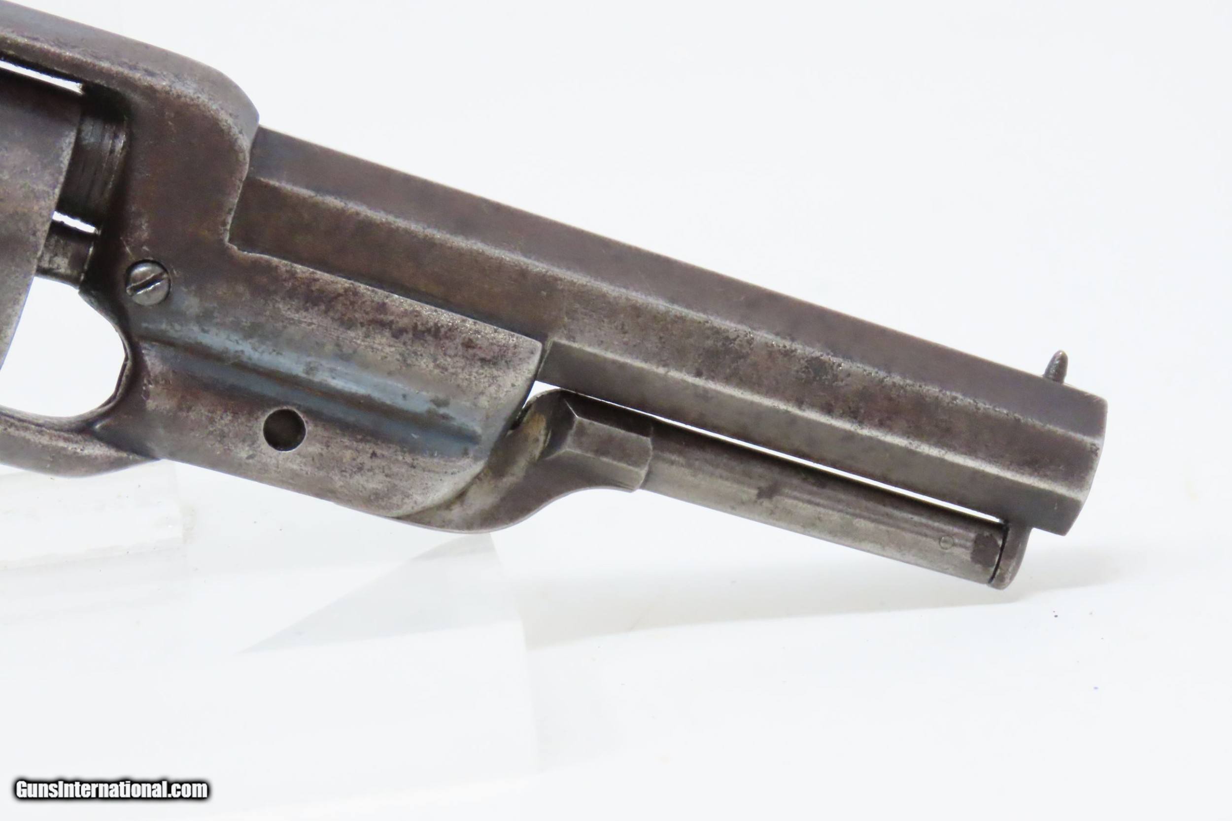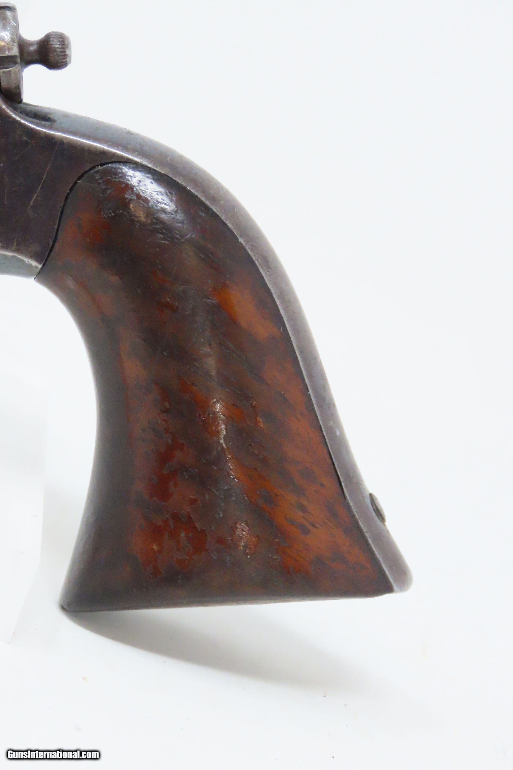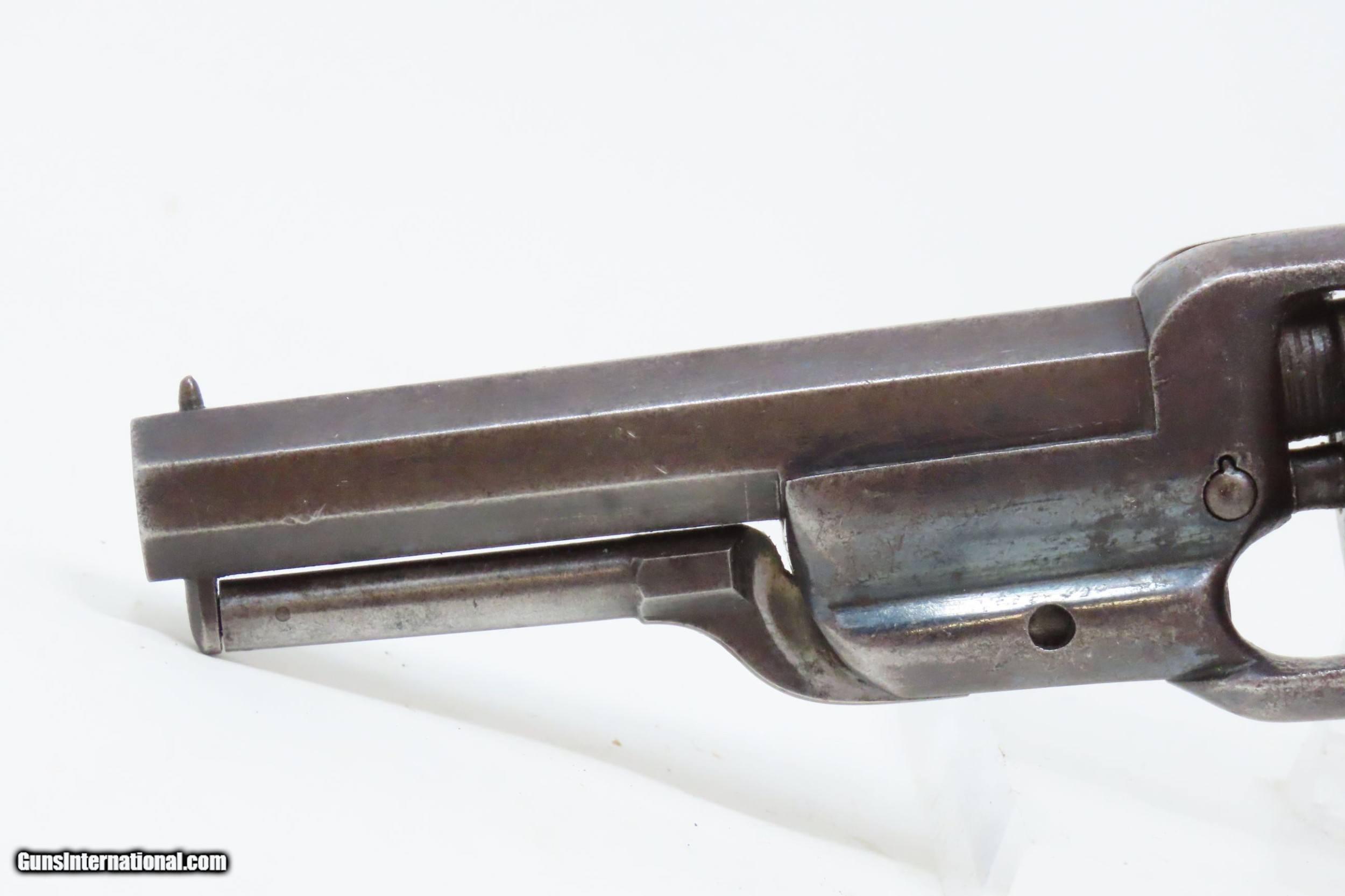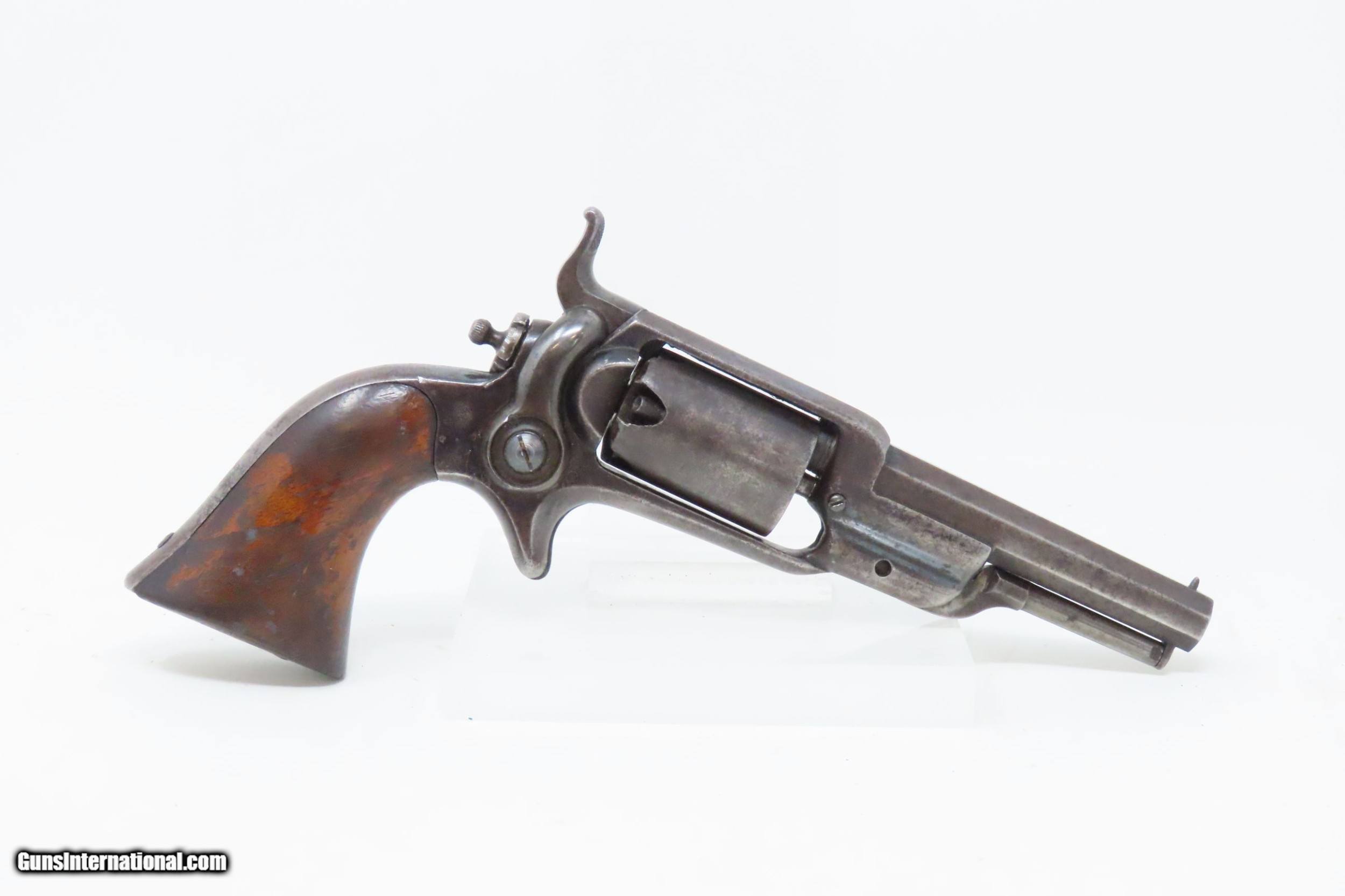 Description: CASED Antique CIVIL WAR Era COLT Model 1855 ROOT Side-Hammer Perc. Revolver Side-hammer Revolver Made in 1856 with ACCESSORIES Here we present an antique Cased Colt Model 1855 “Root” Side-hammer Pocket Revolver, made in 1856 in Hartford, Connecticut. This Samuel Colt design was named for his factory superintendent Elisha K. Root and is a telling example of Colt’s desire to innovate, which was probably the single biggest factor in his success. Though the Colt 1849 Pocket had been introduced only 6 years prior, the “Colonel” attempted to make an improved pocket revolver. The Root features Colt’s debut of the “creeping” style of loading lever which allowed for better mechanical advantage when loading the gun, Colt’s first solid frame, a hammer mounted on the right side for access to the cylinder axis pin, and a cylinder axis pin which was the point at which the hand turned the cylinder (versus on the cylinder itself). Many good ideas were tested in this design and some would prove worthy to be used in the future. The small parts used in the Root Revolver’s mechanism proved quite fragile, however upscaling them into the 1855 series of Revolving Rifles and Shotguns seemed to help. Colt is even known to have experimented with the Root design on a Dragoon pistol, a precursor to the 1860 Army. Overall, about 44,000 Root Revolvers were made from 1855-1870, much fewer than the 1849 Pocket with 340,000 produced. Though not a primary military arm during the American Civil War, handguns were commonly privately purchased by soldiers for use on the battlefield. Whether legend or fact, it is interesting to note something commonly read about pocket revolvers of the day: that while they could be used for self-defense against the enemy, many soldiers kept them on their person to defend themselves against an unwanted amputation in the primitive field hospitals that were notorious, even in their day. The overall condition is very good. Original blue finish and patina. The action (hammer/trigger) is functional, though the cylinder indexes it does not lock up. The hammer screw and the side plate (on the left) screws are replacements. The bore is in very good condition with nice rifling. The grip is solid with some of the original varnish remaining. Numbers match. The powder flask and the Colt bullet mold are original and in good condition. The case is in fair to good condition with the front left corner shored up with a clear adhesive. The internal compartments are all there but the partition around the powder flask is not presently attached. Own the original! This is a legitimate antique and not a reproduction. Barrel is 3-1/2 inches. Caliber: .28 Percussion Overall condition as seen in photos. Very Fast. Very Safe. FREE SHIPPING WORLDWIDE. Delivered directly to your door by express mail! Guaranteed AUTHENTIC & Includes CERTIFICATE OF AUTHENTICITY. ancestryguns $3995 #228161 SOLD Antique: Yes |