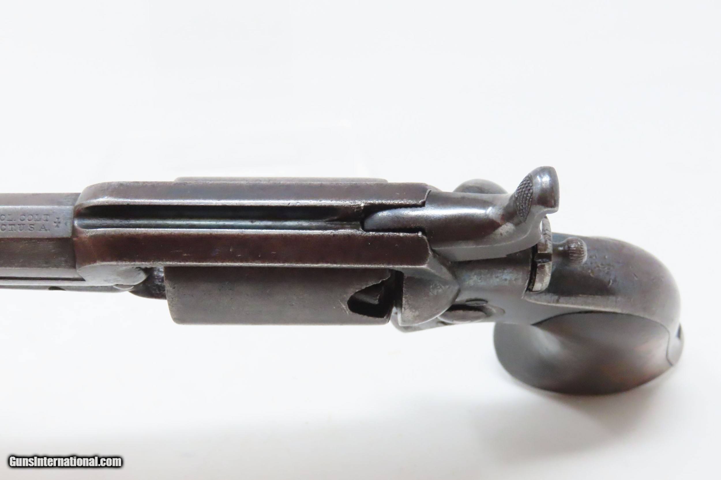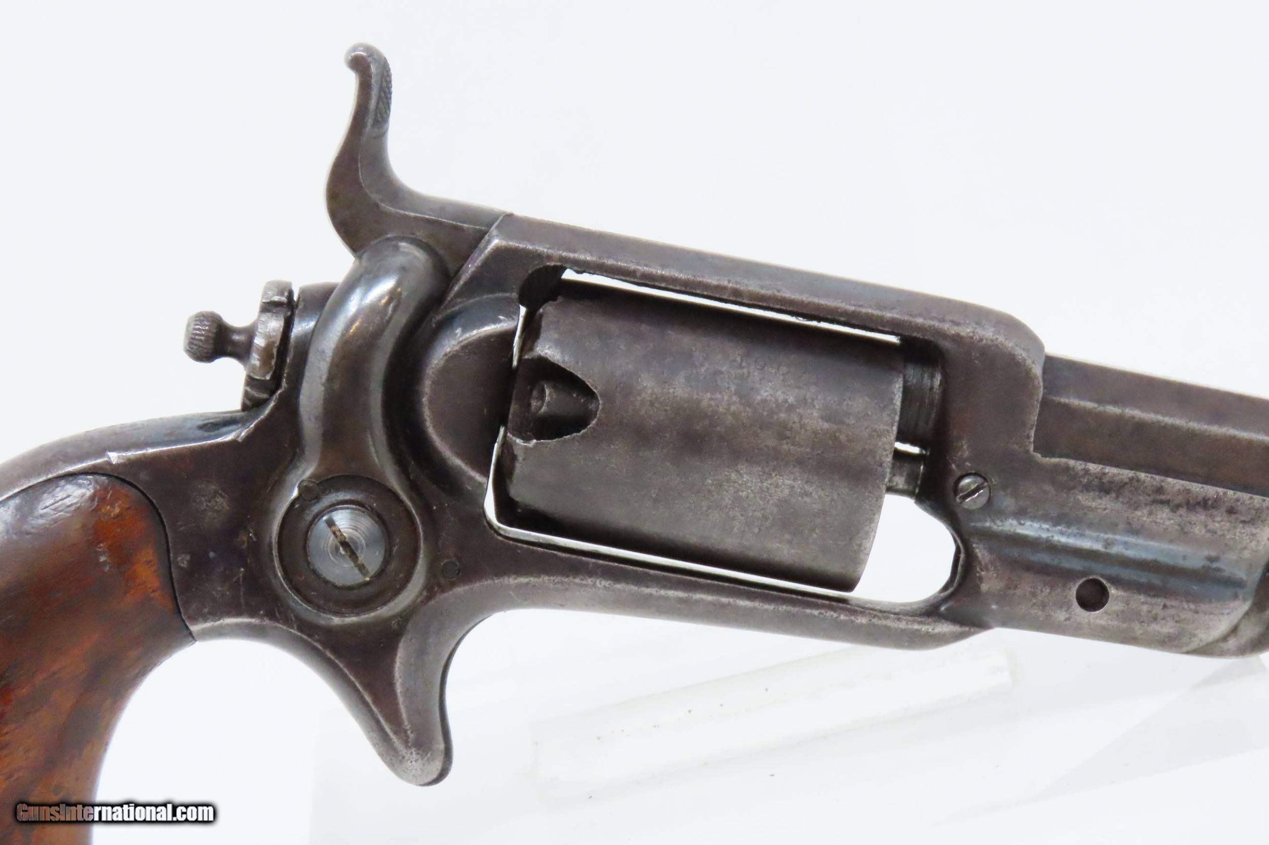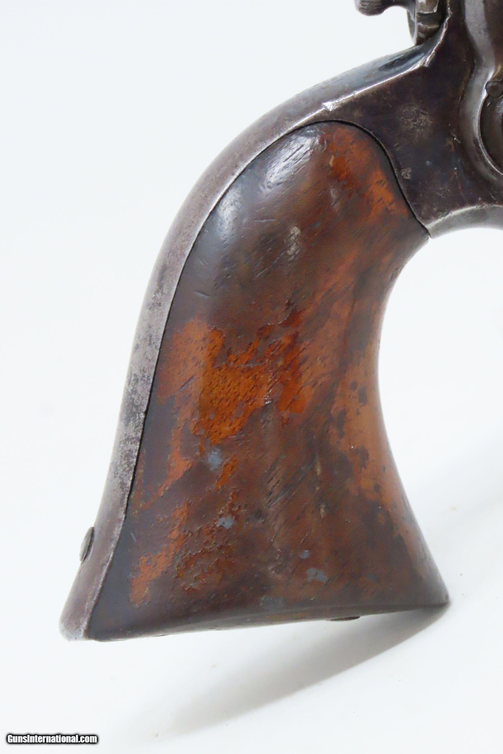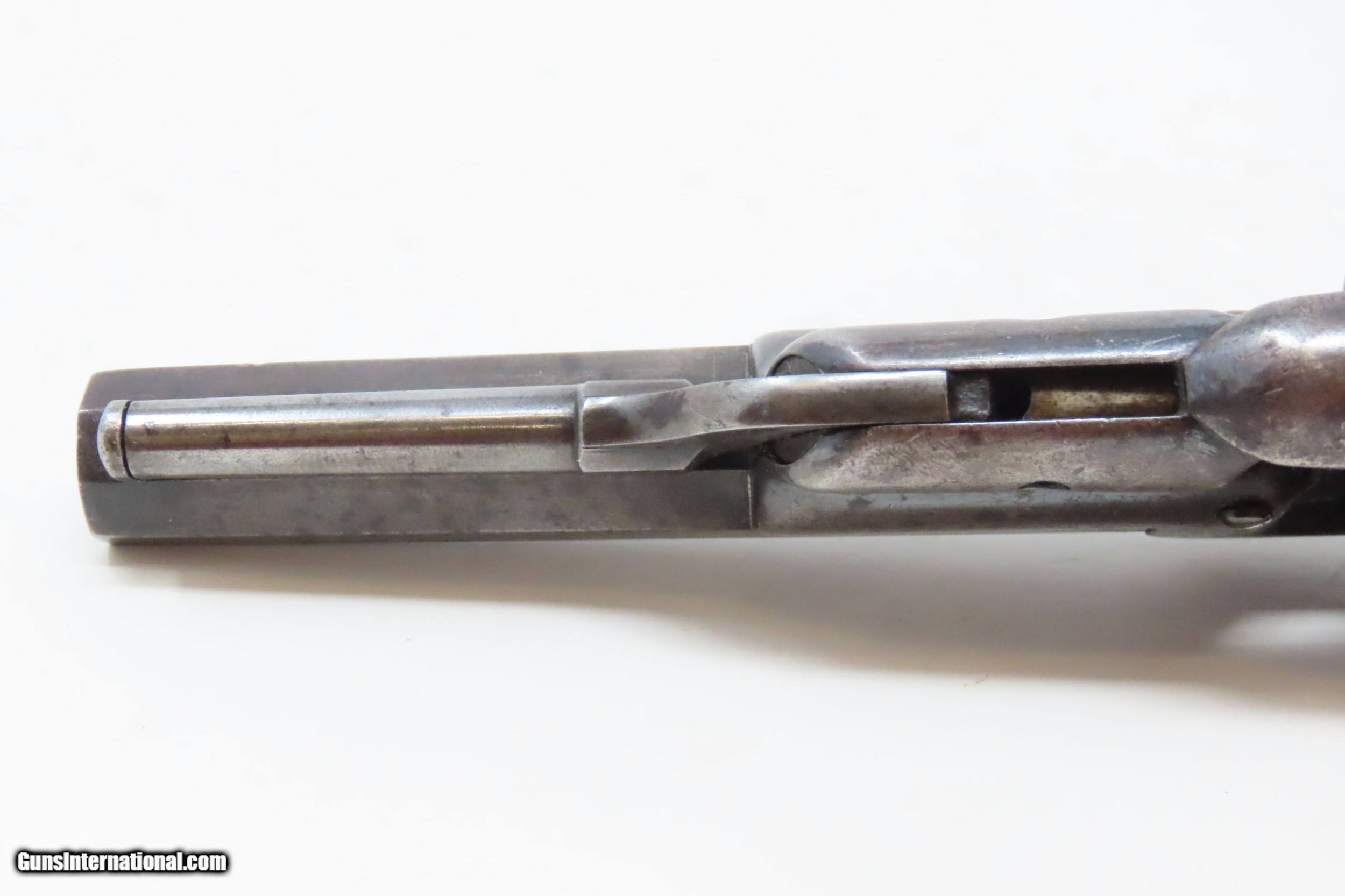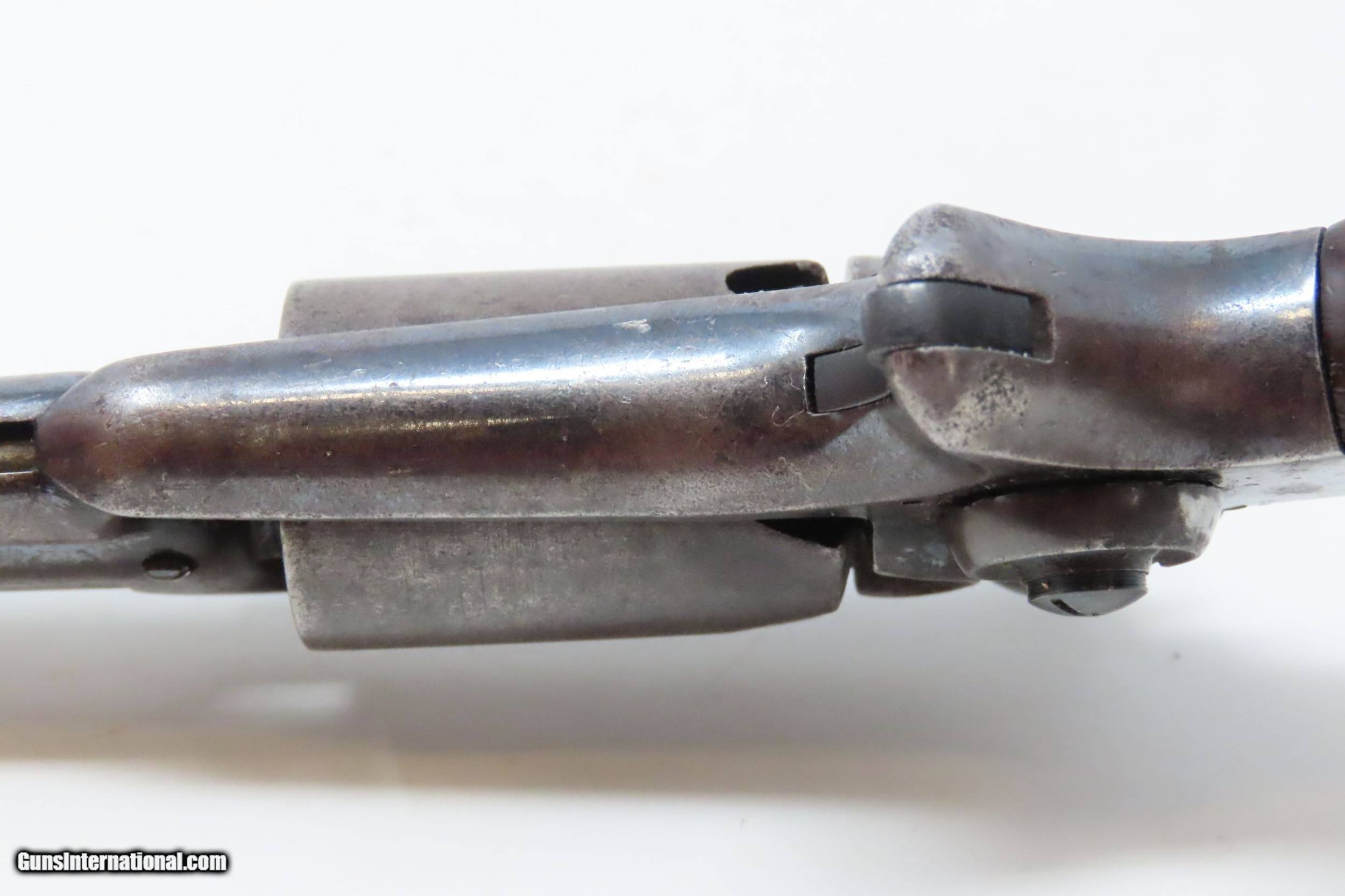 Description: CASED Antique CIVIL WAR Era COLT Model 1855 ROOT Side-Hammer Perc. Revolver Side-hammer Revolver Made in 1856 with ACCESSORIES Here we present an antique Cased Colt Model 1855 “Root” Side-hammer Pocket Revolver, made in 1856 in Hartford, Connecticut. This Samuel Colt design was named for his factory superintendent Elisha K. Root and is a telling example of Colt’s desire to innovate, which was probably the single biggest factor in his success. Though the Colt 1849 Pocket had been introduced only 6 years prior, the “Colonel” attempted to make an improved pocket revolver. The Root features Colt’s debut of the “creeping” style of loading lever which allowed for better mechanical advantage when loading the gun, Colt’s first solid frame, a hammer mounted on the right side for access to the cylinder axis pin, and a cylinder axis pin which was the point at which the hand turned the cylinder (versus on the cylinder itself). Many good ideas were tested in this design and some would prove worthy to be used in the future. The small parts used in the Root Revolver’s mechanism proved quite fragile, however upscaling them into the 1855 series of Revolving Rifles and Shotguns seemed to help. Colt is even known to have experimented with the Root design on a Dragoon pistol, a precursor to the 1860 Army. Overall, about 44,000 Root Revolvers were made from 1855-1870, much fewer than the 1849 Pocket with 340,000 produced. Though not a primary military arm during the American Civil War, handguns were commonly privately purchased by soldiers for use on the battlefield. Whether legend or fact, it is interesting to note something commonly read about pocket revolvers of the day: that while they could be used for self-defense against the enemy, many soldiers kept them on their person to defend themselves against an unwanted amputation in the primitive field hospitals that were notorious, even in their day. The overall condition is very good. Original blue finish and patina. The action (hammer/trigger) is functional, though the cylinder indexes it does not lock up. The hammer screw and the side plate (on the left) screws are replacements. The bore is in very good condition with nice rifling. The grip is solid with some of the original varnish remaining. Numbers match. The powder flask and the Colt bullet mold are original and in good condition. The case is in fair to good condition with the front left corner shored up with a clear adhesive. The internal compartments are all there but the partition around the powder flask is not presently attached. Own the original! This is a legitimate antique and not a reproduction. Barrel is 3-1/2 inches. Caliber: .28 Percussion Overall condition as seen in photos. Very Fast. Very Safe. FREE SHIPPING WORLDWIDE. Delivered directly to your door by express mail! Guaranteed AUTHENTIC & Includes CERTIFICATE OF AUTHENTICITY. ancestryguns $3995 #228161 SOLD Antique: Yes |