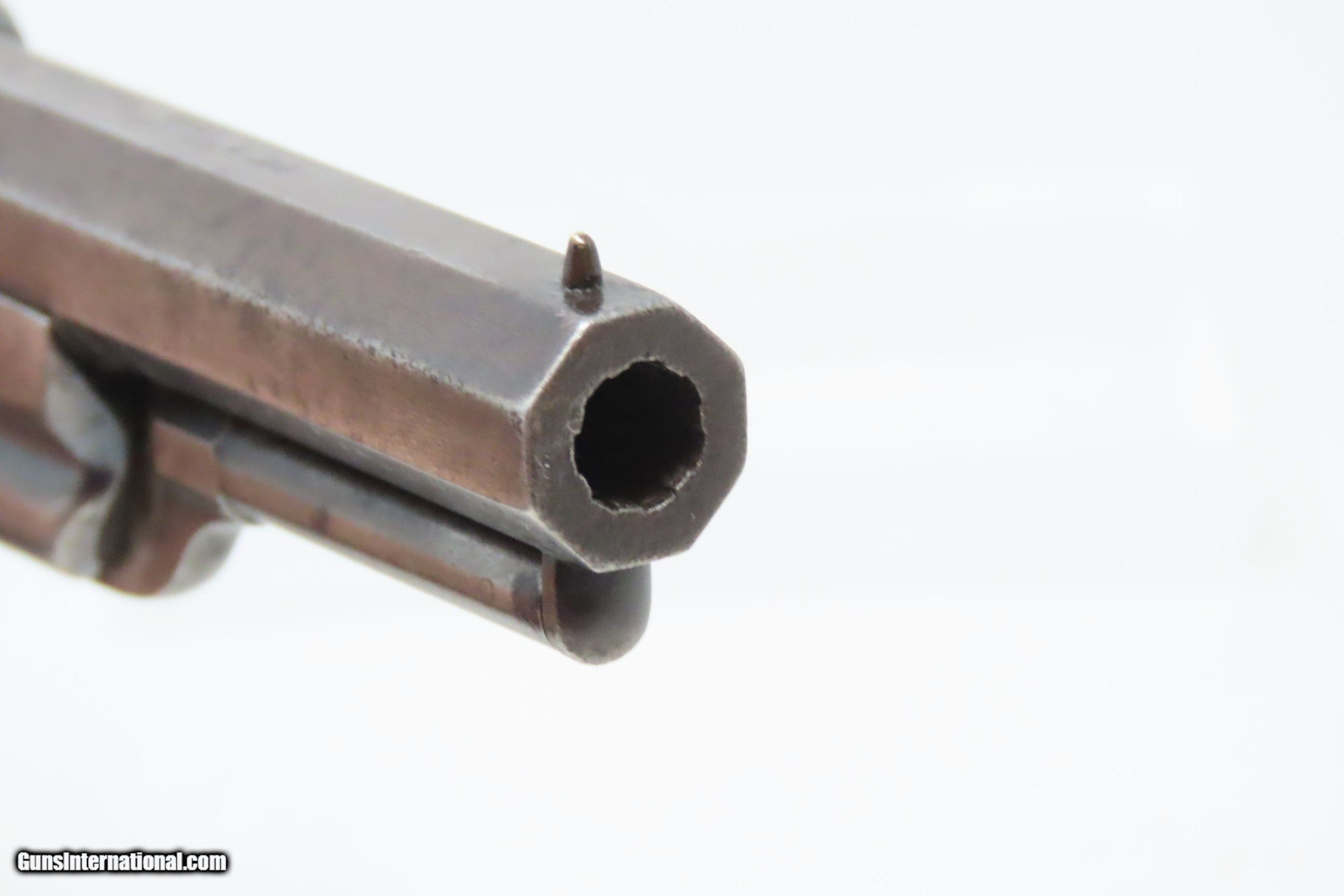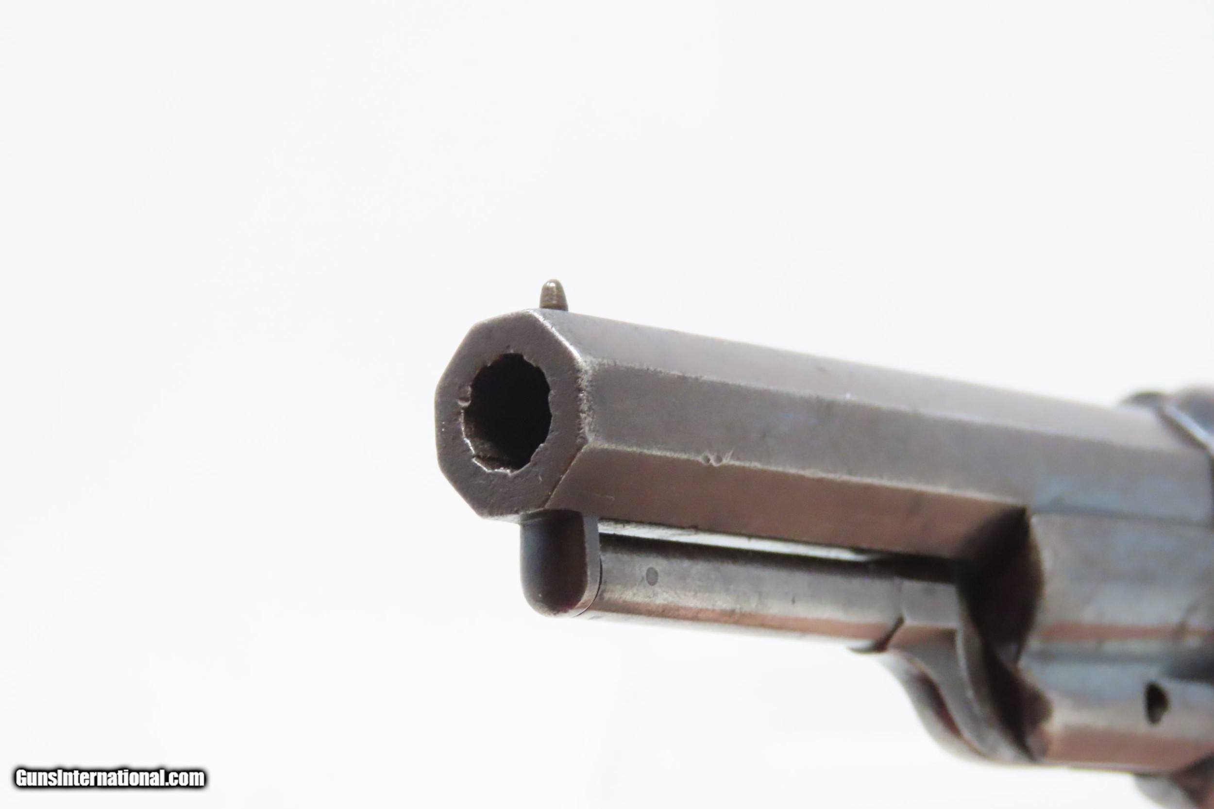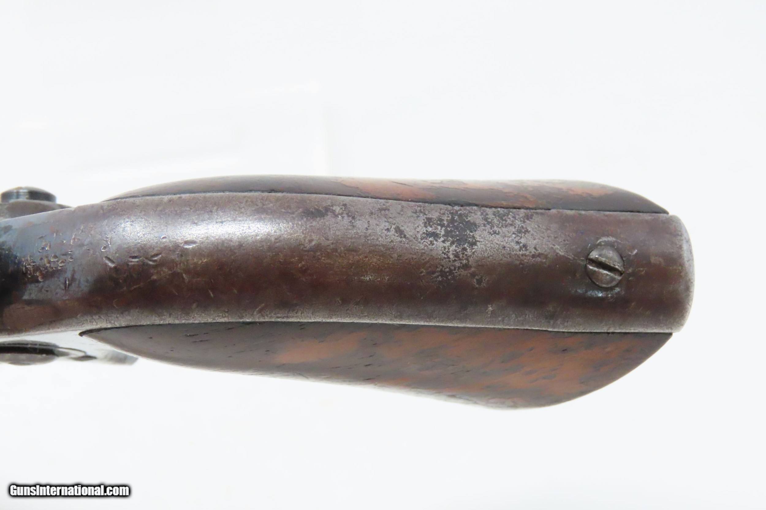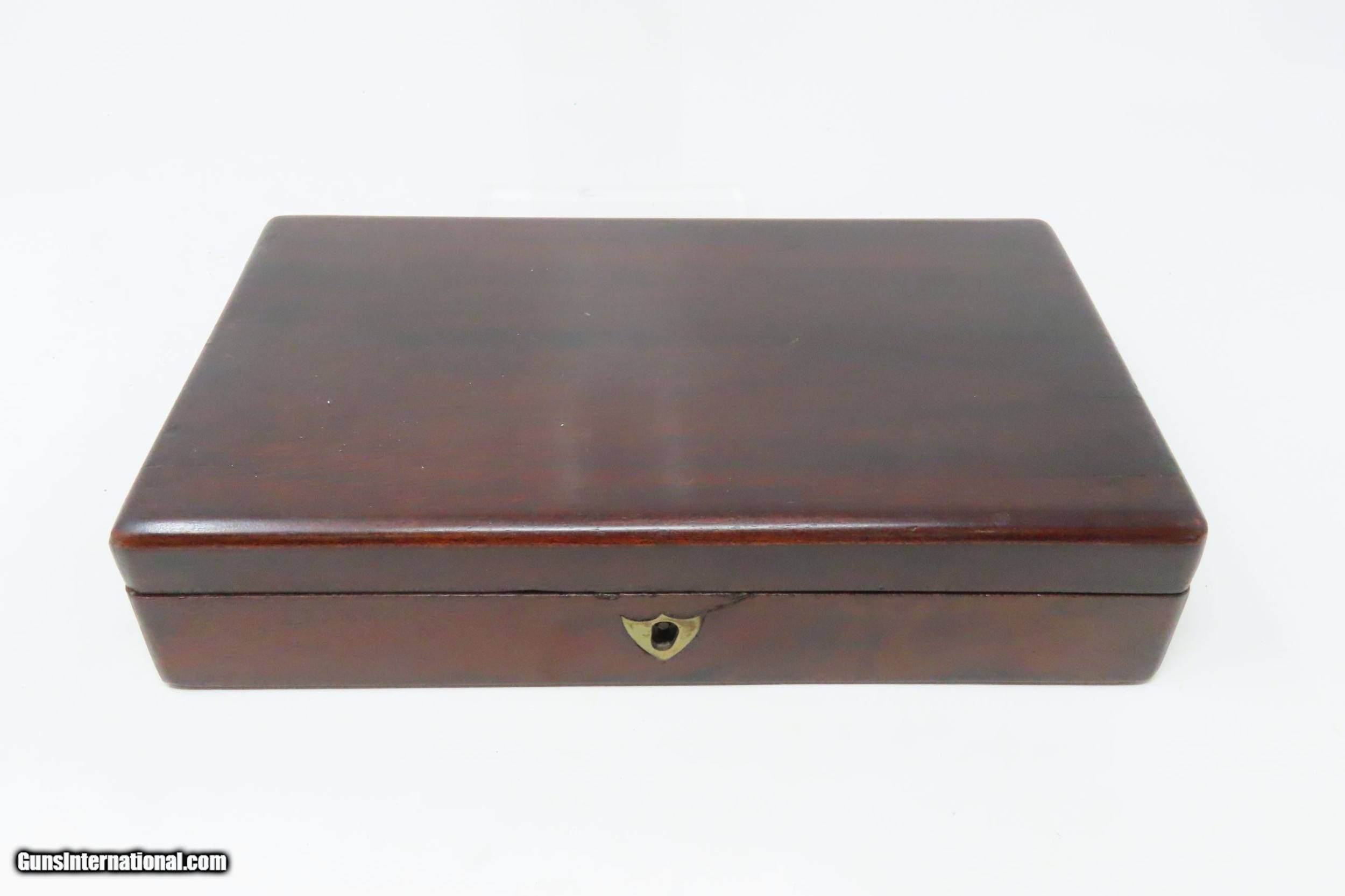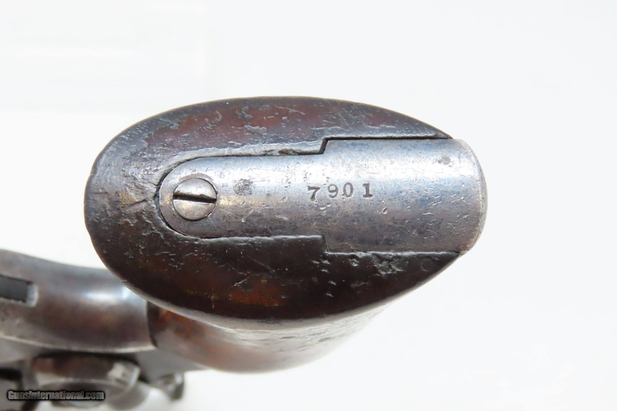 Description: CASED Antique CIVIL WAR Era COLT Model 1855 ROOT Side-Hammer Perc. Revolver Side-hammer Revolver Made in 1856 with ACCESSORIES Here we present an antique Cased Colt Model 1855 “Root” Side-hammer Pocket Revolver, made in 1856 in Hartford, Connecticut. This Samuel Colt design was named for his factory superintendent Elisha K. Root and is a telling example of Colt’s desire to innovate, which was probably the single biggest factor in his success. Though the Colt 1849 Pocket had been introduced only 6 years prior, the “Colonel” attempted to make an improved pocket revolver. The Root features Colt’s debut of the “creeping” style of loading lever which allowed for better mechanical advantage when loading the gun, Colt’s first solid frame, a hammer mounted on the right side for access to the cylinder axis pin, and a cylinder axis pin which was the point at which the hand turned the cylinder (versus on the cylinder itself). Many good ideas were tested in this design and some would prove worthy to be used in the future. The small parts used in the Root Revolver’s mechanism proved quite fragile, however upscaling them into the 1855 series of Revolving Rifles and Shotguns seemed to help. Colt is even known to have experimented with the Root design on a Dragoon pistol, a precursor to the 1860 Army. Overall, about 44,000 Root Revolvers were made from 1855-1870, much fewer than the 1849 Pocket with 340,000 produced. Though not a primary military arm during the American Civil War, handguns were commonly privately purchased by soldiers for use on the battlefield. Whether legend or fact, it is interesting to note something commonly read about pocket revolvers of the day: that while they could be used for self-defense against the enemy, many soldiers kept them on their person to defend themselves against an unwanted amputation in the primitive field hospitals that were notorious, even in their day. The overall condition is very good. Original blue finish and patina. The action (hammer/trigger) is functional, though the cylinder indexes it does not lock up. The hammer screw and the side plate (on the left) screws are replacements. The bore is in very good condition with nice rifling. The grip is solid with some of the original varnish remaining. Numbers match. The powder flask and the Colt bullet mold are original and in good condition. The case is in fair to good condition with the front left corner shored up with a clear adhesive. The internal compartments are all there but the partition around the powder flask is not presently attached. Own the original! This is a legitimate antique and not a reproduction. Barrel is 3-1/2 inches. Caliber: .28 Percussion Overall condition as seen in photos. Very Fast. Very Safe. FREE SHIPPING WORLDWIDE. Delivered directly to your door by express mail! Guaranteed AUTHENTIC & Includes CERTIFICATE OF AUTHENTICITY. ancestryguns $3995 #228161 SOLD Antique: Yes |