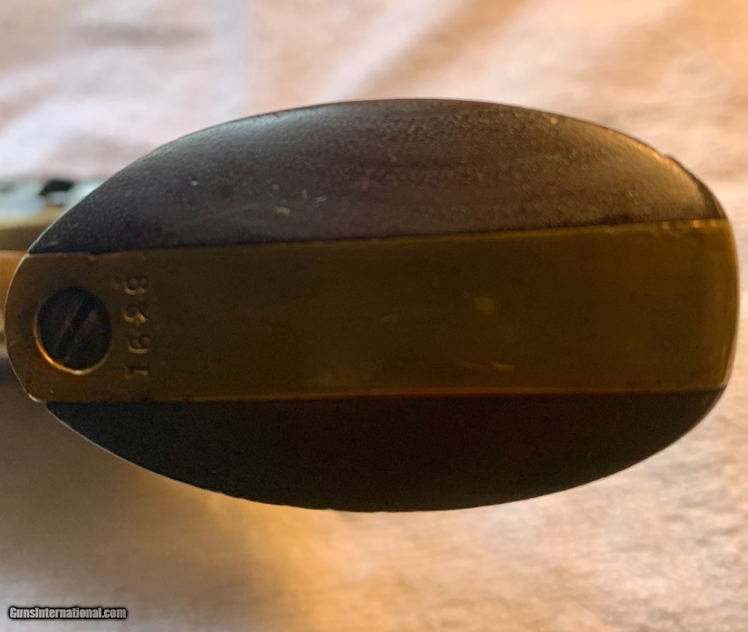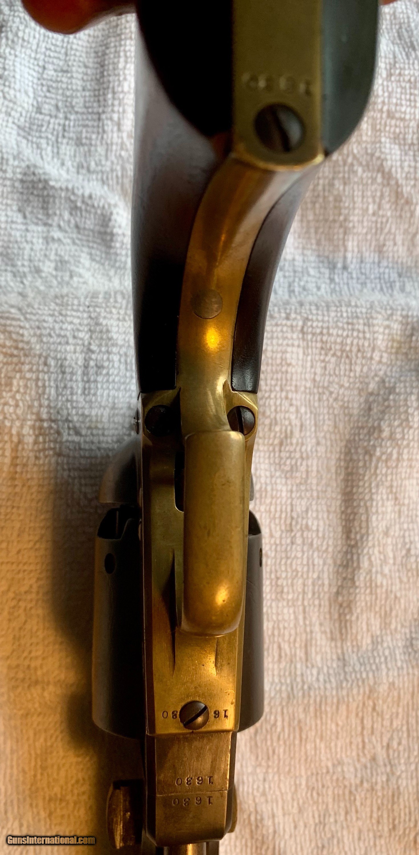 Description: Beautiful consecutive serial numbered colt first model dragoon's, serial # 1629 , 1630, c1848 production Excellent patina, All functions are excellent, fire, half cock, full cock, cylinder rotation and lock, barrels nice as well! excellent grips, all numbers match throughout both pistols including unloader. Faint cylinder scene(s) left. wedge numbers match as well. original mahogany case, inside is well worn, but shows well. All accessories appear to be original as well Former Cowans items Serious only please XF condition SOLD Antique: Yes |