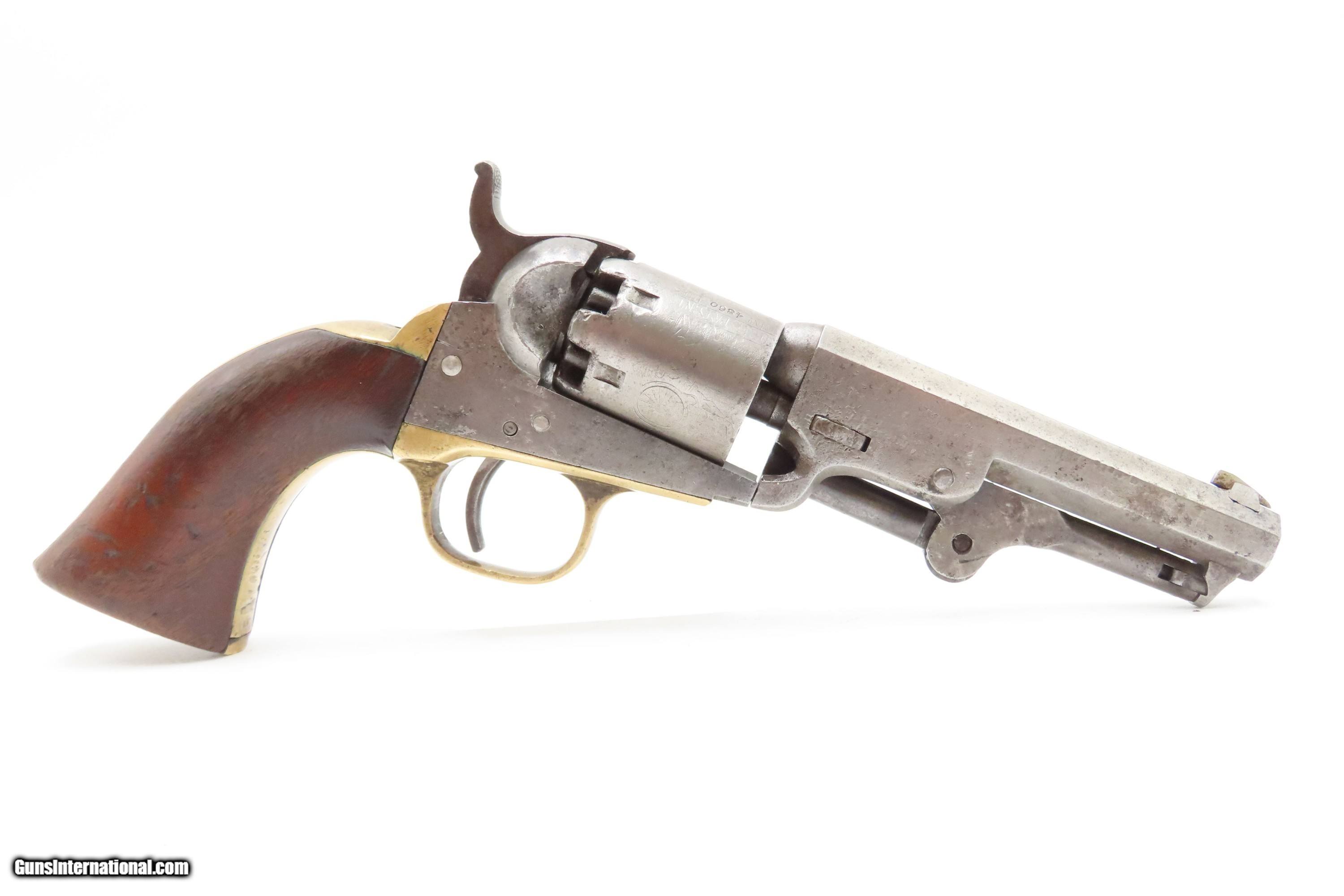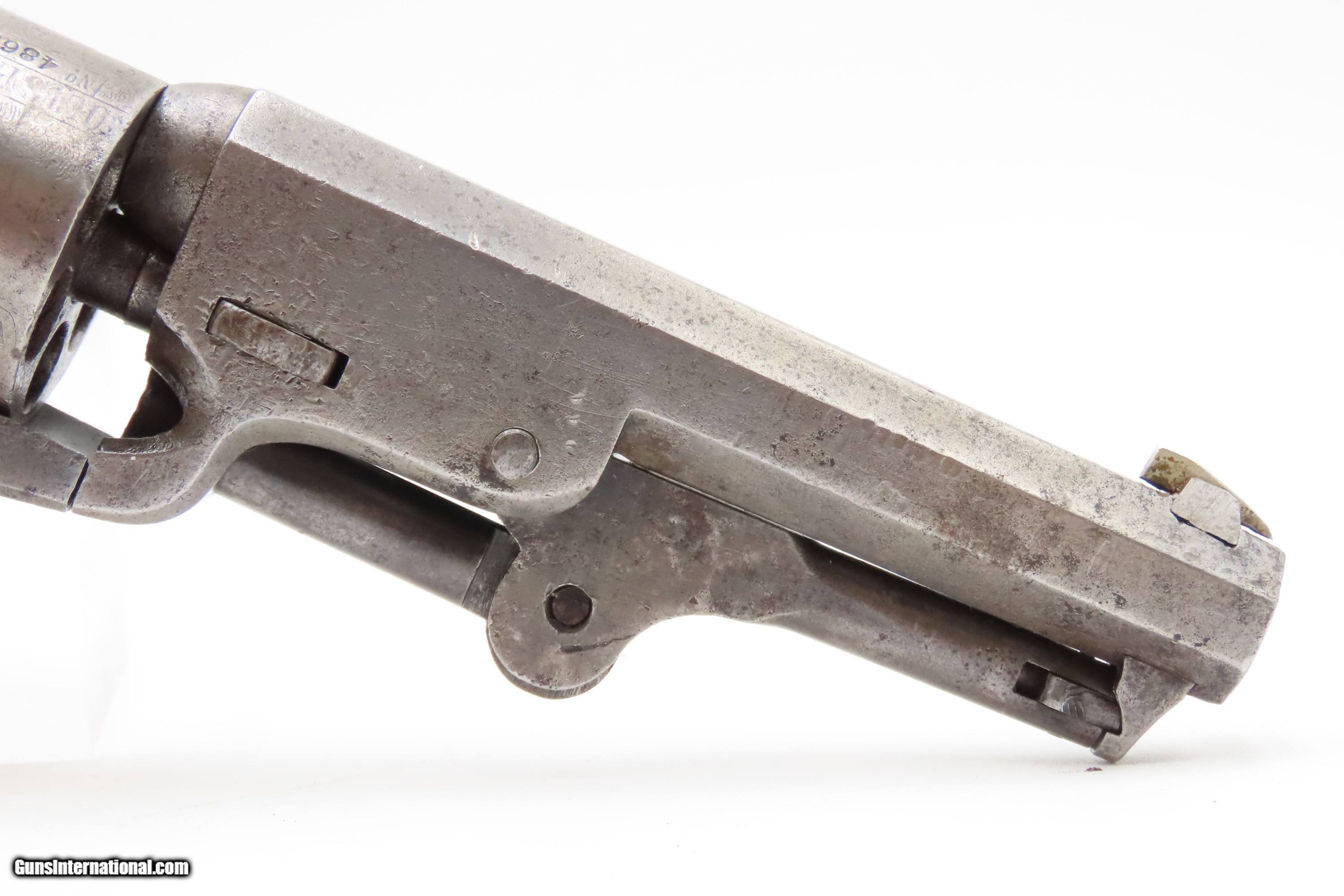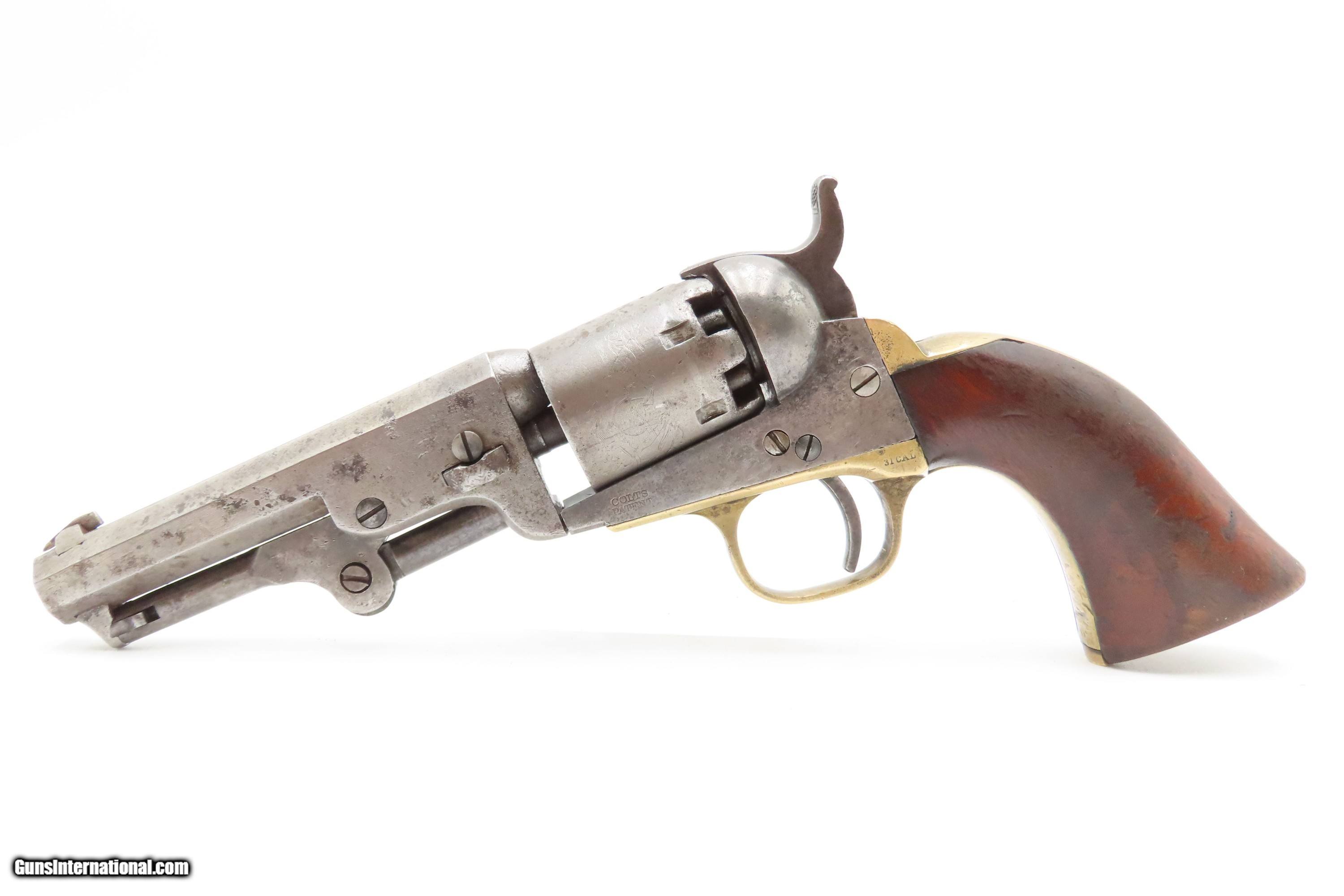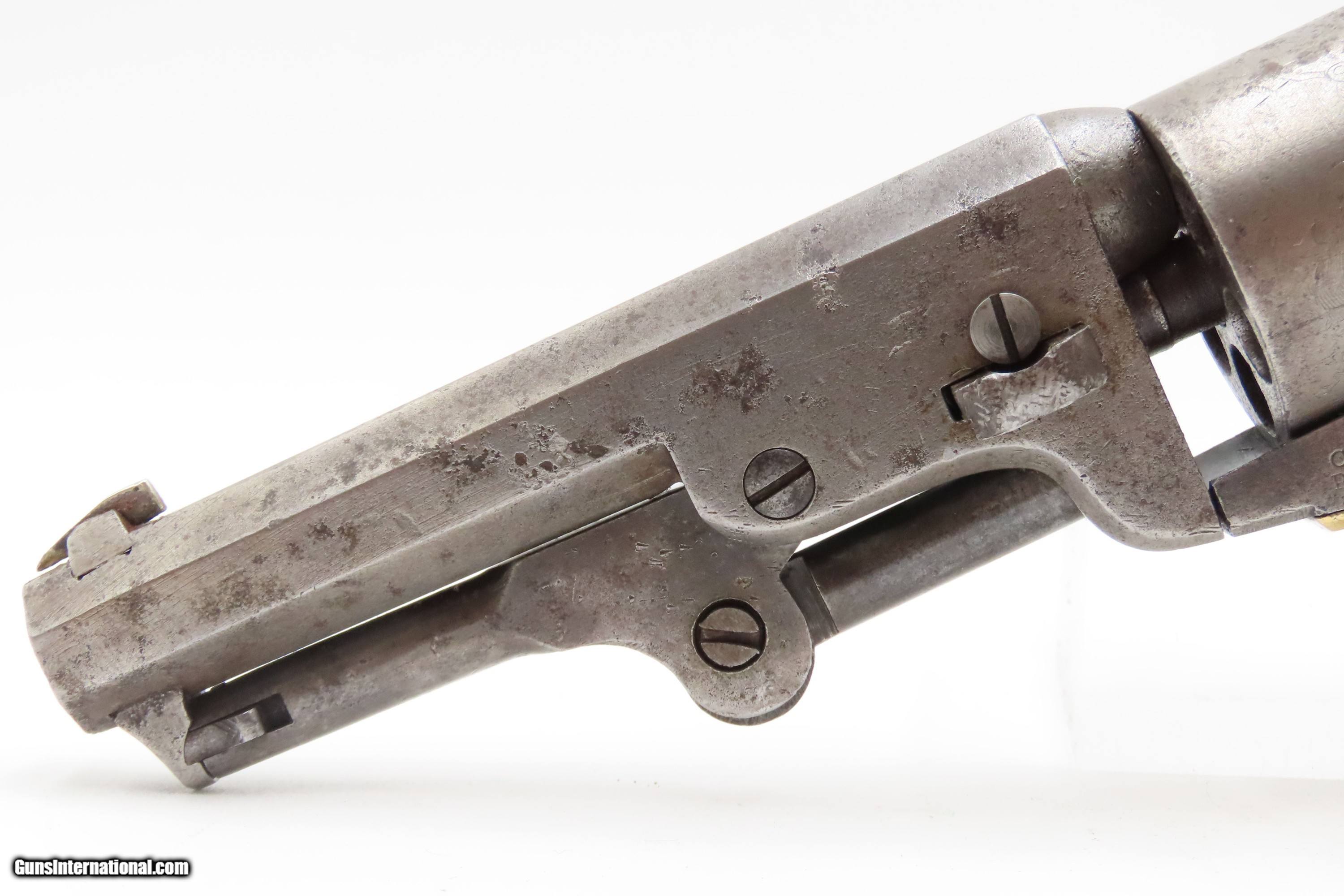 Description: CASED Post-CIVIL WAR / WILD WEST Antique COLT M1849 Percussion .31 POCKET 1871 mfg FRONTIER SIX-SHOOTER Revolver ACCESSORIES Here we present an antique Colt Model 1849 Percussion Pocket Revolver, made in 1871 in Hartford, Connecticut, just six years after the close of the Civil War. The Model 1849 Pocket, the replacement for the Baby Dragoon, was the most widely produced of any Colt percussion pistol. Nearly 340,000 were manufactured during its 23-year production run that ended in 1873. Over 280,000 of these were produced by Colt’s factory at Hartford by the end of the American Civil War in 1865. These were very popular and saw a lot of use on the battlefield, on the home front and in the West. These were some of the smallest, handiest pocket revolvers of the time. One of the most aesthetically pleasing aspects of this pistol is its cylinder scene. Cylinder scenes during this period were common, especially for Colt, not only for their visual appeal, but because it made a revolver more difficult to forge. The scene on the 1849 Pocket is that of a stagecoach robbery. The focal point is the stagecoach drawn by four horses. A woman in a dress is seen framed in the doorway of the side of the coach. The driver is standing alongside wielding his pistol against multiple assailants as the horses rear and struggle against their harnesses. Several of the bandits lay dying on the ground, one tries to control the horses, two are running away and one is in the process of falling dead after being shot. Not a bad way to show interested buyers what a pistol like this would be good for. It did a fine job as a self-defense handgun for the average citizen in 19th Century America. Though not a primary military arm during the American Civil War, these handguns were commonly privately purchased by soldiers for use on the battlefield. Whether legend or fact, it is interesting to note something commonly read about pocket revolvers of the day, that while they could be used for self-defense against the enemy, many soldiers kept them on their person to defend themselves against an unwanted amputation in the primitive field hospitals that were notorious, even in their day. Also included is a wooden case with a reproduction label inside the lid, two cap tins, bullet mold, balls/bullets, key, and a powder flask. The overall condition is good. Gray patina. The action fully functions, although intermittently index due to a worn cylinder hand. Good grip. Numbers match. Markings are legible. A good amount of the cylinder scene is intact. The rifling has thinned but remains in good shape for its age. The case and accessories are good. Own the original! This is a legitimate antique and not a reproduction. Barrel is 4 inches. Caliber: .31 Percussion Overall condition as seen in photos. Very Fast. Very Safe. FREE SHIPPING WORLDWIDE. Delivered directly to your door by express mail! Guaranteed AUTHENTIC & Includes CERTIFICATE OF AUTHENTICITY. ancestryguns $2700 #250519 Curio/Relic: Yes Price: $2,700.00 Buy Now Pay with