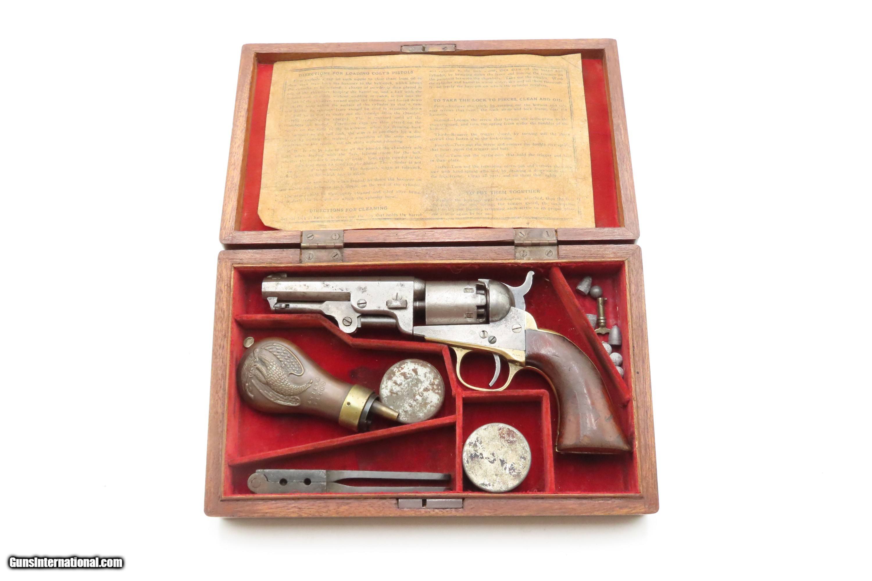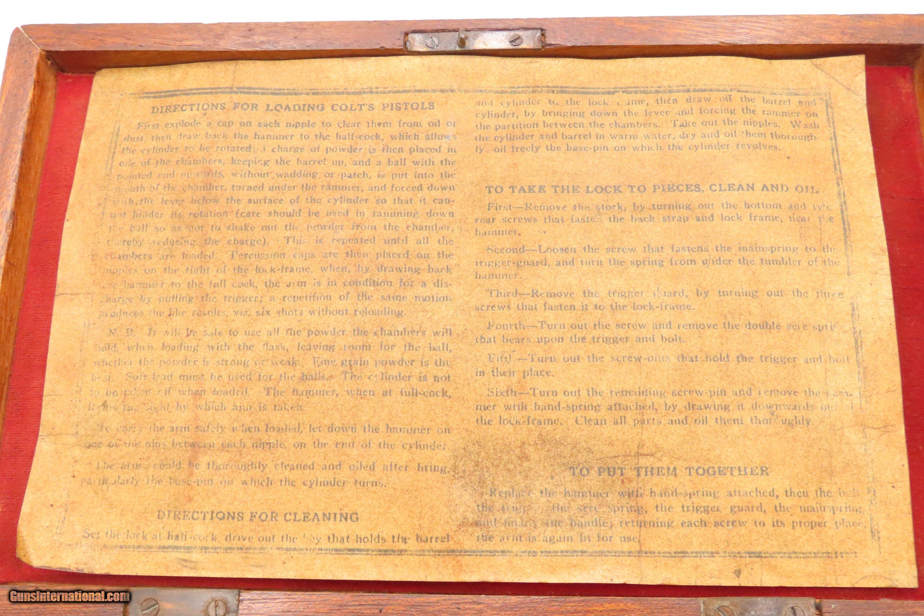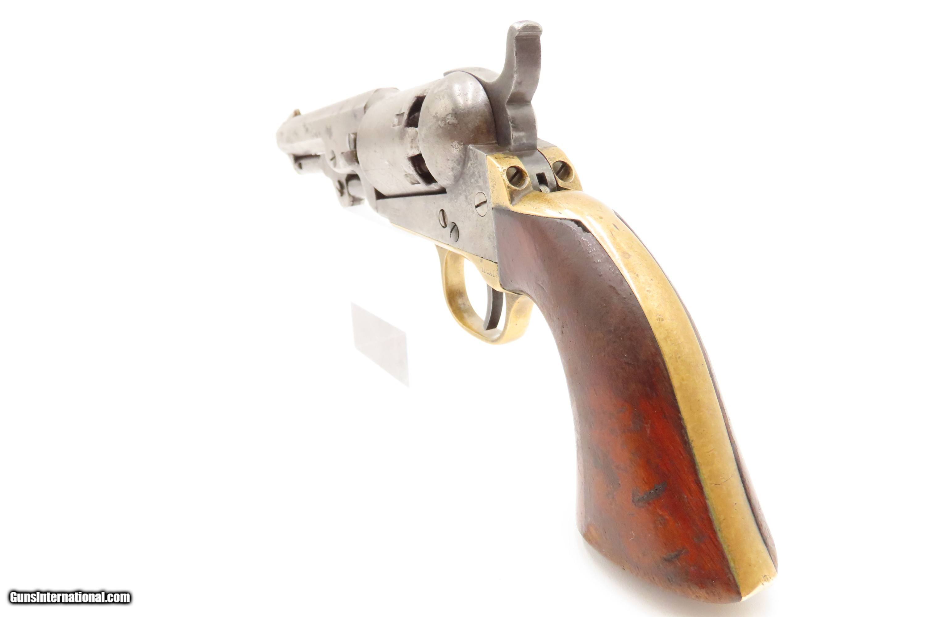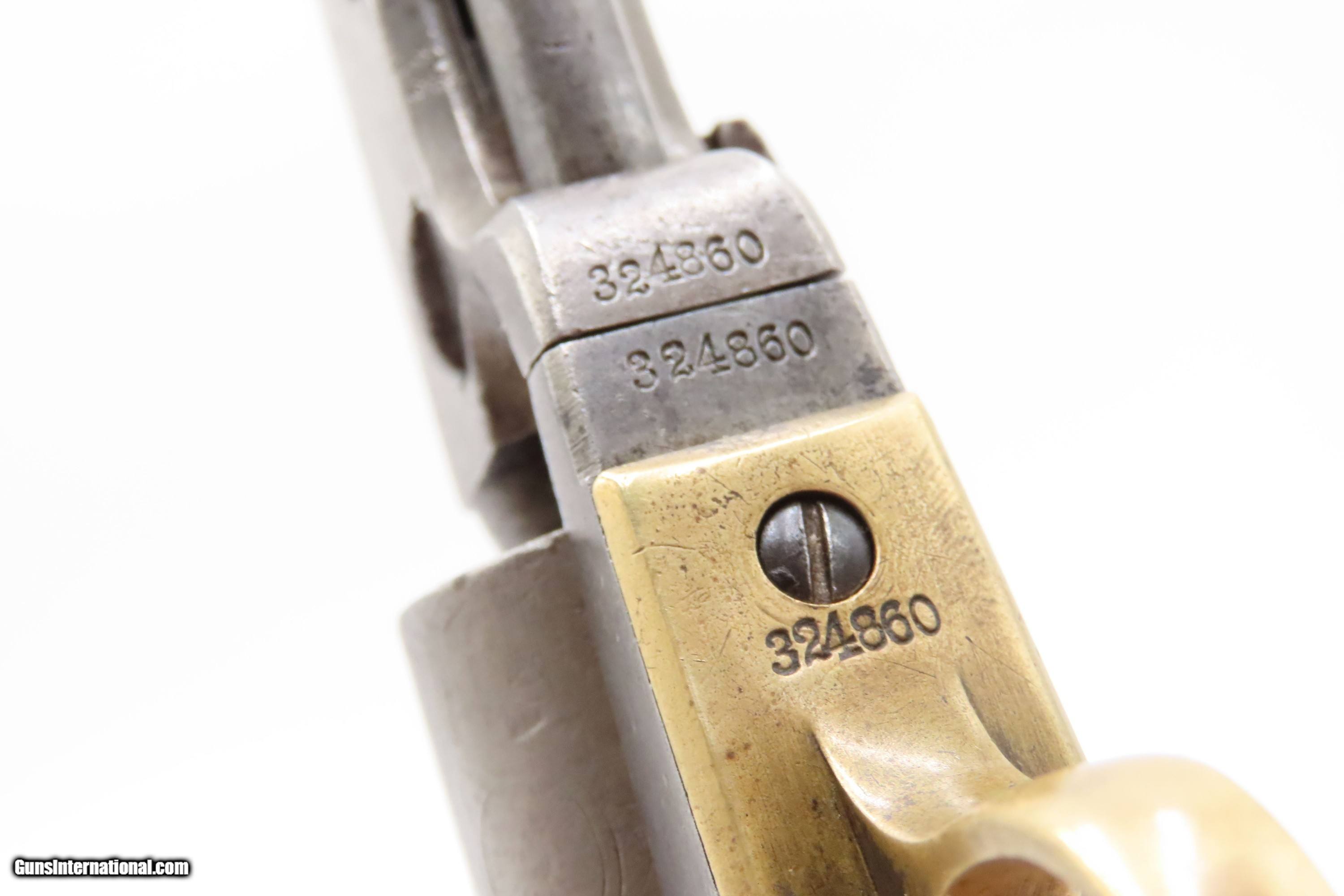 Description: CASED Post-CIVIL WAR / WILD WEST Antique COLT M1849 Percussion .31 POCKET 1871 mfg FRONTIER SIX-SHOOTER Revolver ACCESSORIES Here we present an antique Colt Model 1849 Percussion Pocket Revolver, made in 1871 in Hartford, Connecticut, just six years after the close of the Civil War. The Model 1849 Pocket, the replacement for the Baby Dragoon, was the most widely produced of any Colt percussion pistol. Nearly 340,000 were manufactured during its 23-year production run that ended in 1873. Over 280,000 of these were produced by Colt’s factory at Hartford by the end of the American Civil War in 1865. These were very popular and saw a lot of use on the battlefield, on the home front and in the West. These were some of the smallest, handiest pocket revolvers of the time. One of the most aesthetically pleasing aspects of this pistol is its cylinder scene. Cylinder scenes during this period were common, especially for Colt, not only for their visual appeal, but because it made a revolver more difficult to forge. The scene on the 1849 Pocket is that of a stagecoach robbery. The focal point is the stagecoach drawn by four horses. A woman in a dress is seen framed in the doorway of the side of the coach. The driver is standing alongside wielding his pistol against multiple assailants as the horses rear and struggle against their harnesses. Several of the bandits lay dying on the ground, one tries to control the horses, two are running away and one is in the process of falling dead after being shot. Not a bad way to show interested buyers what a pistol like this would be good for. It did a fine job as a self-defense handgun for the average citizen in 19th Century America. Though not a primary military arm during the American Civil War, these handguns were commonly privately purchased by soldiers for use on the battlefield. Whether legend or fact, it is interesting to note something commonly read about pocket revolvers of the day, that while they could be used for self-defense against the enemy, many soldiers kept them on their person to defend themselves against an unwanted amputation in the primitive field hospitals that were notorious, even in their day. Also included is a wooden case with a reproduction label inside the lid, two cap tins, bullet mold, balls/bullets, key, and a powder flask. The overall condition is good. Gray patina. The action fully functions, although intermittently index due to a worn cylinder hand. Good grip. Numbers match. Markings are legible. A good amount of the cylinder scene is intact. The rifling has thinned but remains in good shape for its age. The case and accessories are good. Own the original! This is a legitimate antique and not a reproduction. Barrel is 4 inches. Caliber: .31 Percussion Overall condition as seen in photos. Very Fast. Very Safe. FREE SHIPPING WORLDWIDE. Delivered directly to your door by express mail! Guaranteed AUTHENTIC & Includes CERTIFICATE OF AUTHENTICITY. ancestryguns $2700 #250519 Curio/Relic: Yes Price: $2,700.00 Buy Now Pay with