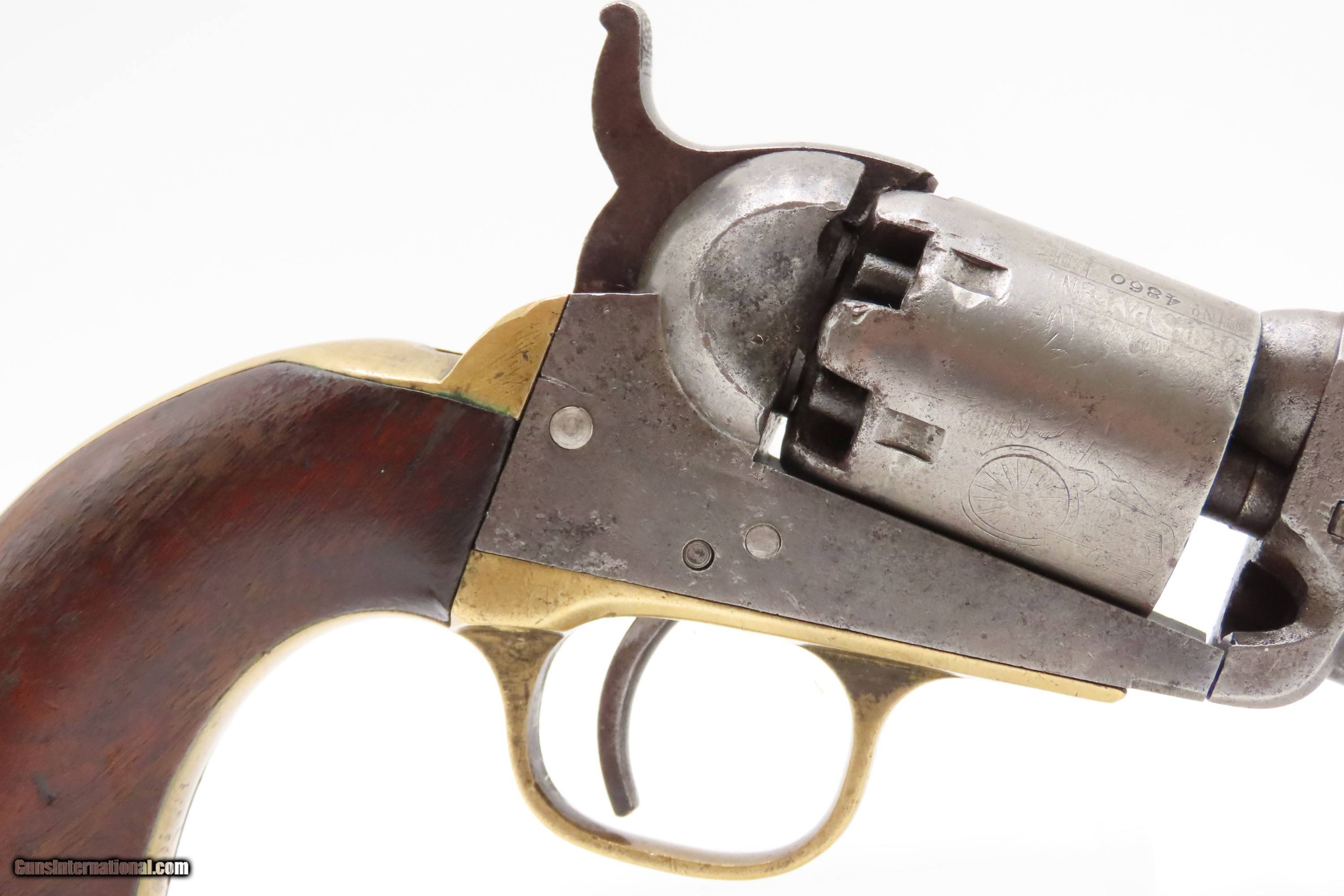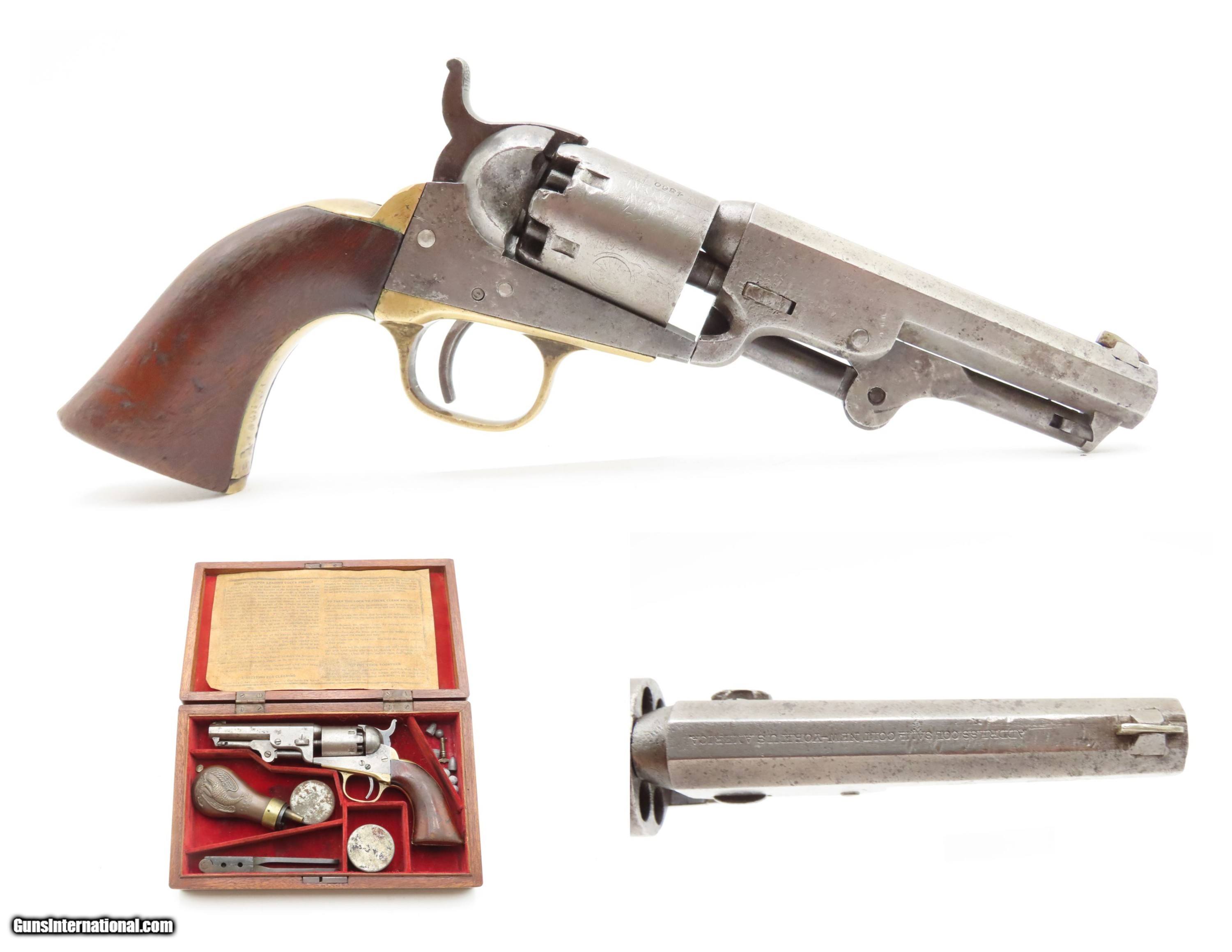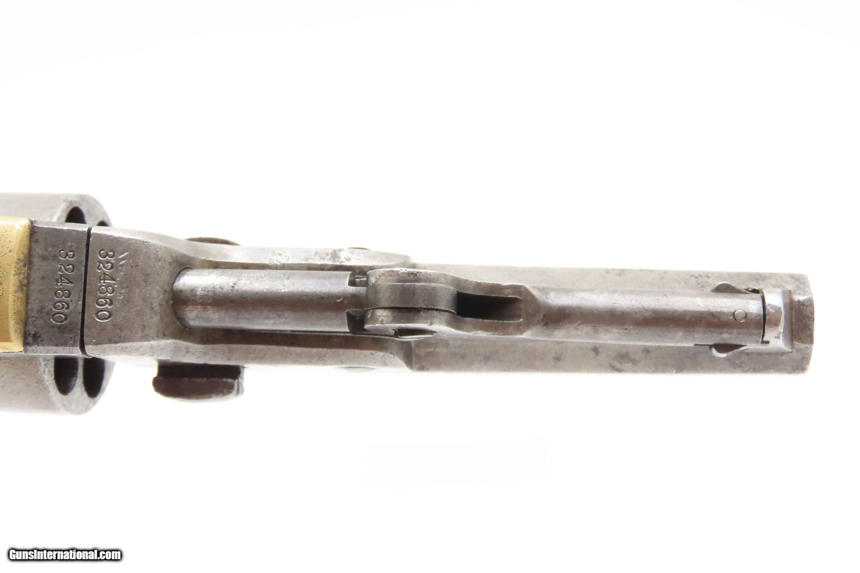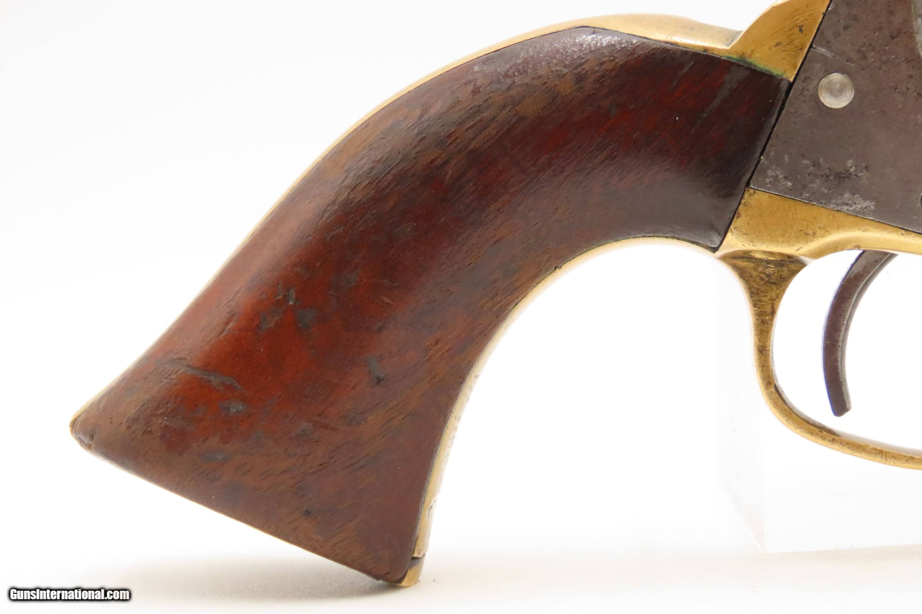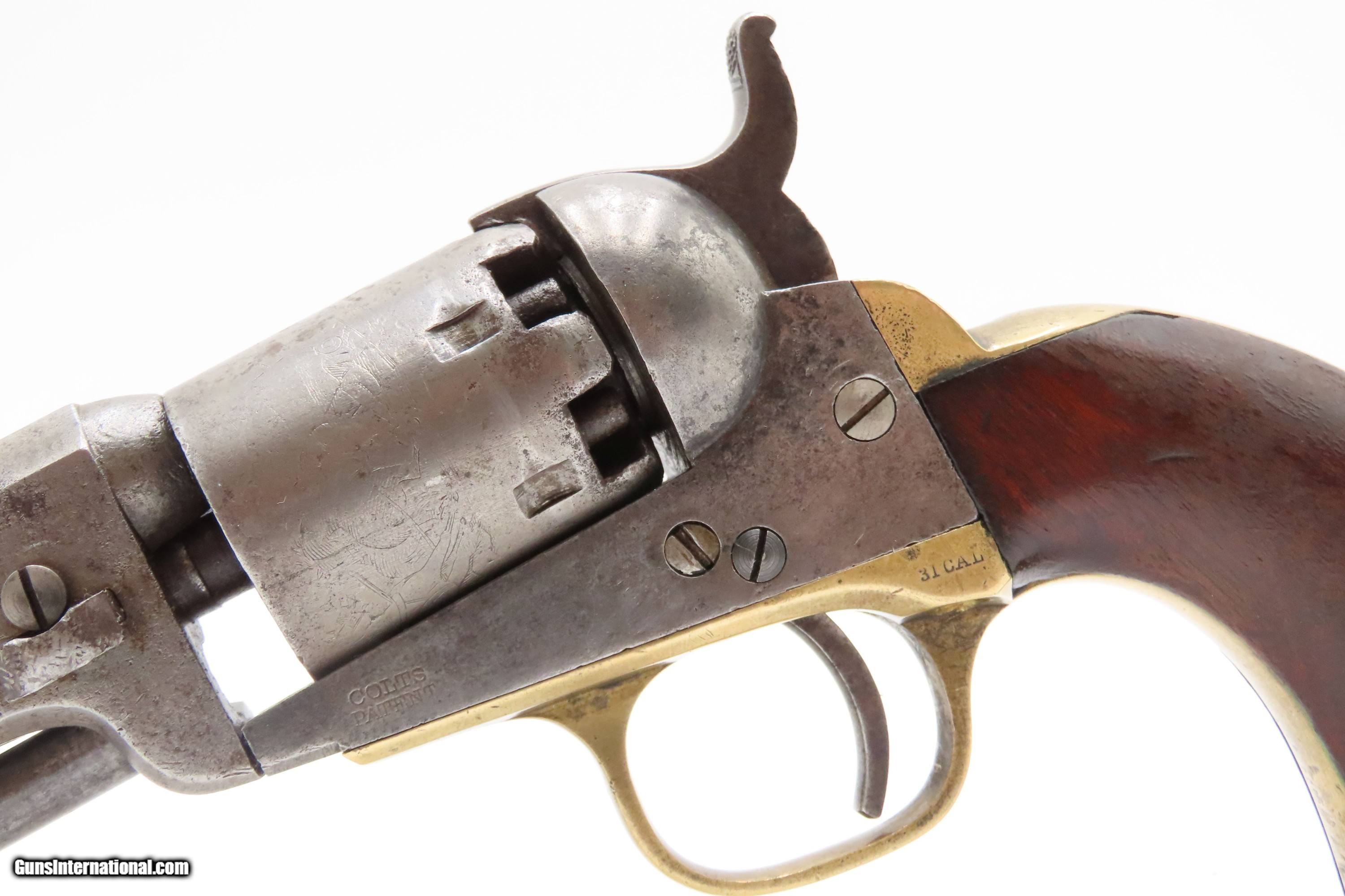 Description: CASED Post-CIVIL WAR / WILD WEST Antique COLT M1849 Percussion .31 POCKET 1871 mfg FRONTIER SIX-SHOOTER Revolver ACCESSORIES Here we present an antique Colt Model 1849 Percussion Pocket Revolver, made in 1871 in Hartford, Connecticut, just six years after the close of the Civil War. The Model 1849 Pocket, the replacement for the Baby Dragoon, was the most widely produced of any Colt percussion pistol. Nearly 340,000 were manufactured during its 23-year production run that ended in 1873. Over 280,000 of these were produced by Colt’s factory at Hartford by the end of the American Civil War in 1865. These were very popular and saw a lot of use on the battlefield, on the home front and in the West. These were some of the smallest, handiest pocket revolvers of the time. One of the most aesthetically pleasing aspects of this pistol is its cylinder scene. Cylinder scenes during this period were common, especially for Colt, not only for their visual appeal, but because it made a revolver more difficult to forge. The scene on the 1849 Pocket is that of a stagecoach robbery. The focal point is the stagecoach drawn by four horses. A woman in a dress is seen framed in the doorway of the side of the coach. The driver is standing alongside wielding his pistol against multiple assailants as the horses rear and struggle against their harnesses. Several of the bandits lay dying on the ground, one tries to control the horses, two are running away and one is in the process of falling dead after being shot. Not a bad way to show interested buyers what a pistol like this would be good for. It did a fine job as a self-defense handgun for the average citizen in 19th Century America. Though not a primary military arm during the American Civil War, these handguns were commonly privately purchased by soldiers for use on the battlefield. Whether legend or fact, it is interesting to note something commonly read about pocket revolvers of the day, that while they could be used for self-defense against the enemy, many soldiers kept them on their person to defend themselves against an unwanted amputation in the primitive field hospitals that were notorious, even in their day. Also included is a wooden case with a reproduction label inside the lid, two cap tins, bullet mold, balls/bullets, key, and a powder flask. The overall condition is good. Gray patina. The action fully functions, although intermittently index due to a worn cylinder hand. Good grip. Numbers match. Markings are legible. A good amount of the cylinder scene is intact. The rifling has thinned but remains in good shape for its age. The case and accessories are good. Own the original! This is a legitimate antique and not a reproduction. Barrel is 4 inches. Caliber: .31 Percussion Overall condition as seen in photos. Very Fast. Very Safe. FREE SHIPPING WORLDWIDE. Delivered directly to your door by express mail! Guaranteed AUTHENTIC & Includes CERTIFICATE OF AUTHENTICITY. ancestryguns $2700 #250519 Curio/Relic: Yes Price: $2,700.00 Buy Now Pay with