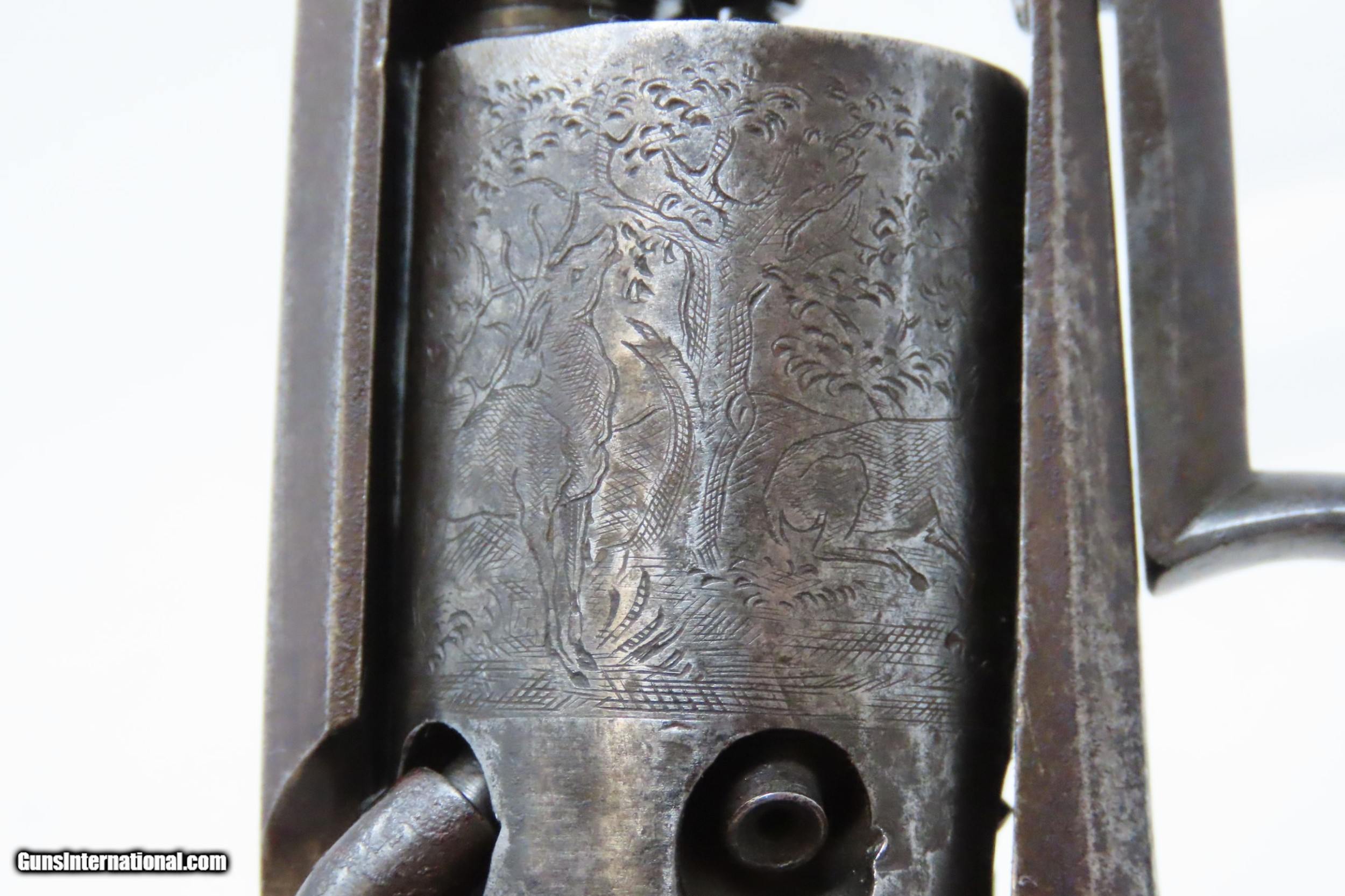 Description: CIVIL WAR Antique ALLEN & WHEELOCK Sidehammer POCKET Percussion Revolver SCARCE; 1 of only 750 Made with Great Cylinder Scene! Here we present a scarce engraved antique Allen & Wheelock Sidehammer Pocket Percussion Revolver, made circa 1858-1861, in Worcester, Massachusetts. Allen & Wheelock produced a series of pistols based upon this action that were all essentially the same except for their overall size and caliber. The largest was the .36 caliber, six shot “Side Hammer Navy” revolver, the middle-sized gun was the .31 caliber “Side Hammer Belt” revolver and smallest was the .28 caliber “Side Hammer Pocket” revolver, as this one is. Both of the smaller guns had five shot cylinders. This .28 caliber pocket revolver was the smallest-sized pistol of the series and was manufactured with barrels mostly in the 3-inch range. All of the pistols in the series featured engraved cylinders that were embellished with scenes of game like deer and rabbits, combined with a forest motif. This one also features the trigger guard loading lever, which is a nice feature that doesn’t require a single-purpose lever under the barrel. These pistols were produced from about 1858 through 1861 and it is estimated that roughly 750 of these “pocket sized” revolvers were produced. This revolver represents a very rare Civil War handgun. The overall condition is very good. Strong action. Bright bore with deep grooves. Fantastic cylinder scene. Both grips are in good shape with less than average handling wear. Own the original! This is a legitimate antique and not a reproduction. Barrel is 3 inches. Caliber: .28 percussion Overall condition as seen in photos. Very Fast. Very Safe. FREE SHIPPING WORLDWIDE. Delivered directly to your door by express mail! Guaranteed AUTHENTIC & Includes CERTIFICATE OF AUTHENTICITY. ancestryguns $1800 #217800 SOLD Antique: Yes |
