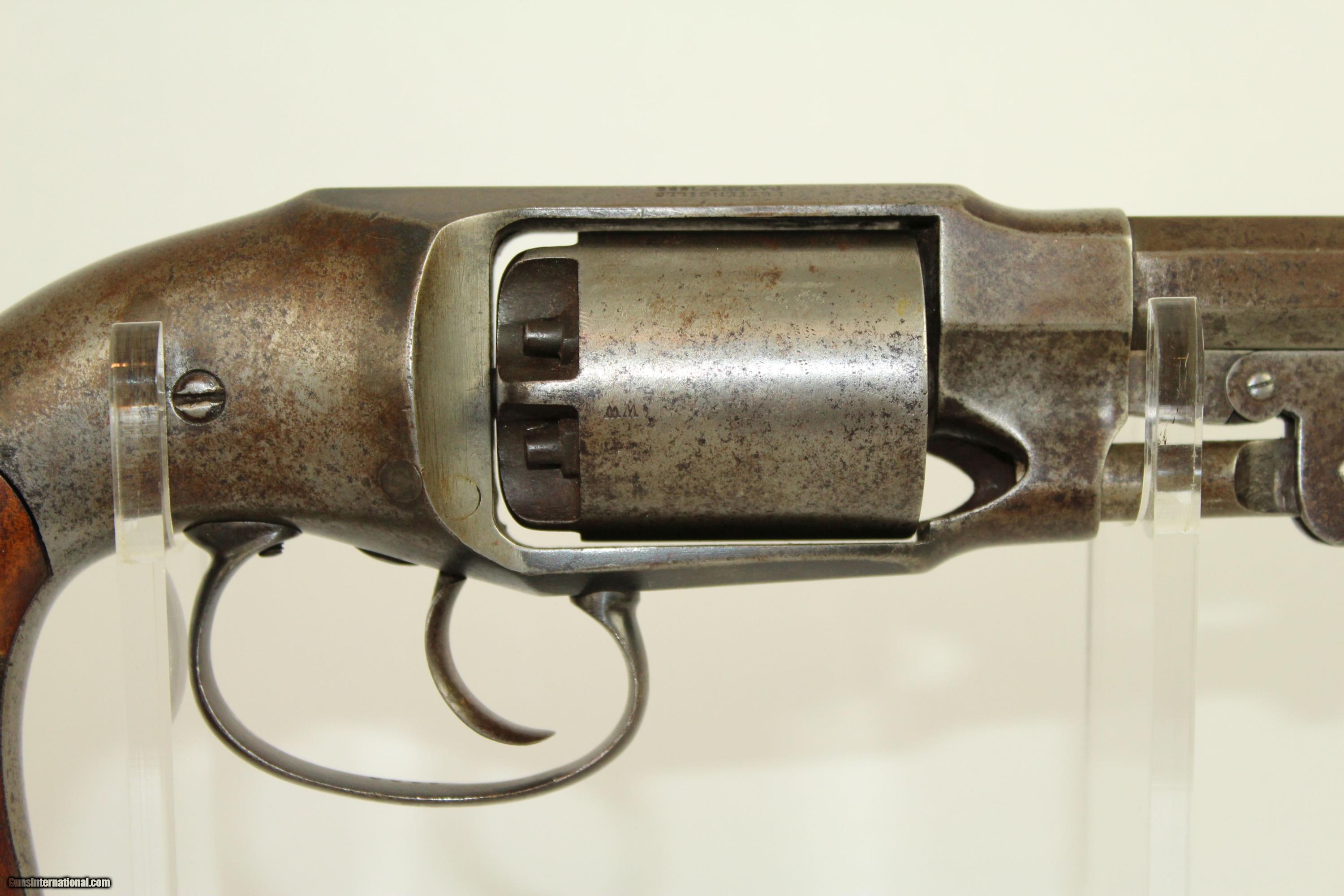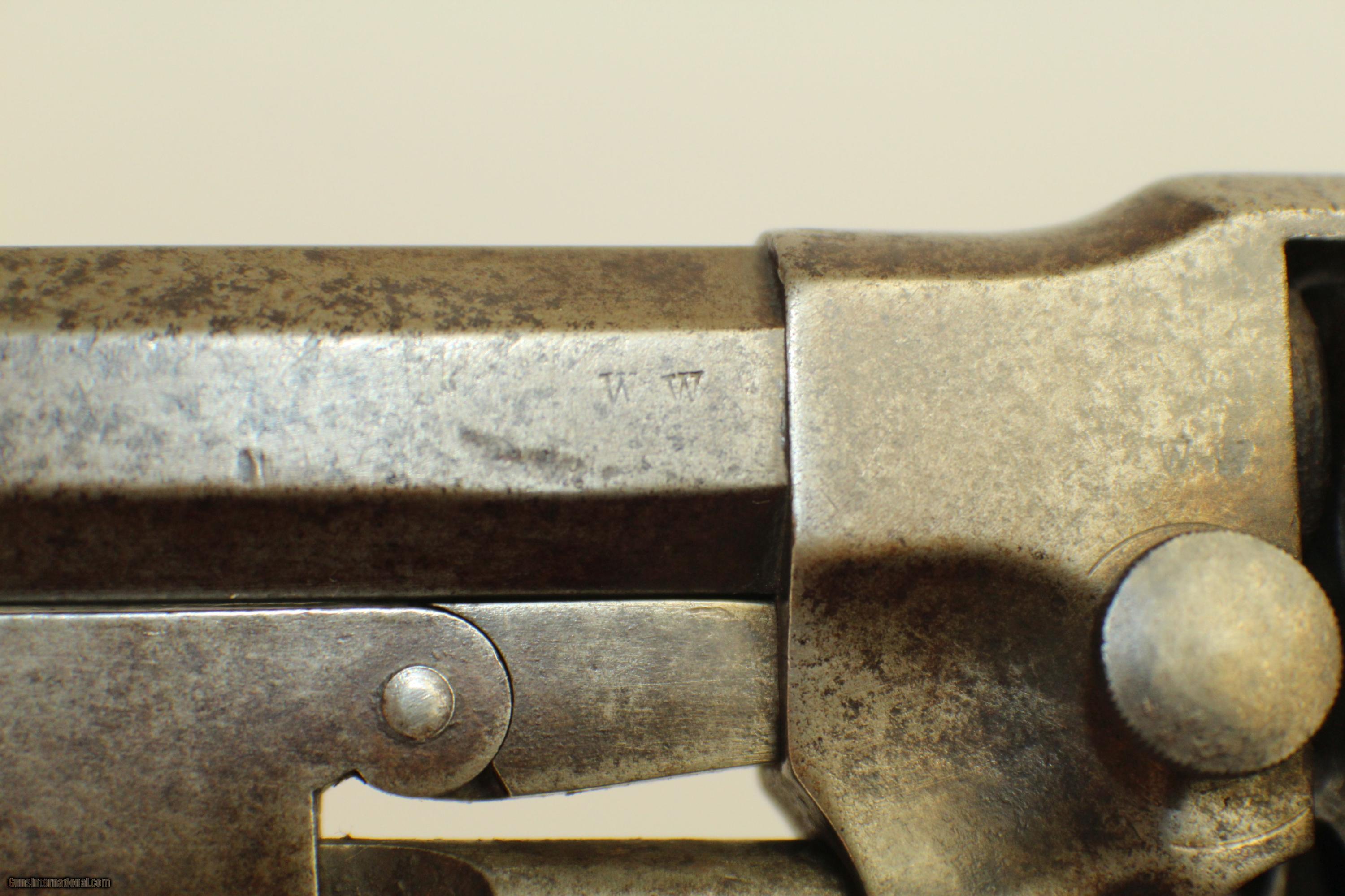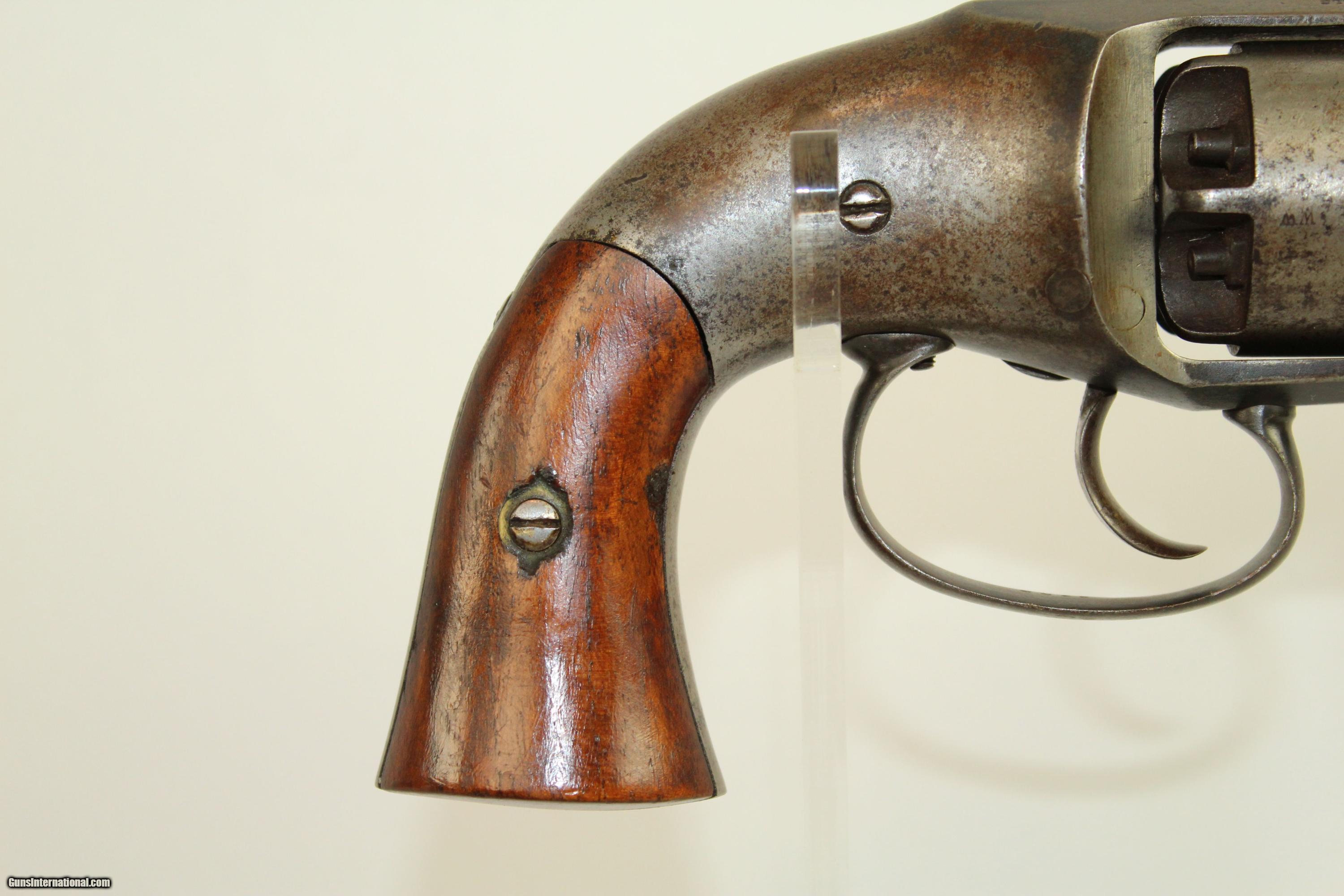 Description: CIVIL WAR Antique C.S. Pettengill CAVALRY Revolver U.S. Martially Inspected & Issued MILITARY Pistol Here we present an antique C.S. Pettengill Double Action Army Revolver, made during the American Civil War, circa 1863, by Rogers, Spencer & Co. in Willow Vale, NY. Only about 3,400 were made in total. The design was a double action hammerless percussion mechanism initially developed by C.S. Pettengill in the 1850s. In 1856 he was granted a patent for it. By 1857, Samuel Colt’s patents regarding the firing mechanism were expiring and Pettengill’s initial design was improved by Edward A. Raymond and Charles Robotaille, for which they received a patent in 1858. The final improvements were made and patented in 1862 by Henry S. Rogers, partner in the firm Rogers, Spencer & Co. It was Rogers and his company which produced the Pettengill Revolver. The double action trigger accomplished three things: 1) it revolved the cylinder, 2) dropped the hammer and 3) cocked the hammer again for the next shot. The concept of the Pettengill revolver was well-received, especially as a cavalry weapon, and an order was made of 5,000 by the U.S. Ordnance Department. However, the pistol was trialed in June 1862 and it failed. The bugs were worked out, but the government cut their contract down to only 2,000 pieces. The contract was fulfilled at the end of 1862. Per Flayderman, “The 3rd Michigan Cavalry were issued 500 of them. Other mounted outfits issued lesser amounts were the 3rd and 5th Missouri Militia; 1st Arkansas; 3rd Illinois; 3rd Kentucky.” Unfortunately, this was the end of production for the Pettengill. Rogers, Spencer & Co. would go on to purchase the patent for a single action revolver from Austin T. Freeman, quite similar to the Remington Army, and sell 5,000 of them to the government in 1865. It is no coincidence that the front half of the Pettengill and the Rogers, Spencer & Co. look so similar. They are actually identical. Never issued, what some collectors deem the best revolver of the Civil War sat in storage in New York until being purchased by Bannerman & Sons and sold as surplus in 1901. This is a very large, dragoon-sized pistol with a very smooth double action trigger. It shows government inspection marks on major components in the initials “W.W.”, which are those of William Walter. The serial numbers match from the frame to the cylinder, but the grips are numbered slightly prior to this gun. The overall condition of this specimen is very good plus. The metal surfaces have a light brown patina. The markings are clear and legible. The grips are in fine condition. The bore is in good condition and the action is fine. Own the original! This is a legitimate antique and not a reproduction. Barrel is octagonal and 7-1/2 inches in length. Caliber: .44 percussion Bore is in good condition. The firing mechanism is functional. Overall condition as seen in photos. Here is a Civil War cavalry revolver that even most collectors go their whole lives and never see. Very Fast. Very Safe. FREE SHIPPING WORLDWIDE. Delivered directly to your door by express mail! Guaranteed AUTHENTIC & Includes CERTIFICATE OF AUTHENTICITY. ancestryguns $4500 #21745 SOLD Antique: Yes |