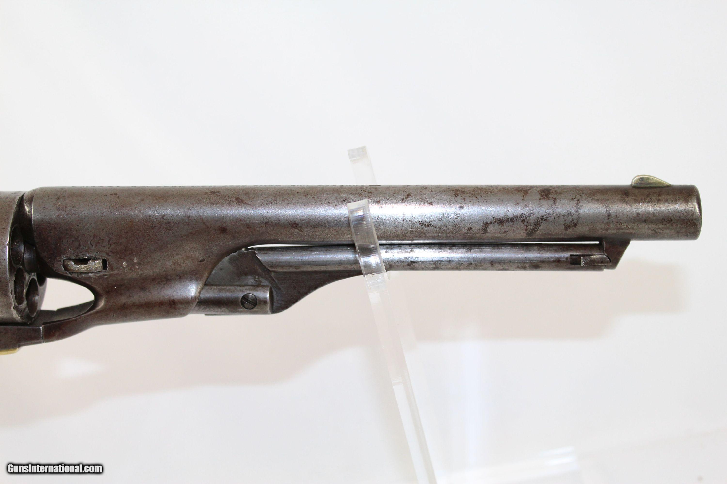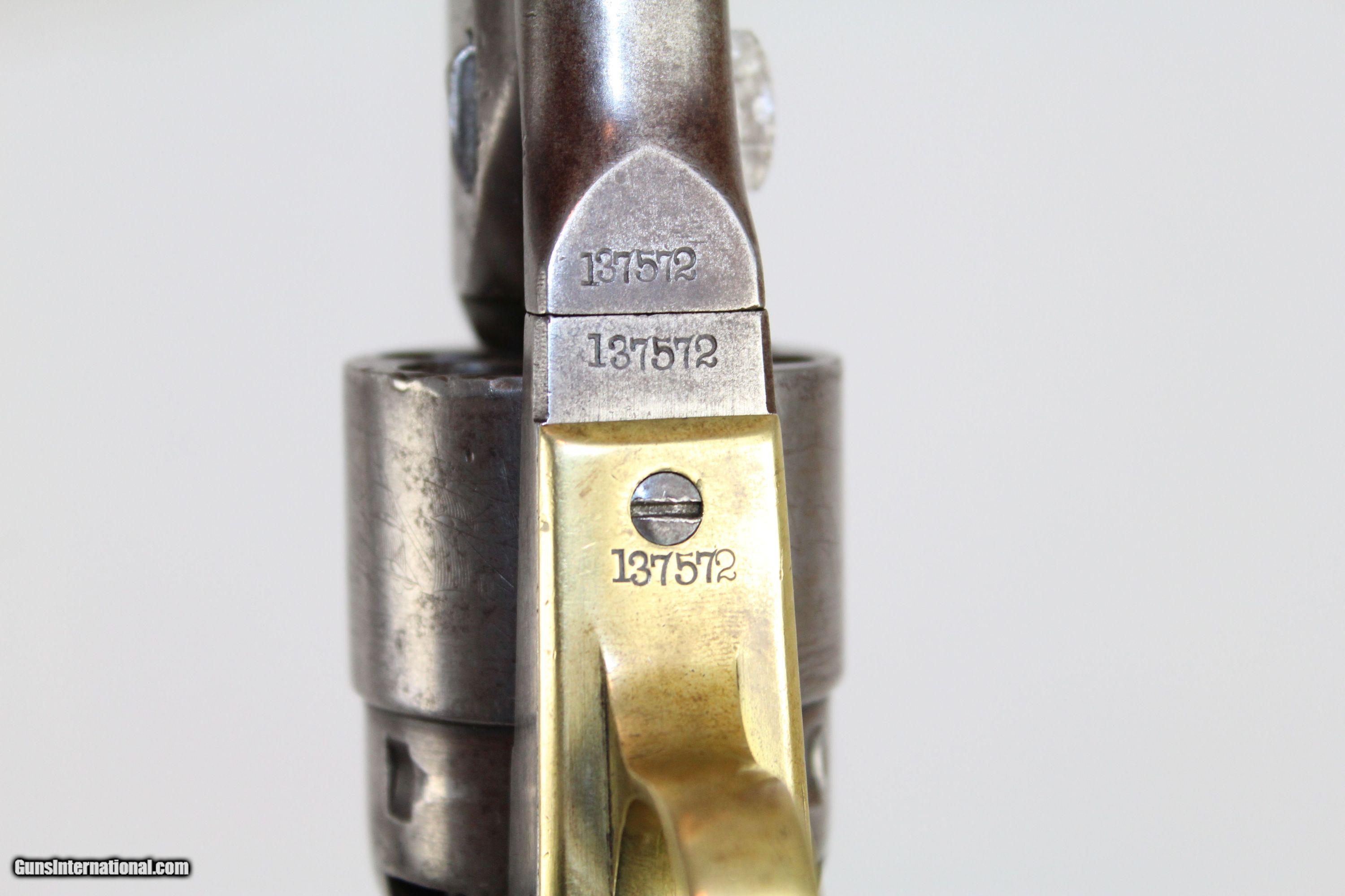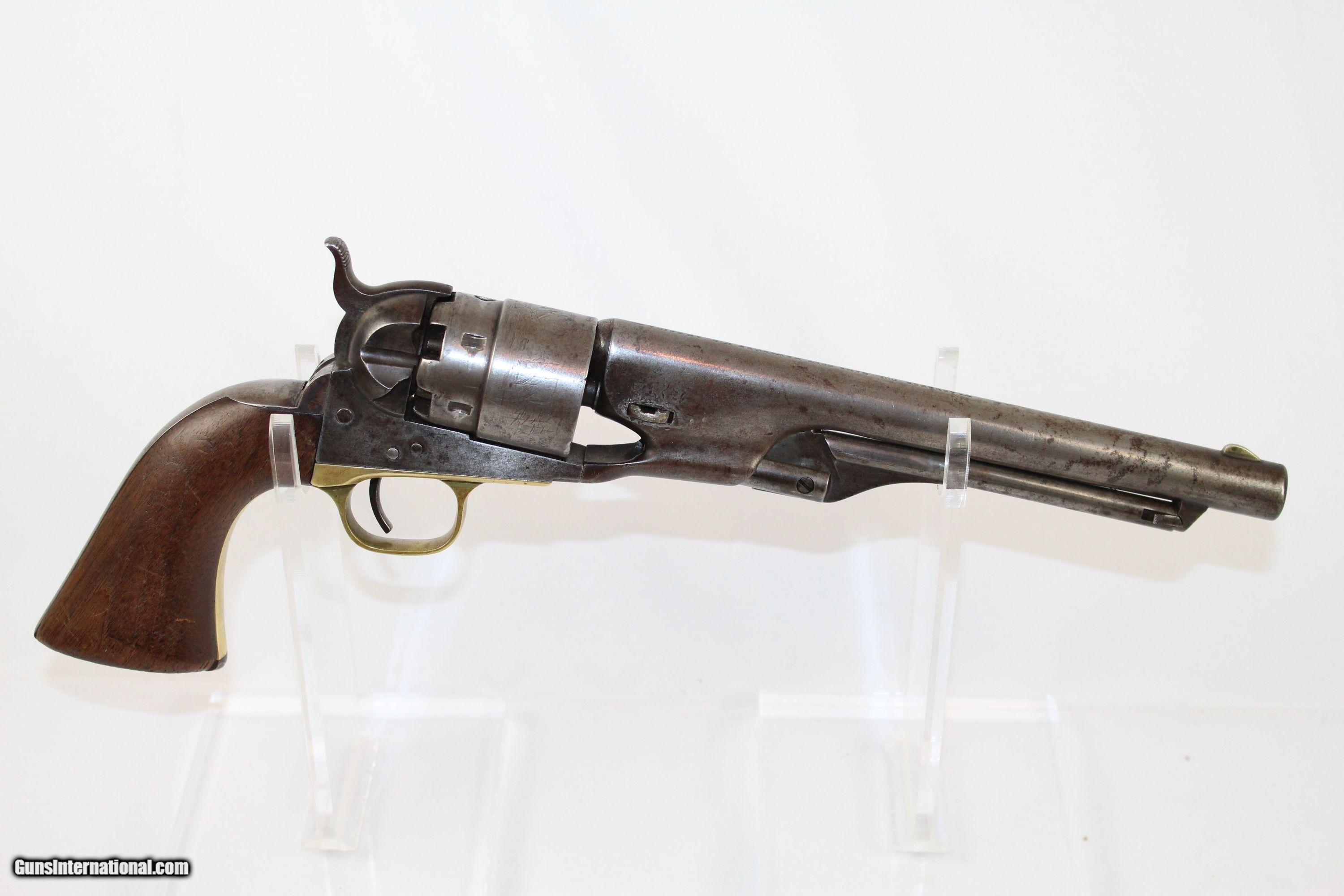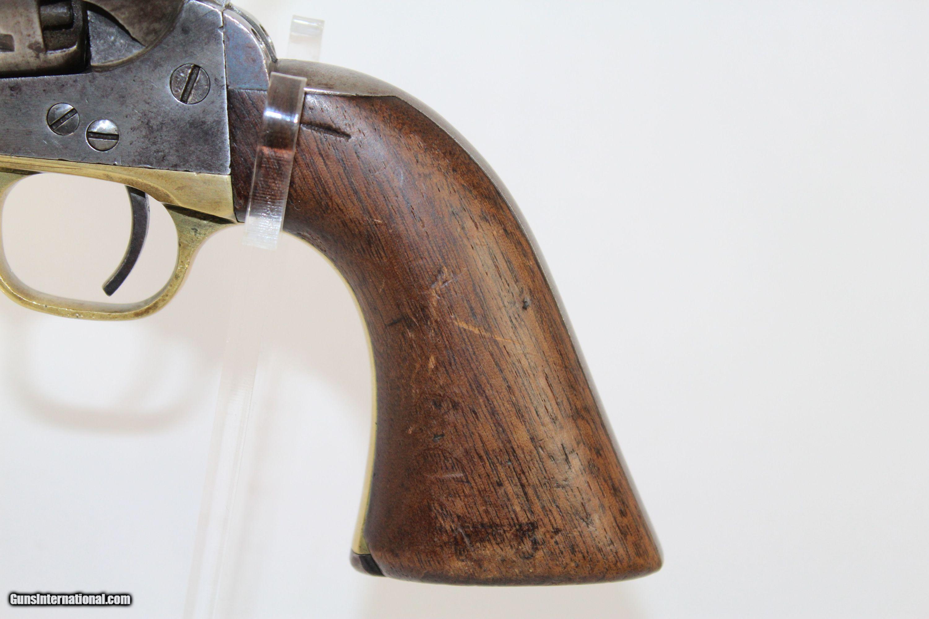 Description: CIVIL WAR Antique Colt 1860 ARMY Revolver Made in 1863 for U.S. Military Contract Here we present an antique Colt Model 1860 Army Revolver, made in 1863 in Hartford, Connecticut. The Model 1860 was the single most used pistol of the American Civil War. Over 200,000 were made from 1860 to 1873, and 156,000 were made by the end of the war in 1865. The 1860 Army was Samuel Colt’s finest achievement to that point, having finally developed a large caliber revolver that weighed about 2 lbs. 10 oz. to the famous Dragoon’s 4 lbs. 4 oz., and was adopted en masse by the U.S. government with huge contracts. The revolver was well balanced in hand, and had a long enough barrel to be effective when utilized as a carbine with the attachable shoulder stock. This revolver represented unprecedented firepower from a handgun in the field at the time and was especially suited to Cavalry. The Confederacy, lacking in manufacturing capabilities though they were, managed to produce limited numbers of copies, and battlefield pickups of the 1860 Army were highly coveted. The 1860 Army went on to serve the U.S. military even after the Civil War and into the Indian Wars, until production of Colt’s 1873 Single Action Army created new waves in the revolver market, and again achieved great success in the military and commercial markets. The cylinder roll engraving on the 1860 Army features a scene from the Battle of Campeche executed by American engraver Waterman Ormsby. The engraving pays homage to Texas in their fight with the Mexican government for independence. During this particular battle, the Mexican Navy wielded two ironclad steamers, while the Texans were armed with a variety of wooden ships, led by Commodore Edwin Moore. The scene also appears on the cylinders of the Colt 1851 and 1861 Navy Revolvers. The overall condition is very good. The iron bears an even gray patina. The markings are clear. The walnut grip is in very good condition with still visible government inspector cartouches on each side. The bore is clean with good rifling. The action is excellent. Own a piece of Civil War history! Own the original! This is a legitimate antique and not a reproduction. Barrel is 8 inches. Caliber: .44 Percussion Overall condition as seen in photos. Very Fast. Very Safe. FREE SHIPPING WORLDWIDE. Delivered directly to your door by express mail! Guaranteed AUTHENTIC & Includes CERTIFICATE OF AUTHENTICITY. ancestryguns $2600 #5184 SOLD Antique: Yes |