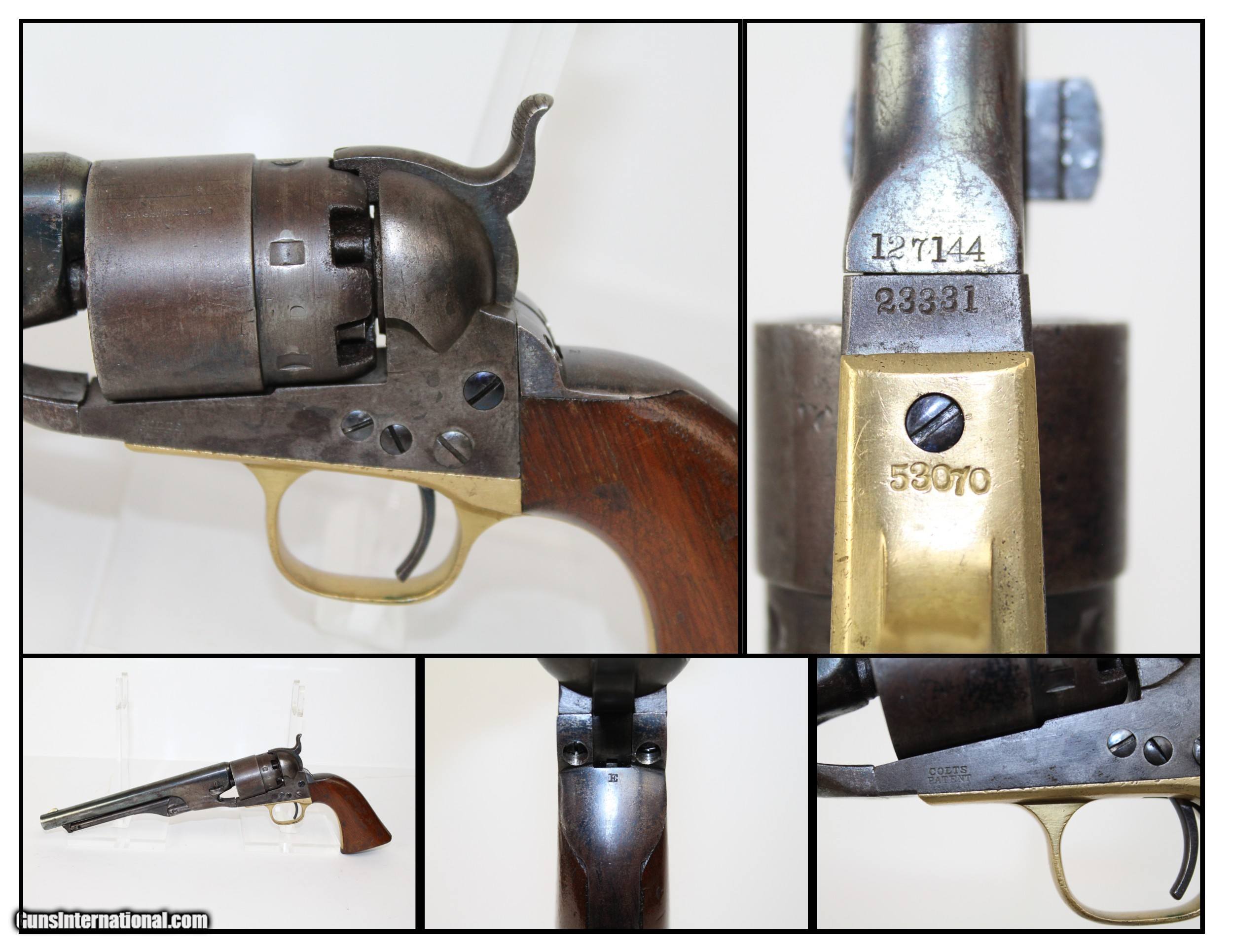 Description: CIVIL WAR Antique Colt 1860 Model ARMY Revolver Most Used Handgun of the American Civil War! Here we present an antique Colt Model 1860 Army Percussion Revolver, made during the Civil War in Hartford, Connecticut. The Model 1860 was the single most used pistol of the American Civil War. Over 200,000 were made from 1860 to 1873, and 156,000 were made by the end of the war in 1865. The 1860 Army was Samuel Colt’s finest achievement to that point, having finally developed a large caliber revolver that weighed about 2 lbs. 10 oz. to the famous Dragoon’s 4 lbs. 4 oz., and was adopted en masse by the U.S. government with huge contracts. The revolver was well balanced in hand but had a long enough barrel to be effective when utilized as a carbine with the attachable shoulder stock. This revolver represented unprecedented firepower from a handgun in the field at the time and was especially suited to Cavalry. The Confederacy, lacking in manufacturing capabilities though they were, managed to produce limited numbers of copies, and battlefield pickups of the 1860 Army were highly coveted. The 1860 Army went on to serve the U.S. military even after the Civil War and into the Indian Wars, until production of Colt’s 1873 Single Action Army created new waves in the revolver market, and again achieved great success in the military and commercial markets. This one features a scarcer 4-screw frame that was made to attach a separate stock for more accurate fire. Though this one has mixed numbers, none of the numbers post-date the American Civil War. The top of the barrel is marked “ADDRESS COL. SAM COLT NEW YORK, US AMERICA”. The left side of the frame is marked “COLT’S PATENT/44 CAL”. The overall condition is very good. A good amount of blue finish remains on the back strap and barrel. The markings are clear and legible. The walnut grips are in great shape. The bore is clear and bright with good rifling. The action on this revolver is excellent. This historical Colt 1860 Army revolver would be a great one to shoot and is a very handsome Civil War period handgun. Own the original! This is a legitimate antique and not a reproduction. Barrel is 8 inches. Caliber: .44 Percussion Overall condition as seen in photos. Very Fast. Very Safe. FREE SHIPPING WORLDWIDE. Delivered directly to your door by express mail! Guaranteed AUTHENTIC & Includes CERTIFICATE OF AUTHENTICITY. ancestryguns $2650 #7012 SOLD Antique: Yes |