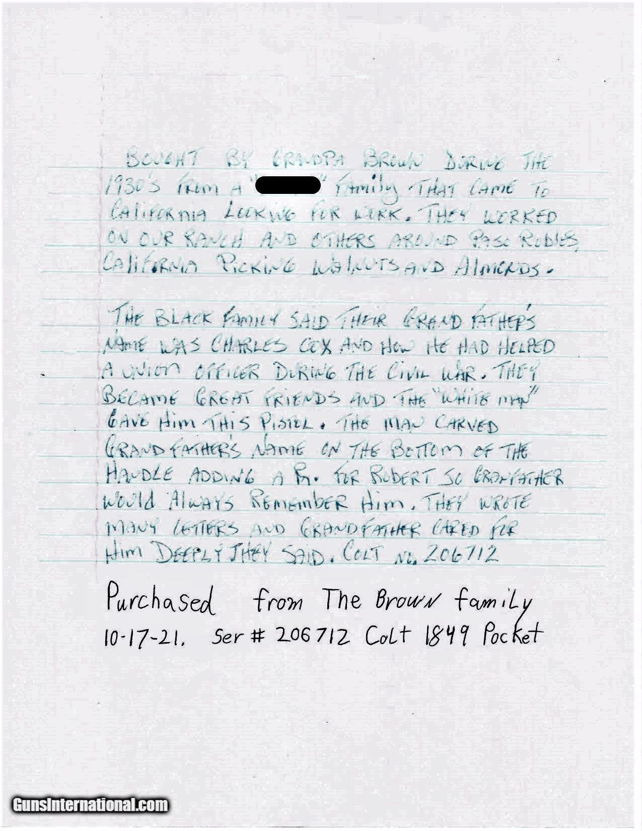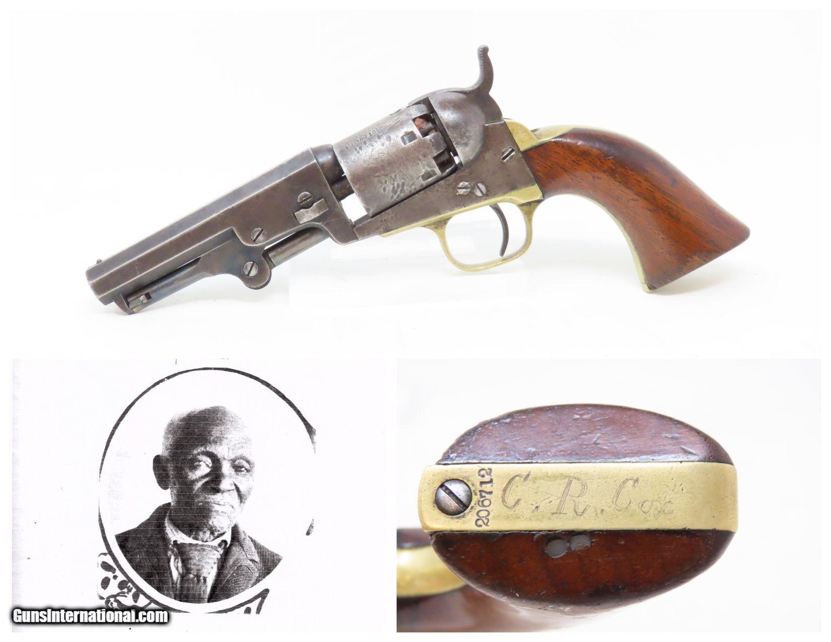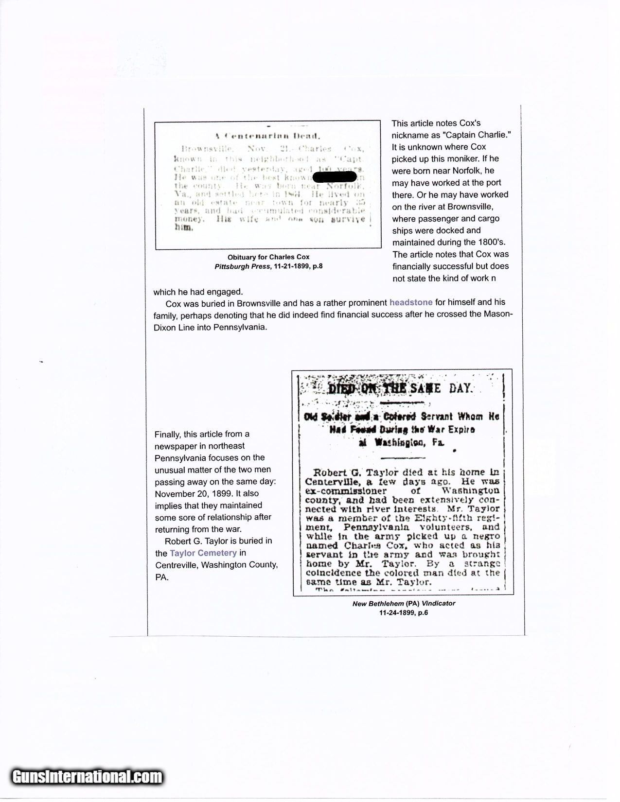 Description: CIVIL WAR Antique COLT Model 1849 .31 PERCUSSION Revolver with Inscription 85th PA INFANTRY REGIMENT HISTORY Here we present an antique Colt Model 1849 Pocket Revolver, made during the American Civil War in 1862 in Hartford, Connecticut. The Model 1849 was the everyman’s revolver and it was Samuel Colt’s most prolific invention. It is a single action 6-shot .31 caliber revolver with a stagecoach holdup cylinder scene, a trademark of Colt’s. This example is inscribed “C. R. Cox” on the bottom of the grip. Included with this revolver is bit of provenance tying this revolver to its previous owner, Charles Cox, an African American man who was liberated by the 85th PA Infantry as they came through City Point, Virginia. Cox was described in newspapers of his day as being a close friend of Lieutenant Robert Gillis Taylor of Company E of the 85th Pennsylvania Infantry Regiment during the Civil War, who was wounded at the Battle of Seven Pines. It seems that Cox and Taylor became attached after their initial meeting, and Cox may have been an aid or valet or servant of Taylor’s during the war. After Taylor was discharged due to his injury, Cox accompanied Taylor to the southwestern corner of Pennsylvania, both of them settling in Brownsville in Fayette County. Taylor appears to have overcome his injury and gone on to work for a railroad in Pittsburgh and as Washington County commissioner. Cox, meanwhile, is mentioned as gaining the moniker “Captain Charlie” in his neighborhood, living on an old estate near town and doing well for himself financially. He married to Catherine Peyton Cox and they had a son, both of whom survived him when he died. Interestingly, both Charles and his seeming sponsor Robert Taylor passed away on the same day, November 20, 1899. Archival newspapers included are: The Pittsburgh Press 21 Nov 1899, Pittsburgh Post-Gazette 22 Nov 1899, Pittburgh Daily Post 21 Nov 1899, The Weekly Courier 2 Oct 1891. The photo of Charles Cox is from Hart’s History & Directory of Fayette County, 1904. The overall condition is very good. Original finish and patina. Visible stagecoach holdup cylinder scene. The action is excellent. The bore is in good condition with sharp rifling. The grip is smooth and solid, showing a bit of honest wear. Numbers match. Own the original! This is a legitimate antique and not a reproduction. Barrel is 4 inches. Caliber: .31 Percussion Overall condition as seen in photos. Very Fast. Very Safe. FREE SHIPPING WORLDWIDE. Delivered directly to your door by express mail! Guaranteed AUTHENTIC & Includes CERTIFICATE OF AUTHENTICITY. ancestryguns $3545 #226067 SOLD Antique: Yes |