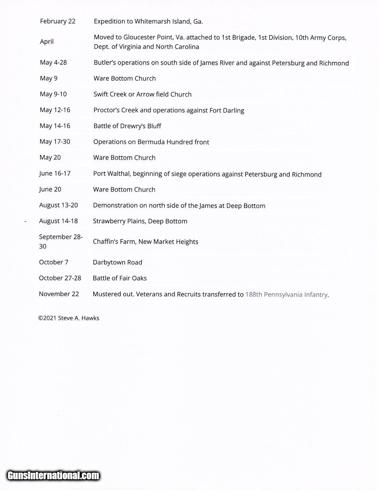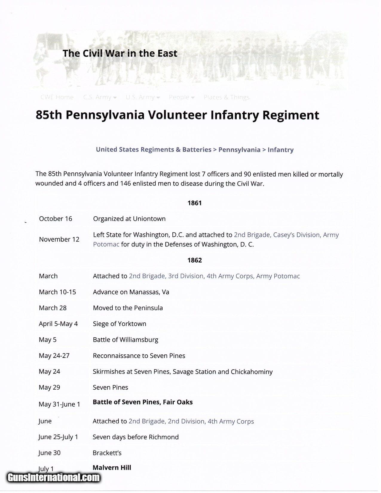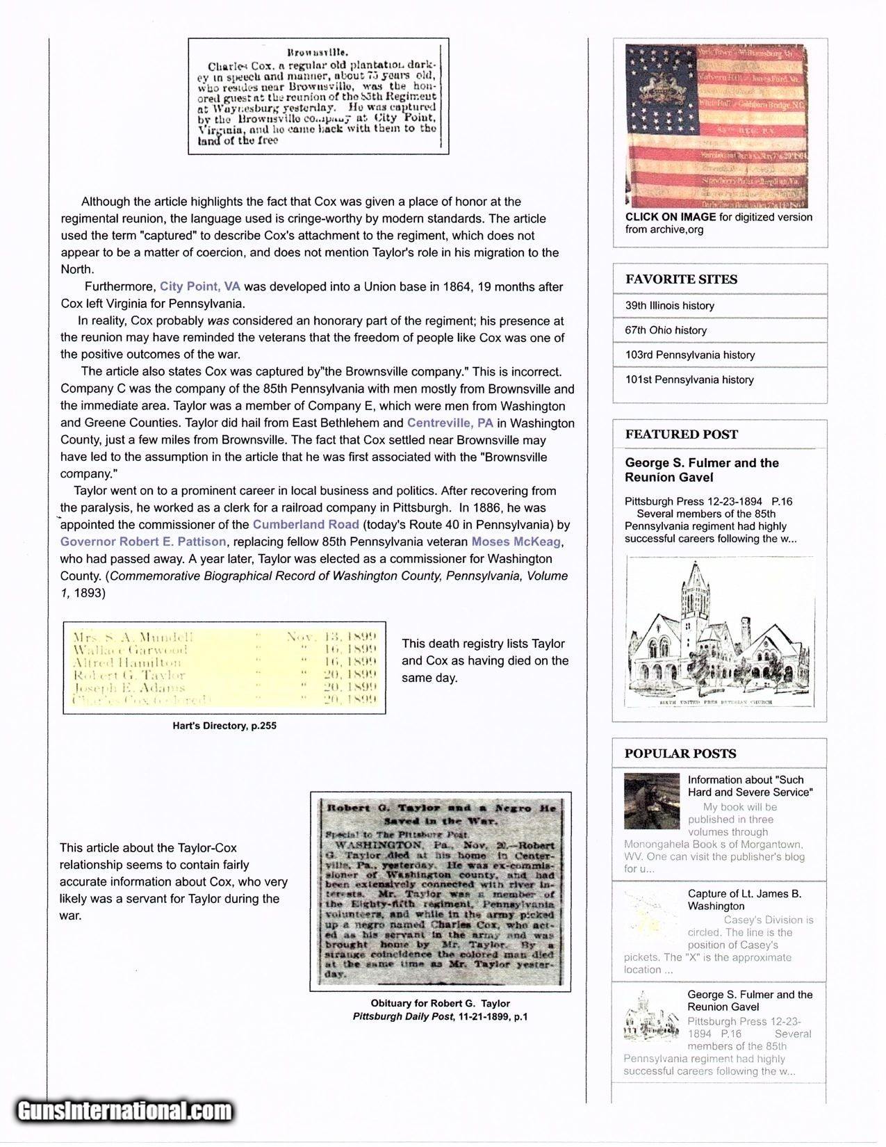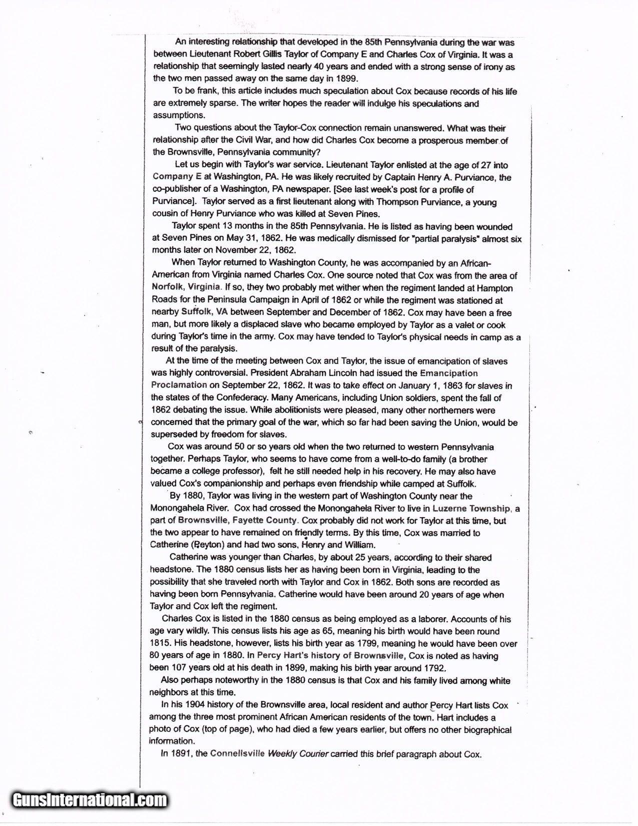 Description: CIVIL WAR Antique COLT Model 1849 .31 PERCUSSION Revolver with Inscription 85th PA INFANTRY REGIMENT HISTORY Here we present an antique Colt Model 1849 Pocket Revolver, made during the American Civil War in 1862 in Hartford, Connecticut. The Model 1849 was the everyman’s revolver and it was Samuel Colt’s most prolific invention. It is a single action 6-shot .31 caliber revolver with a stagecoach holdup cylinder scene, a trademark of Colt’s. This example is inscribed “C. R. Cox” on the bottom of the grip. Included with this revolver is bit of provenance tying this revolver to its previous owner, Charles Cox, an African American man who was liberated by the 85th PA Infantry as they came through City Point, Virginia. Cox was described in newspapers of his day as being a close friend of Lieutenant Robert Gillis Taylor of Company E of the 85th Pennsylvania Infantry Regiment during the Civil War, who was wounded at the Battle of Seven Pines. It seems that Cox and Taylor became attached after their initial meeting, and Cox may have been an aid or valet or servant of Taylor’s during the war. After Taylor was discharged due to his injury, Cox accompanied Taylor to the southwestern corner of Pennsylvania, both of them settling in Brownsville in Fayette County. Taylor appears to have overcome his injury and gone on to work for a railroad in Pittsburgh and as Washington County commissioner. Cox, meanwhile, is mentioned as gaining the moniker “Captain Charlie” in his neighborhood, living on an old estate near town and doing well for himself financially. He married to Catherine Peyton Cox and they had a son, both of whom survived him when he died. Interestingly, both Charles and his seeming sponsor Robert Taylor passed away on the same day, November 20, 1899. Archival newspapers included are: The Pittsburgh Press 21 Nov 1899, Pittsburgh Post-Gazette 22 Nov 1899, Pittburgh Daily Post 21 Nov 1899, The Weekly Courier 2 Oct 1891. The photo of Charles Cox is from Hart’s History & Directory of Fayette County, 1904. The overall condition is very good. Original finish and patina. Visible stagecoach holdup cylinder scene. The action is excellent. The bore is in good condition with sharp rifling. The grip is smooth and solid, showing a bit of honest wear. Numbers match. Own the original! This is a legitimate antique and not a reproduction. Barrel is 4 inches. Caliber: .31 Percussion Overall condition as seen in photos. Very Fast. Very Safe. FREE SHIPPING WORLDWIDE. Delivered directly to your door by express mail! Guaranteed AUTHENTIC & Includes CERTIFICATE OF AUTHENTICITY. ancestryguns $3545 #226067 SOLD Antique: Yes |