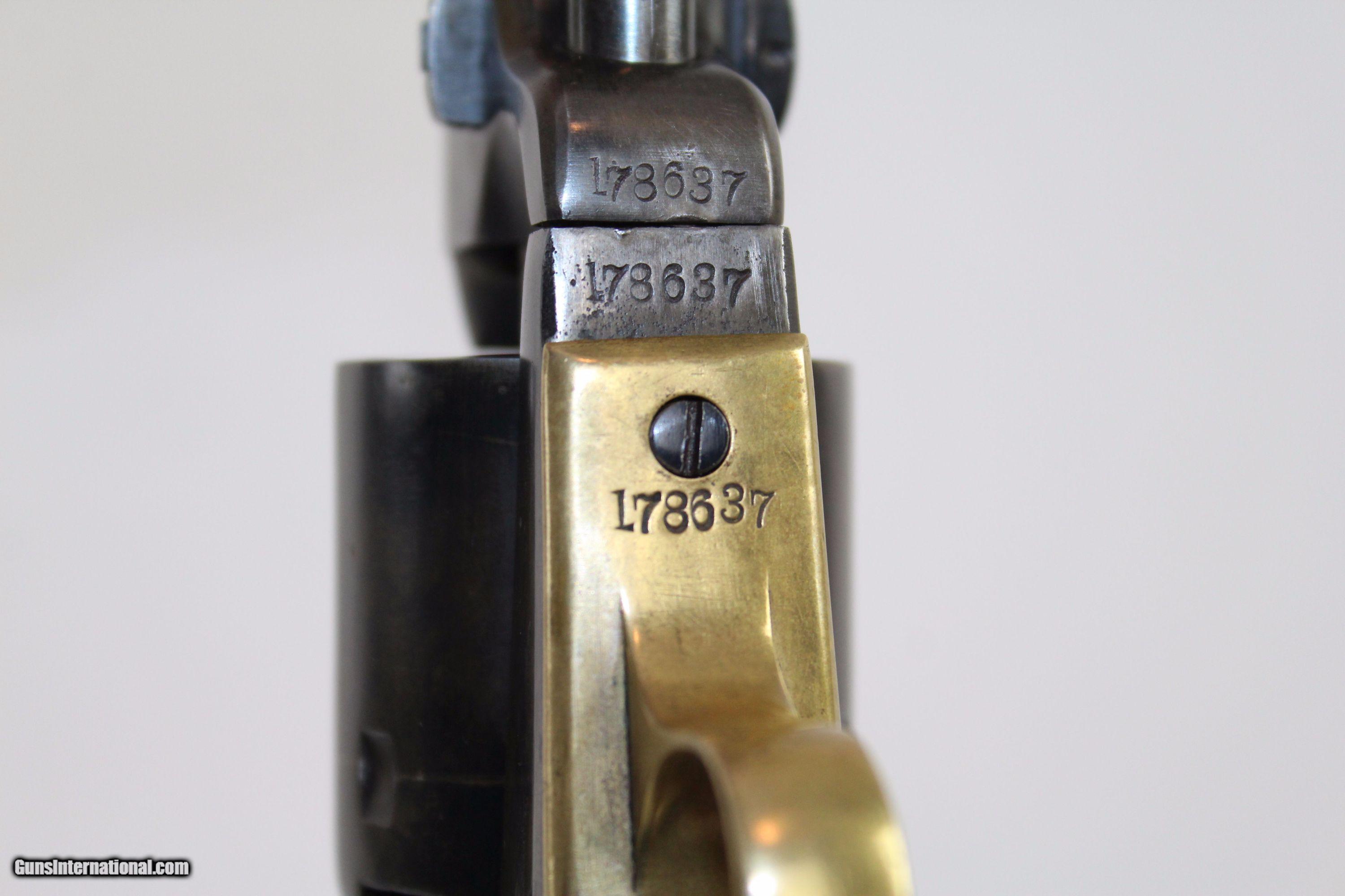 Description: CIVIL WAR Antique COLT Model 1851 NAVY Revolver Made During the Civil War 1864 Here we present an antique Colt 1851 Navy Revolver, made in 1864, in Hartford, Connecticut. The 1851 Navy was one of Colt’s most famous and successful lines, reaching a production total of 257,348 from 1850 to 1873 (right up to the time of SAA production) from both Hartford and London factories. From Hartford alone, 185,000 were made by the end of the American Civil War. Many of these saw service during the conflict on both sides. There were some military purchases and lots of private purchases by soldiers going off to war. In addition, the Model 1851 was a favorite of “Wild Bill” Hickok, who carried two of these most famously in his red sash. The top of the barrel reads “—ADDRESS COL. SAML. COLT NEW-YORK U.S. AMERICA—”. The overall condition is good to very good. The metal surfaces have been polished and refinished. The markings are a bit shy, especially on the barrel, but still legible. The serial numbers match except the unnumbered replacement wedge. The walnut grips are smooth and solid. The bore has good rifling and clean surfaces. The action is strong. Here is a fantastic and affordable example of a Civil War Colt Navy! Own the original! This is a legitimate antique and not a reproduction. Barrel is 7-1/2 inches. Caliber: .36 Percussion Overall condition as seen in photos. Very Fast. Very Safe. FREE SHIPPING WORLDWIDE. Delivered directly to your door by express mail! Guaranteed AUTHENTIC & Includes CERTIFICATE OF AUTHENTICITY. ancestryguns $1850 #5117 SOLD Antique: Yes |