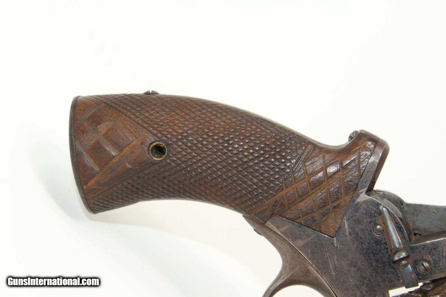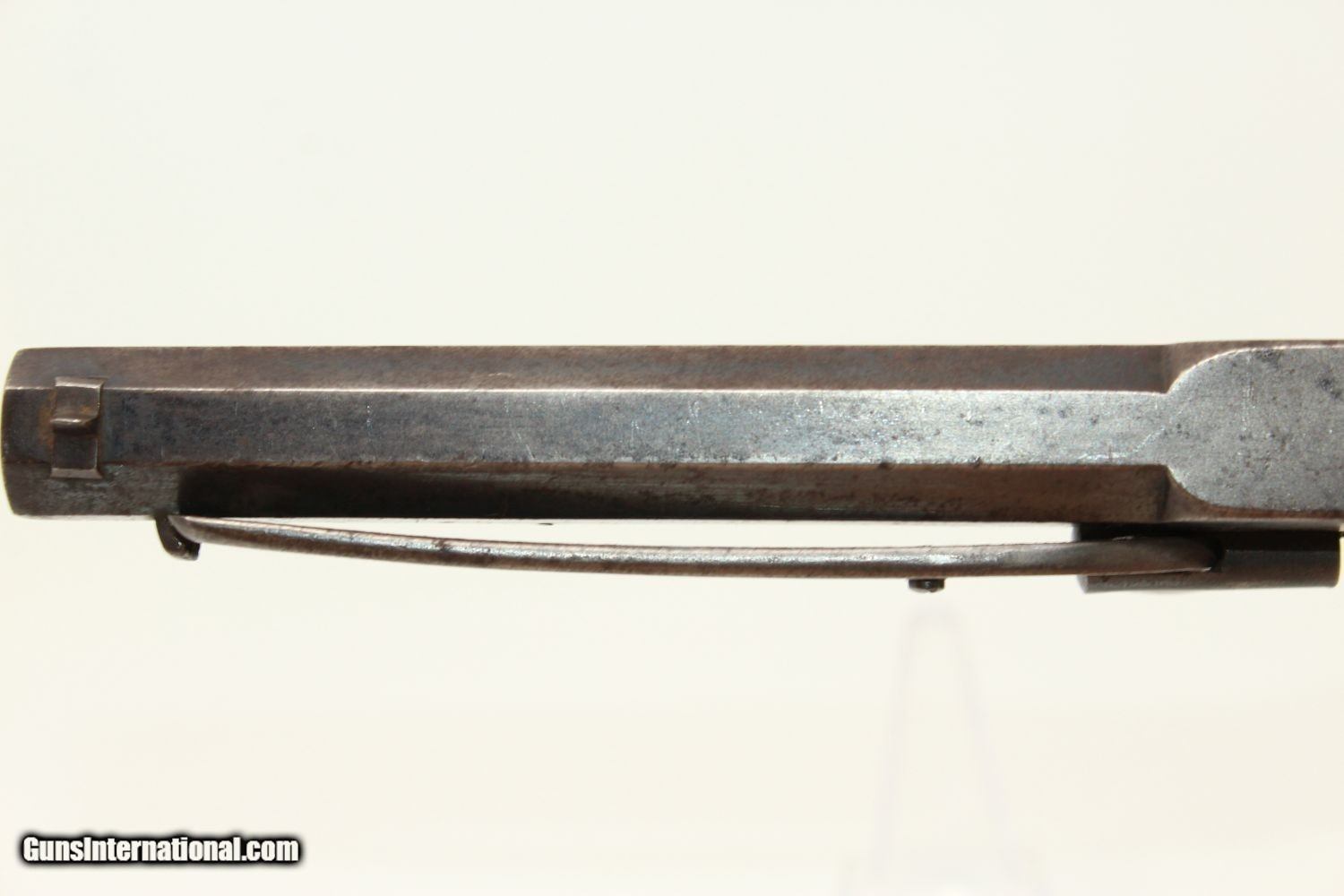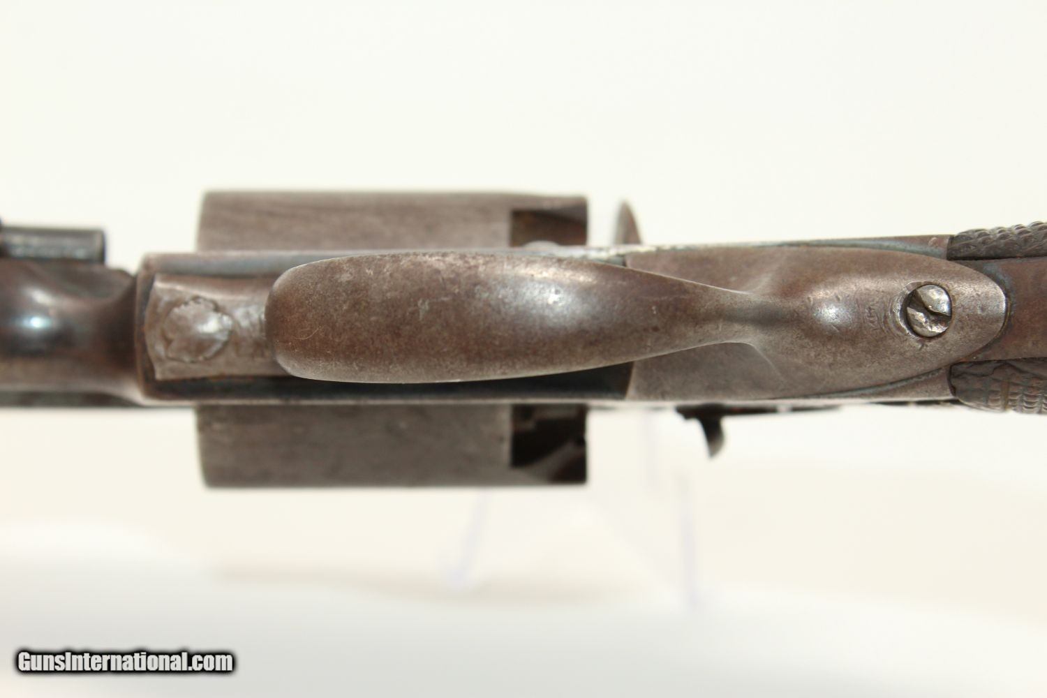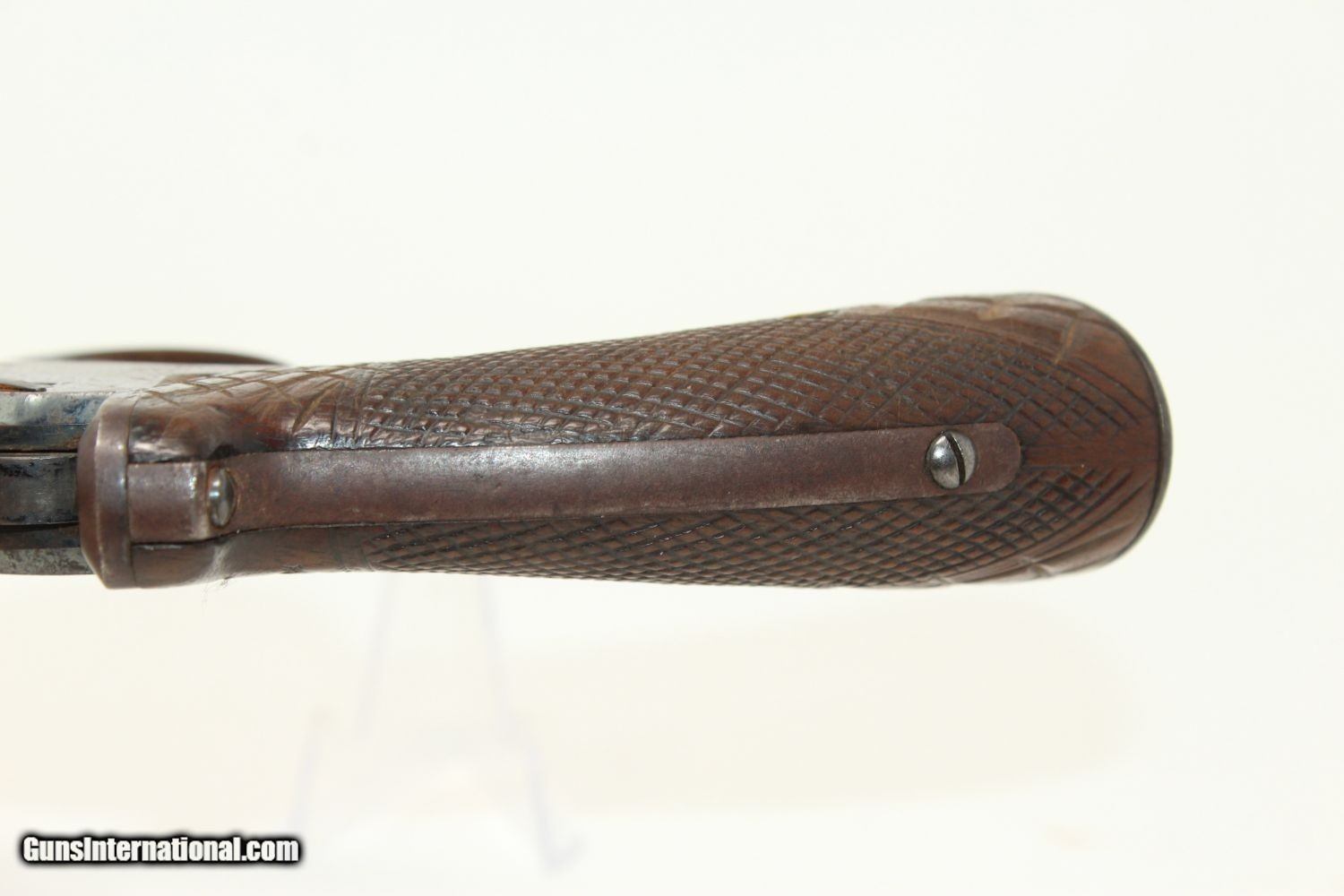 Description: CIVIL WAR Antique MASSACHUSETTS ARMS Adams & Kerr Patent NAVY Revolver 1861 RARE; 1 of Only 1,000 Manufactured Here we present an antique Massachusetts Arms Co. Adams & Kerr Patent Navy Double Action Revolver, manufactured circa 1861. Only about 1,000 of these were produced, this one being in the 800 range. Brit Robert Adams is credited with patenting the first successful double action revolver in 1851. The Adams revolvers were initially double action only. They were well-received among professionals in the 1850s and served with the British East India Company, with British military officers, and were eventually popular among officers in the South during the American Civil War in the early 1860s, imported from Europe. The US government purchased about 600 of that number when the Civil War began. This revolver was made by Mass. Arms, an American company with patents licensed from Adams and another Brit inventor by the name of Kerr (the rammer). This one has an interesting sliding safety on the right side that blocks the cylinder. The front screw of the trigger guard features a field expedient repair, a rather interesting solution to a lost screw, a piece has been hammered home and peened. The top of the frame is marked “MANUFACTURED BY/MASS. ARMS CO./CHICOPEE FALLS”. The left side of the frame is marked “ADAMS PATENT/MAY 3, 1858”. The ejector is marked “KERR’S PATENT/APRIL 14, 1857”. The right side of the frame is marked “PATENT/JUNE 3, 1856”. The overall condition is Near Fine. 30-40% of the original blue remains. The action is strong and smooth. The bore is in very good condition with sharp rifling. All the markings are clear. The grips are in great conditions and feel solid and feature a personal touch of large hand-checkering at the top and bottom. A unique piece that can be shown off in any collection and a great example of transitional technology as well as a piece of Civil War history! Own the original! This is a legitimate antique and not a reproduction. Barrel is 6 inches. Caliber: .38 Percussion Overall condition as seen in photos. Very Fast. Very Safe. FREE SHIPPING WORLDWIDE. Delivered directly to your door by express mail! Guaranteed AUTHENTIC & Includes CERTIFICATE OF AUTHENTICITY. ancestryguns $3300 #190706 SOLD Antique: Yes |