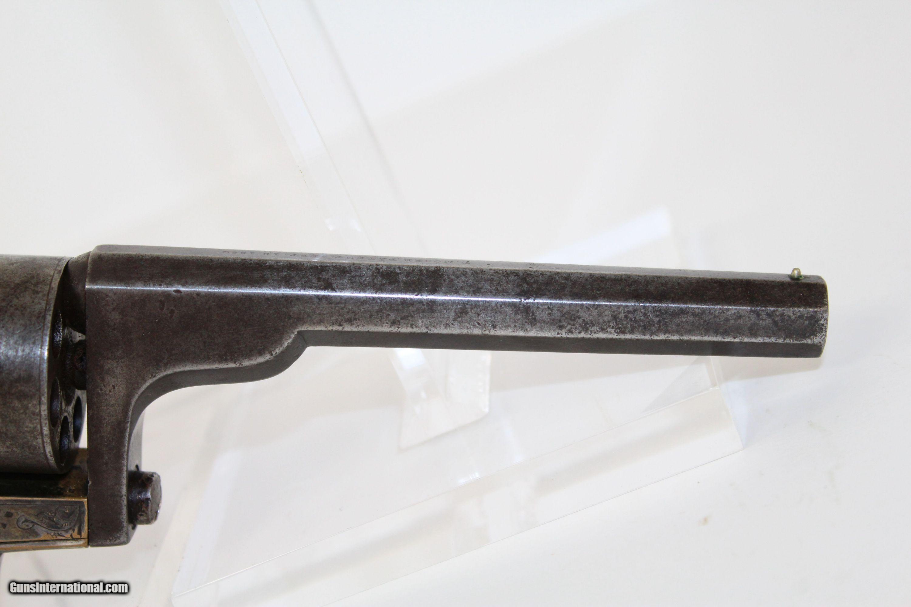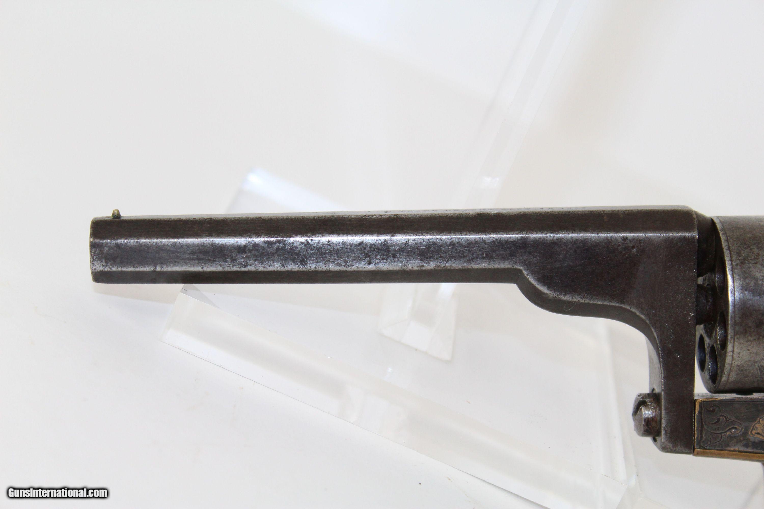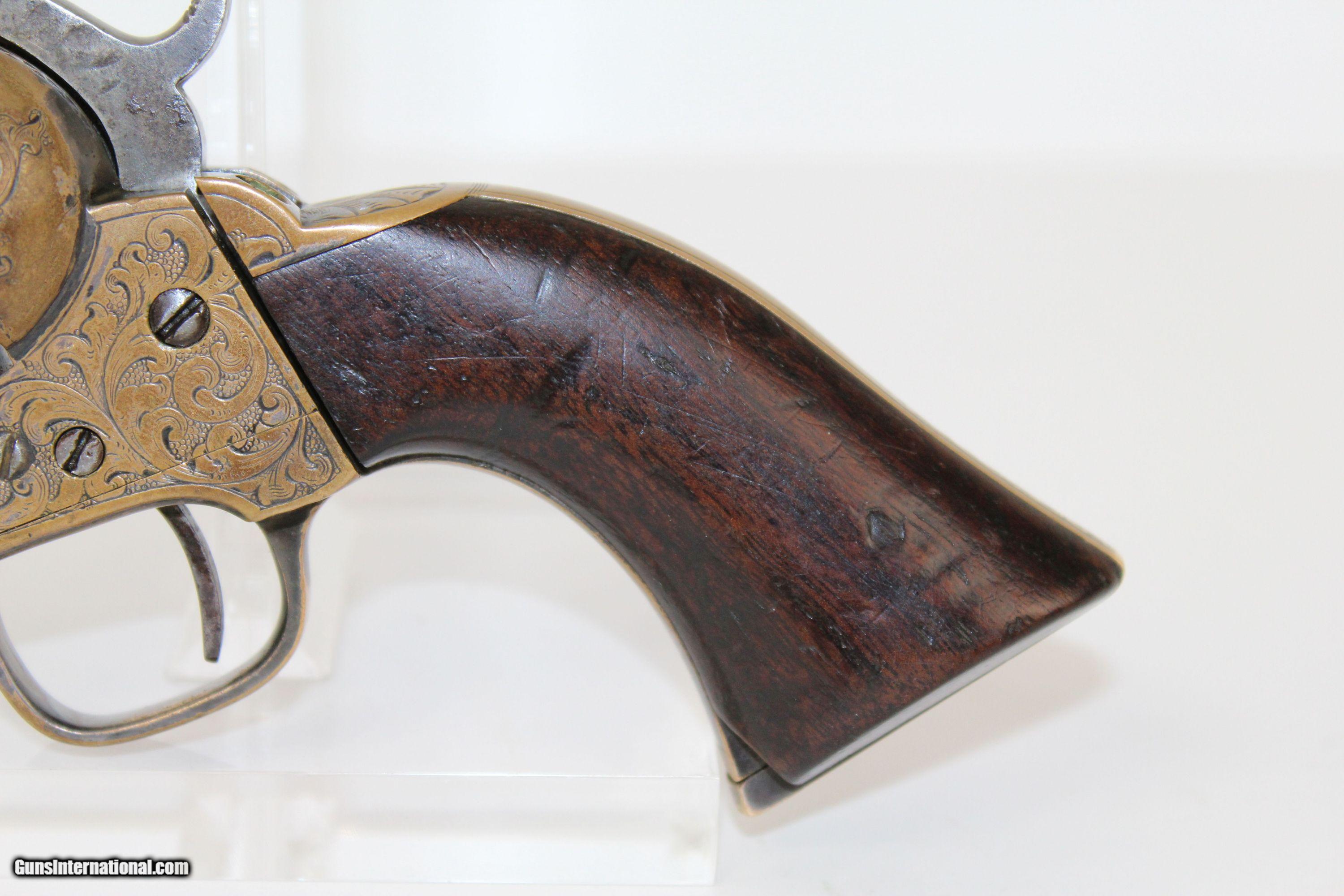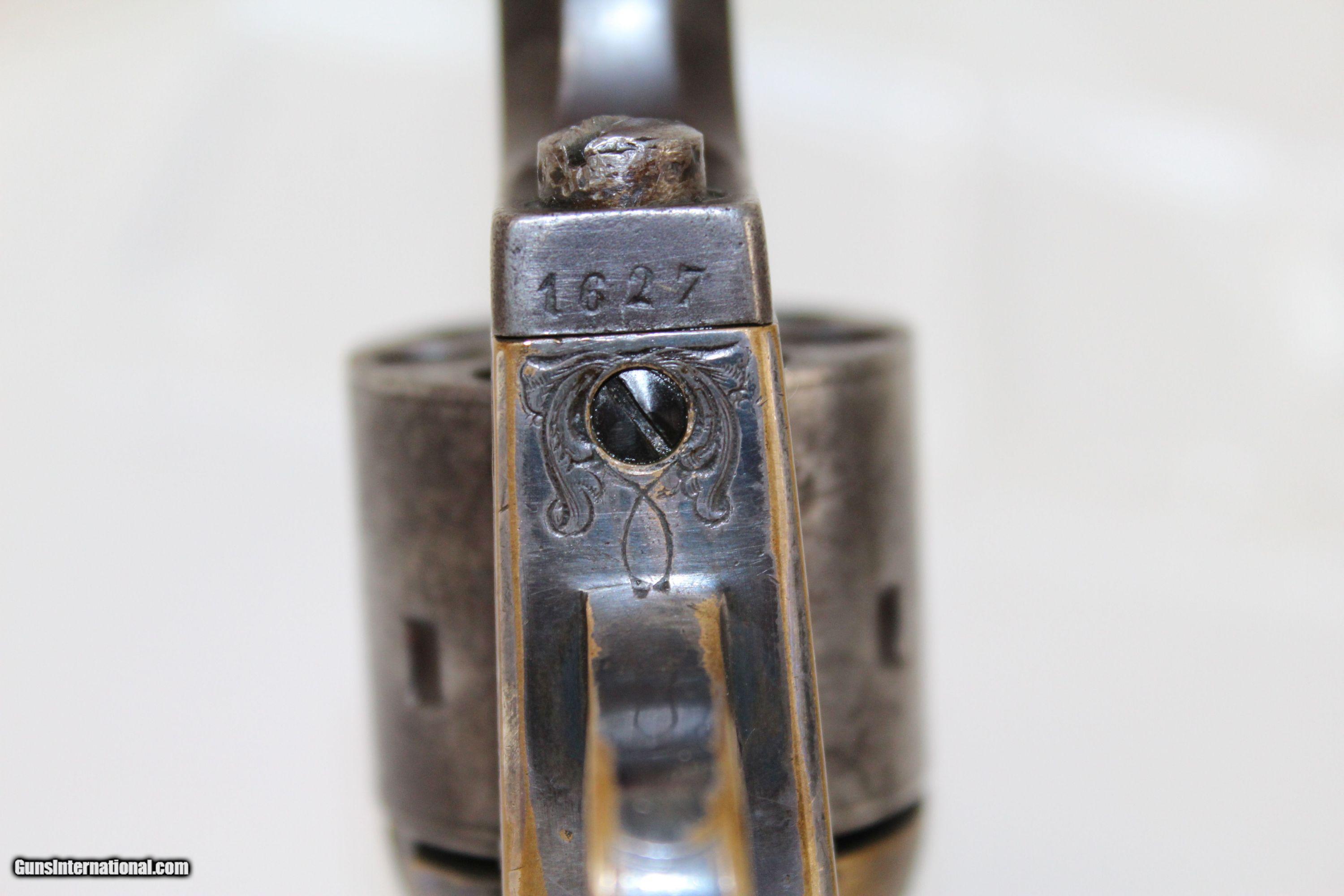 Description: CIVIL WAR Antique MOORE’S Patent Belt Revolver Scarce & Engraved Civil War Revolver Here we present an antique Engraved Moore’s Patent Firearms Co. Single Action Belt Revolver. These revolvers were made in Brooklyn, New York from 1861-1863 and number less than 8,000 in total. It is a very interesting revolver as this it is one of those revolvers that was direct violation of the patent by Rollin White and Smith & Wesson. Rollin White, charged with defending his own patent, took Moore’s Patent Firearms Co. to court and won, resulting in a very few of the later revolvers being stamped “MF’D FOR SMITH & WESSON”. The other significance of this pistol is that many of these are known to have been purchased by Union officers and enlisted men for use during the American Civil War. One of its advantages was its 7-shot capacity. It is unique in that the whole cylinder and barrel assembly cant to the right side for loading and unloading, a prelude to the swing-out cylinder! Mechanically, this revolver utilizes a push-button release that allows the barrel and cylinder shift to the right for loading and unloading. The cylinder is chambered for 7 shots of .32 rimfire and is fully bored through, violating the Smith & Wesson owned Rollin White Patent. The pistol also features full engraving on the brass frame from the factory. The overall condition is fair to good. The original silver plate is about 15% on the brass frame, with a nice patina on the brass and iron parts of the barrel and cylinder. The engravings are clear. The markings are clear and legible. The bore is clean with strong rifling. The walnut grips are good. The screws attaching the top of the grip frame to the frame of the revolver are absent. The bottom screw is present. The action on this revolver is functional. Here is a handsome revolver from the period of the Civil War with additional history with Smith & Wesson! Own the original! This is a legitimate antique and not a reproduction. Barrel is 5 inches. Caliber: .32 Rimfire Overall condition as seen in photos. Very Fast. Very Safe. FREE SHIPPING WORLDWIDE. Delivered directly to your door by express mail! Guaranteed AUTHENTIC & Includes CERTIFICATE OF AUTHENTICITY. ancestryguns $800 #6410 SOLD Antique: Yes |