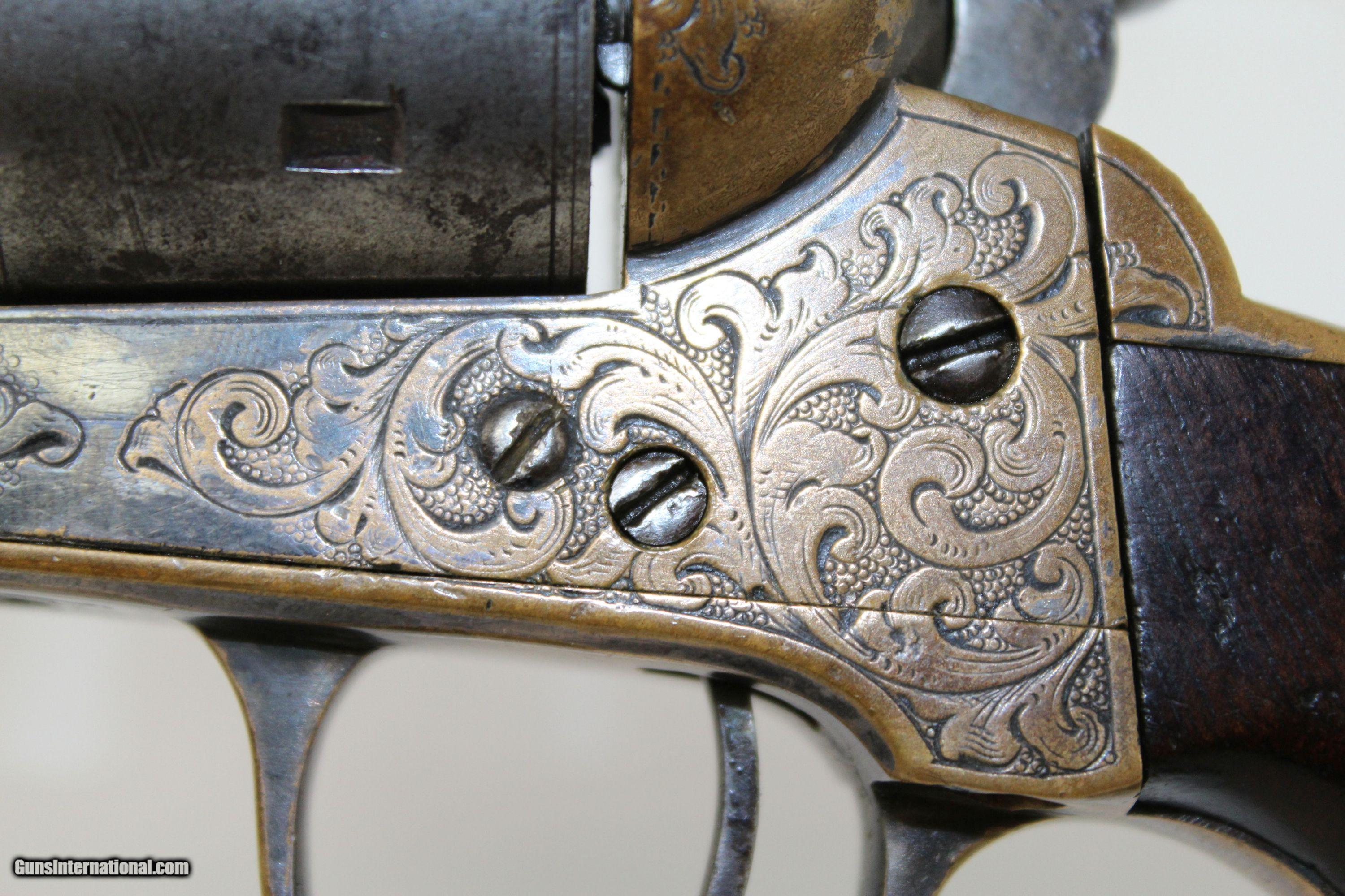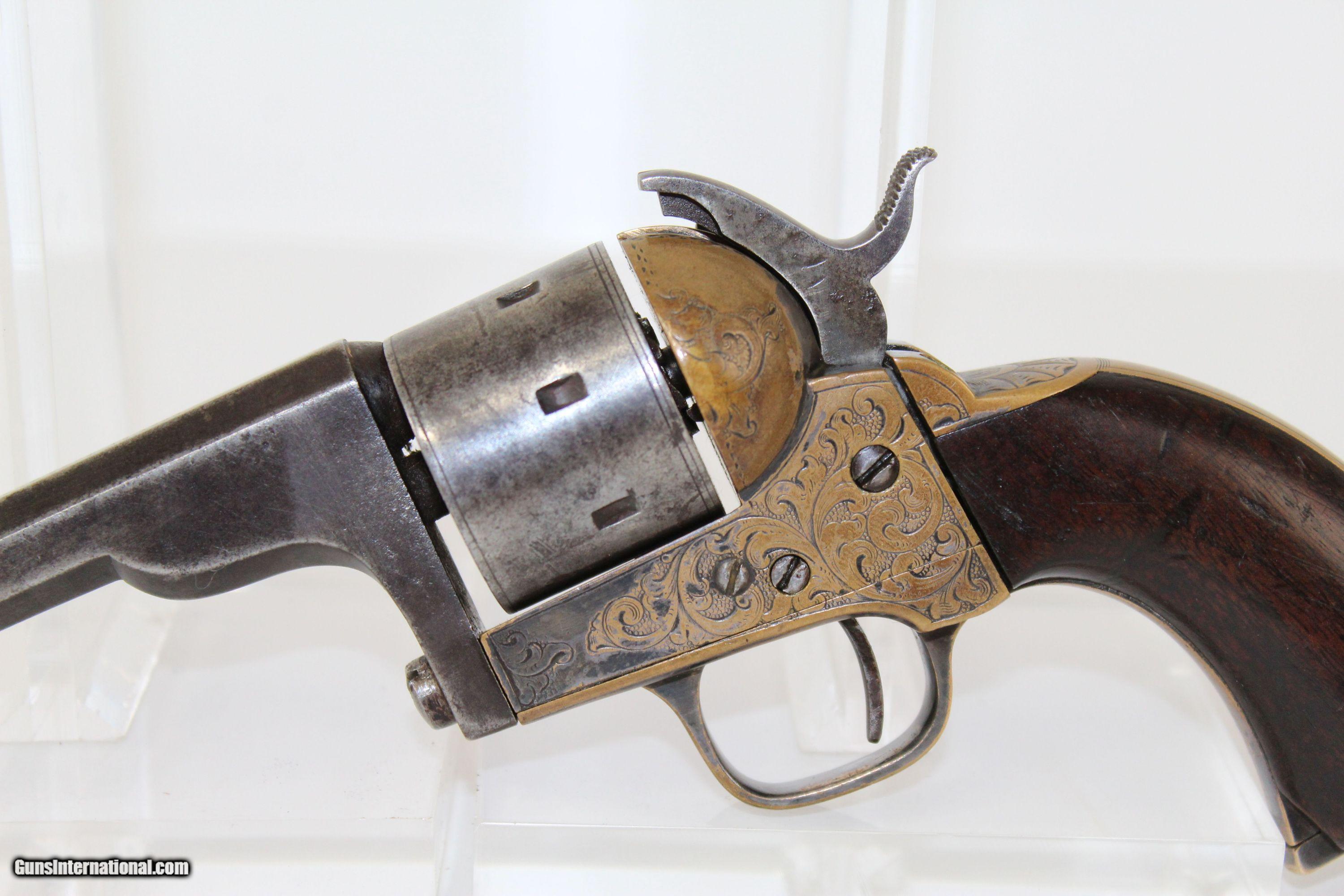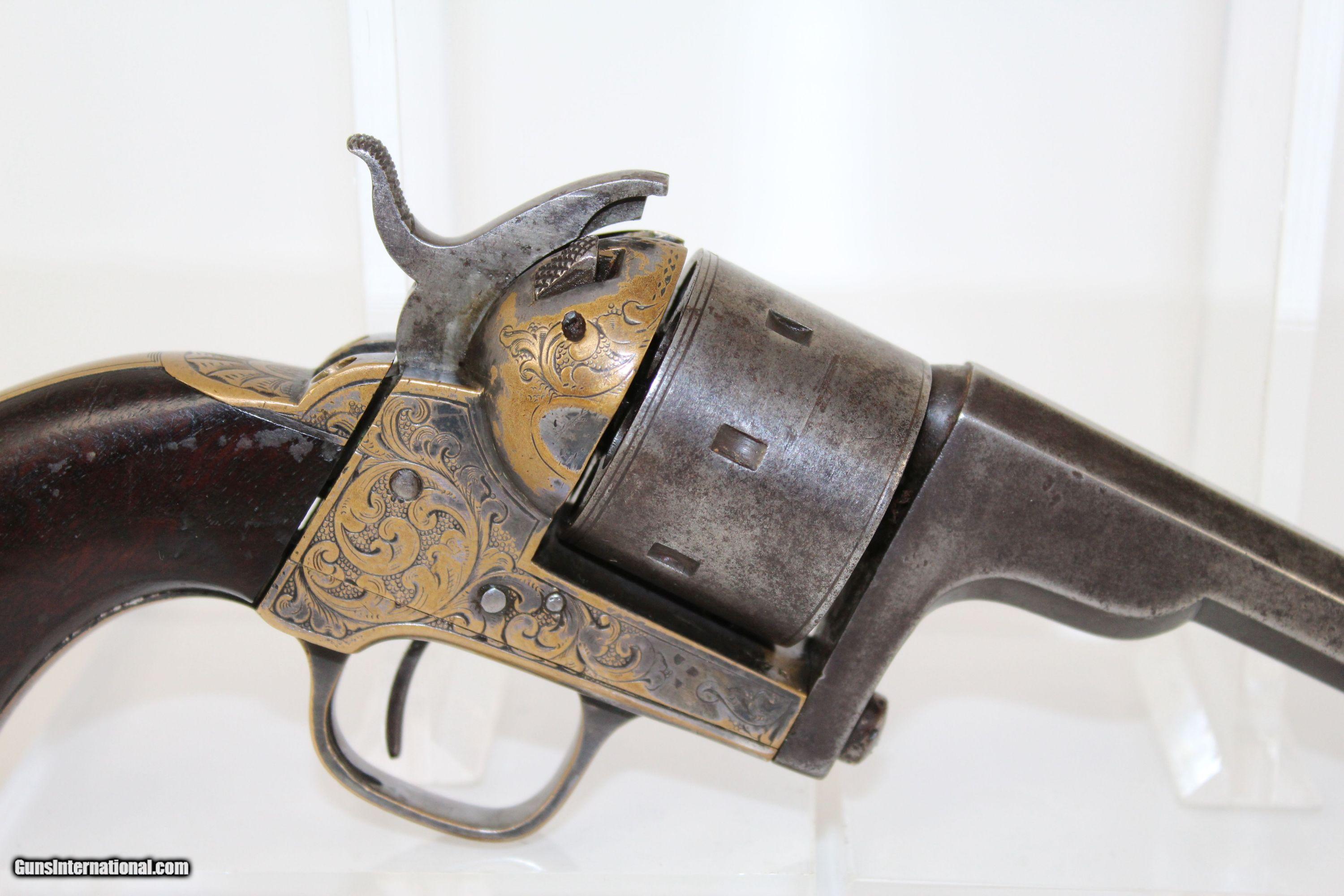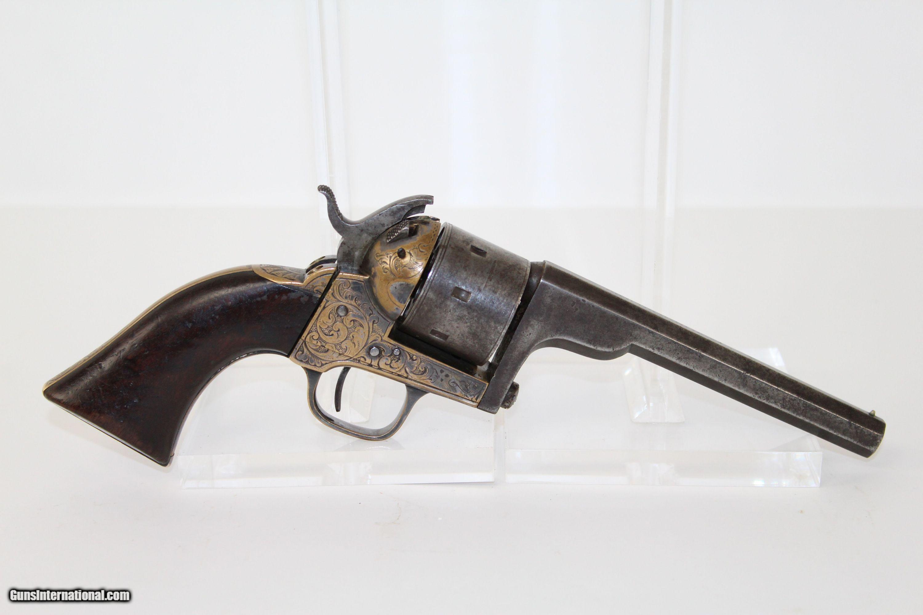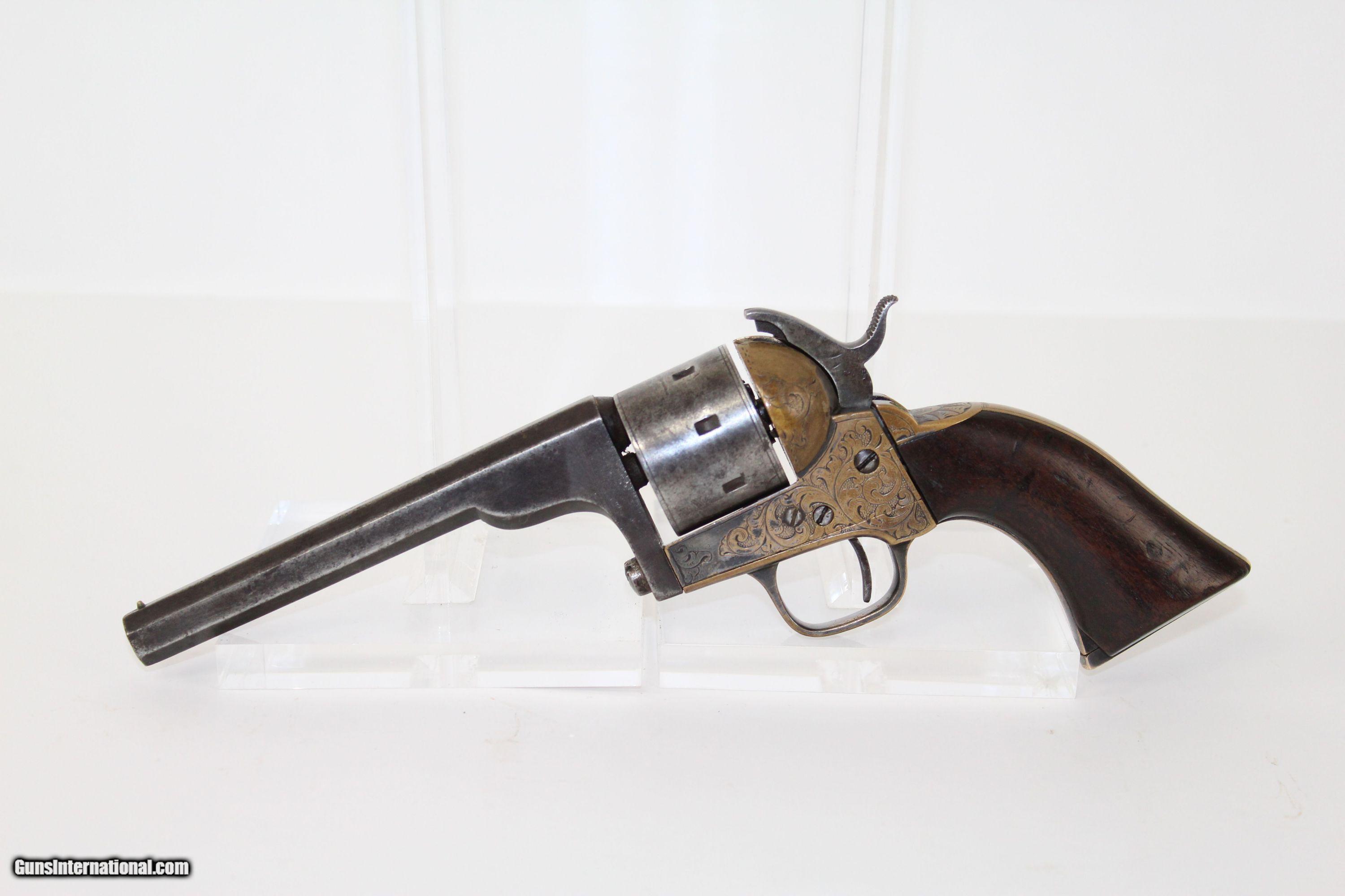 Description: CIVIL WAR Antique MOORE’S Patent Belt Revolver Scarce & Engraved Civil War Revolver Here we present an antique Engraved Moore’s Patent Firearms Co. Single Action Belt Revolver. These revolvers were made in Brooklyn, New York from 1861-1863 and number less than 8,000 in total. It is a very interesting revolver as this it is one of those revolvers that was direct violation of the patent by Rollin White and Smith & Wesson. Rollin White, charged with defending his own patent, took Moore’s Patent Firearms Co. to court and won, resulting in a very few of the later revolvers being stamped “MF’D FOR SMITH & WESSON”. The other significance of this pistol is that many of these are known to have been purchased by Union officers and enlisted men for use during the American Civil War. One of its advantages was its 7-shot capacity. It is unique in that the whole cylinder and barrel assembly cant to the right side for loading and unloading, a prelude to the swing-out cylinder! Mechanically, this revolver utilizes a push-button release that allows the barrel and cylinder shift to the right for loading and unloading. The cylinder is chambered for 7 shots of .32 rimfire and is fully bored through, violating the Smith & Wesson owned Rollin White Patent. The pistol also features full engraving on the brass frame from the factory. The overall condition is fair to good. The original silver plate is about 15% on the brass frame, with a nice patina on the brass and iron parts of the barrel and cylinder. The engravings are clear. The markings are clear and legible. The bore is clean with strong rifling. The walnut grips are good. The screws attaching the top of the grip frame to the frame of the revolver are absent. The bottom screw is present. The action on this revolver is functional. Here is a handsome revolver from the period of the Civil War with additional history with Smith & Wesson! Own the original! This is a legitimate antique and not a reproduction. Barrel is 5 inches. Caliber: .32 Rimfire Overall condition as seen in photos. Very Fast. Very Safe. FREE SHIPPING WORLDWIDE. Delivered directly to your door by express mail! Guaranteed AUTHENTIC & Includes CERTIFICATE OF AUTHENTICITY. ancestryguns $800 #6410 SOLD Antique: Yes |