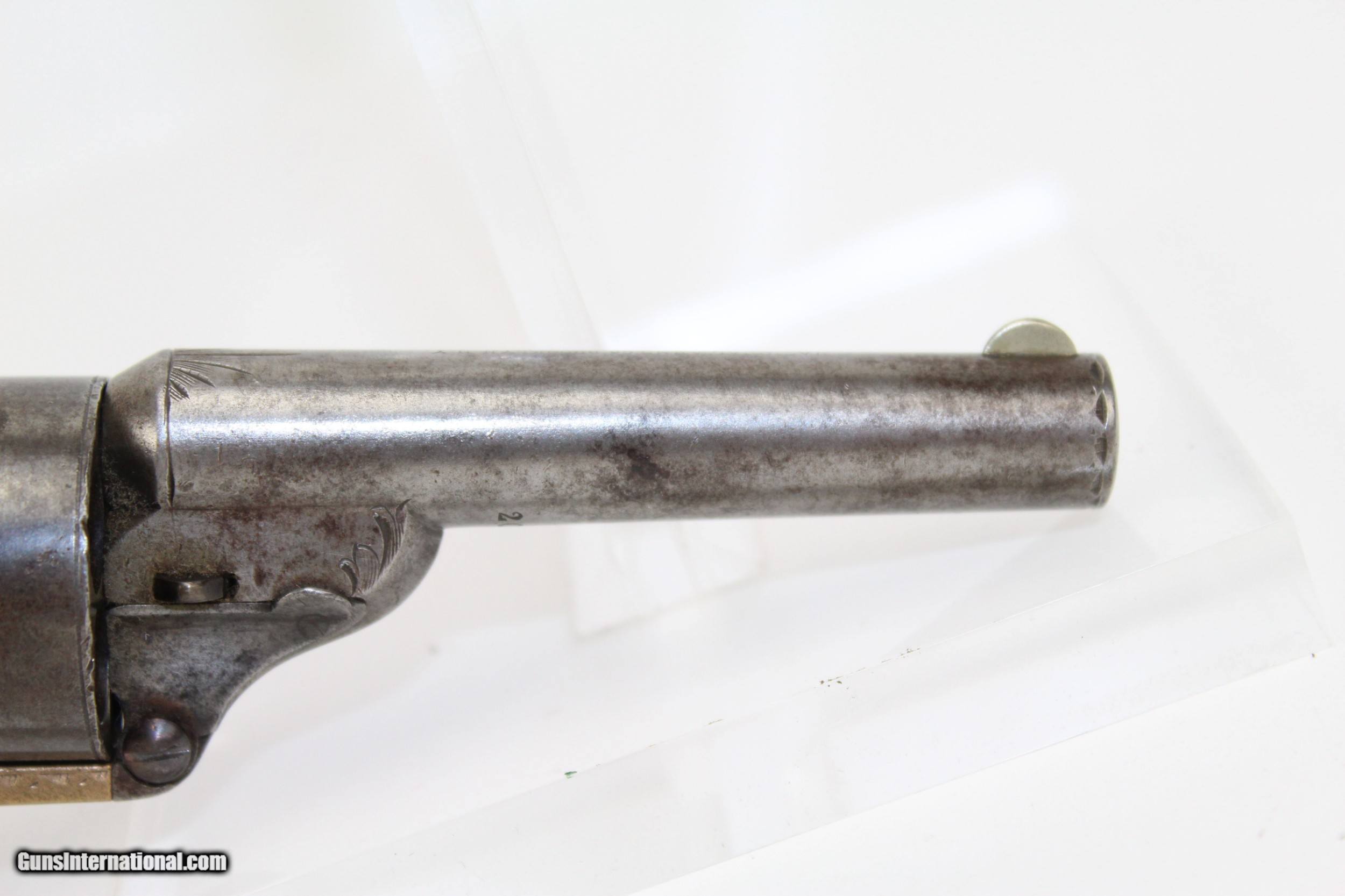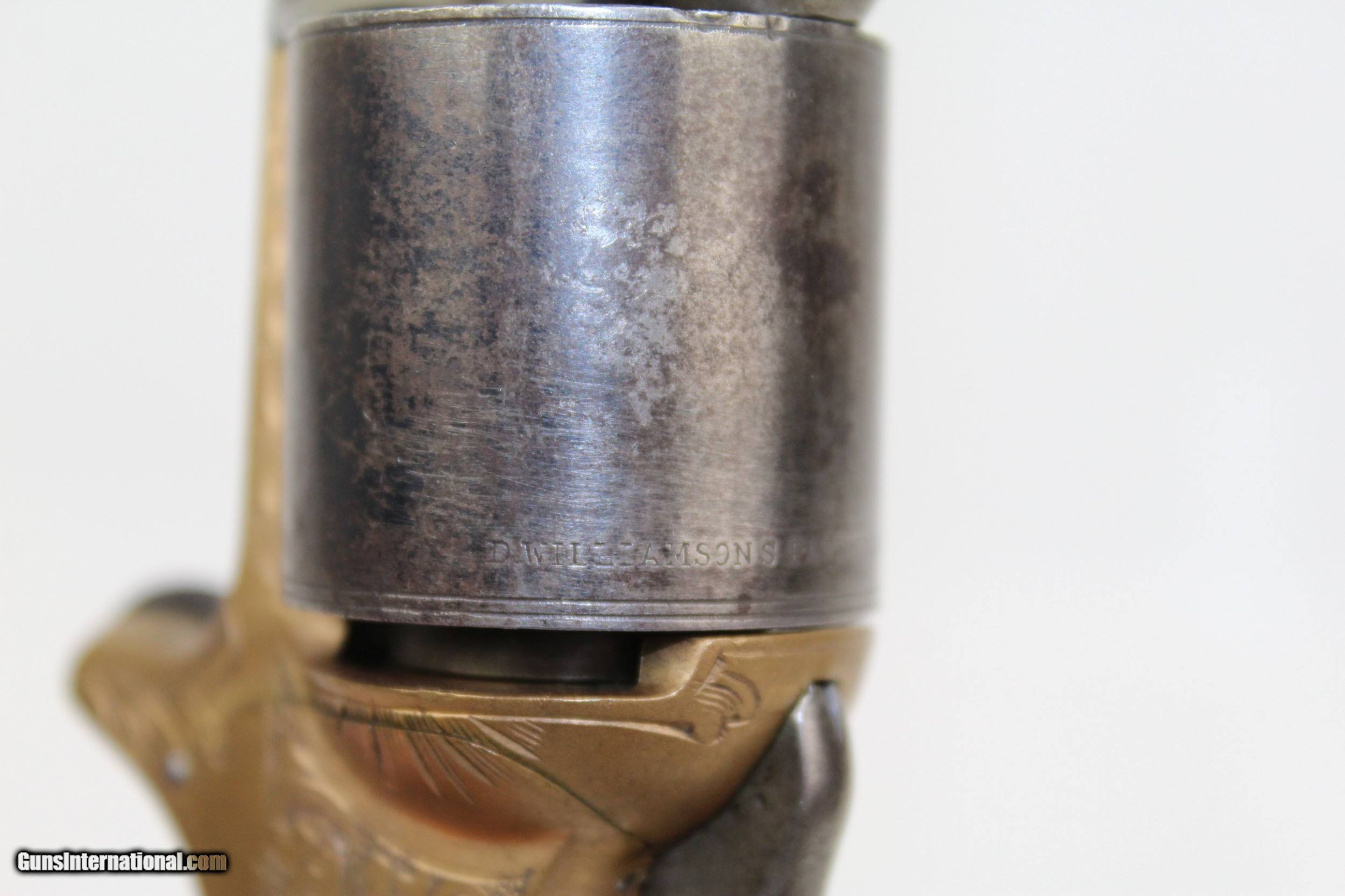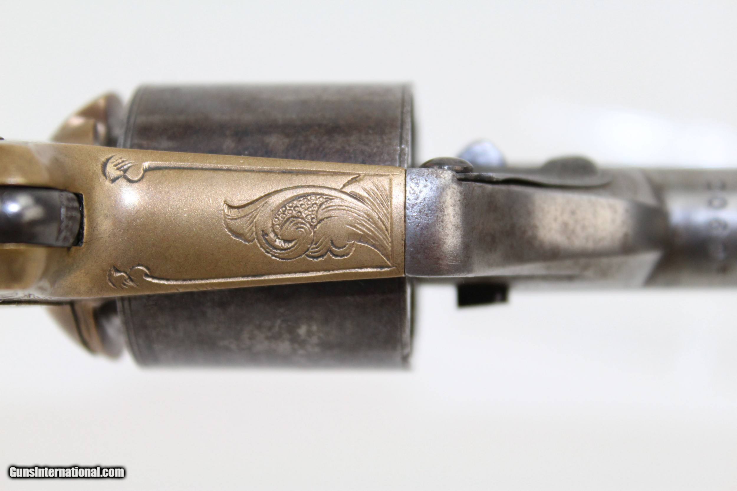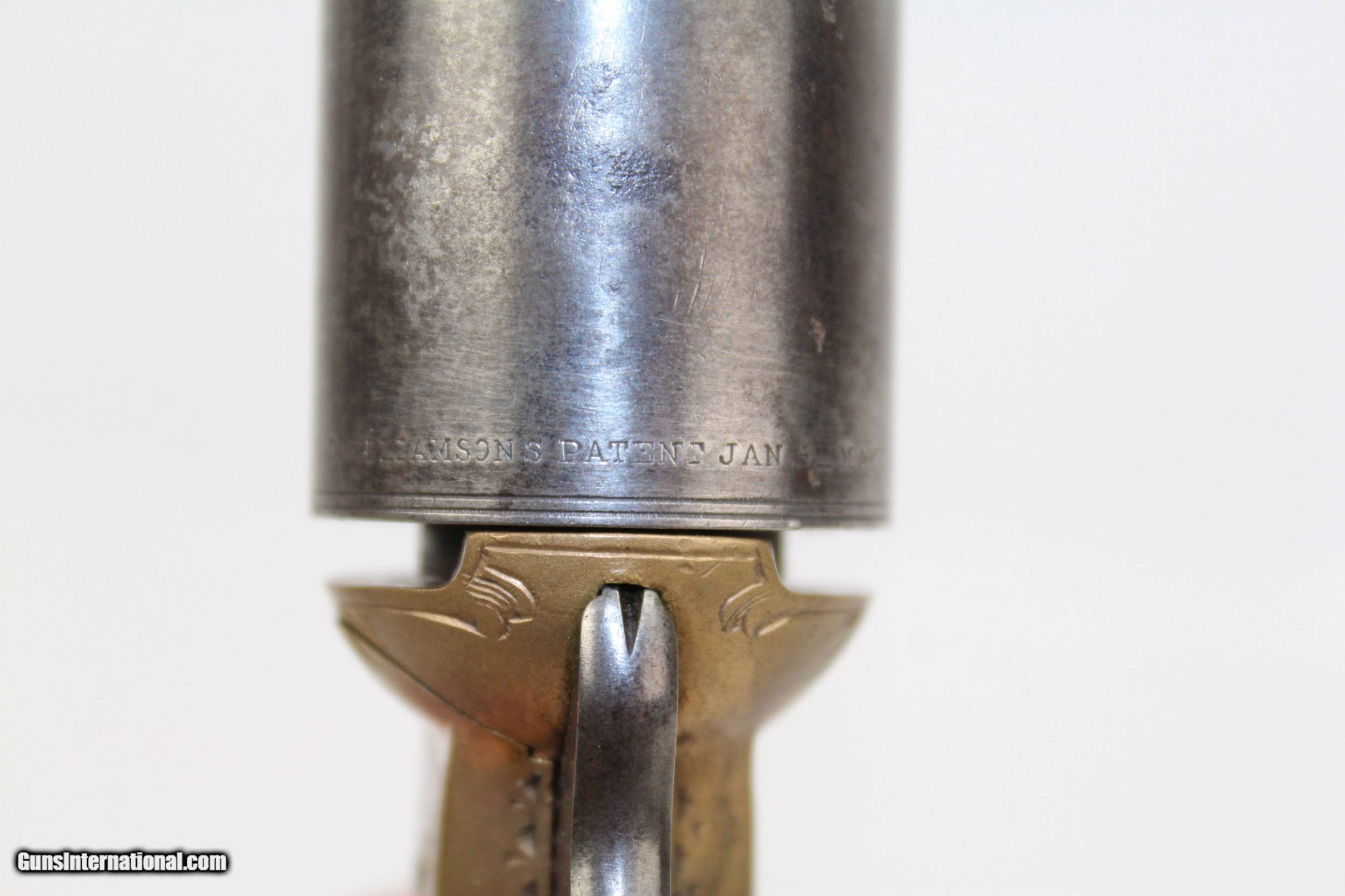 Description: CIVIL WAR Antique NATIONAL ARMS Teat-Fire Revolver Engraved Revolver That Circumvented S&W’s Patents Here we present an antique Moore’s Patent Teat-Fire Revolver, made by National Arms Co., circa 1864-1870, in Brooklyn, New York. It was wartime and the United States stood divided. During a period of rapid industrial innovation, the firearms industry was one of the hottest. The war drove a huge market and many different makers, designs and patents appeared in a very short amount of time. Some of Colt’s most coveted patents expired in 1857, opening opportunity, but Smith & Wesson purchased the Rollin White Patent in the late 1850s, enabling them to control the market on what virtually became the “modern” revolver. Specifically, the Rollin White Patent was for completely bored through (front to back) chambers in the cylinder. This is the same concept still in use in revolvers today. This enabled the most effective use of metallic cartridges. Many companies simply infringed on the patent. They were promptly sued. Others tried and succeeded in finding ways around the patent to make metallic cartridge revolvers while the Rollin White Patent was still in effect. Daniel Moore, the designer of this revolver was one who did both. He designed a cartridge revolver that was the first “swing-out” cylinder revolver, but blatantly infringed on S&W’s patent. He was sued and lost, but he was not done. He soon designed another revolver with the partnership of David Williamson. That is the pictured “teat-fire” revolver. Like the Plant, another successful revolver that skirted the RW Patent, it used a mostly bored through cylinder with a constriction at the back. The cartridges each loaded from the front of the cylinder. A small projection at the back of the cartridge (like a teat) was the primer. This example has a scarce feature in the small hook-like ejector. The cylinder is marked “D.WILLIAMSONS PATENT JAN. 5-MAY27, 1864”. The top of the barrel is marked “NATIONAL ARMS CO. BROOKLYN, N.Y.”. The overall condition is good. Traces of the original blue remain on the cylinder. The markings are clear and legible. The walnut grips are in great shape, the left panel is a replacement. The bore is clear with good rifling. The action on this revolver is intermittent. Own the original! This is a legitimate antique and not a reproduction. Barrel is 3-1/4 inches. Caliber: .32 Teat-Fire Overall condition as seen in photos. Very Fast. Very Safe. FREE SHIPPING WORLDWIDE. Delivered directly to your door by express mail! Guaranteed AUTHENTIC & Includes CERTIFICATE OF AUTHENTICITY. ancestryguns $485 #7078 SOLD Antique: Yes |