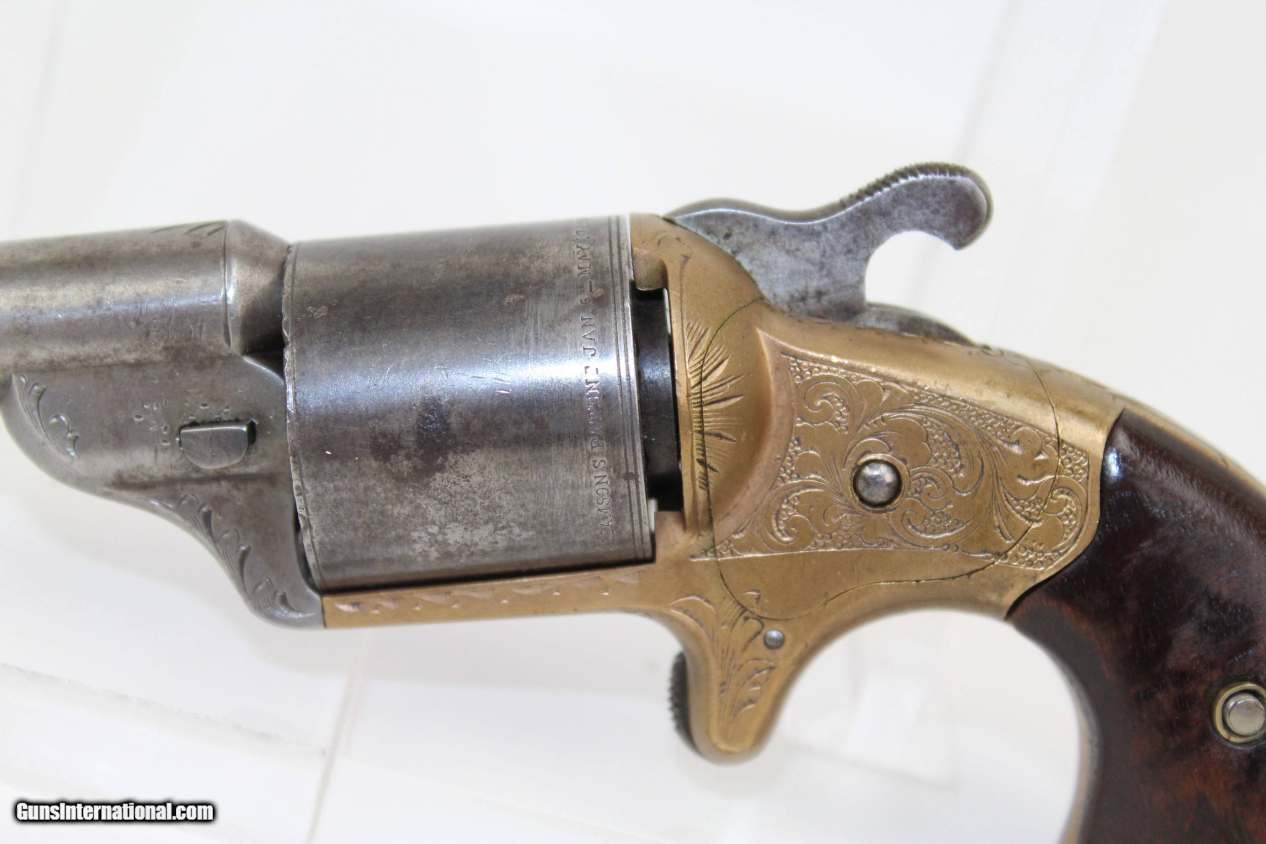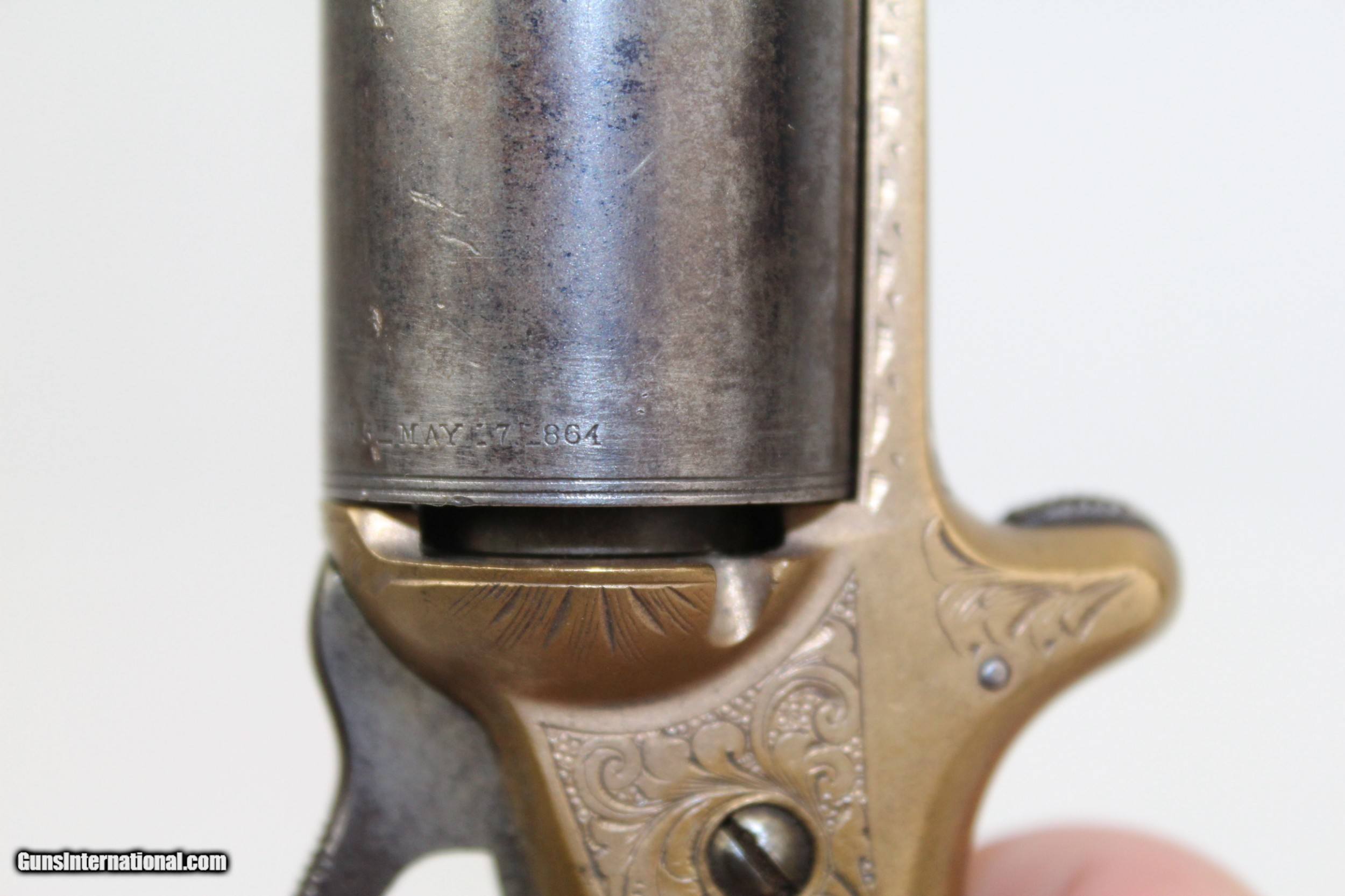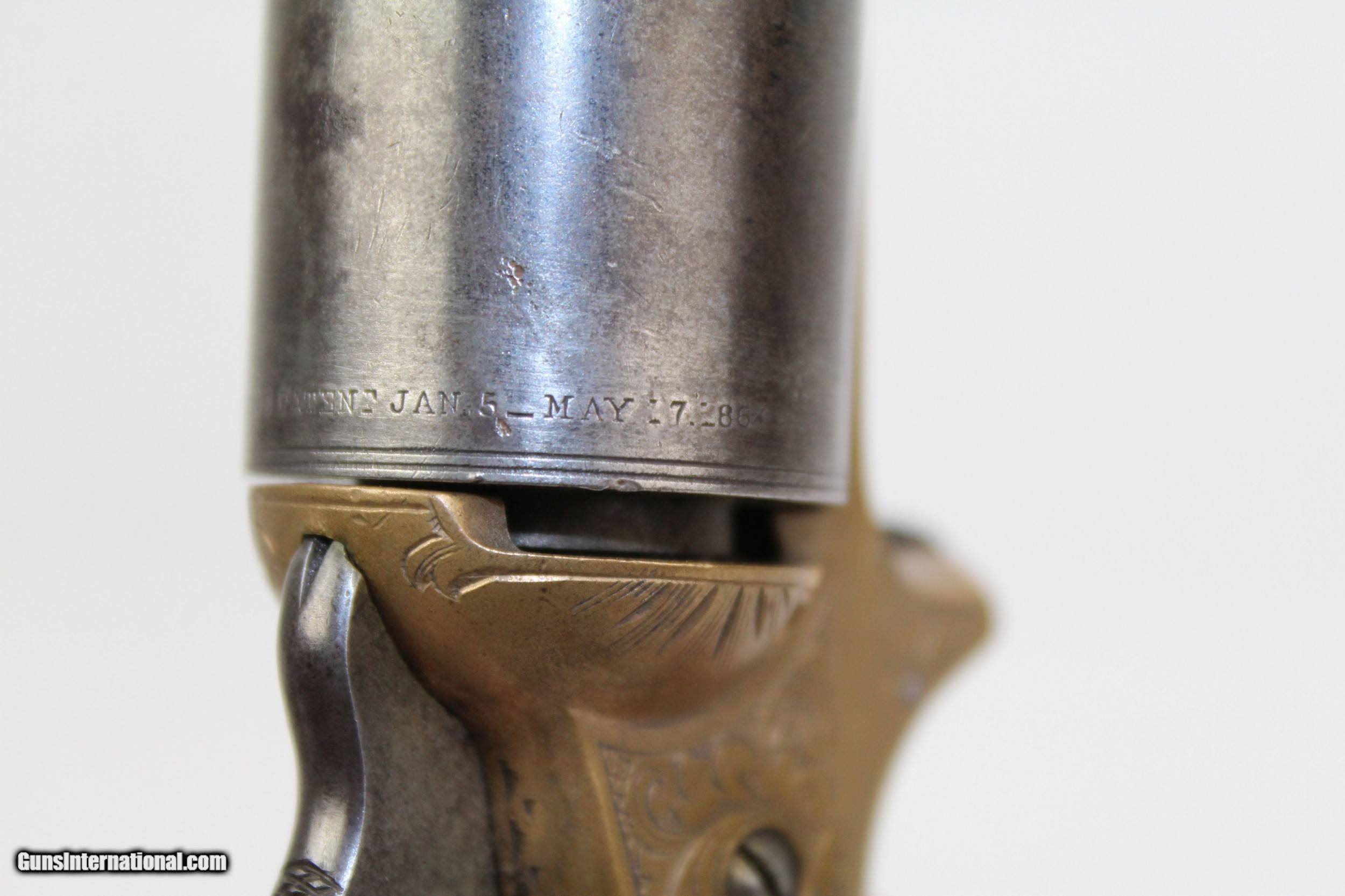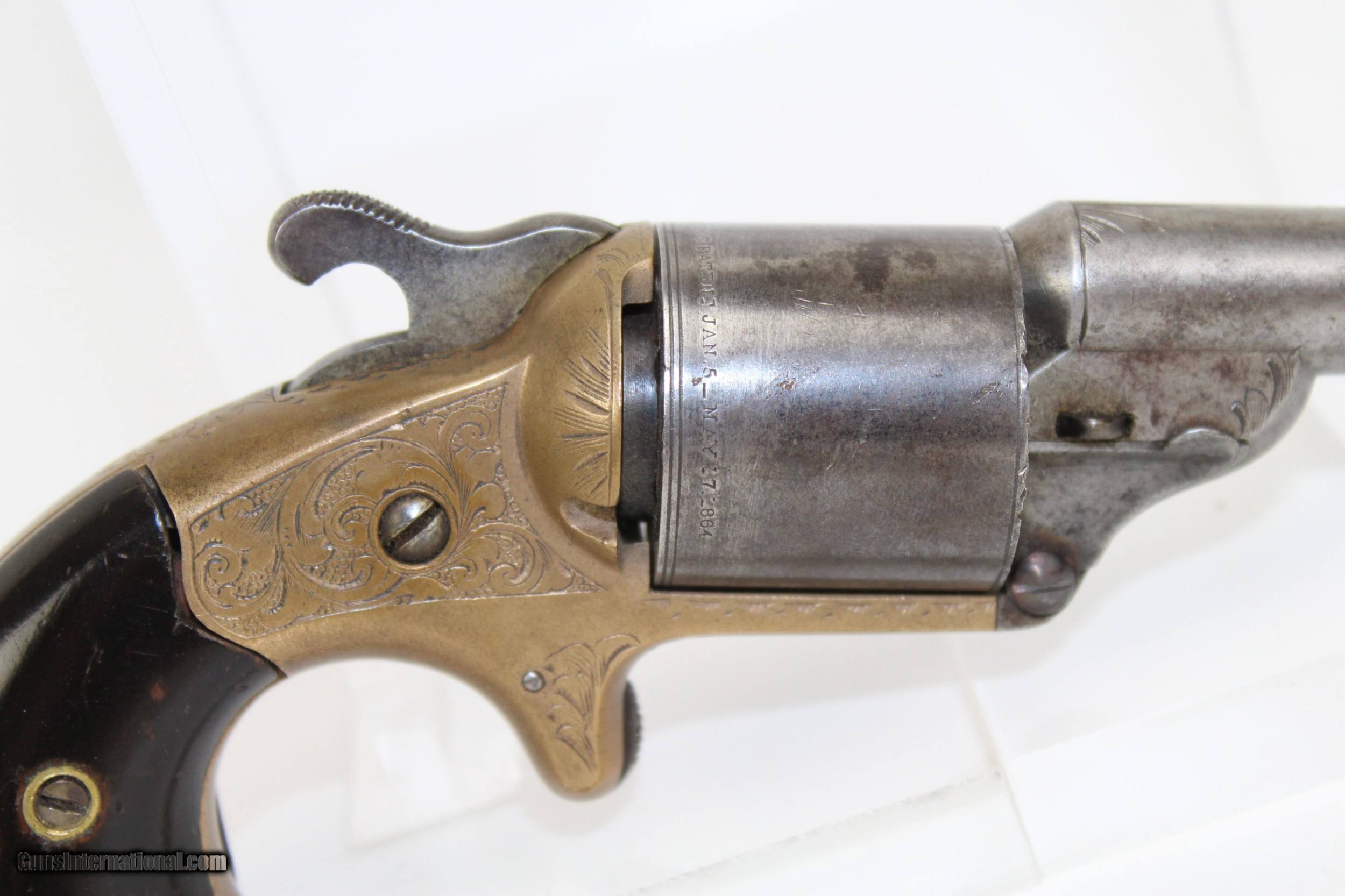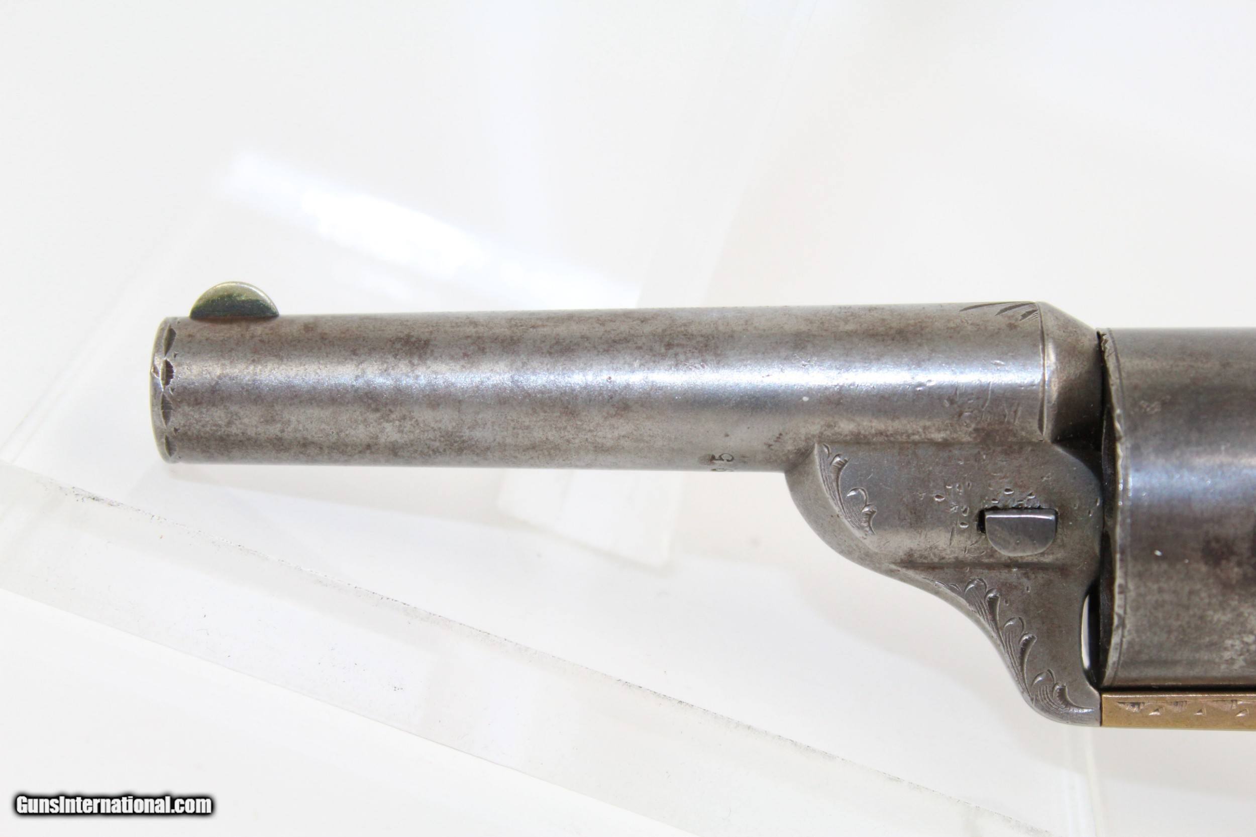 Description: CIVIL WAR Antique NATIONAL ARMS Teat-Fire Revolver Engraved Revolver That Circumvented S&W’s Patents Here we present an antique Moore’s Patent Teat-Fire Revolver, made by National Arms Co., circa 1864-1870, in Brooklyn, New York. It was wartime and the United States stood divided. During a period of rapid industrial innovation, the firearms industry was one of the hottest. The war drove a huge market and many different makers, designs and patents appeared in a very short amount of time. Some of Colt’s most coveted patents expired in 1857, opening opportunity, but Smith & Wesson purchased the Rollin White Patent in the late 1850s, enabling them to control the market on what virtually became the “modern” revolver. Specifically, the Rollin White Patent was for completely bored through (front to back) chambers in the cylinder. This is the same concept still in use in revolvers today. This enabled the most effective use of metallic cartridges. Many companies simply infringed on the patent. They were promptly sued. Others tried and succeeded in finding ways around the patent to make metallic cartridge revolvers while the Rollin White Patent was still in effect. Daniel Moore, the designer of this revolver was one who did both. He designed a cartridge revolver that was the first “swing-out” cylinder revolver, but blatantly infringed on S&W’s patent. He was sued and lost, but he was not done. He soon designed another revolver with the partnership of David Williamson. That is the pictured “teat-fire” revolver. Like the Plant, another successful revolver that skirted the RW Patent, it used a mostly bored through cylinder with a constriction at the back. The cartridges each loaded from the front of the cylinder. A small projection at the back of the cartridge (like a teat) was the primer. This example has a scarce feature in the small hook-like ejector. The cylinder is marked “D.WILLIAMSONS PATENT JAN. 5-MAY27, 1864”. The top of the barrel is marked “NATIONAL ARMS CO. BROOKLYN, N.Y.”. The overall condition is good. Traces of the original blue remain on the cylinder. The markings are clear and legible. The walnut grips are in great shape, the left panel is a replacement. The bore is clear with good rifling. The action on this revolver is intermittent. Own the original! This is a legitimate antique and not a reproduction. Barrel is 3-1/4 inches. Caliber: .32 Teat-Fire Overall condition as seen in photos. Very Fast. Very Safe. FREE SHIPPING WORLDWIDE. Delivered directly to your door by express mail! Guaranteed AUTHENTIC & Includes CERTIFICATE OF AUTHENTICITY. ancestryguns $485 #7078 SOLD Antique: Yes |