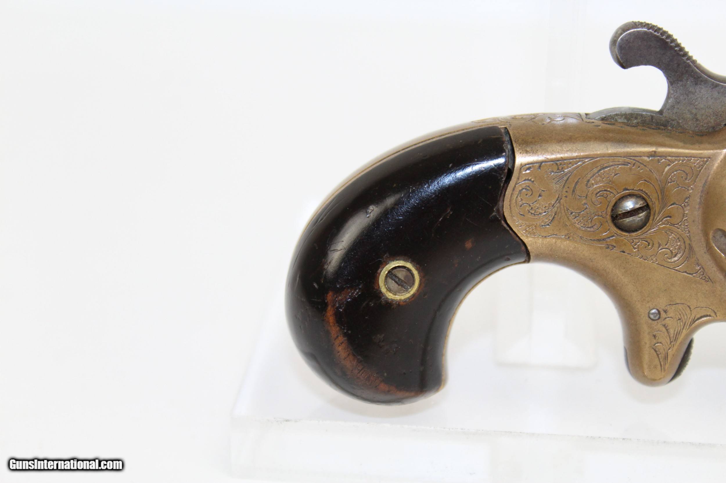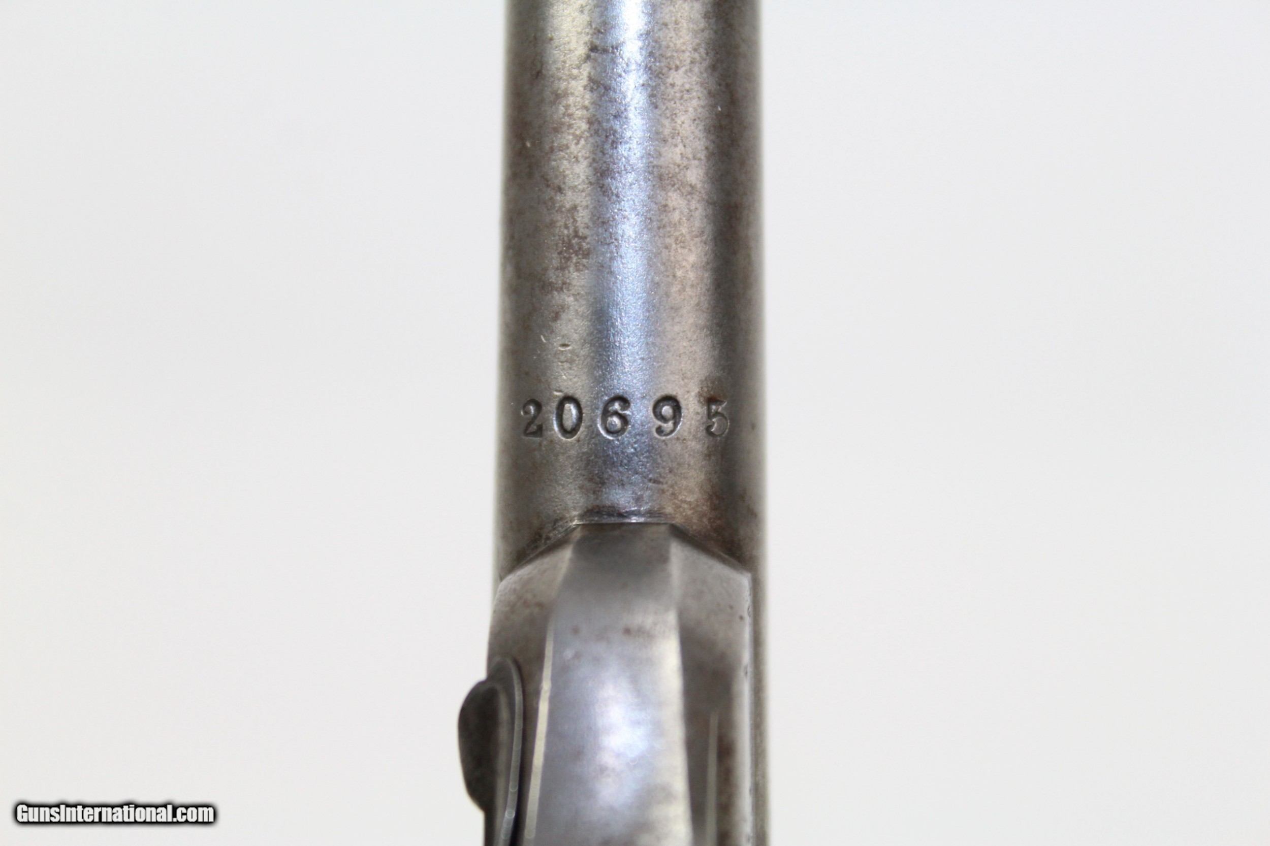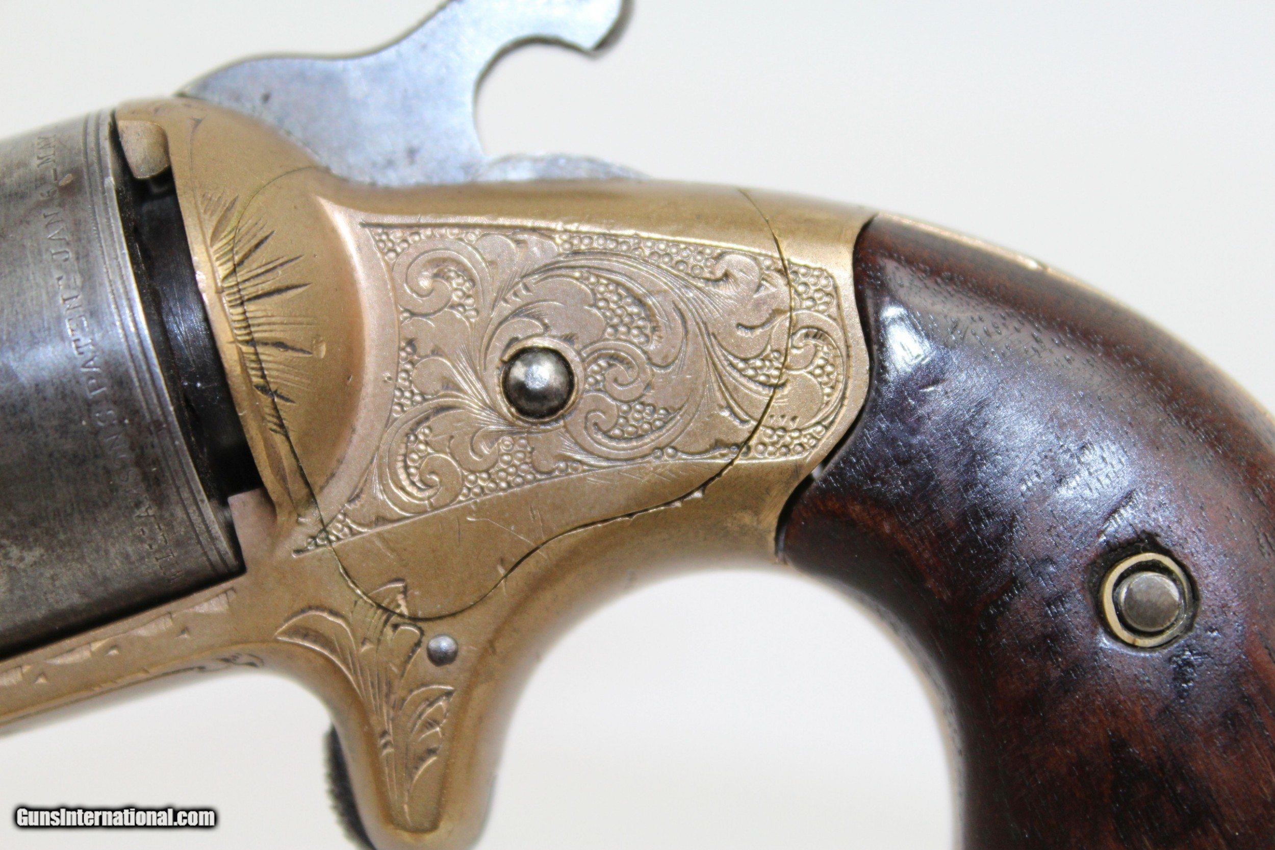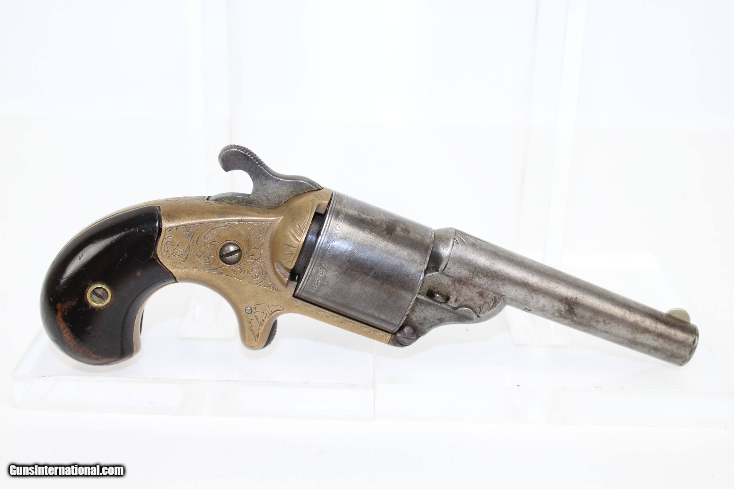Description: CIVIL WAR Antique NATIONAL ARMS Teat-Fire Revolver Engraved Revolver That Circumvented S&W’s Patents Here we present an antique Moore’s Patent Teat-Fire Revolver, made by National Arms Co., circa 1864-1870, in Brooklyn, New York. It was wartime and the United States stood divided. During a period of rapid industrial innovation, the firearms industry was one of the hottest. The war drove a huge market and many different makers, designs and patents appeared in a very short amount of time. Some of Colt’s most coveted patents expired in 1857, opening opportunity, but Smith & Wesson purchased the Rollin White Patent in the late 1850s, enabling them to control the market on what virtually became the “modern” revolver. Specifically, the Rollin White Patent was for completely bored through (front to back) chambers in the cylinder. This is the same concept still in use in revolvers today. This enabled the most effective use of metallic cartridges. Many companies simply infringed on the patent. They were promptly sued. Others tried and succeeded in finding ways around the patent to make metallic cartridge revolvers while the Rollin White Patent was still in effect. Daniel Moore, the designer of this revolver was one who did both. He designed a cartridge revolver that was the first “swing-out” cylinder revolver, but blatantly infringed on S&W’s patent. He was sued and lost, but he was not done. He soon designed another revolver with the partnership of David Williamson. That is the pictured “teat-fire” revolver. Like the Plant, another successful revolver that skirted the RW Patent, it used a mostly bored through cylinder with a constriction at the back. The cartridges each loaded from the front of the cylinder. A small projection at the back of the cartridge (like a teat) was the primer. This example has a scarce feature in the small hook-like ejector. The cylinder is marked “D.WILLIAMSONS PATENT JAN. 5-MAY27, 1864”. The top of the barrel is marked “NATIONAL ARMS CO. BROOKLYN, N.Y.”. The overall condition is good. Traces of the original blue remain on the cylinder. The markings are clear and legible. The walnut grips are in great shape, the left panel is a replacement. The bore is clear with good rifling. The action on this revolver is intermittent. Own the original! This is a legitimate antique and not a reproduction. Barrel is 3-1/4 inches. Caliber: .32 Teat-Fire Overall condition as seen in photos. Very Fast. Very Safe. FREE SHIPPING WORLDWIDE. Delivered directly to your door by express mail! Guaranteed AUTHENTIC & Includes CERTIFICATE OF AUTHENTICITY. ancestryguns $485 #7078 SOLD Antique: Yes |