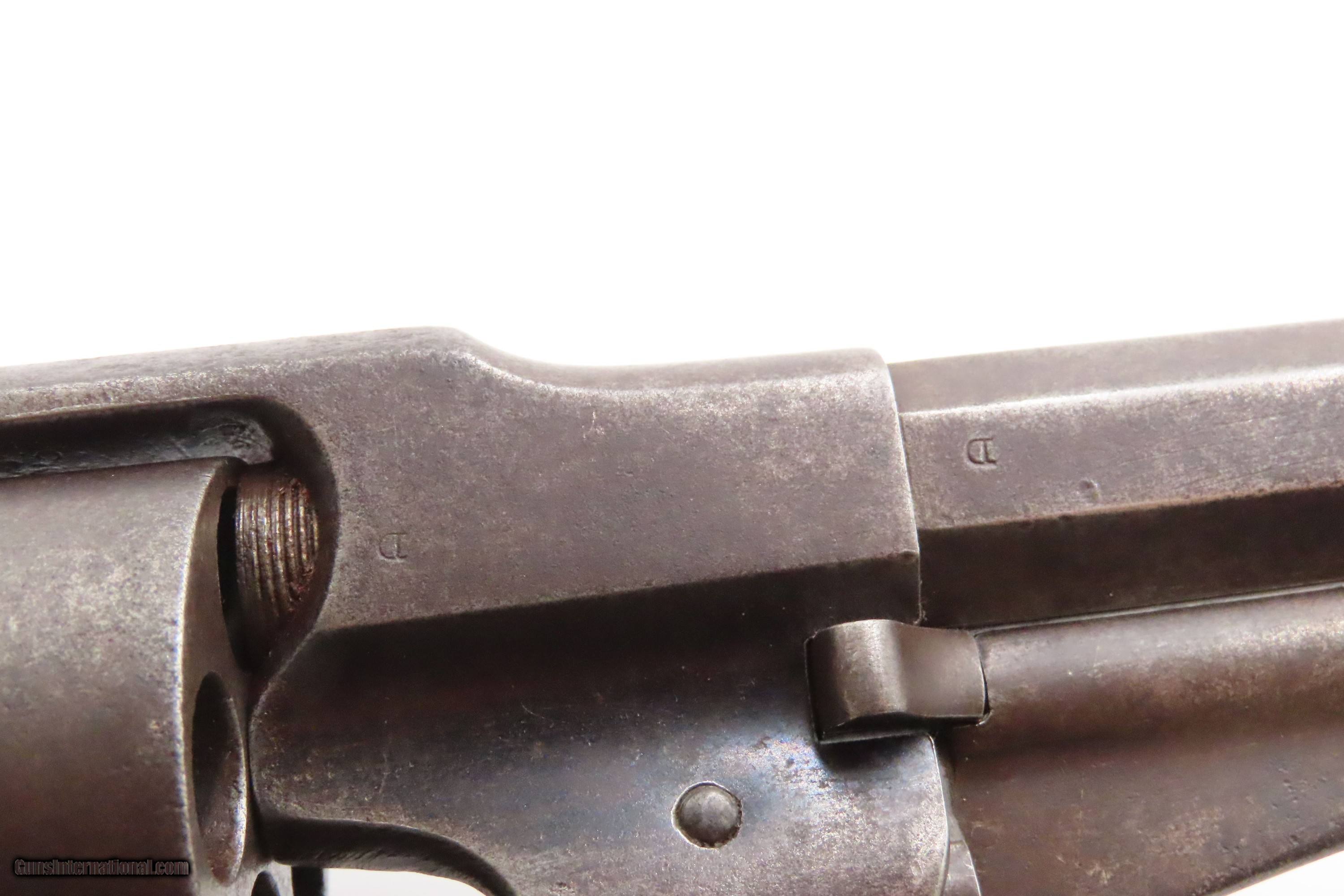 Description: CIVIL WAR Antique REMINGTON US Contract CARTRIDGE CONVERSION New Model ARMY Made Circa 1863-65 and Converted in the early 1870s Here we present an antique U.S. Remington New Model Army Cartridge Conversion Revolver, likely issued to a Union soldier circa 1863-65 during the American Civil War before being converted to .46 Rimfire in the early 1870s. The New Model Army was manufactured from 1863 to 1875 with a total production of approximately 132,000 and represented the last of Remington's .44 caliber percussion revolvers. According to the research published in Remington Army & Navy Revolvers 1861-1868 by Donald L. Ware, Remington revolvers through serial #149,000 were accepted prior to the end of the Civil War. Guns below serial #123,000 were accepted prior to the end of 1864. The cartridge conversion involved replacement of the cylinder with a newly made cylinder from Remington. which licensed the Rollin White patent for a bored through cylinder. These were all 5-shot and chambered for .46 Short Rimfire and were also compatible with the later .46 Long Rimfire. The internals also had to be reworked somewhat for the 5 cartridge cylinder. As mentioned above, this revolver was likely converted sometime after the Civil War ended with the expiration of the Rollin-White Patent in 1869. The Remington New Model Army represents the second greatest number of issued handguns found on Civil War battlefields, second only to the Colt 1860 Army. The New Model Army was the primary revolver issued to Union cavalry after the fire at the Colt's factory in 1863. The Union government acquired a total of some 122,000 of these New Model revolvers for military use, with nearly 110,000 New Models purchased by the U.S. government during the Civil War, at a cost of around $11 each. The State of New Jersey also purchased several thousand for Civil War issue. The New Model 1863 Army represents Remington’s highest production martial pistol. It featured a strong, solid-frame design with the groove in the top for a rear sight, as opposed to Colt’s open-top design. Though Colt got the lion’s share of the government contracts, many consider the Remington New Model Army the superior firearm. William F. "Buffalo Bill" Cody used an ivory-handled New Model Army .44, serial number 73,293, from 1863 until 1906, when he gave it to his ranch foreman with a handwritten note which said that, "It never failed me”. The overall condition is good. Dark patina throughout. Inspection markings throughout including a faint cartouche on the left grip. The action is excellent. The bore is dim with strong rifling. Numbers match. Own the original! This is a legitimate antique and not a reproduction. Barrel is 8 inches. Caliber: .46 Rimfire Overall condition as seen in photos. Very Fast. Very Safe. FREE SHIPPING WORLDWIDE. Delivered directly to your door by express mail! Guaranteed AUTHENTIC & Includes CERTIFICATE OF AUTHENTICITY. ancestryguns $2350 #247374 SOLD Antique: Yes |