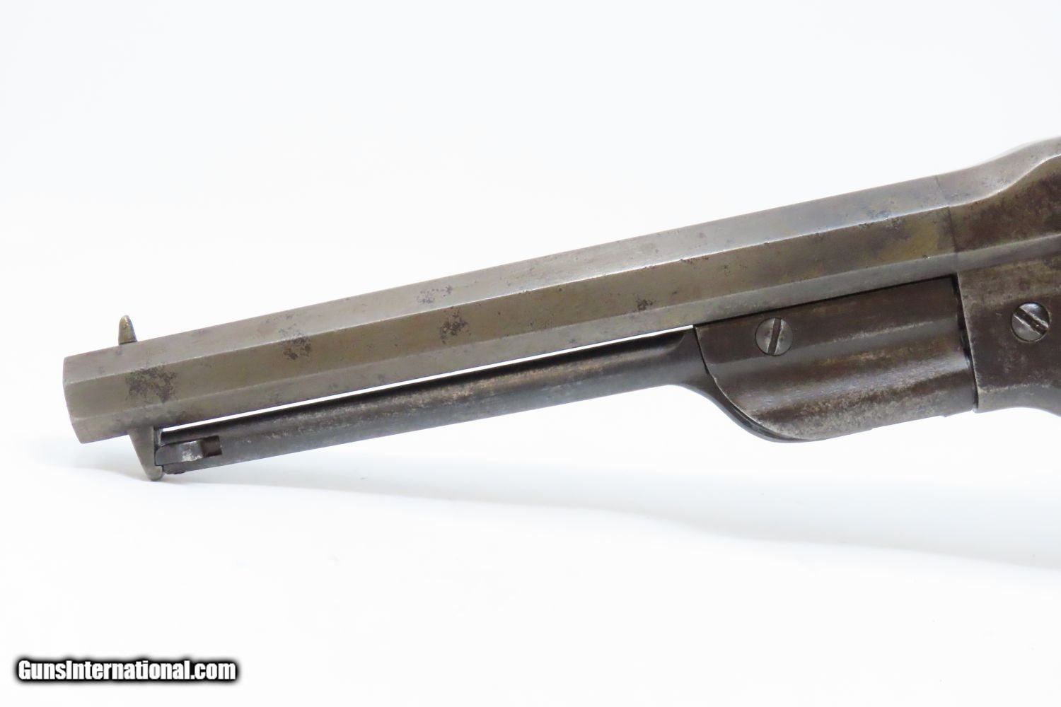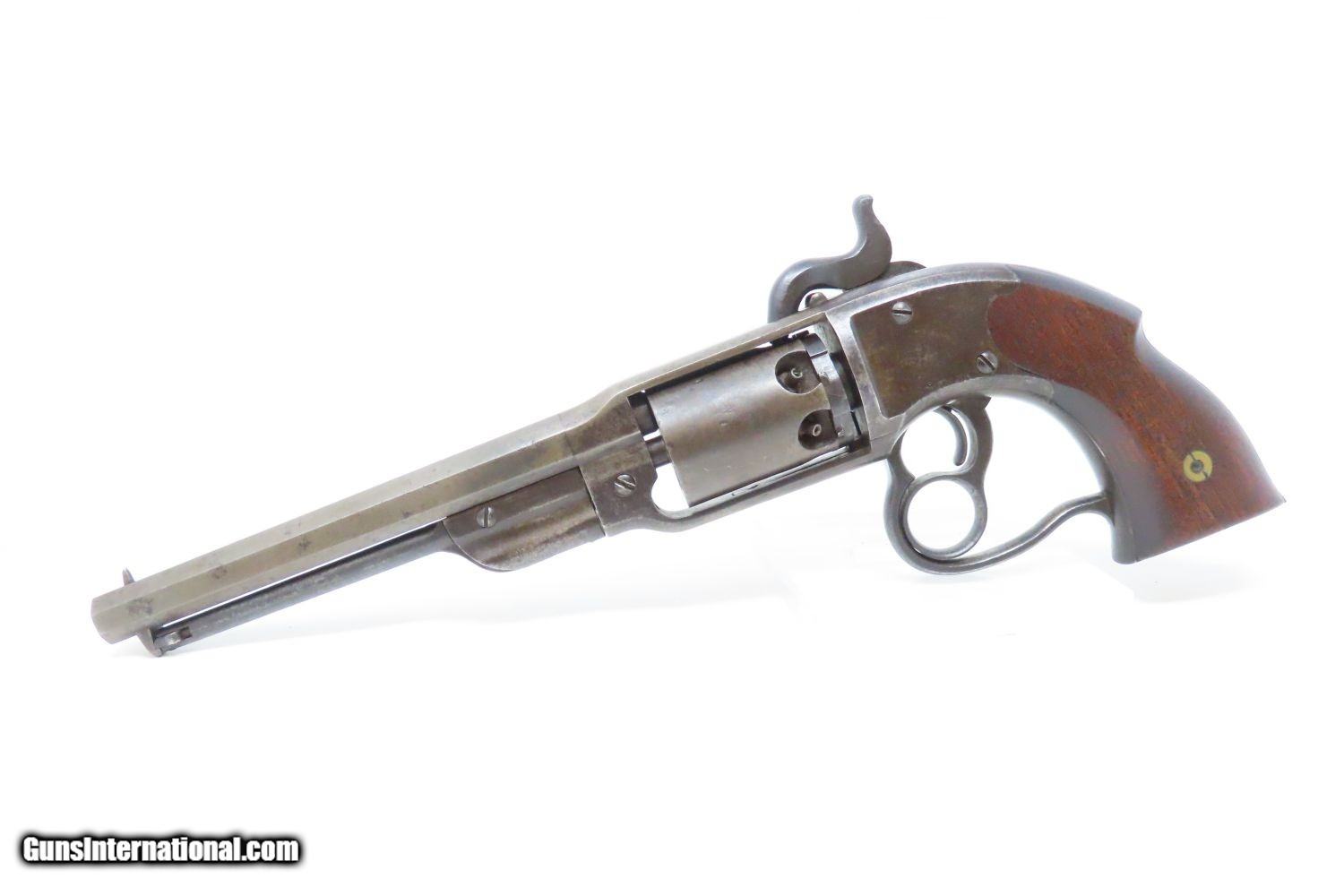 Description: CIVIL WAR Antique SAVAGE .36 Caliber NAVY Percussion SINGLE ACTION Revolver Unique Two-Trigger Revolver with HOLSTER Here we present an antique Savage Navy Revolver, made circa 1862 in Middletown, Connecticut with a production run between 1961 and 1865. Only about 20,000 were ever produced, most of them for U.S. government contracts for both the Army and the Navy. Ironically, about 800 were purchased and delivered to the Navy, while about 11,000 were delivered to cavalry units in the militias and the Army. The rest of the production was sold commercially and smuggled to the Confederacy when further U.S. government contracts were not forthcoming. Known Confederate Cavalry units to have used these were: the 7th, 34th & 35th Virginia, 11th Texas and 7th Missouri Cavalries. Known Northern units were the 5th Kansas, 7th New York, 1st & 2nd Wisconsin. This was one of the most unique revolvers of the American Civil War, both in function and in form. Some in the field consider these to be “ugly” guns, and you may commonly see them referred to as the “Ugly Duckling”. Regardless, the thoughtfulness of design made this a feature packed revolver that gave it a good shot at government contracts, in spite of it being a bit more expensive. The most visually distinguishing characteristics of the Savage Navy Revolver are the double ring trigger and trigger guard, as well as the sleek profile with the low bore axis and solid frame. The low bore axis made for less muzzle flip when fired, making follow up shots faster and pointing more natural. The solid frame was an improvement in durability over open top frame designs. Remington and Whitney both featured this improvement, while Colts clung to the open top frame (and no wonder, since they were selling them as fast as they could make them during the war). The ring trigger on the bottom causes the hammer to cock and the cylinder assembly to retract in the frame and revolve. By the same token, once the cocking lever was released, the cylinder would go to rest with the end of the chamber against the back of the barrel, making a better gas seal than most. The blade trigger above the ring trigger simply causes the hammer to drop through a hole in the top of the frame. Unlike most other percussion revolvers of the day, the Savage percussion nipples face out from the cylinder and are canted back. This was more easily accessible, and less apt to cause a jam in the action if a cap were to fall off. The overall condition is good. The action (hammer/trigger) functions; however, the cylinder indexes intermittently. Nice bore with sharp rifling. Solid walnut grips with expected wear. This is a really interesting design and one of the most distinctive of the American Civil War. Own the original! This is a legitimate antique and not a reproduction. Barrel is 7 1/8 inches. Caliber: .36 Percussion Overall condition as seen in photos. Very Fast. Very Safe. FREE SHIPPING WORLDWIDE. Delivered directly to your door by express mail! Guaranteed AUTHENTIC & Includes CERTIFICATE OF AUTHENTICITY. ancestryguns $3425 #210046 SOLD Antique: Yes |