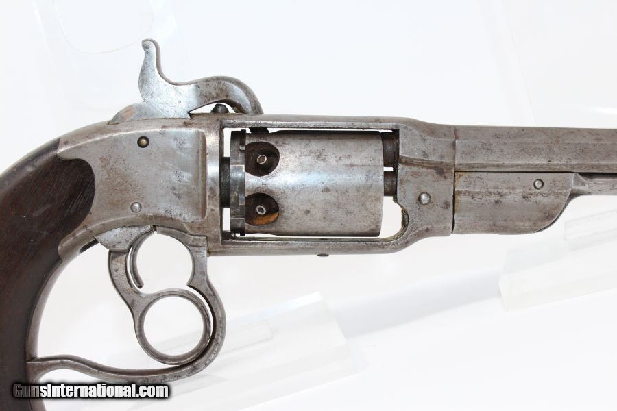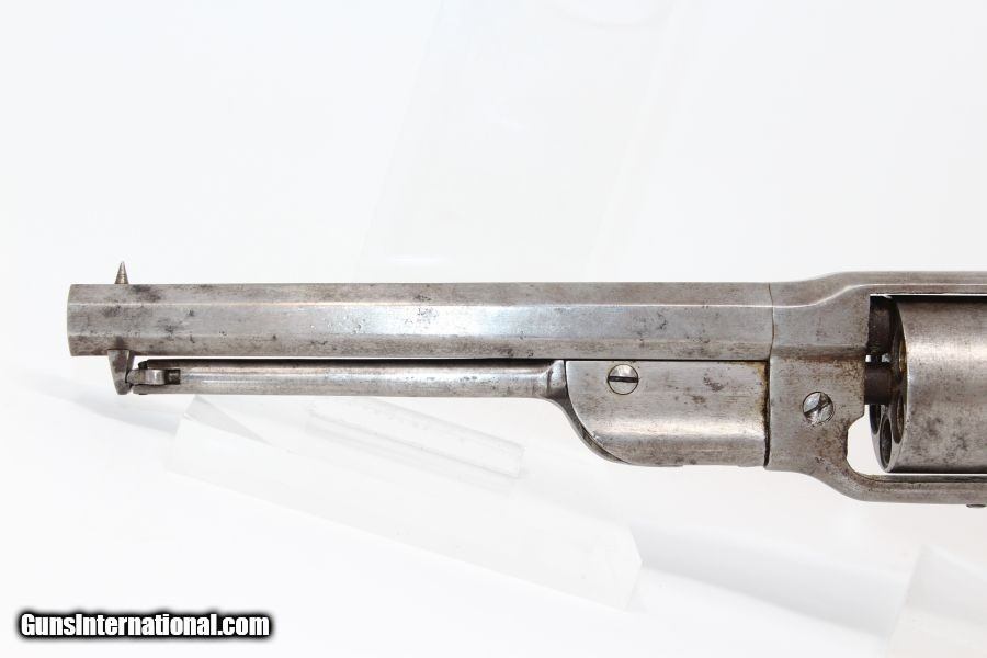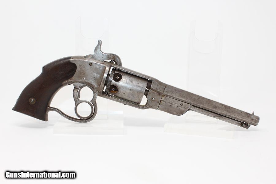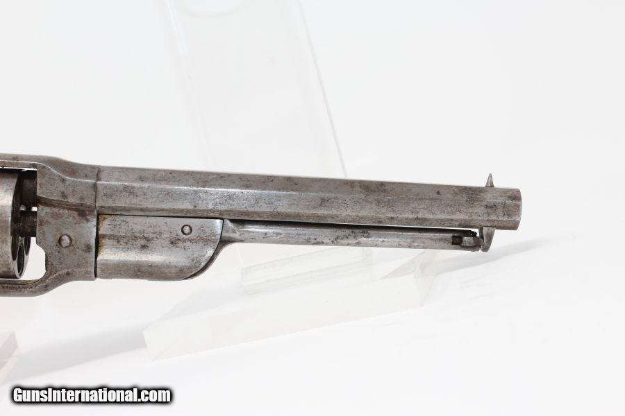 Description: CIVIL WAR Antique SAVAGE NAVY Percussion Revolver Unique Two-Trigger Single Action Revolver Here we present an antique Savage Navy Revolver, made circa 1862 in Middletown, Connecticut. Only about 20,000 were ever produced, most of them for U.S. government contracts for both the Army and the Navy (ironically, about 800 were purchased and delivered to the Navy, while about 11,000 were delivered to cavalry units in the militias and the Army). The rest of the production was sold commercially and smuggled to the Confederacy when further U.S. government contracts were not forthcoming. Known Southern Cavalry units to have used these were: the 7th, 34th & 35th Virginia, 11th Texas and 7th Missouri Cavalries. Known Northern units were: 5th Kansas, 7th New York, 1st & 2nd Wisconsin. This was one of the most unique revolvers of the American Civil War, both in function and in form. Some in the field consider these to be “ugly” guns, and you may commonly see them referred to as the “Ugly Duckling”. Regardless, the thoughtfulness of design made this a feature packed revolver that gave it a good shot at government contracts, in spite of it being a bit more expensive. The most visually distinguishing characteristics of the Savage Navy Revolver are the double ring trigger and trigger guard, as well as the sleek profile with the low bore axis and solid frame. The low bore axis made for less muzzle flip when fired, making follow up shots faster and pointing more natural. The solid frame was an improvement in durability over open top frame designs. Remington and Whitney both featured this improvement, while Colt’s clung to the open top frame (and no wonder, since they were selling them as fast as they could make them during the war). The ring trigger on the bottom causes the hammer to cock and the cylinder assembly to retract in the frame and revolve. By the same token, once the cocking lever was released, the cylinder would go to rest with the end of the chamber against the back of the barrel, making a better gas seal than most. The blade trigger above the ring trigger simply causes the hammer to drop through a hole in the top of the frame. Unlike most other percussion revolvers of the day, the Savage percussion nipples face out from the cylinder and are canted back. This was more easily accessible, and less apt to cause a jam in the action if a cap were to fall off. The overall condition is very good. The steel surfaces have a light gray patina. The markings are clear. The numbers match. The walnut stocks are in good shape with the left panel displaying a visible cartouche. The bottom of the right panel bears 4 distinct notches like many used to make when they had killed a man. The bore is in fantastic shape, clean with sharp rifling. The action is excellent. Here is a fantastic example of a big, percussion six-shooter with a unique design that was used during the American Civil War and after! Own the original! This is a legitimate antique and not a reproduction. Barrel is 7 1/8 inches. Caliber: .36 Percussion Overall condition as seen in photos. Very Fast. Very Safe. FREE SHIPPING WORLDWIDE. Delivered directly to your door by express mail! Guaranteed AUTHENTIC & Includes CERTIFICATE OF AUTHENTICITY. ancestryguns $3300 #8361 SOLD Antique: Yes |