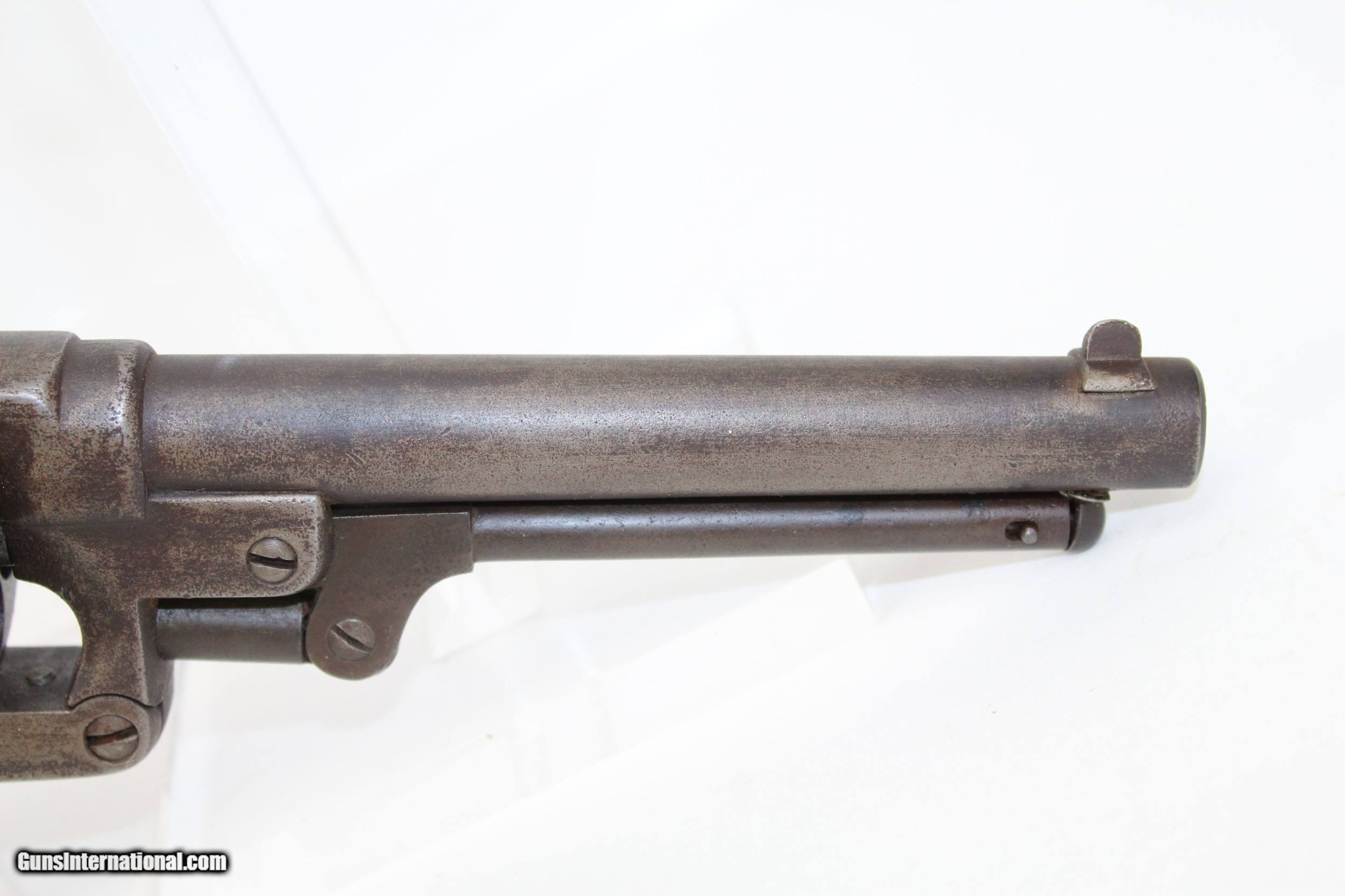 Description: CIVIL WAR Antique STARR M1858 Army Revolver U.S. Contract Double Action Cavalry Revolver Here we present an antique Starr Arms Company Model 1858 Double Action Army Revolver, made circa 1862 in New York. Though not nearly as many of these were made as the Colt 1860s or Remington 1858s, the Starr represents probably the third-most issued revolver during the American Civil War. It would have been used most widely by cavalrymen. It differed tremendously from the other revolvers in its class by being double actioned. The large, curved trigger cocked the hammer and revolved the cylinder, and, at the end of travel, tripped the trigger at the back of the trigger guard, firing the revolver. Ironically, despite being ahead of its time, the Starr Model 1858 Double Action Revolver was sidelined when the U.S. government asked for a revised single action version for the troops, which culminated in the Starr Model 1863 Single Action Revolver. Eben T. Starr, the inventor, was also responsible for the Starr Cavalry Carbine, which was also purchased by the Union during the war. This Starr Double Action Army is marked “STARR. ARMS. Co. NEW. YORK.” on the left side of the frame. The right is marked “STARR’S PATENT JAN. 15. 1856”. The walnut grip is marked on each side with faint inspector cartouches. The overall condition is good. The metal surfaces are dark with age. The markings are clear and legible. The walnut grips are in good shape. The bore is dark with visible rifling. The action on this revolver is functional, sometimes intermittent. Own the original! This is a legitimate antique and not a reproduction. Barrel is 6 inches. Caliber: .44 Percussion Overall condition as seen in photos. Very Fast. Very Safe. FREE SHIPPING WORLDWIDE. Delivered directly to your door by express mail! Guaranteed AUTHENTIC & Includes CERTIFICATE OF AUTHENTICITY. ancestryguns $1615 #7289 SOLD Antique: Yes |