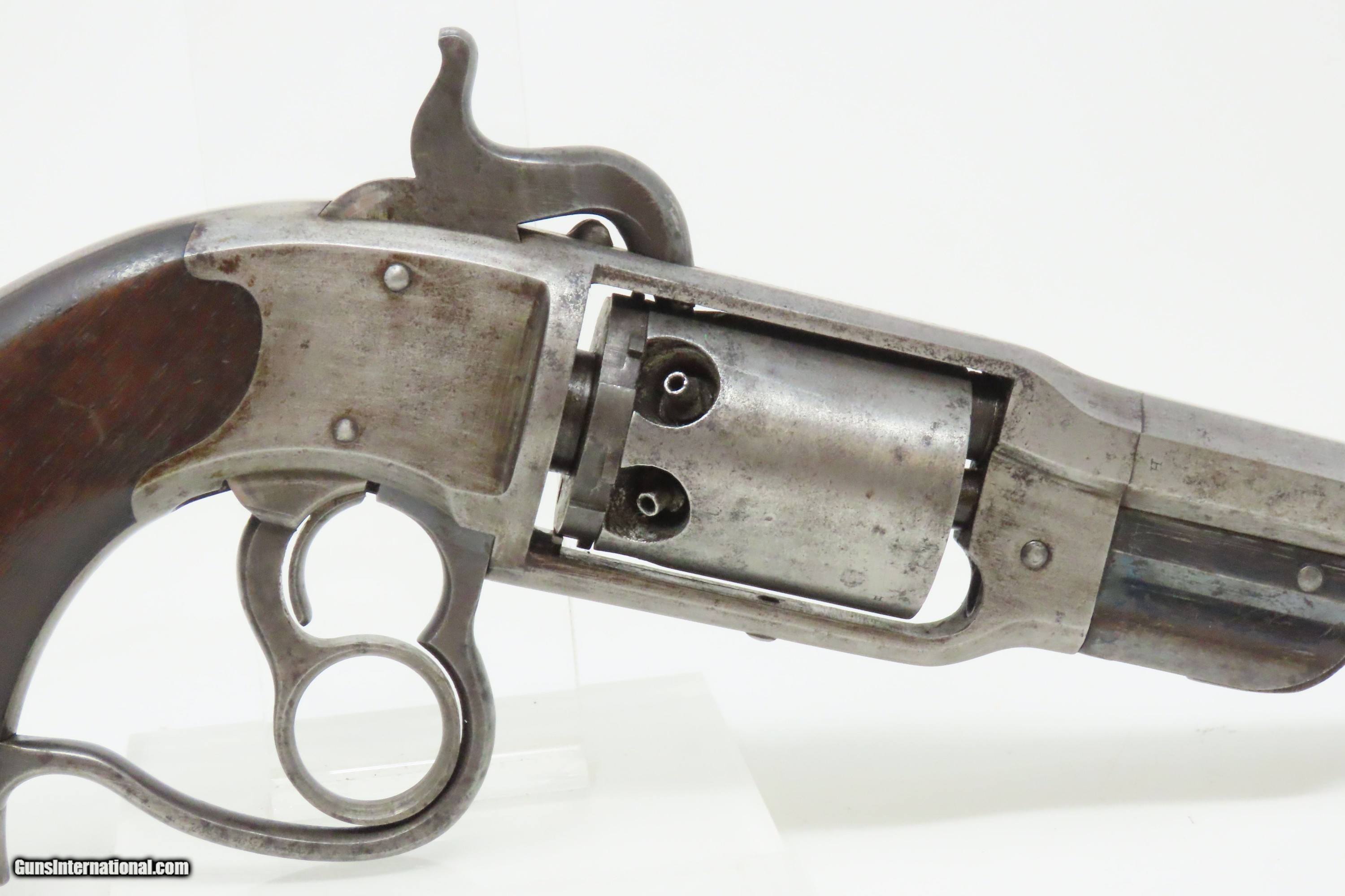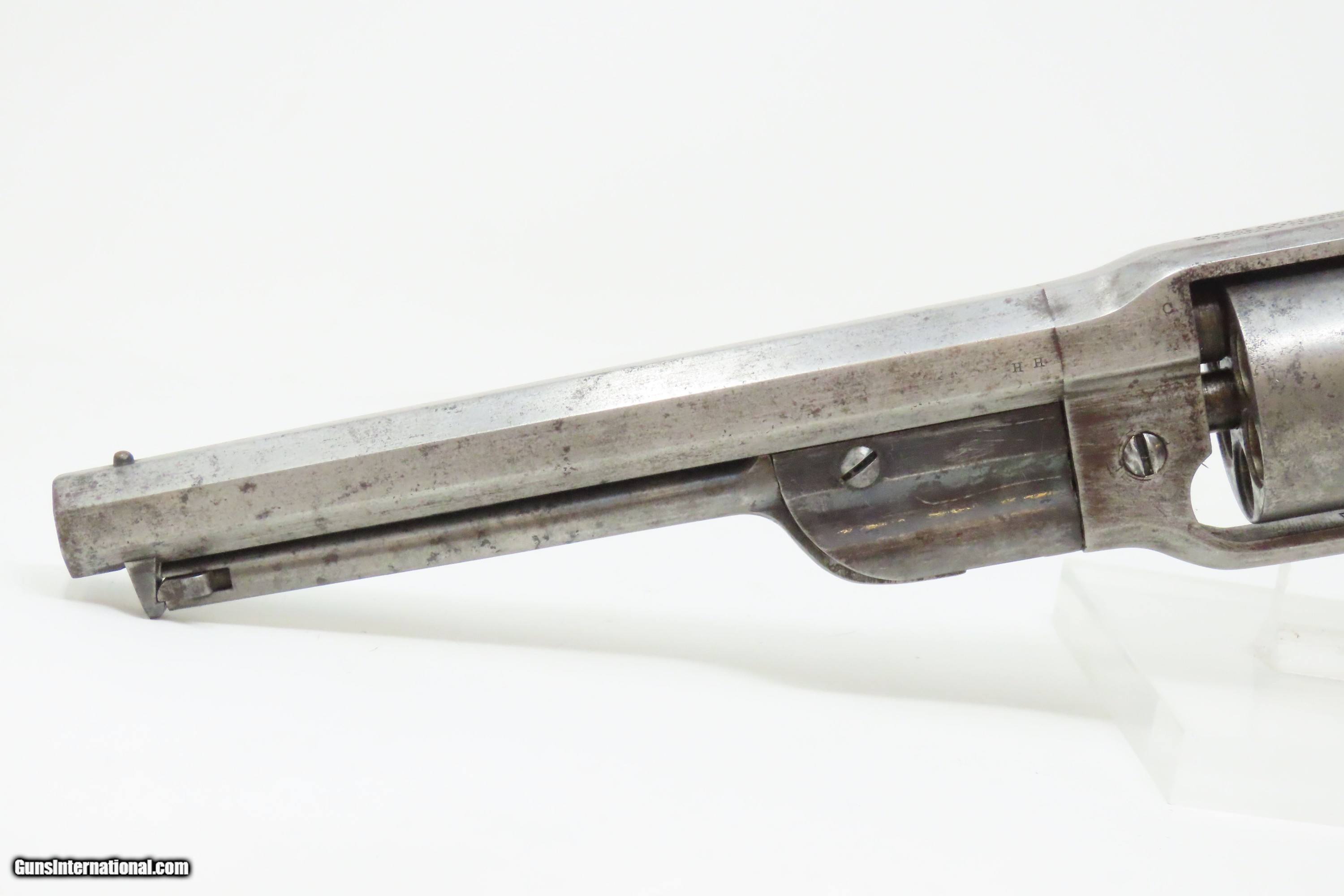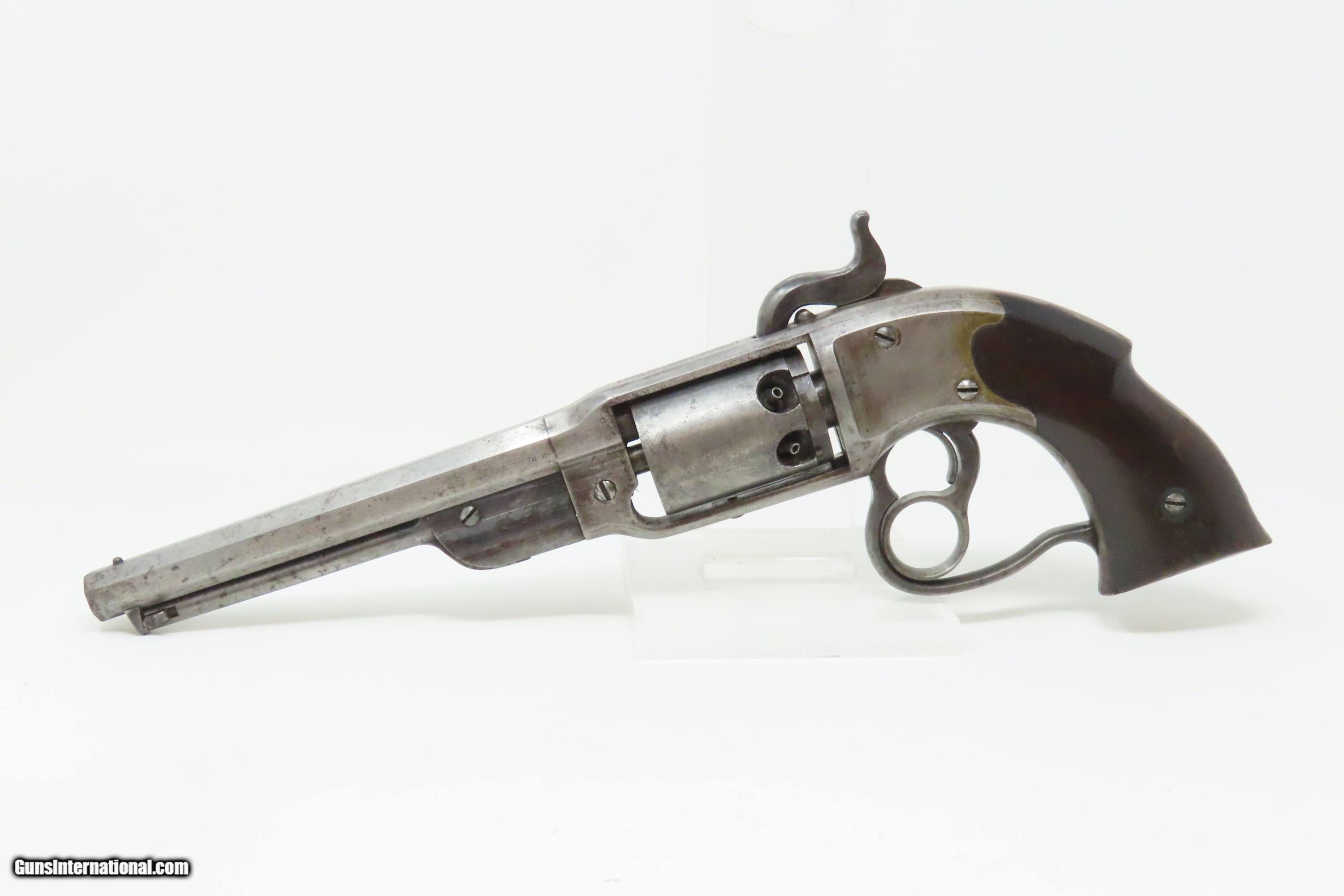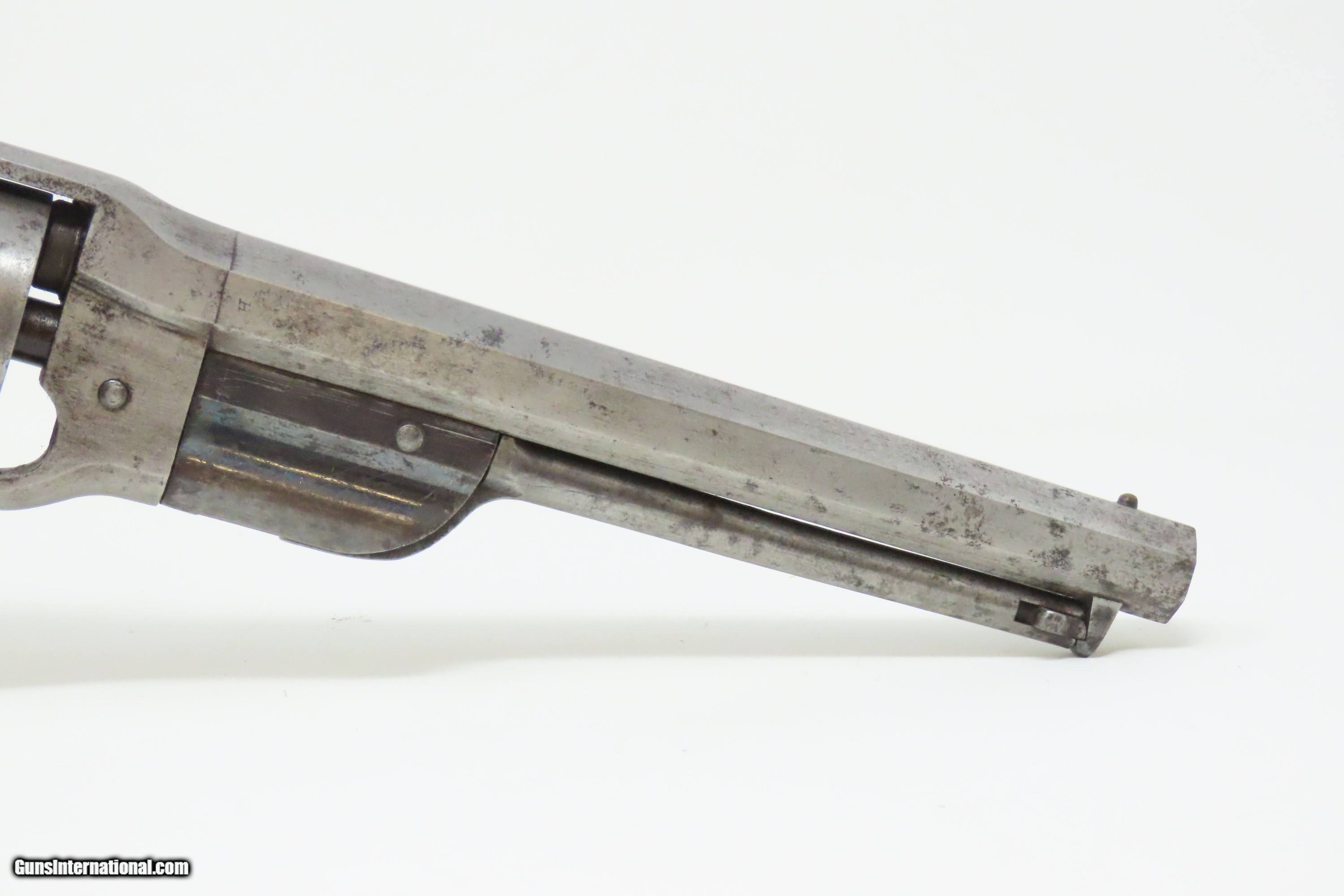 Description: CIVIL WAR Antique U.S. SAVAGE .36 NAVY Two-Trigger CARTOUCHES Middletown CT MARTIALLY INSPECTED .36 Caliber Two-Trigger Revolver Here we present an antique Martially Inspected U.S. Savage Revolving Fire Arms Navy Model Revolver, made circa 1862 in Middletown, Connecticut with a production run between 1961 and 1865. Only about 20,000 were ever produced, most of them for U.S. government contracts for both the Army and the Navy. Ironically, about 800 were purchased and delivered to the Navy, while about 11,000 were delivered to cavalry units in the militias and the Army. The rest of the production was sold commercially and smuggled to the Confederacy when further U.S. government contracts were not forthcoming. Known Confederate Cavalry units to have used these were: the 7th, 34th & 35th Virginia, 11th Texas and 7th Missouri Cavalries. Known Northern units were the 5th Kansas, 7th New York, 1st & 2nd Wisconsin. This was one of the most unique revolvers of the American Civil War, both in function and in form. Some in the field consider these to be “ugly” guns, and you may commonly see them referred to as the “Ugly Duckling”. Regardless, the thoughtfulness of design made this a feature packed revolver that gave it a good shot at government contracts, in spite of it being a bit more expensive. The most visually distinguishing characteristics of the Savage Navy Revolver are the double ring trigger and trigger guard, as well as the sleek profile with the low bore axis and solid frame. The low bore axis made for less muzzle flip when fired, making follow up shots faster and pointing more natural. The solid frame was an improvement in durability over open top frame designs. Remington and Whitney both featured this improvement, while Colts clung to the open top frame (and no wonder, since they were selling them as fast as they could make them during the war). The ring trigger on the bottom causes the hammer to cock and the cylinder assembly to retract in the frame and revolve. By the same token, once the cocking lever was released, the cylinder would go to rest with the end of the chamber against the back of the barrel, making a better gas seal than most. The blade trigger above the ring trigger simply causes the hammer to drop through a hole in the top of the frame. Unlike most other percussion revolvers of the day, the Savage percussion nipples face out from the cylinder and are canted back. This was more easily accessible, and less apt to cause a jam in the action if a cap were to fall off. The overall condition is very good. Gray patina with some original finish especially on the loading lever assembly. The action is excellent which is rare in this model. The bore is in good condition with strong rifling. The grips are solid. The left grip has a good inspectors cartouche and there are other inspection markings throughout. Own the original! This is a legitimate antique and not a reproduction. Barrel is 7 1/4 inches. Caliber: .36 Percussion Overall condition as seen in photos. Very Fast. Very Safe. FREE SHIPPING WORLDWIDE. Delivered directly to your door by express mail! Guaranteed AUTHENTIC & Includes CERTIFICATE OF AUTHENTICITY. ancestryguns $5200 #244030 SOLD Antique: Yes |