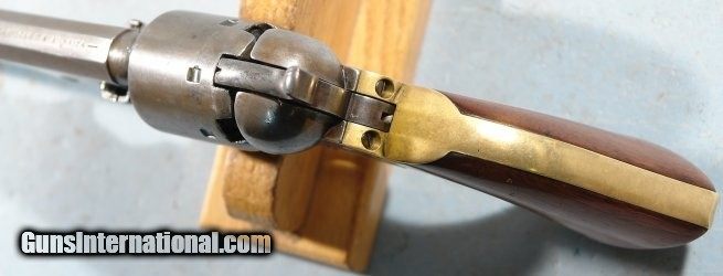 Description: CIVIL WAR COLT MODEL 1851 NAVY REVOLVER SHIPPED 1861 WITH COLT FACTORY LETTER. .36 cal. with 7 ½” barrel with excellent barrel address stamp. Original and matching except the wedge (original and close number). Numbered in the 114xxx serial range within the quite limited Model 1851 serial range of revolvers which have the factory has records of and will letter. Letter states it was shipped in a 100 gun shipment from the factory on Oct. 16, 1861 to J. P. Moores Sons in New York City. Metal with nice grey patina and very crisp markings. Nice “COLTS/PATENT” stamp on frame. Excellent original factory walnut grips. Perfect working order and excellent bore and chambers. Reasonably priced original early Civil War Colt Navy. SOLD Antique: Yes |
