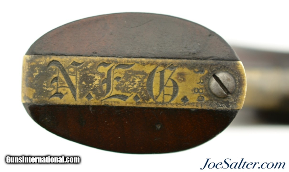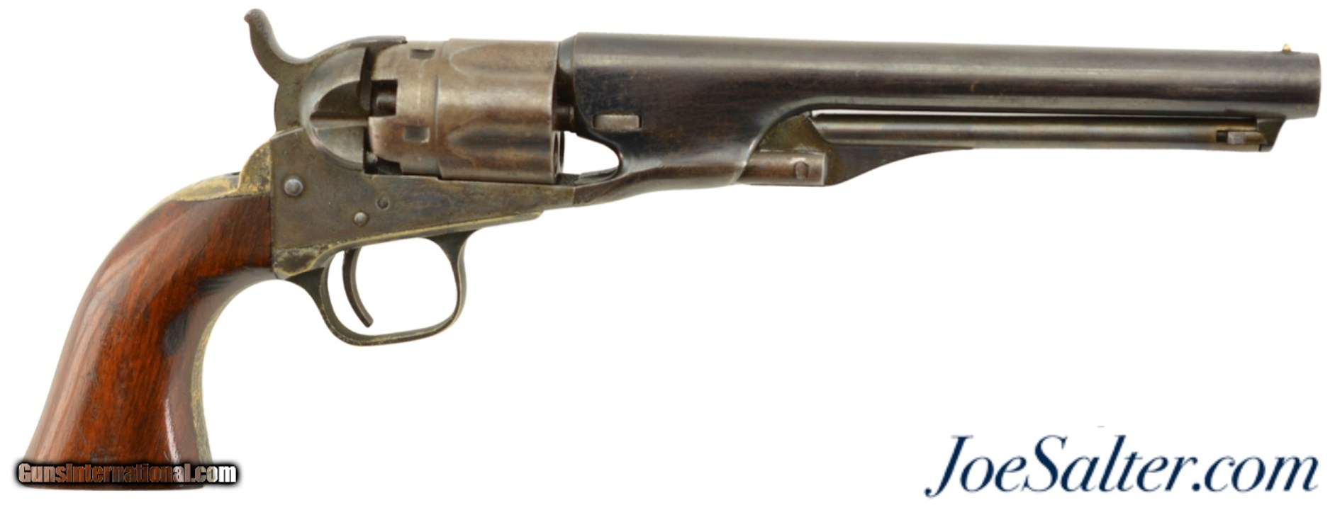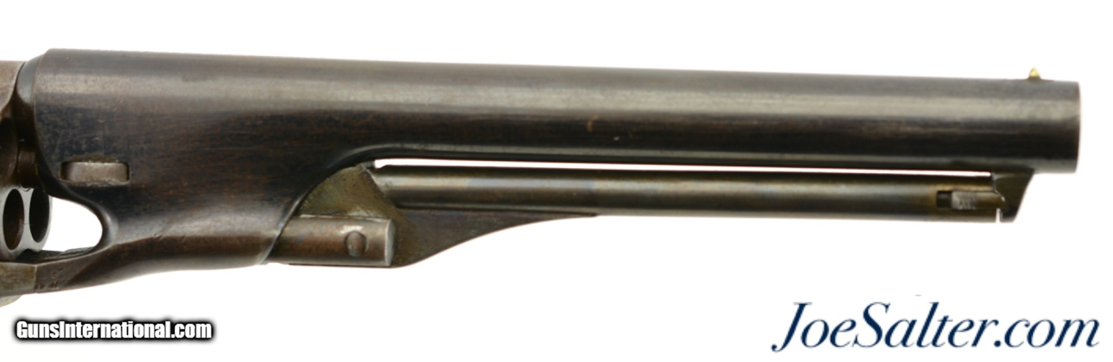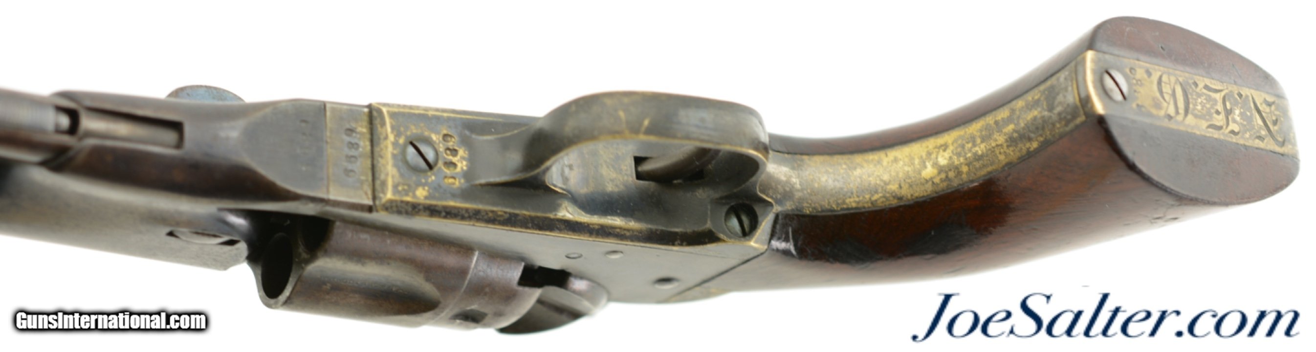 Description: Serial #6689, .36 Caliber, 6 1/2" barrel with an excellent, bright bore. This is a splendid, all-matching, early production revolver that retains 60-65% of the original bright blue that has flaked and faded to a mellow plum-brown patina on the balance. Some traces of original blue are present on the cylinder flutes, with the balance of the cylinder having a dark gray-brown color. The frame has muted, but still visible color case-hardening, with some traces of mild surface freckling throughout, as well as further color case-hardening present on the protected areas of the loading lever. The trigger guard and backstrap retain a commensurate amount of the original silver finish that has tarnished to a matte black color over time. The walnut grip is likewise in fine shape with only some minor handling marks and blemishes scattered about the original varnish. The action is tight and the revolver does not rattle at all. An ornate presentation is engraved along the backstrap: "J.G.W. to J.T.P. Jr. Co. D, 24th Regt. Mass. Vol." and "N.E.G." on the butt in Gothic capitals, (the 24th MA infantry was also known as the "New England Guards.") John T. Price Jr. was a 26 year old merchant and resident of Boston when he enlisted in 24th MA Volunteer Infantry Regiment on September 2, 1861. He was commissioned a Captain in D Co. on December 6, and served with the regiment until he resigned his commission on January 18, 1863. This is a splendid Colt Model 1862 Police with a Civil War presentation to an identified Massachusetts infantry officer. It would make a stellar addition to any collection. Antique SOLD Antique: Yes |