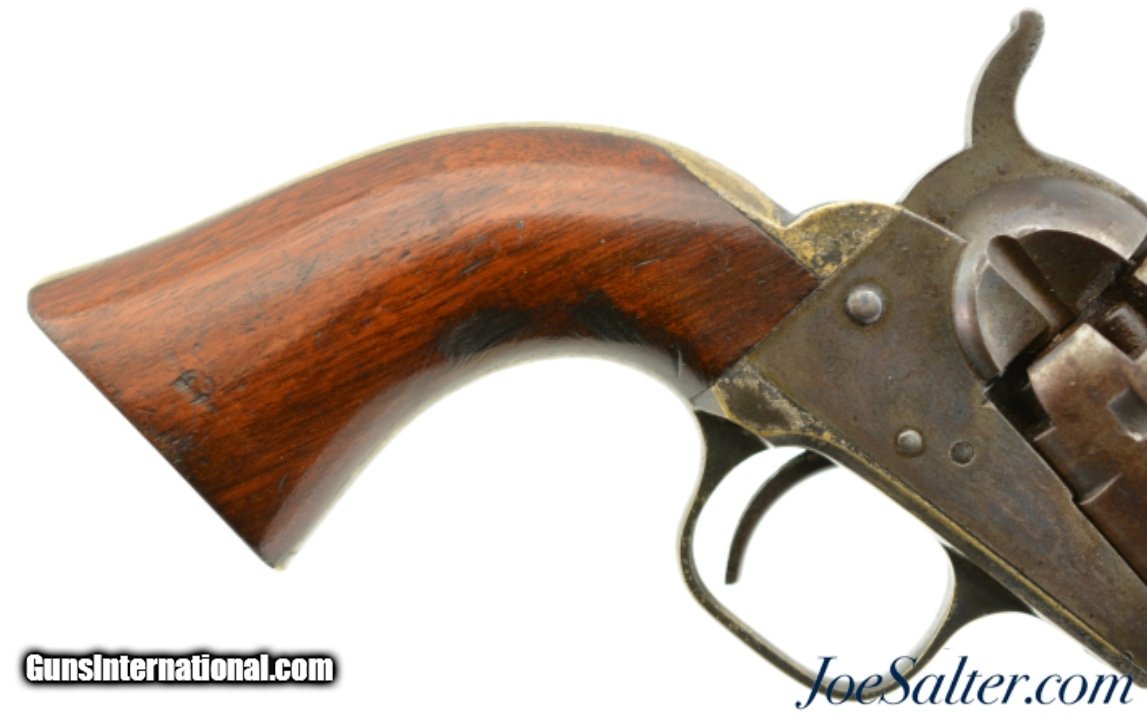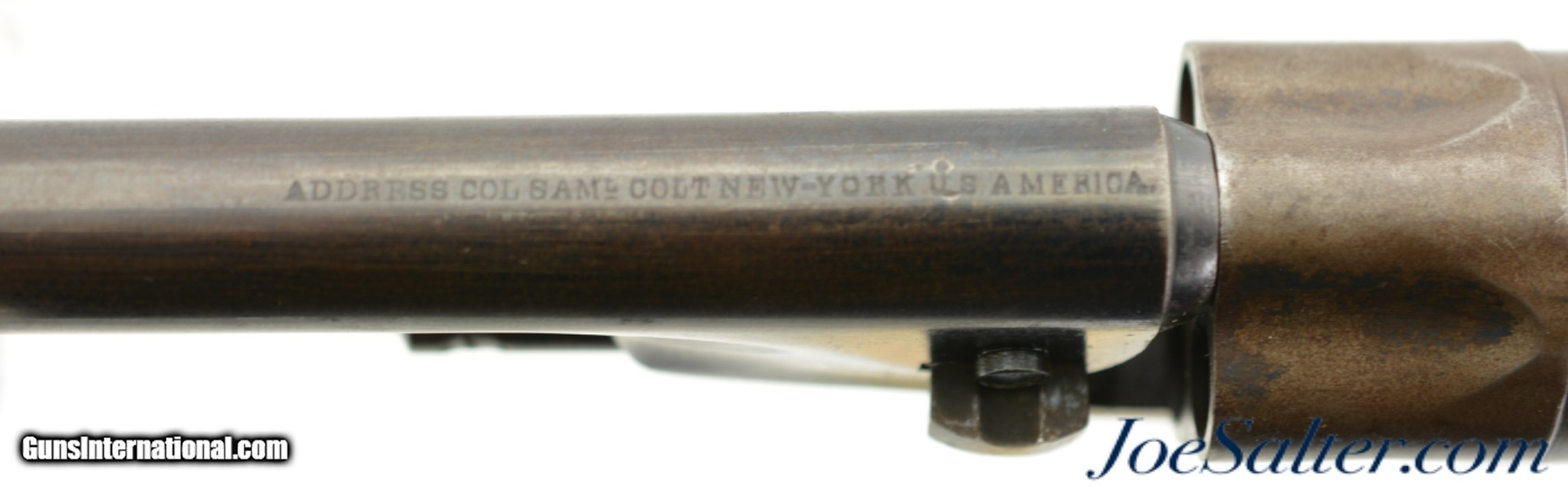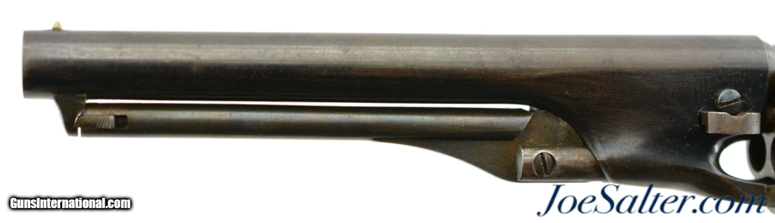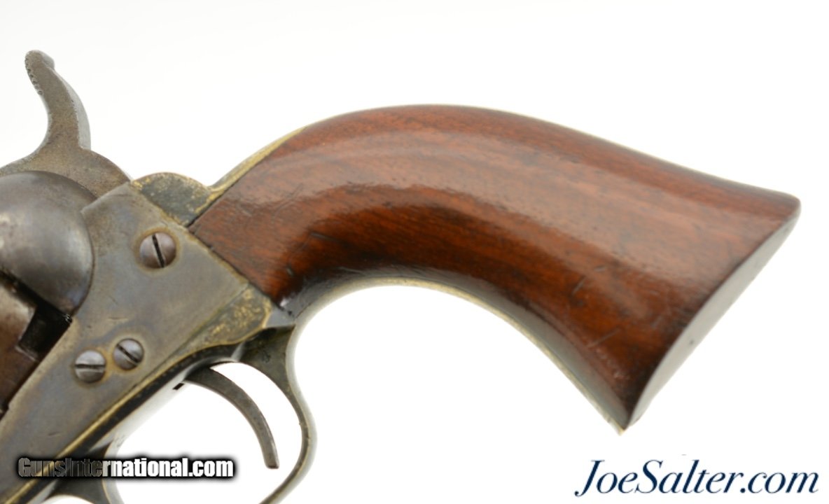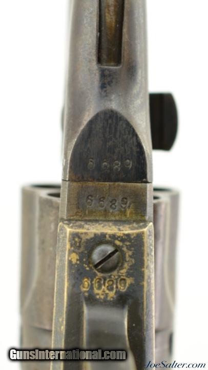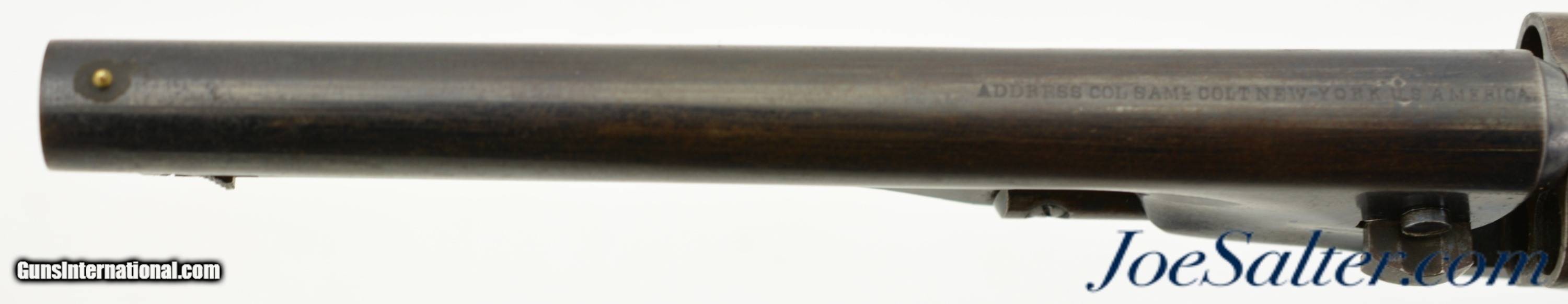 Description: Serial #6689, .36 Caliber, 6 1/2" barrel with an excellent, bright bore. This is a splendid, all-matching, early production revolver that retains 60-65% of the original bright blue that has flaked and faded to a mellow plum-brown patina on the balance. Some traces of original blue are present on the cylinder flutes, with the balance of the cylinder having a dark gray-brown color. The frame has muted, but still visible color case-hardening, with some traces of mild surface freckling throughout, as well as further color case-hardening present on the protected areas of the loading lever. The trigger guard and backstrap retain a commensurate amount of the original silver finish that has tarnished to a matte black color over time. The walnut grip is likewise in fine shape with only some minor handling marks and blemishes scattered about the original varnish. The action is tight and the revolver does not rattle at all. An ornate presentation is engraved along the backstrap: "J.G.W. to J.T.P. Jr. Co. D, 24th Regt. Mass. Vol." and "N.E.G." on the butt in Gothic capitals, (the 24th MA infantry was also known as the "New England Guards.") John T. Price Jr. was a 26 year old merchant and resident of Boston when he enlisted in 24th MA Volunteer Infantry Regiment on September 2, 1861. He was commissioned a Captain in D Co. on December 6, and served with the regiment until he resigned his commission on January 18, 1863. This is a splendid Colt Model 1862 Police with a Civil War presentation to an identified Massachusetts infantry officer. It would make a stellar addition to any collection. Antique SOLD Antique: Yes |