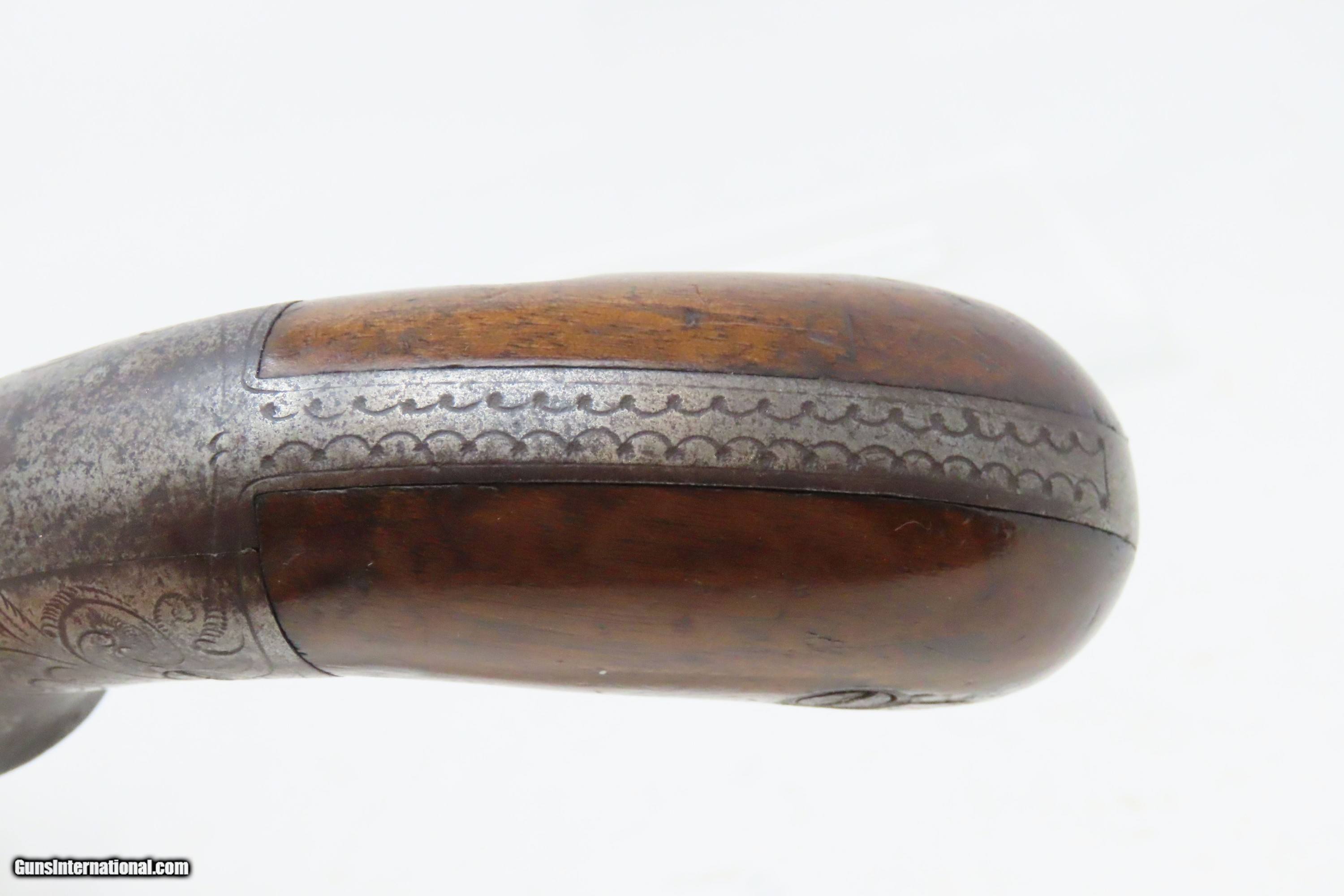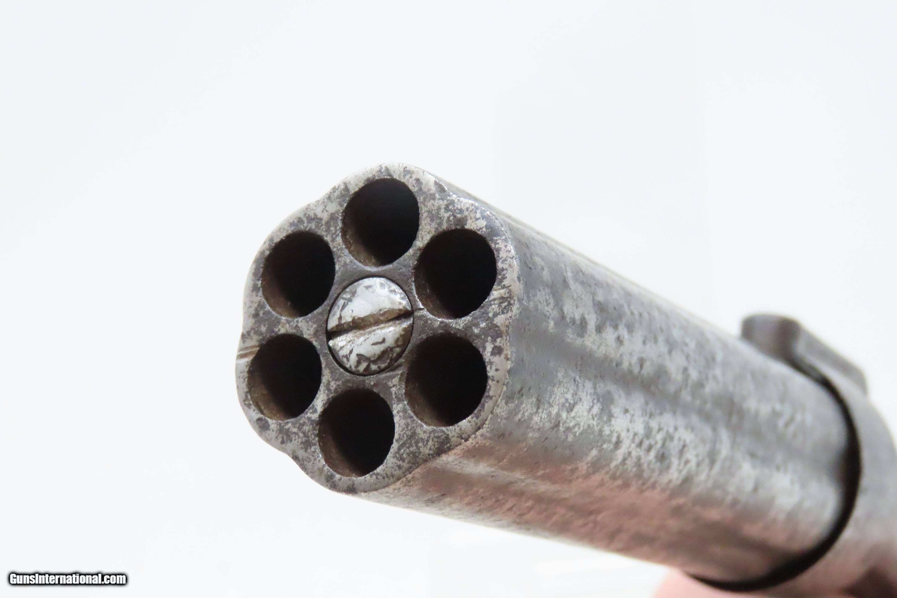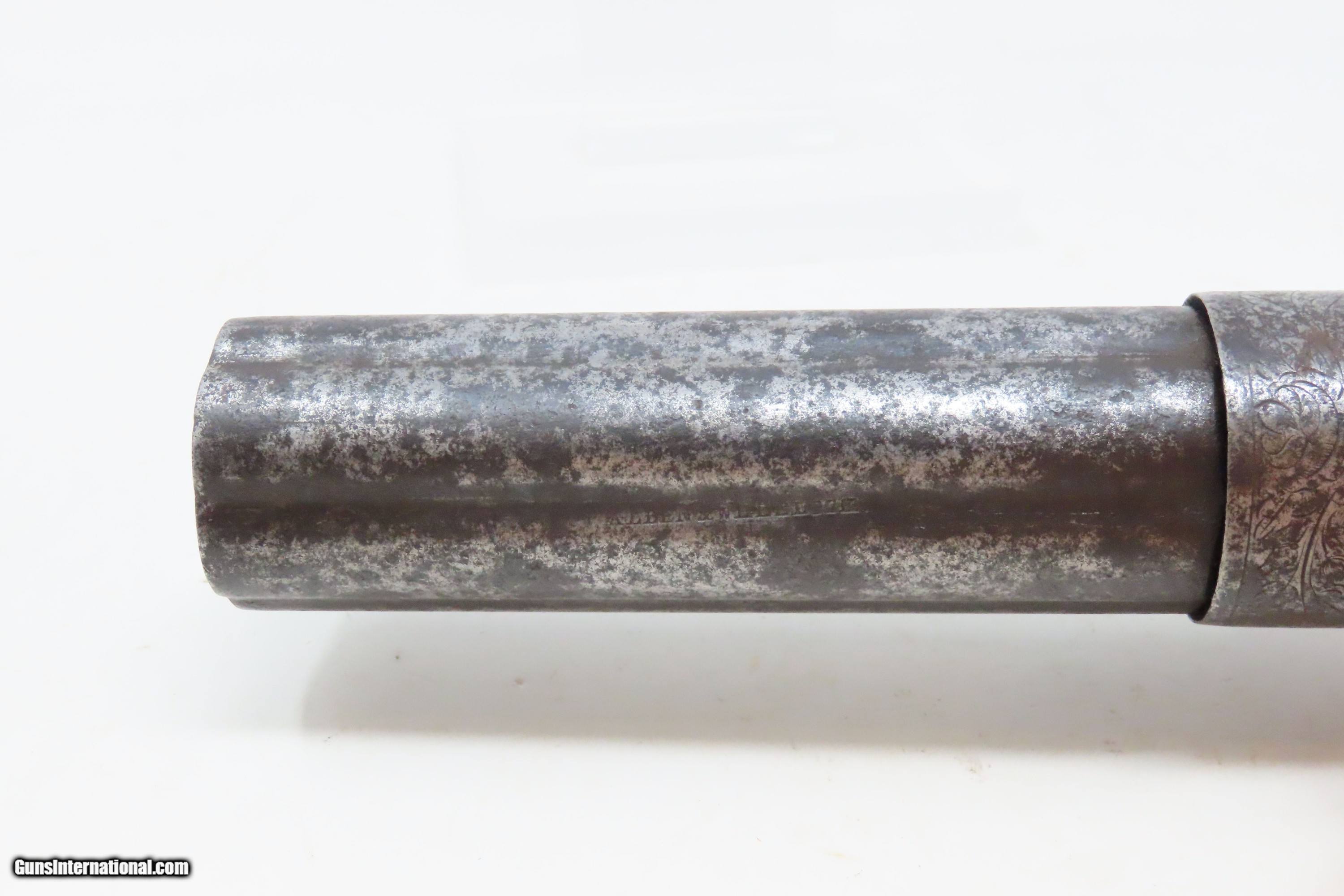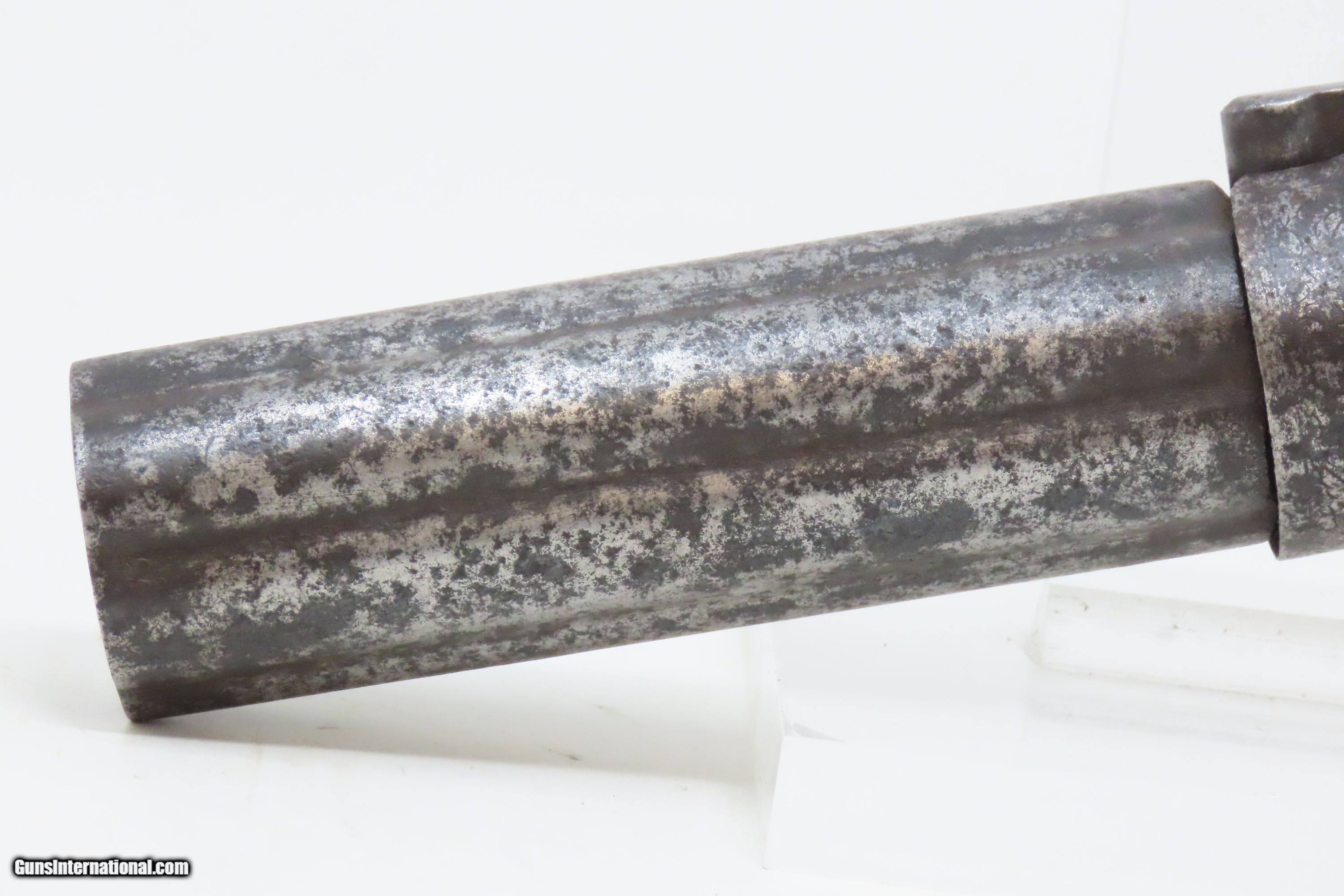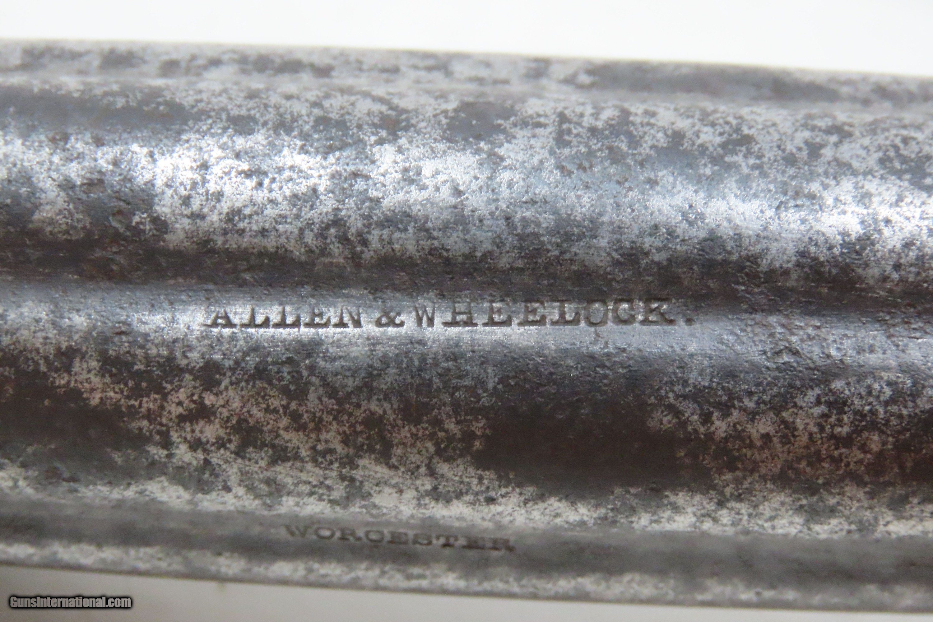 Description: CIVIL WAR Era Antique ALLEN & WHEELOCK .31 PERCUSSION Pepperbox GOLD RUSH RIVERBOAT GAMBLER 6-Shot Pepperbox Here we present an antique Allen & Wheelock 6-shot Pepperbox Revolver, manufactured circa 1856-1865 in Worcester, Massachusetts. This revolving pistol had percussion nipples integrated to the barrels. Made with a bar hammer and standard trigger, models have been encountered with or without an integral nipple shield and .31 was the most common caliber. While simplifying shooting (no manual cocking of the hammer), the bar hammer did preclude the inclusion of usable sights. However, this early example of a double-action pistol must have been quite a selling point. As these were considered “point and shoot” short range defensive weapons or “belly guns”, the market did not seem to object to the limitation of not having sights. Ethan Allen was already a prolific inventor in the 1830s when he came up with this design. Ethan Allen was a true family man, investing and partnering with a nephew in a New York sporting goods retailer, hiring another brother-in-law, Thomas Wheelock, who was eventually made a partner, and similarly hiring and later making partner his two sons-in-law Sullivan Forehand and Henry Wadsworth. Because of these practices, his business was very successful. These revolvers enjoyed even greater popularity than Sam Colt’s first designs. The history that these pistols enjoyed over the years is astounding: the Seminole Wars, Gold Rush, Mexican War and American Civil War. These guns are true relics of American history. The overall condition is good. Strong action. The trigger guard is missing. All bores are in good shape for their ages. This example has a lightly engraved frame with traditional floral designs. Solid grips overall, and they remain in good shape with average wear. Own the original! This is a legitimate antique and not a reproduction. Barrel is 4-1/4 inches. Caliber: .31 Percussion Overall condition as seen in photos. Very Fast. Very Safe. FREE SHIPPING WORLDWIDE. Delivered directly to your door by express mail! Guaranteed AUTHENTIC & Includes CERTIFICATE OF AUTHENTICITY. ancestryguns $1250 #233259 SOLD Antique: Yes |