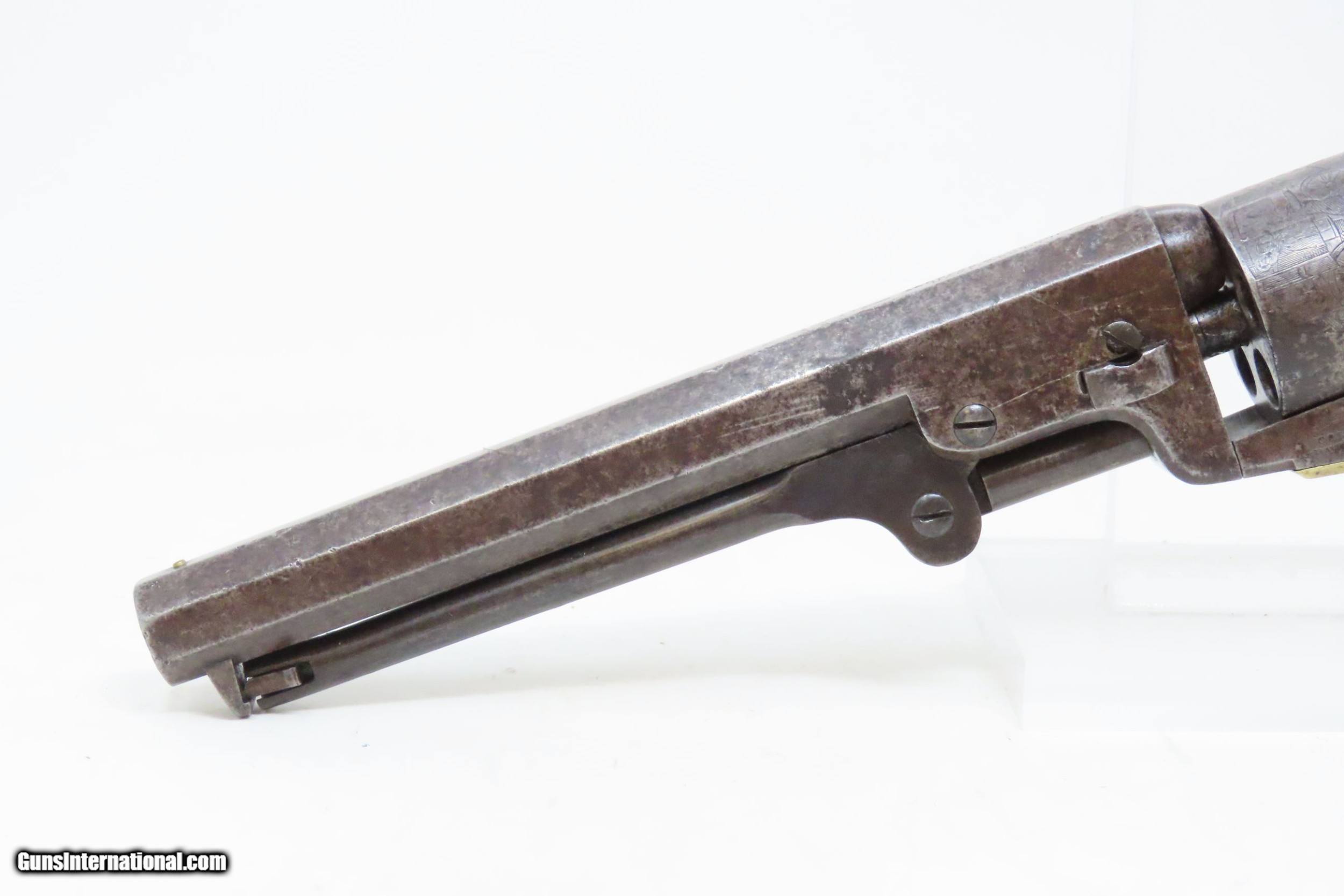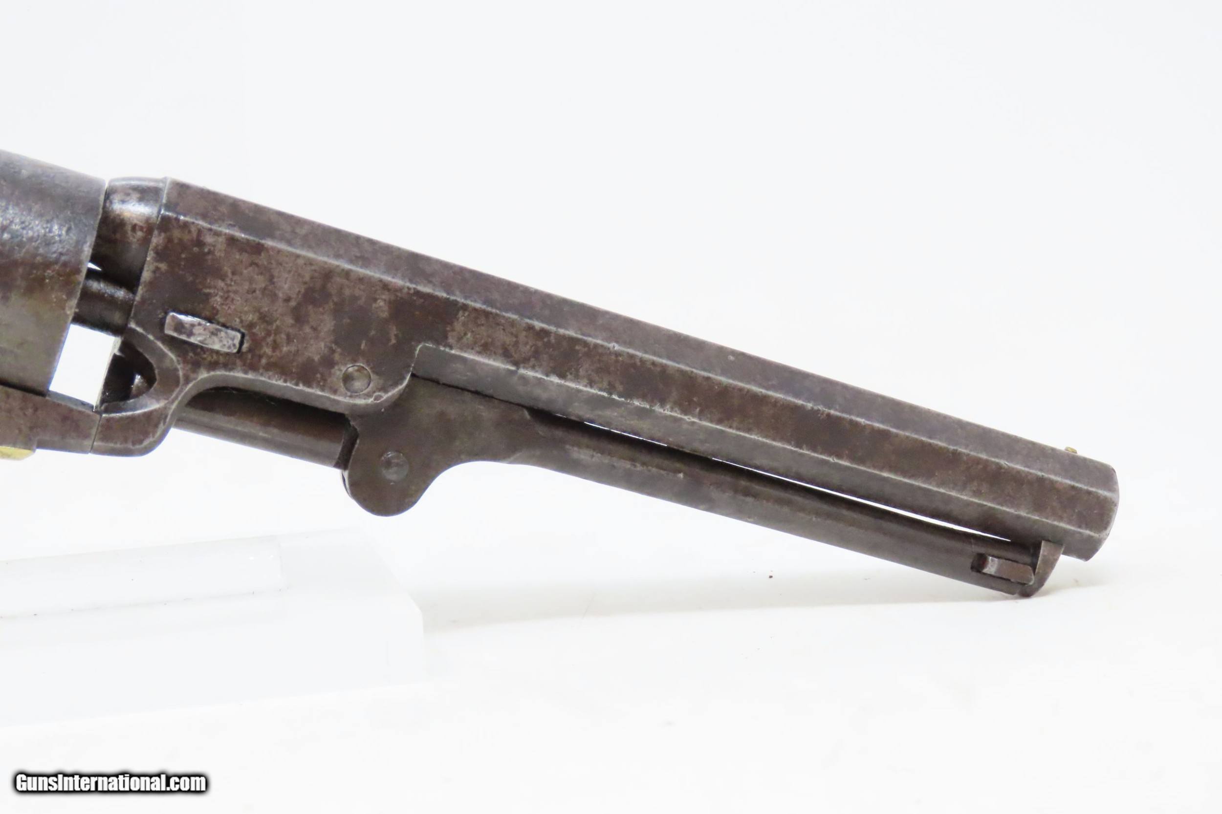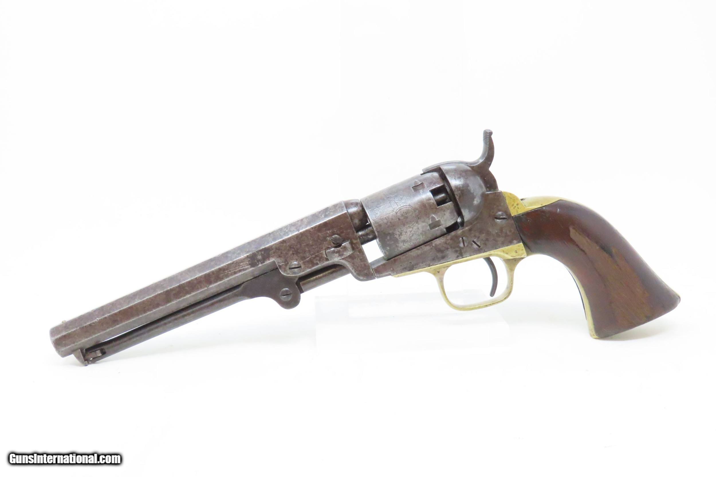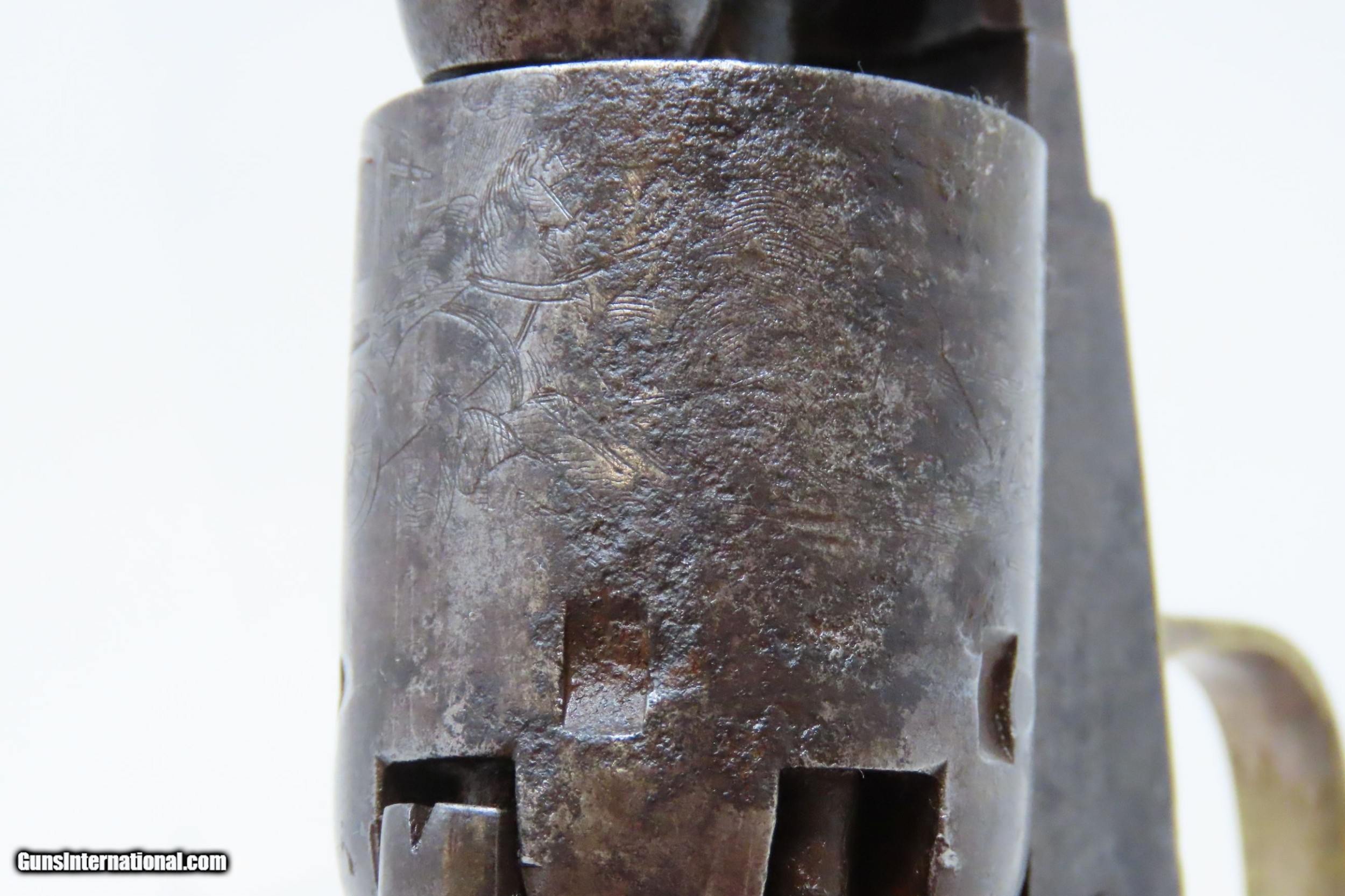 Description: CIVIL WAR Era Antique COLT Model 1849 POCKET .31 Cal. PERCUSSION Revolver HARTFORD, CONNECTICUT Manufactured in 1860 Here we present an antique percussion Colt Model 1849 Pocket Revolver, made in 1860 in Hartford, Connecticut. The Model 1849 Pocket, the replacement for the Baby Dragoon, was the most widely produced of any Colt percussion pistol. Nearly 340,000 were manufactured during its 23-year production run that ended in 1873. Over 280,000 of these were produced by Colt’s factory at Hartford by the end of the American Civil War in 1865. These were very popular and saw a lot of use on the battlefield, on the home front and in the West. These were some of the smallest, handiest pocket revolvers of the time. One of the most aesthetically pleasing aspects of the 1849 Pocket is its cylinder scene. Cylinder scenes during this period were common, especially for Colt, not only for their visual appeal, but because it made a revolver more difficult to forge. The scene on the 1849 Pocket is that of a stagecoach robbery. The focal point is the stagecoach drawn by four horses. A woman in a dress is seen framed in the doorway of the side of the coach. The driver is standing alongside wielding his pistol against multiple assailants as the horses rear and struggle against their harnesses. Several of the bandits lay dying on the ground, one tries to control the horses, two are running away and one is in the process of falling dead after being shot. Not a bad way to show interested buyers what a pistol like this would be good for. It did a fine job as a self-defense handgun for the average citizen in 19th Century America. The overall condition is good. Original patina. The cylinder scene remains visible. The numbers match with the exception of the barrel wedge. The action is excellent. The bore is in good shape with strong rifling. The grip has seen some scuffing on the left side that has been smoothed over with continued use. Also on the left side where the grip meets the frame the walnut is chipped. Own the original! This is a legitimate antique and not a reproduction. Barrel is 6 inches. Caliber: .31 Percussion Overall condition as seen in photos. Very Fast. Very Safe. FREE SHIPPING WORLDWIDE. Delivered directly to your door by express mail! Guaranteed AUTHENTIC & Includes CERTIFICATE OF AUTHENTICITY. ancestryguns $1800 #226071 SOLD Antique: Yes |